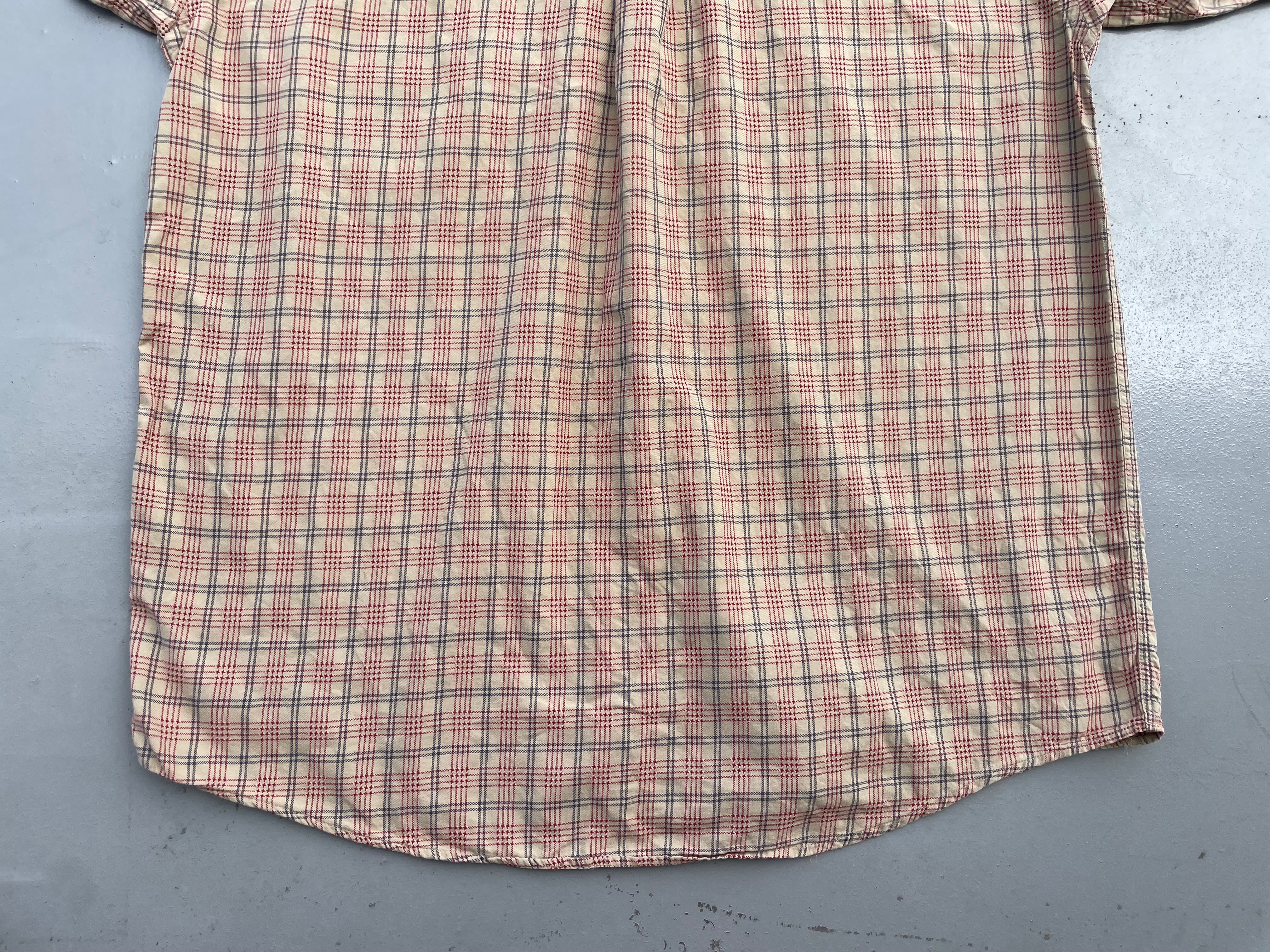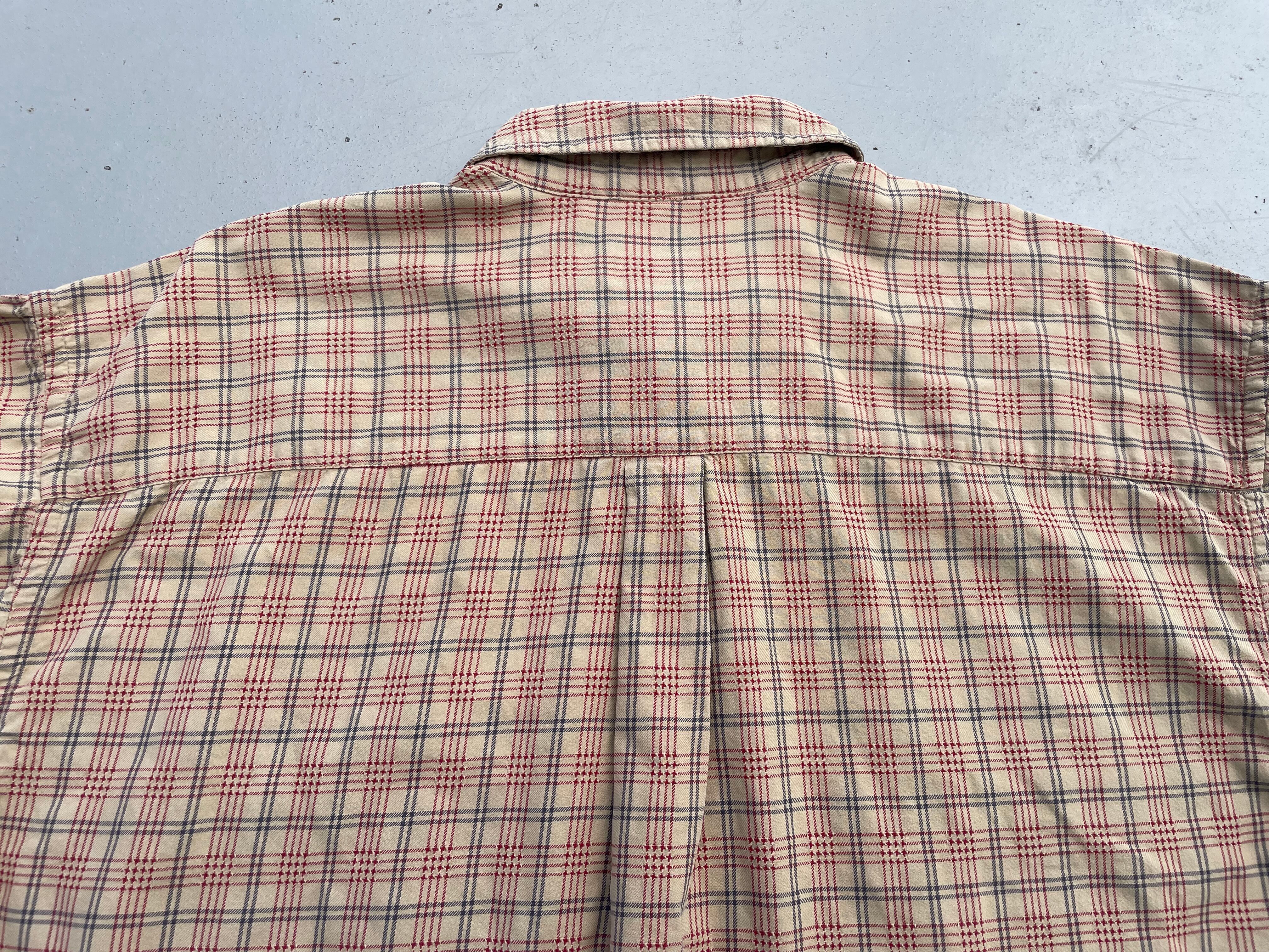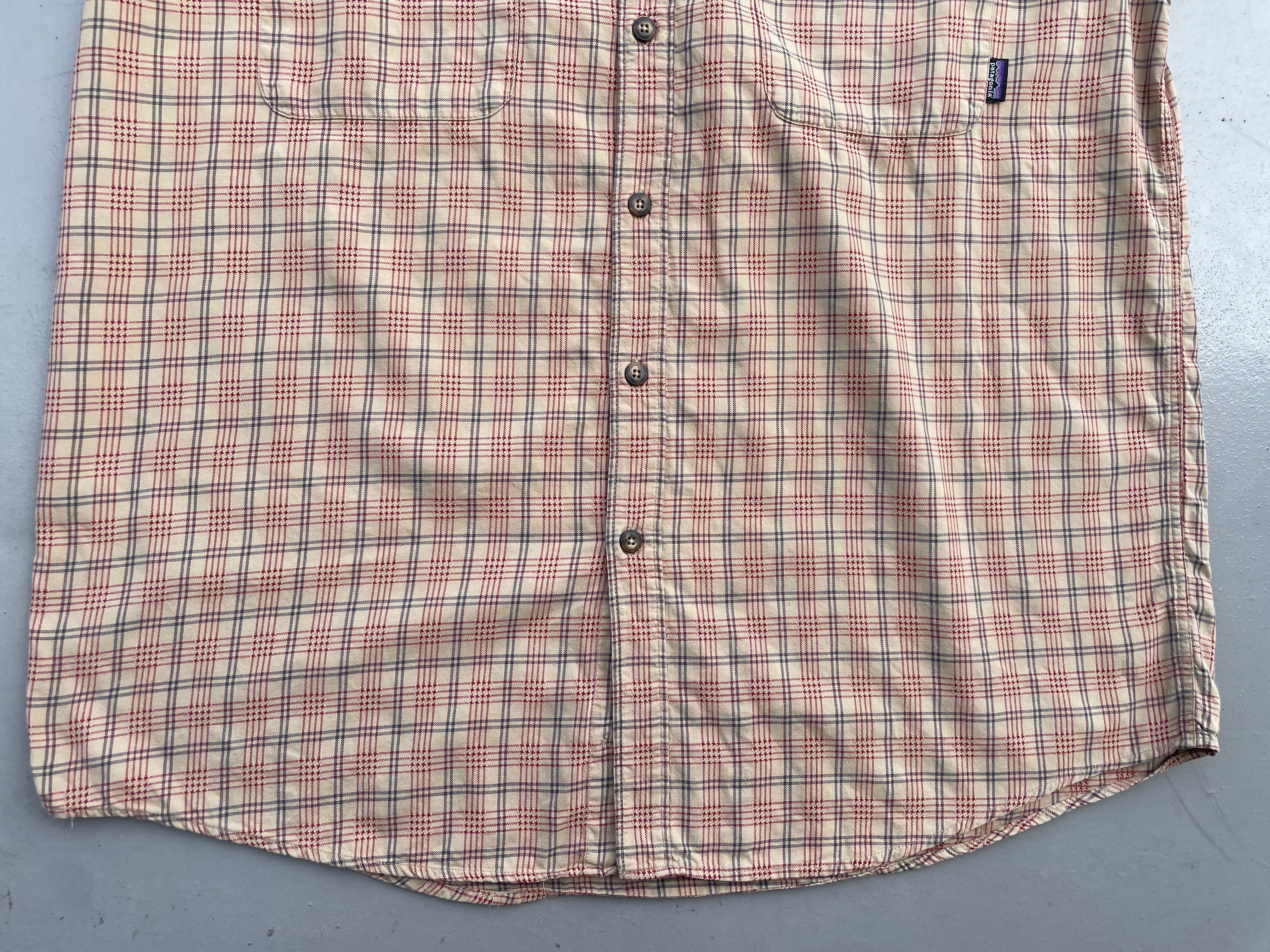 【商品詳細】パタゴニアの長袖シャツ。サイズはXL。カラーはベージュ×ブラック×レッドベースのチェックパターン。98年ポルトガル製。パタゴニアの中でも特に人気なポルトガル製シャツ。バーバリーのノバチェックのようなデザインに赤い折の入るアウトドアブランドらしからぬ洒落たチェックパターン。ドカンと大きめサイズでガバッとご着用いただけます。