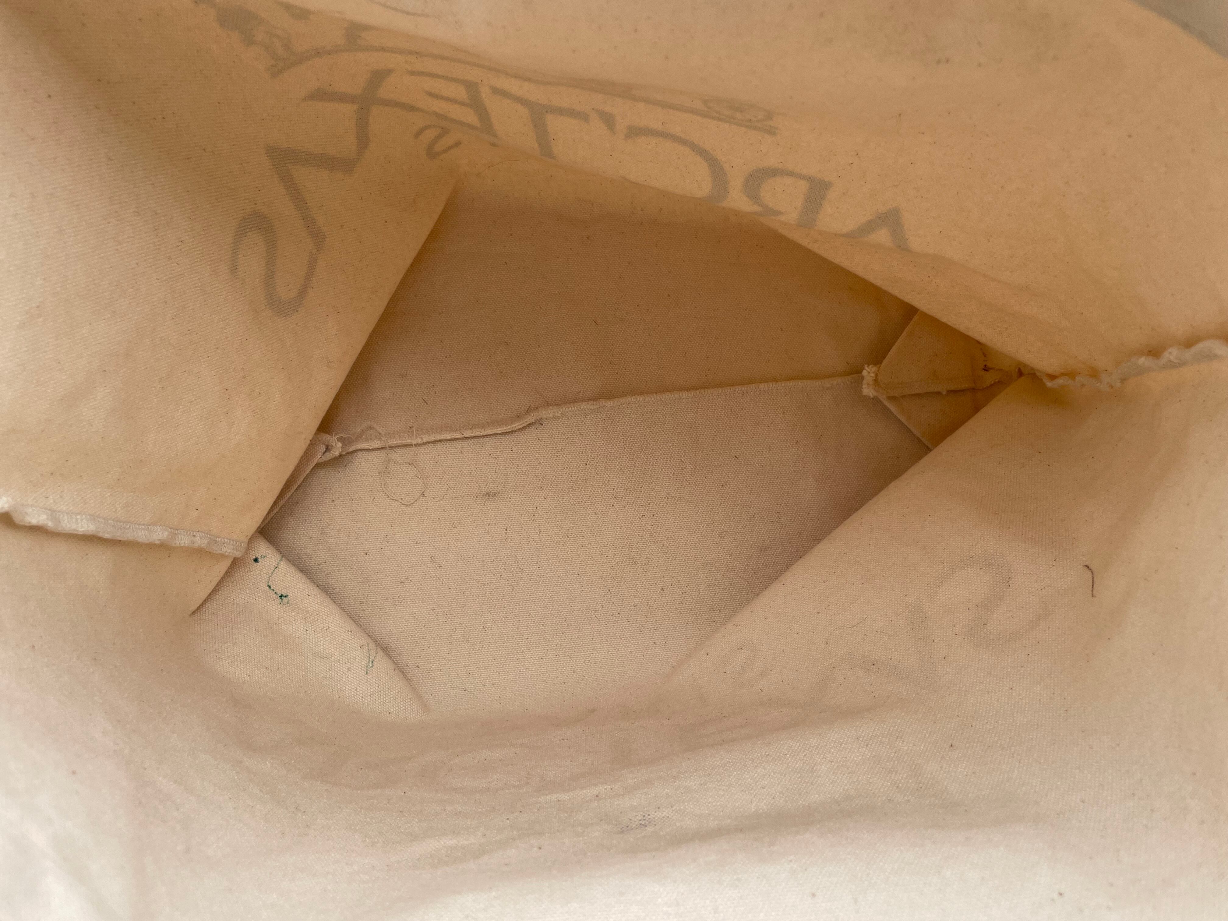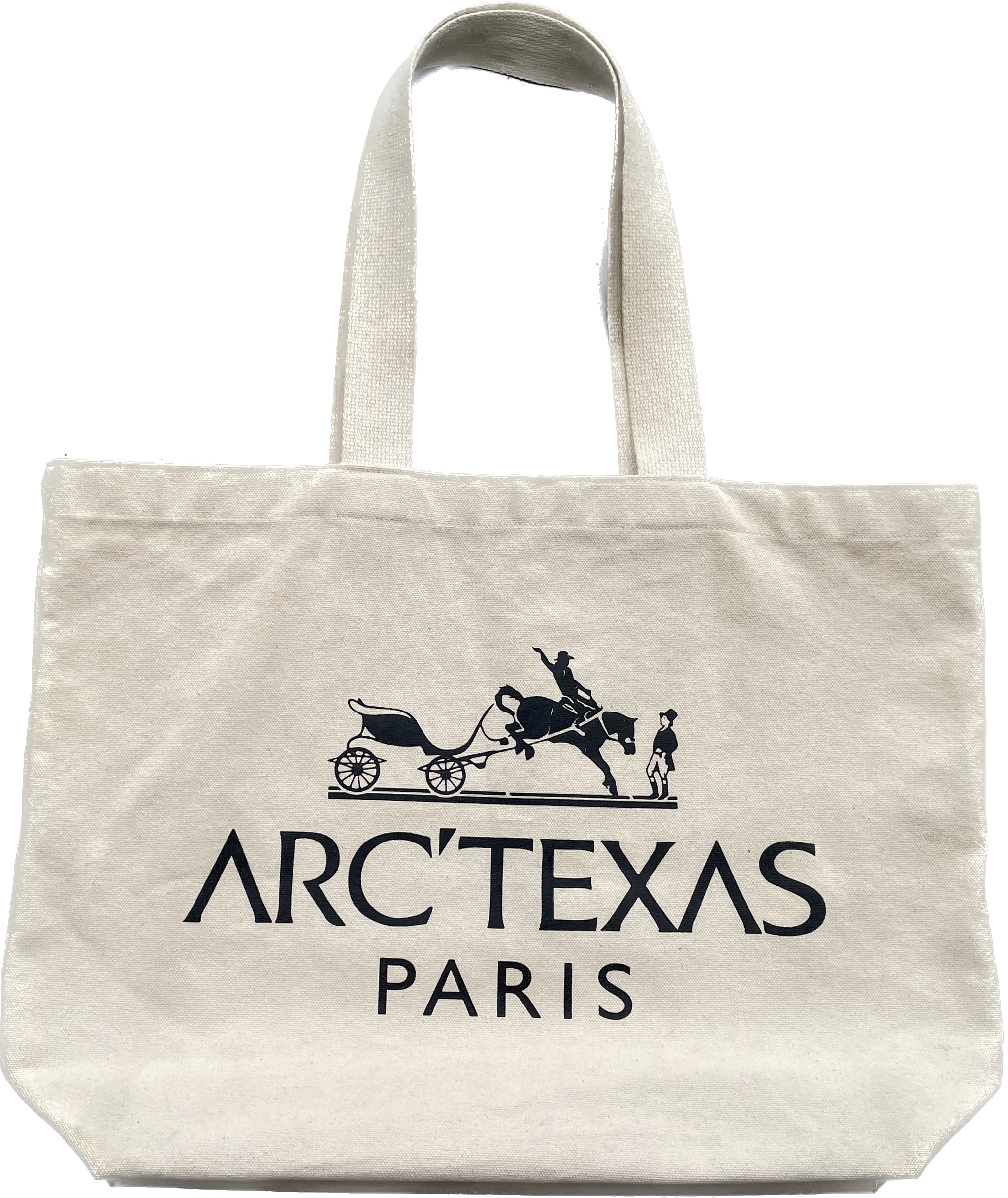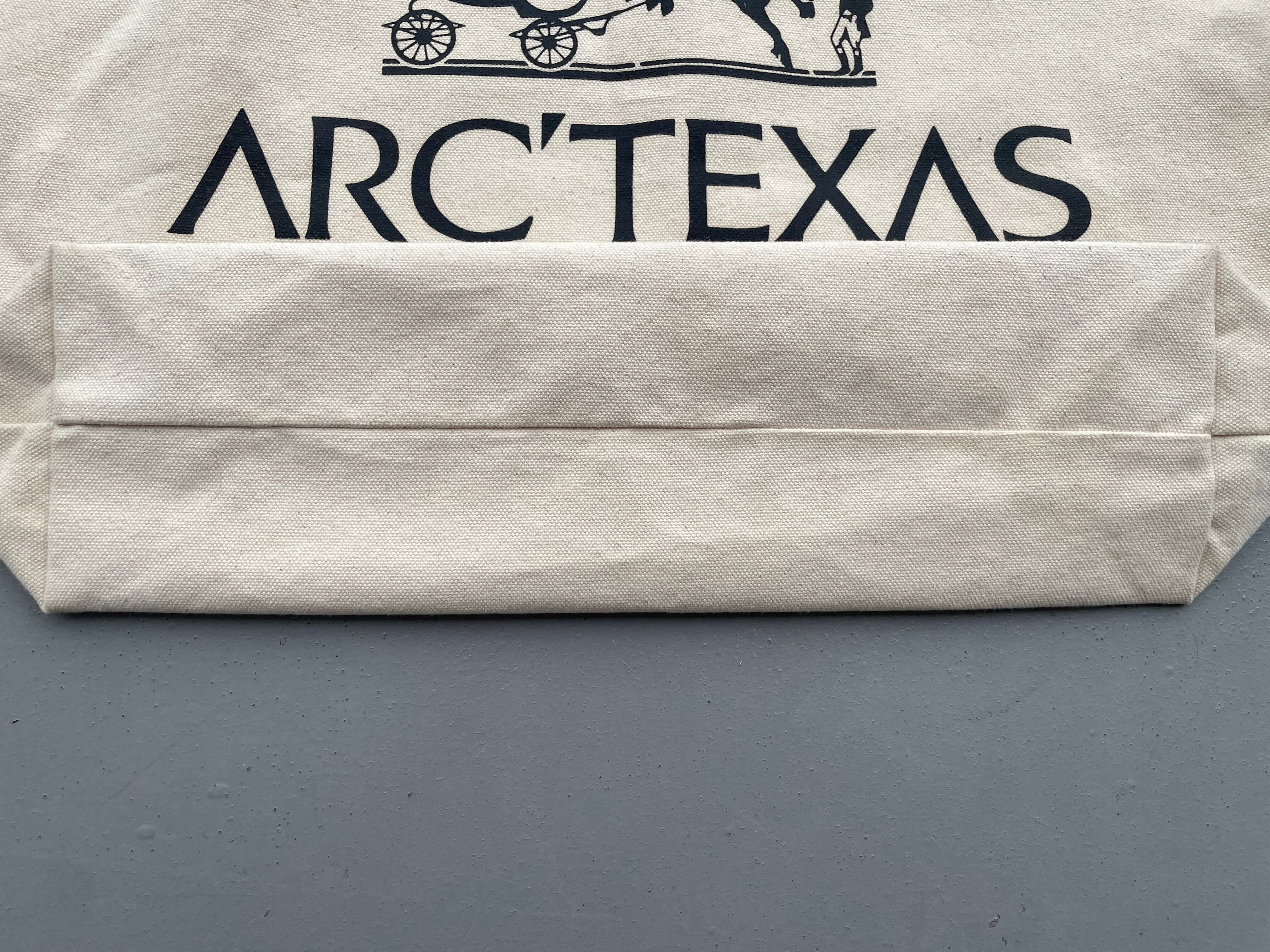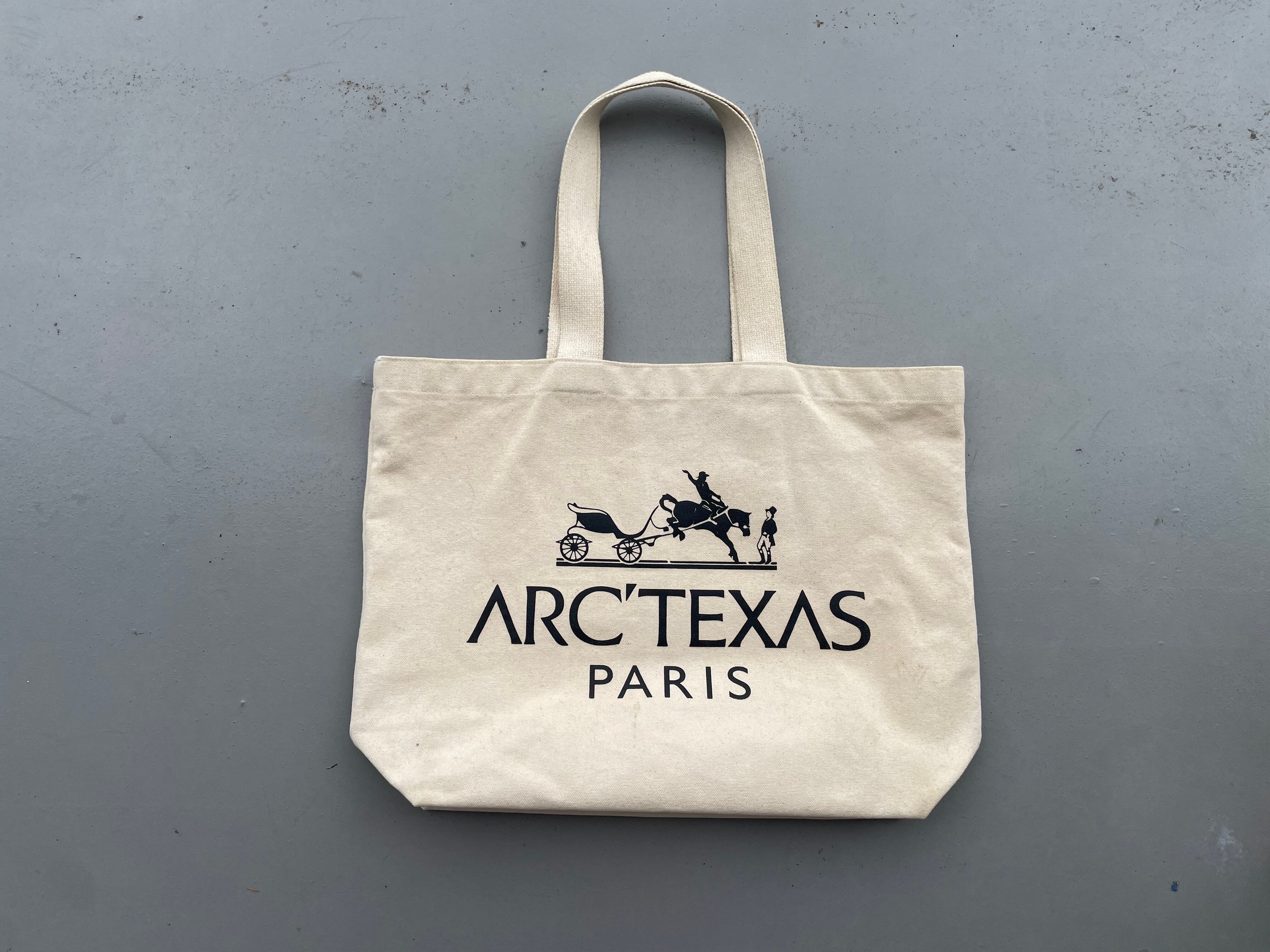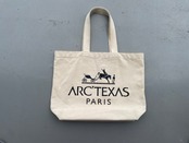 【商品詳細】ARC'TEXASのキャンバストートバッグ。カラーはナチュラル。某アウトドアブランドとラグジュアリーブランドをパロディした粋なデザインのトートバッグ。しっかり強度のあるキャンバス地の為、ハードにご使用いただけると思います。丁度良いサイズ感で幅広い用途でご使用いただけそうです。
