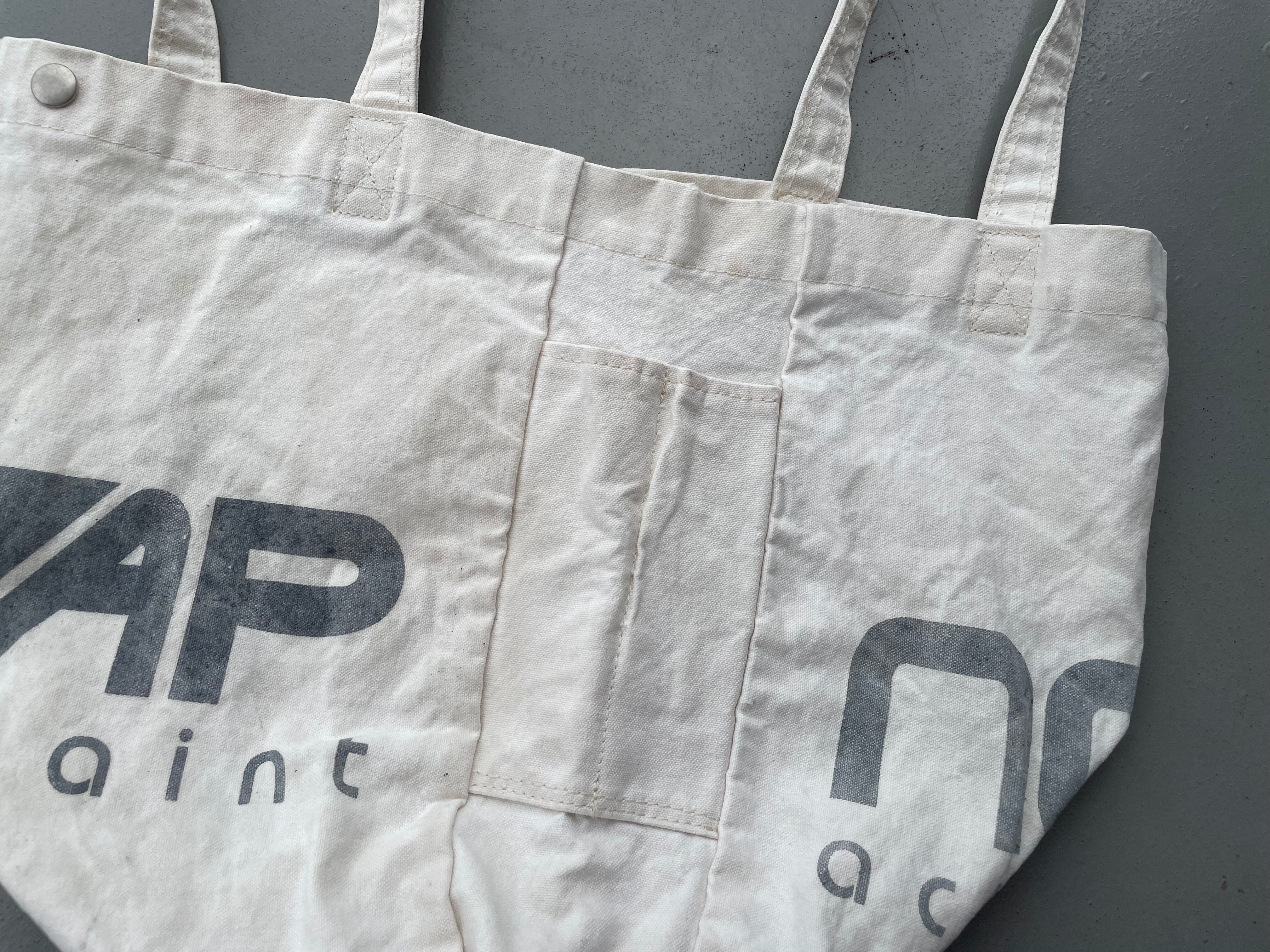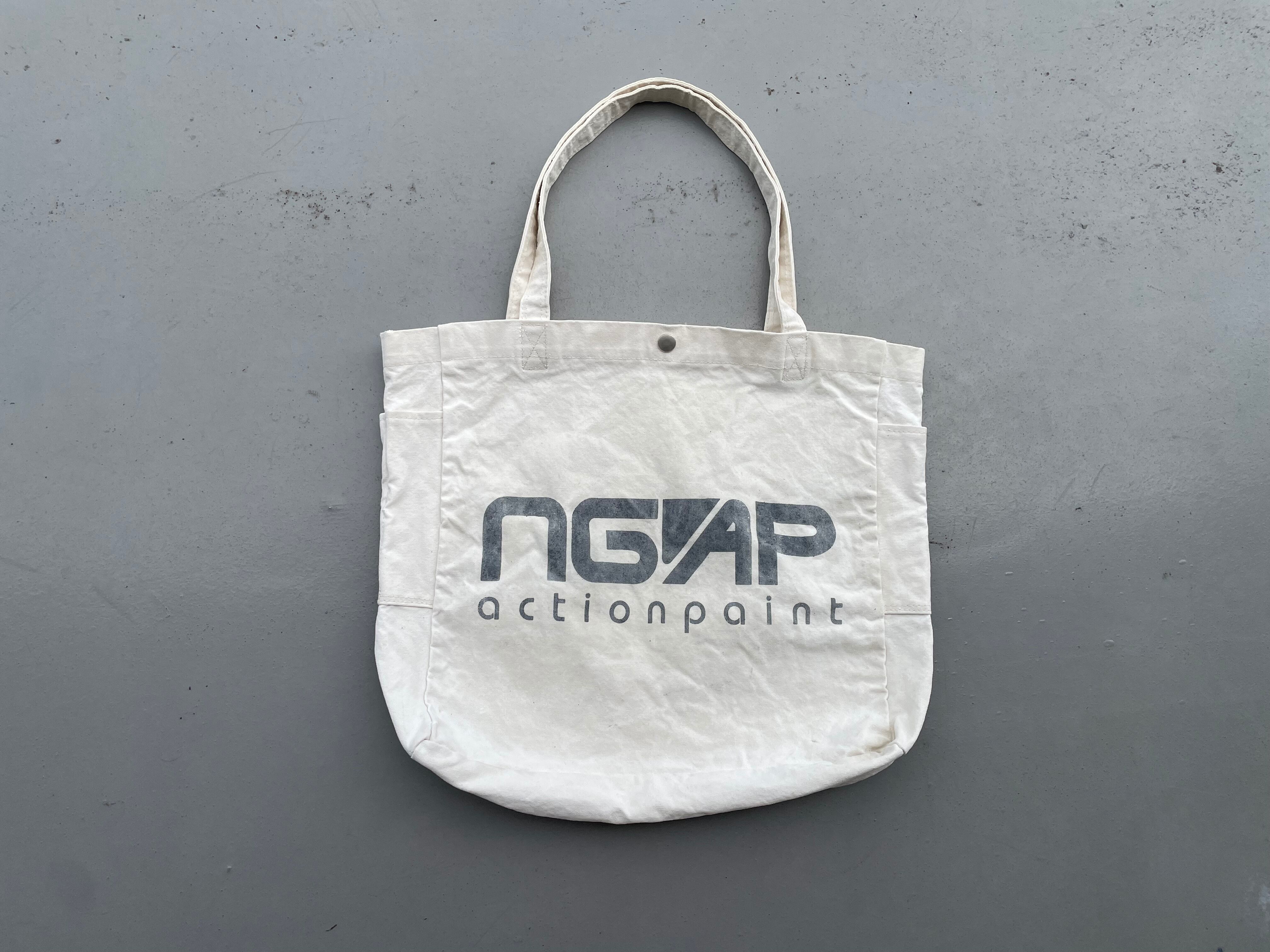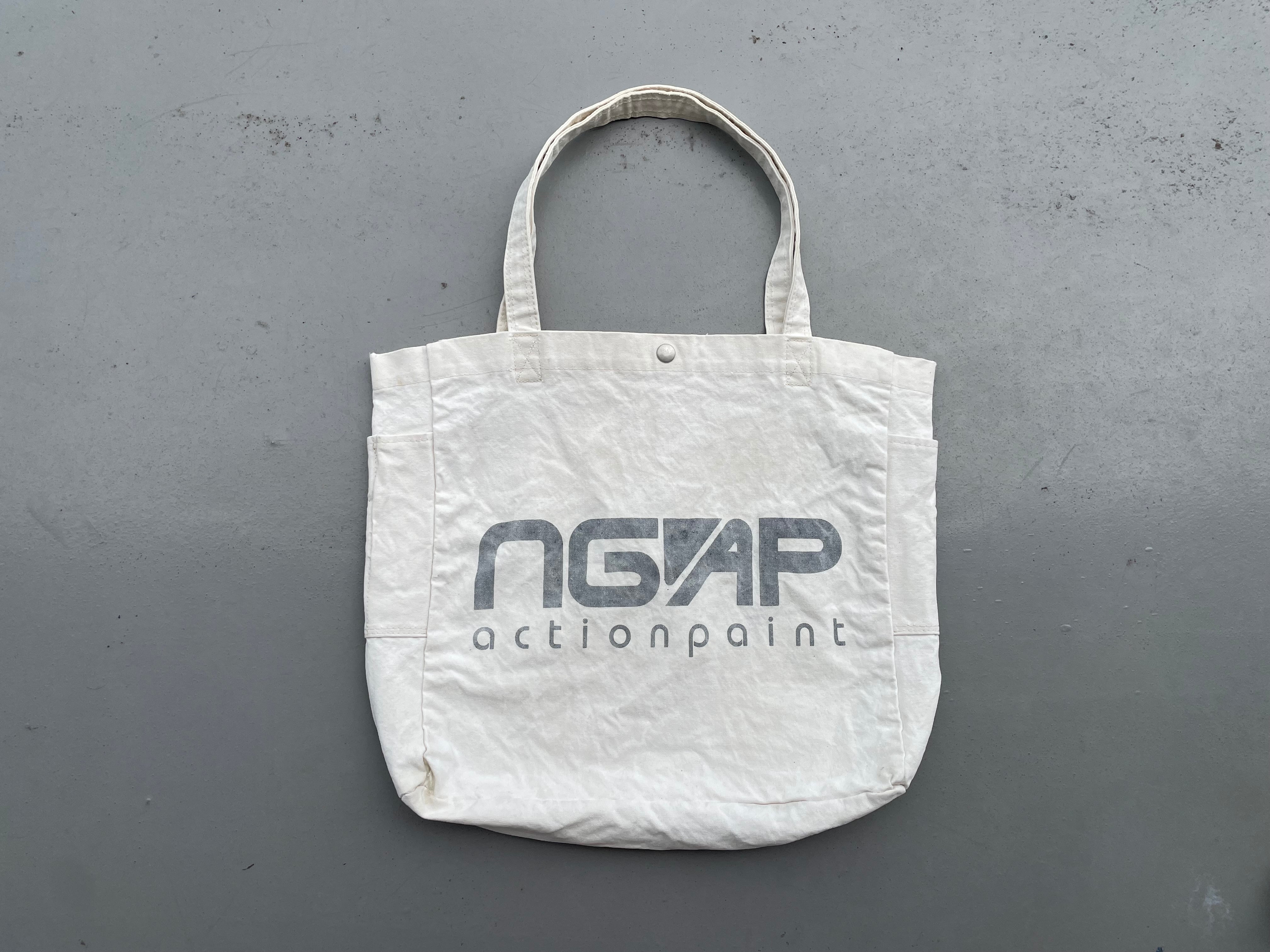 【商品詳細】NGAP×A Bathing Apeのキャンバストートバッグ。カラーはナチュラル。90年代製。知る人ぞ知る名作ツールトートバッグ。一見シンプルなトートバッグに見えますがマチに作業用ポケットのような収納がつく洒落たデザイン。ダメージ加工だけてなく、年代の経過も相まって良い雰囲気に仕上がってます。球数少なめでお探しの方も多いと思います。