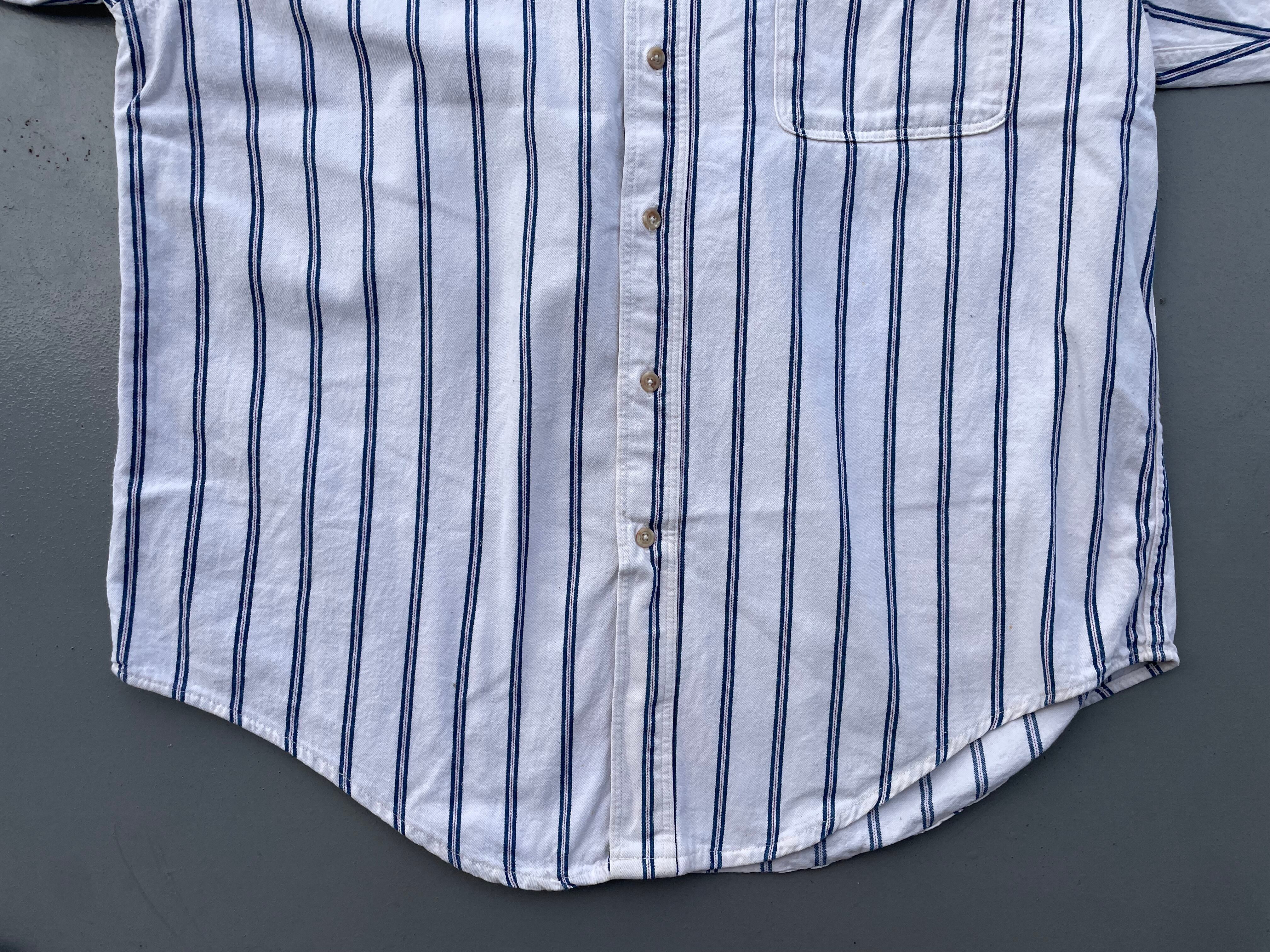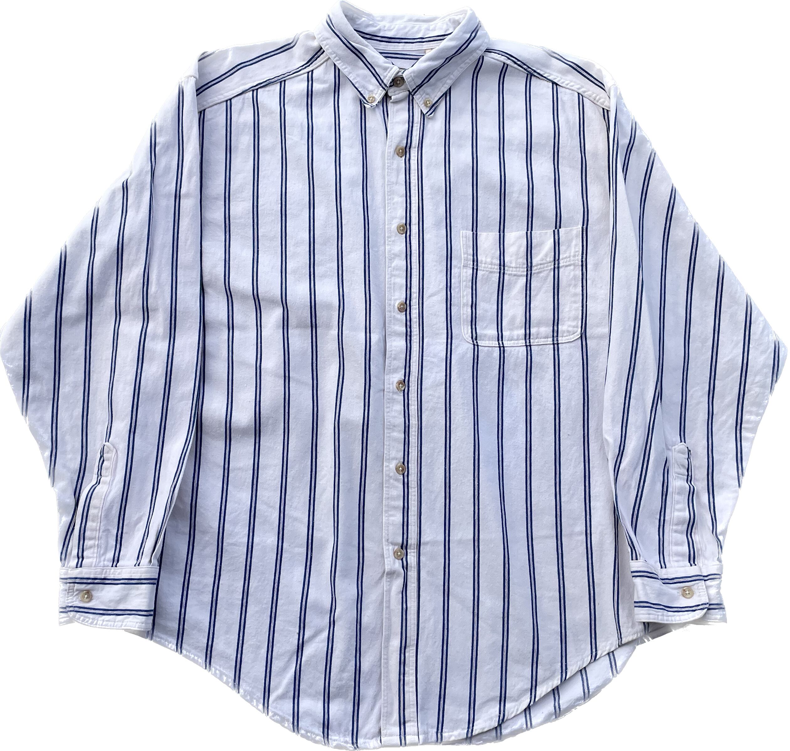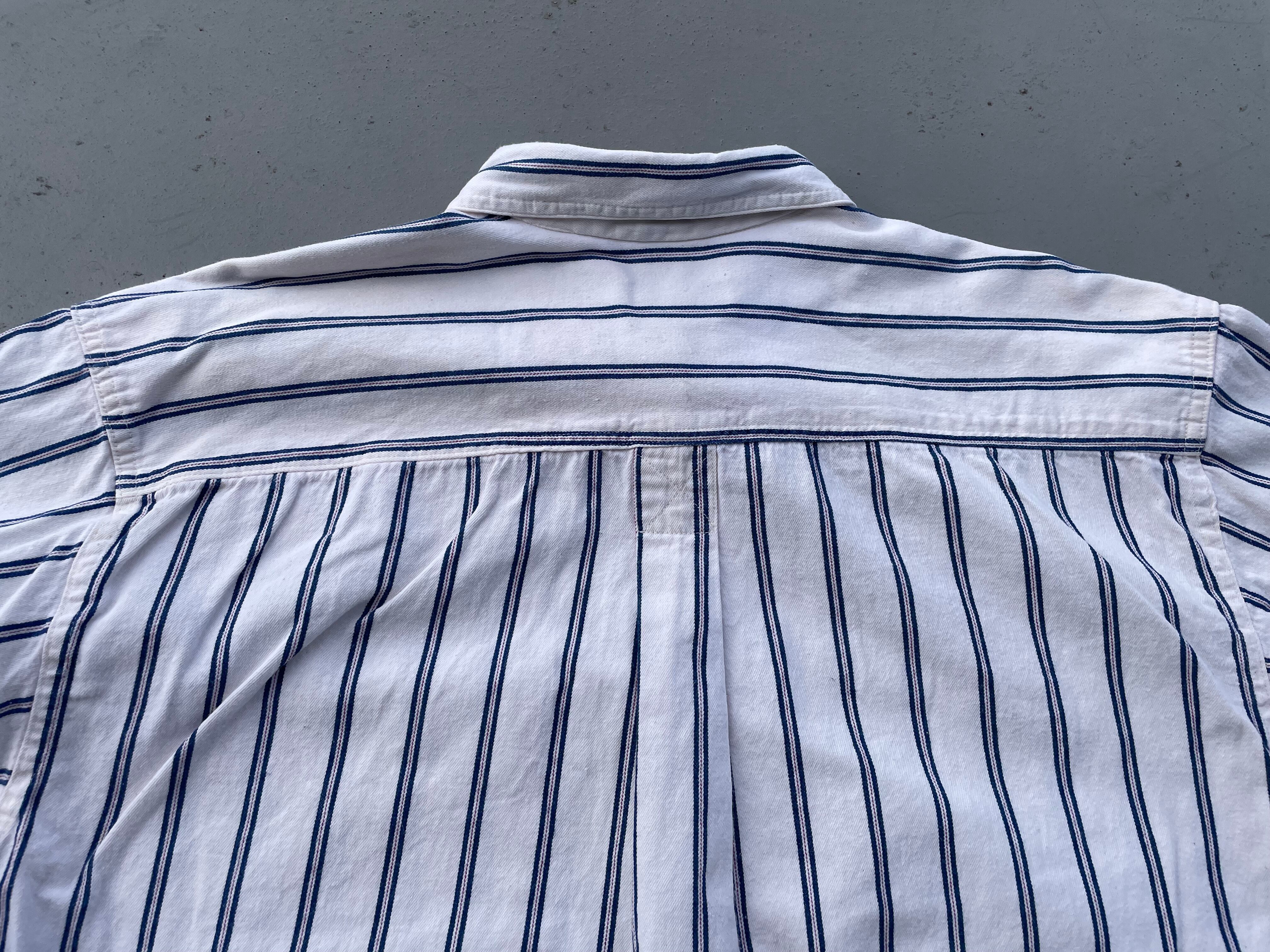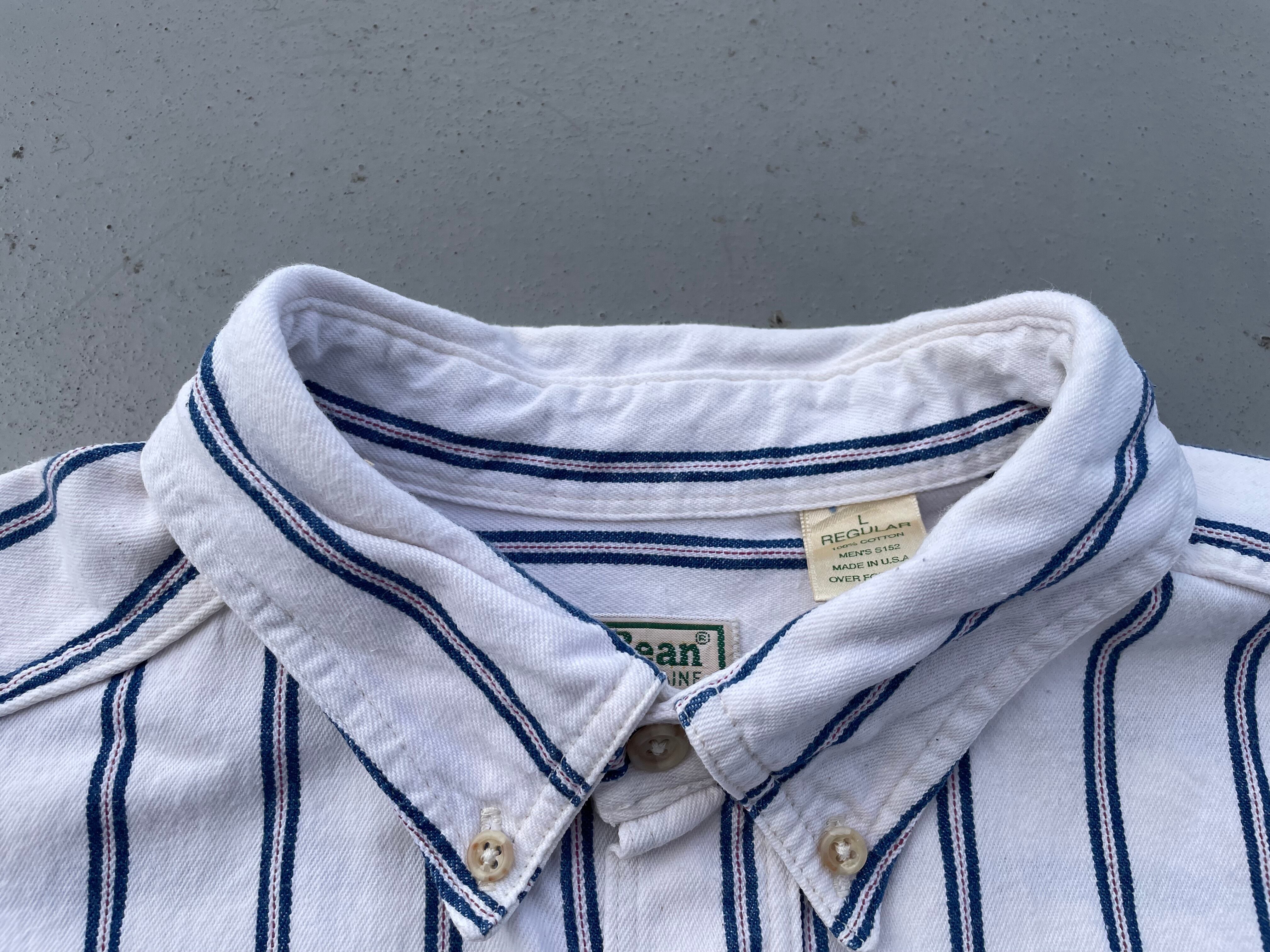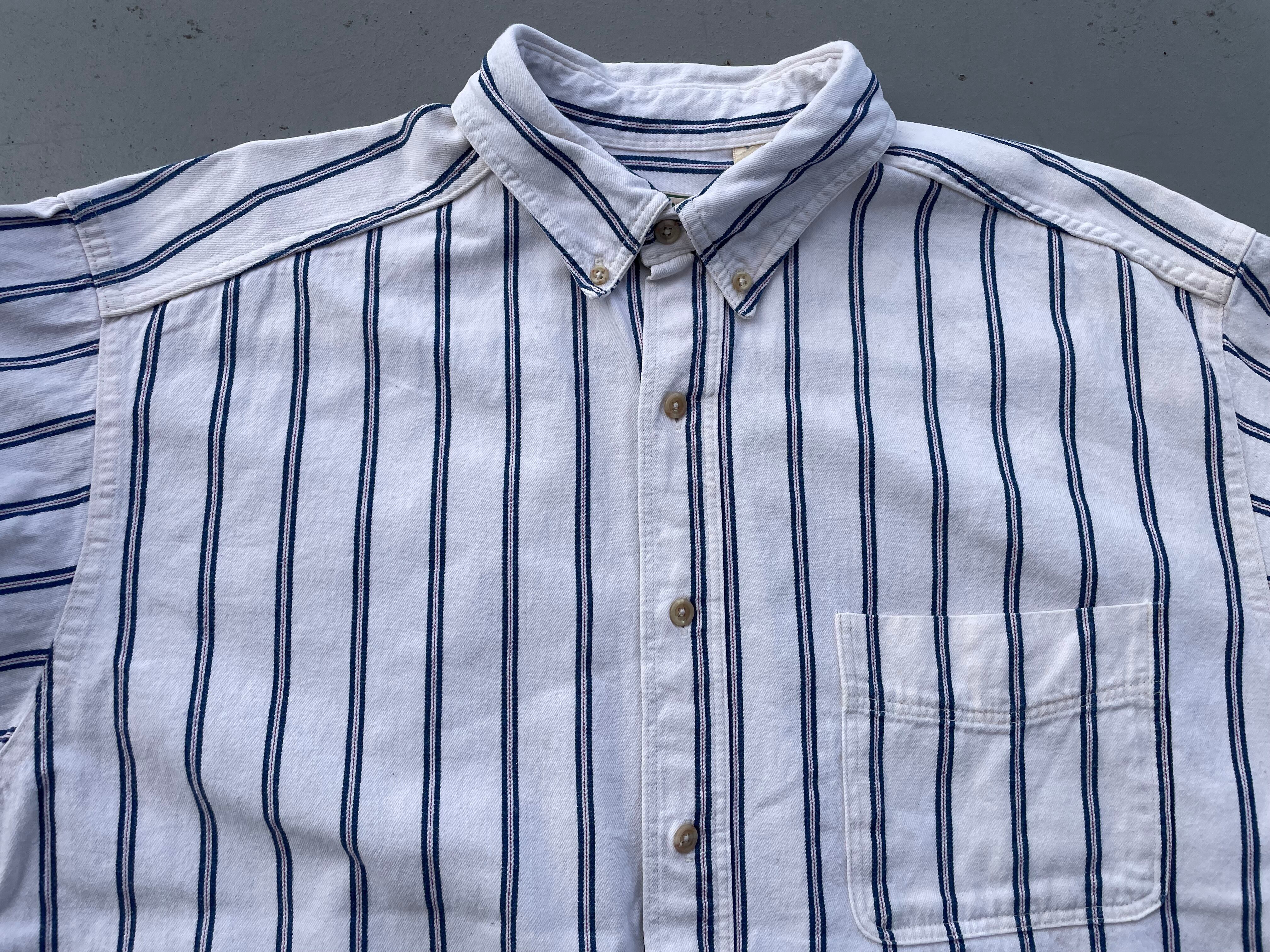 【商品詳細】エルエルビーンの長袖シャツ。サイズはL。カラーはホワイト×ブルー×レッドベースのマルチストライプパターン。90年代USA製。エルエルビーンでは珍しいヘビネルタイプのシャツ。アウトドアブランドらしからぬトリコカラーのような洒落たカラーリング。肉厚な生地感でハードにご着用いただけるかと。大きめサイズなのでガバッと着用出来ます。意外と無い系。