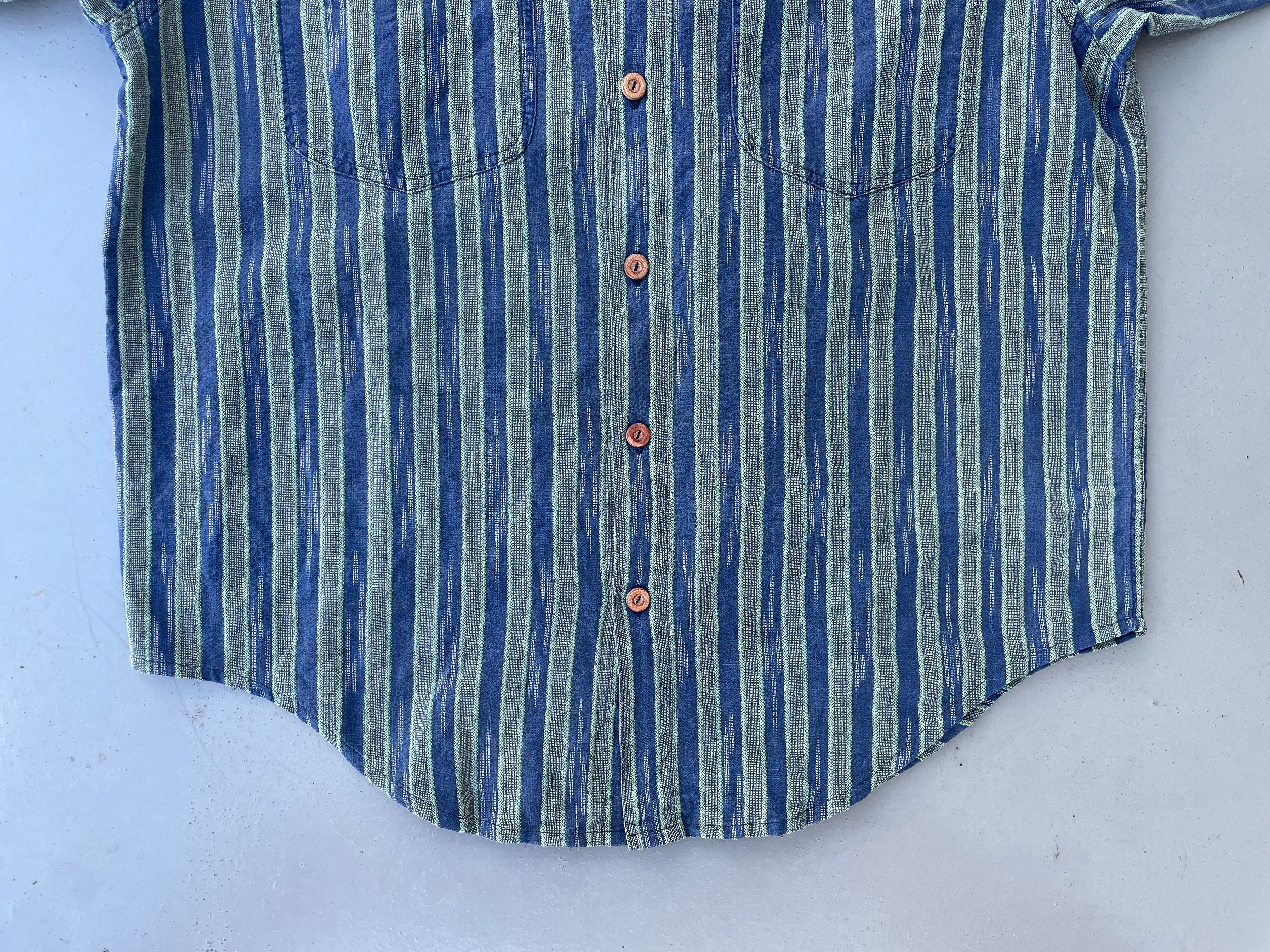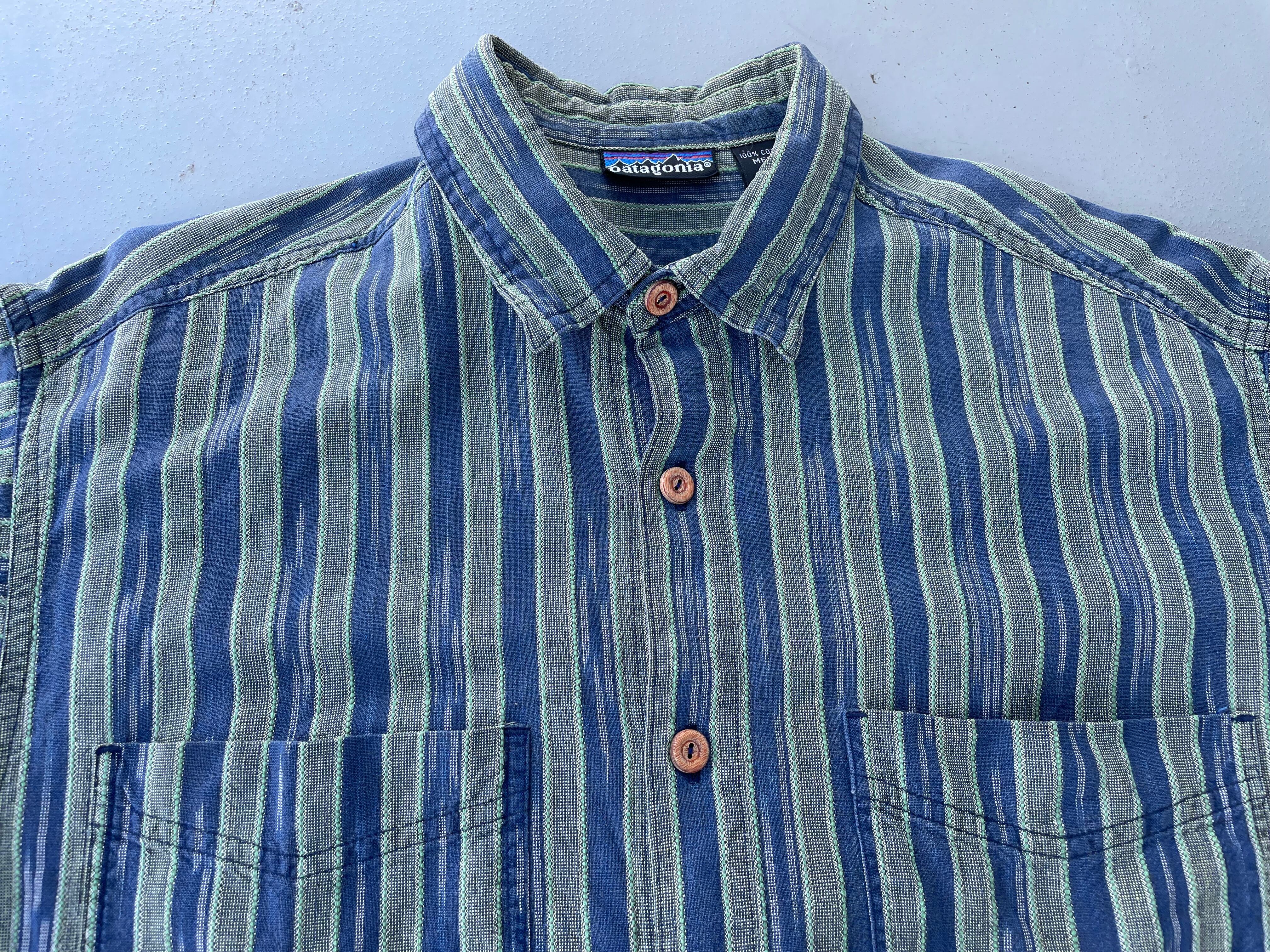 【商品詳細】パタゴニアの長袖シャツ。サイズはS。カラーはオリーブ×ブルーベースのストライプパターン。91年マカオ製。かすれたような渋い配色も塩梅の良いストライプが印象的な一着。立体的な編みになっており生地に表情があります。和モダンな風合いで一着で洒落た印象◎