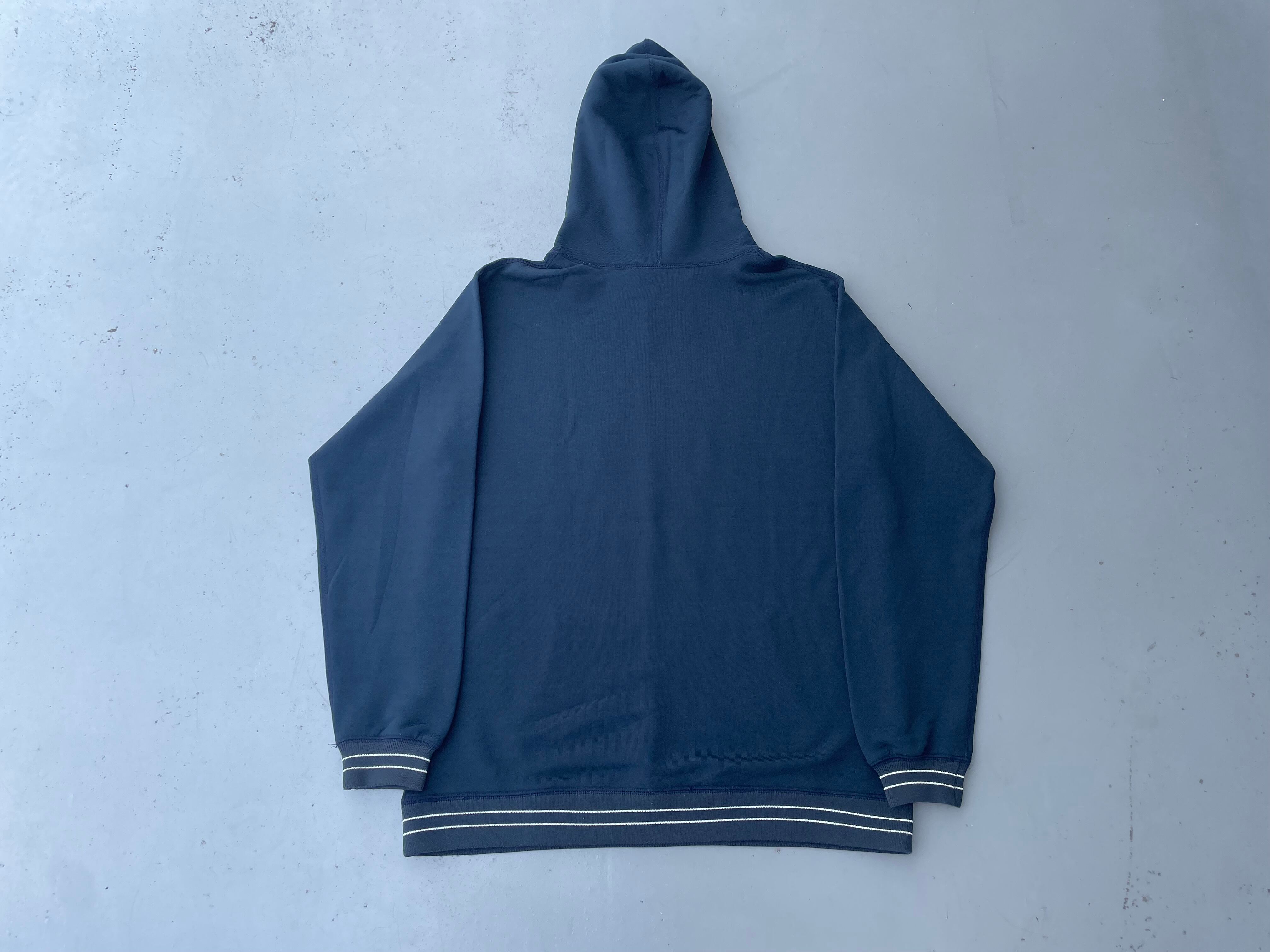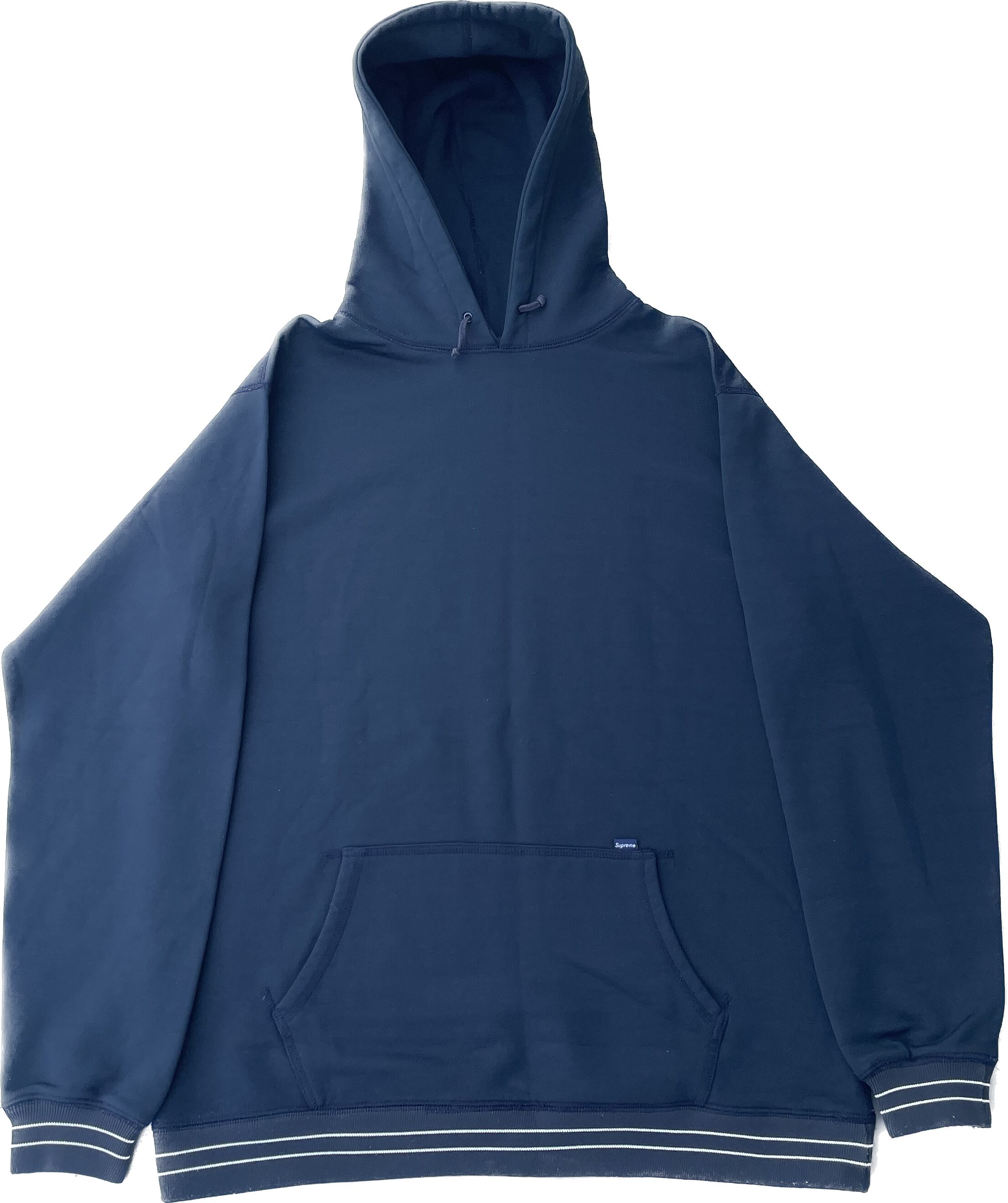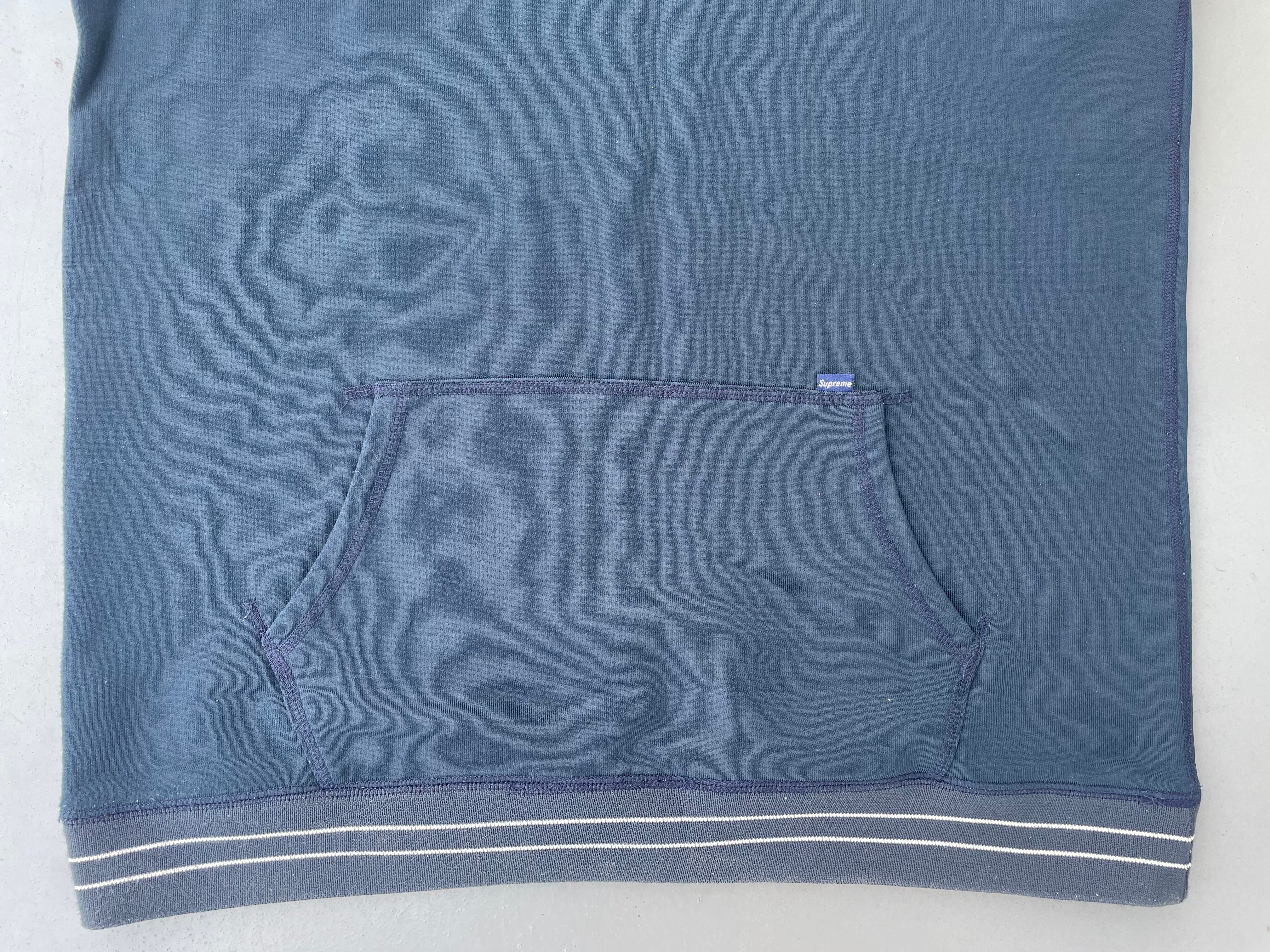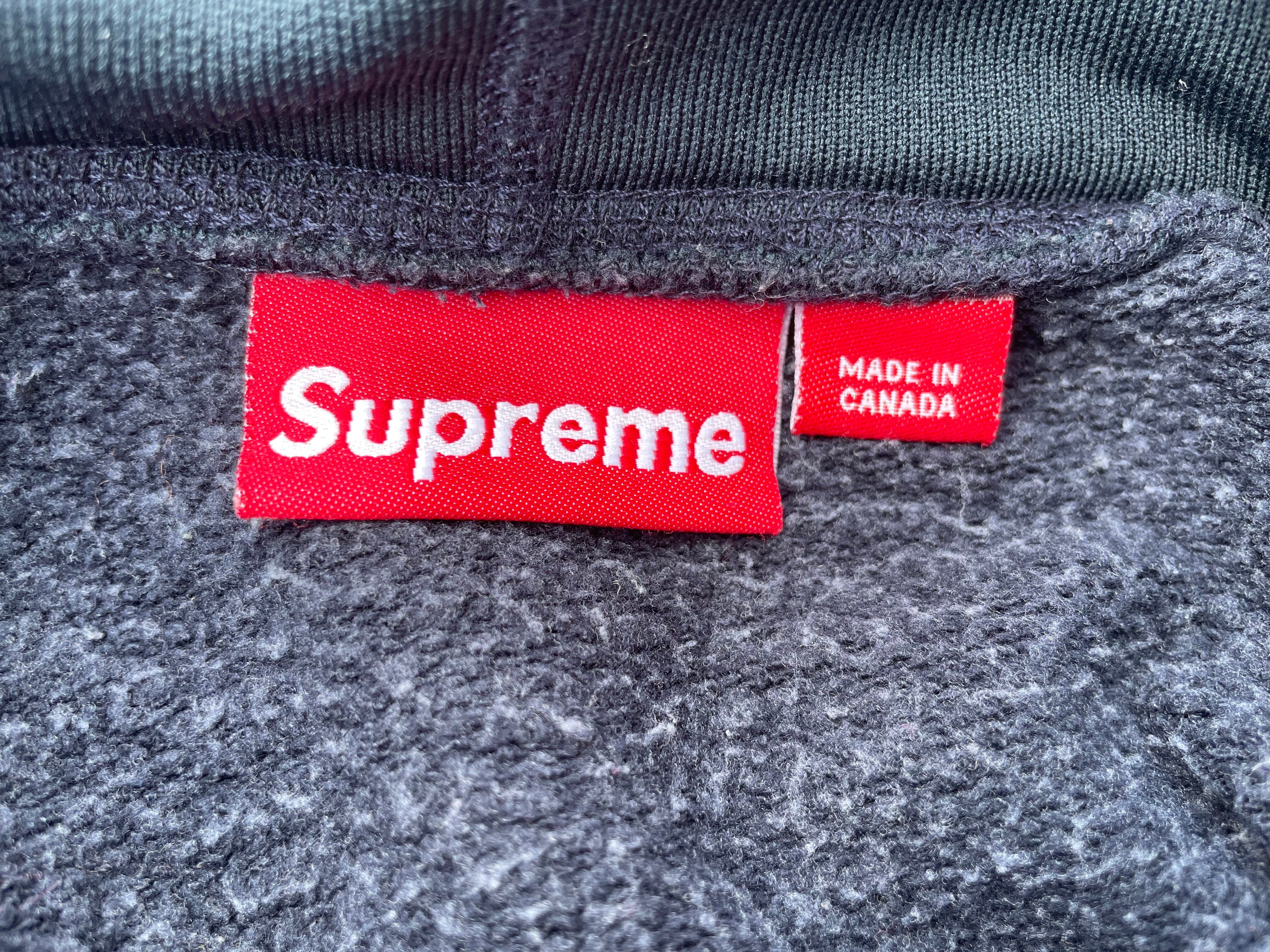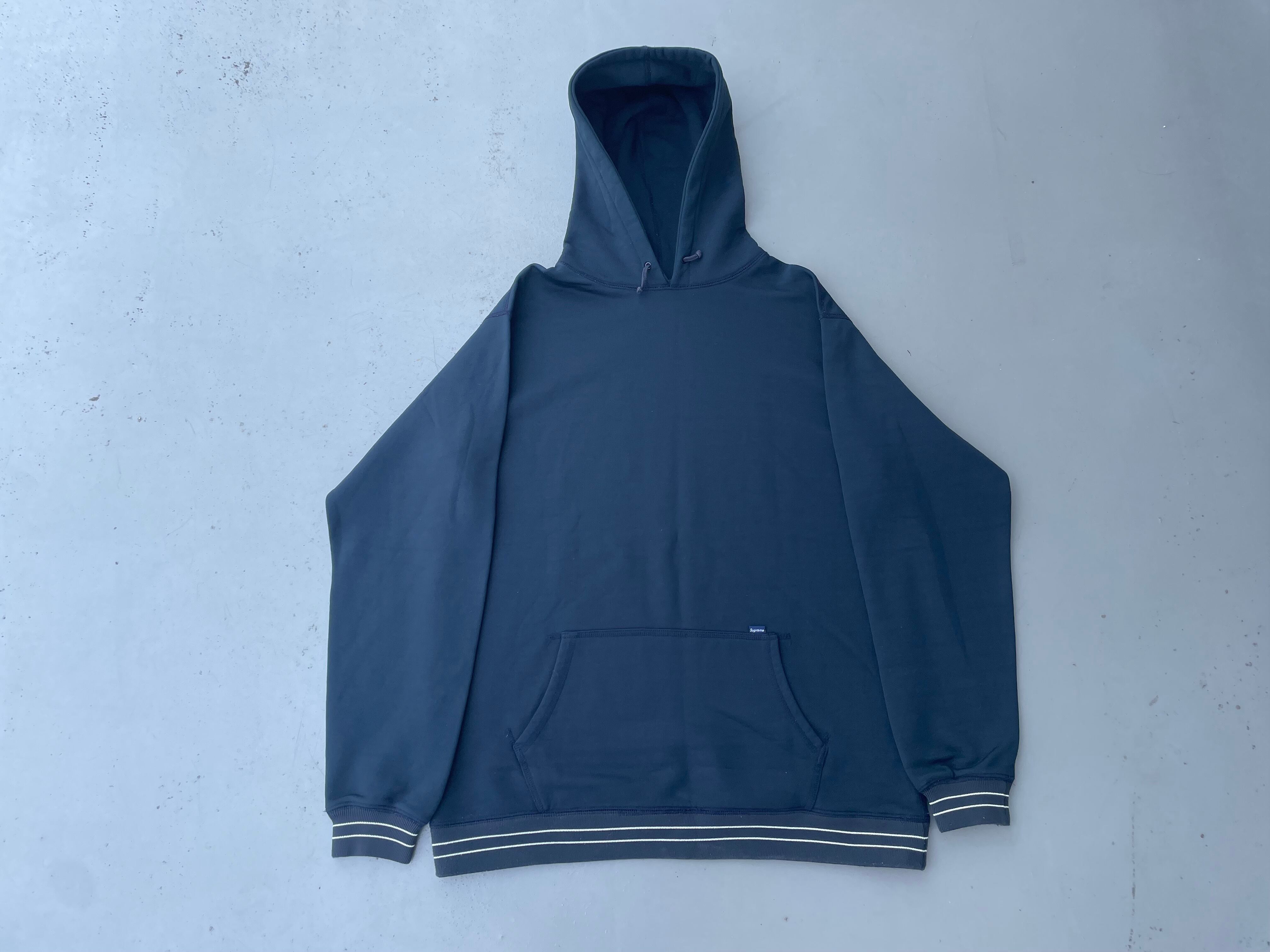 【商品詳細】シュプリームのプルオーバーパーカー。サイズはXL。カラーはブルーブラック。90-000年代カナダ製。渋めなブルーブラックカラーの無地ボディ。コットン・ナイロン・ポリエステル混紡のパイル地のような触り心地。ボーダーリブが良い味出してます。希少な紙タグの付くオールド物。ガバッと着れるXLサイズ。縮み等無く年代物の割に状態は良いと思います。