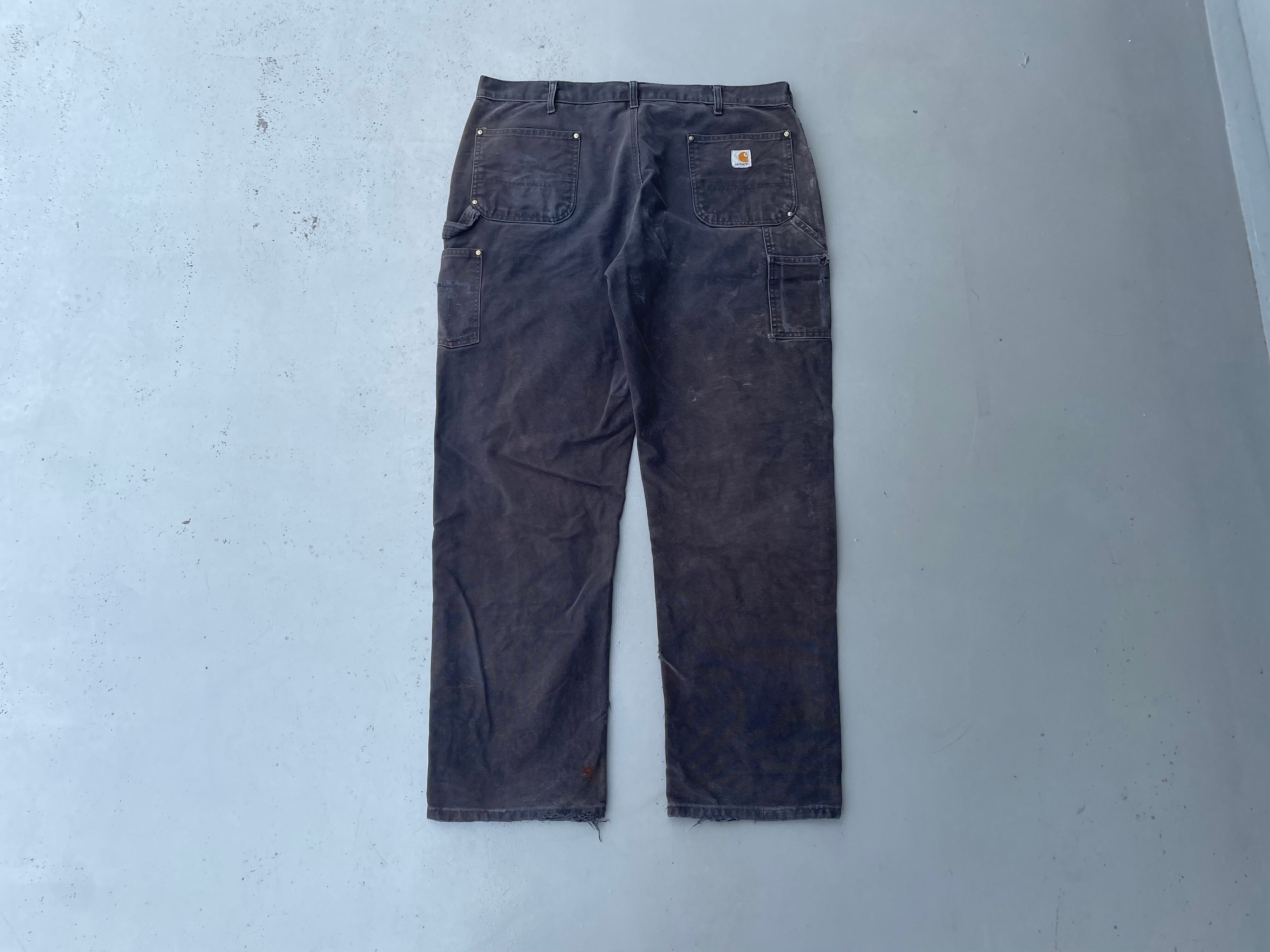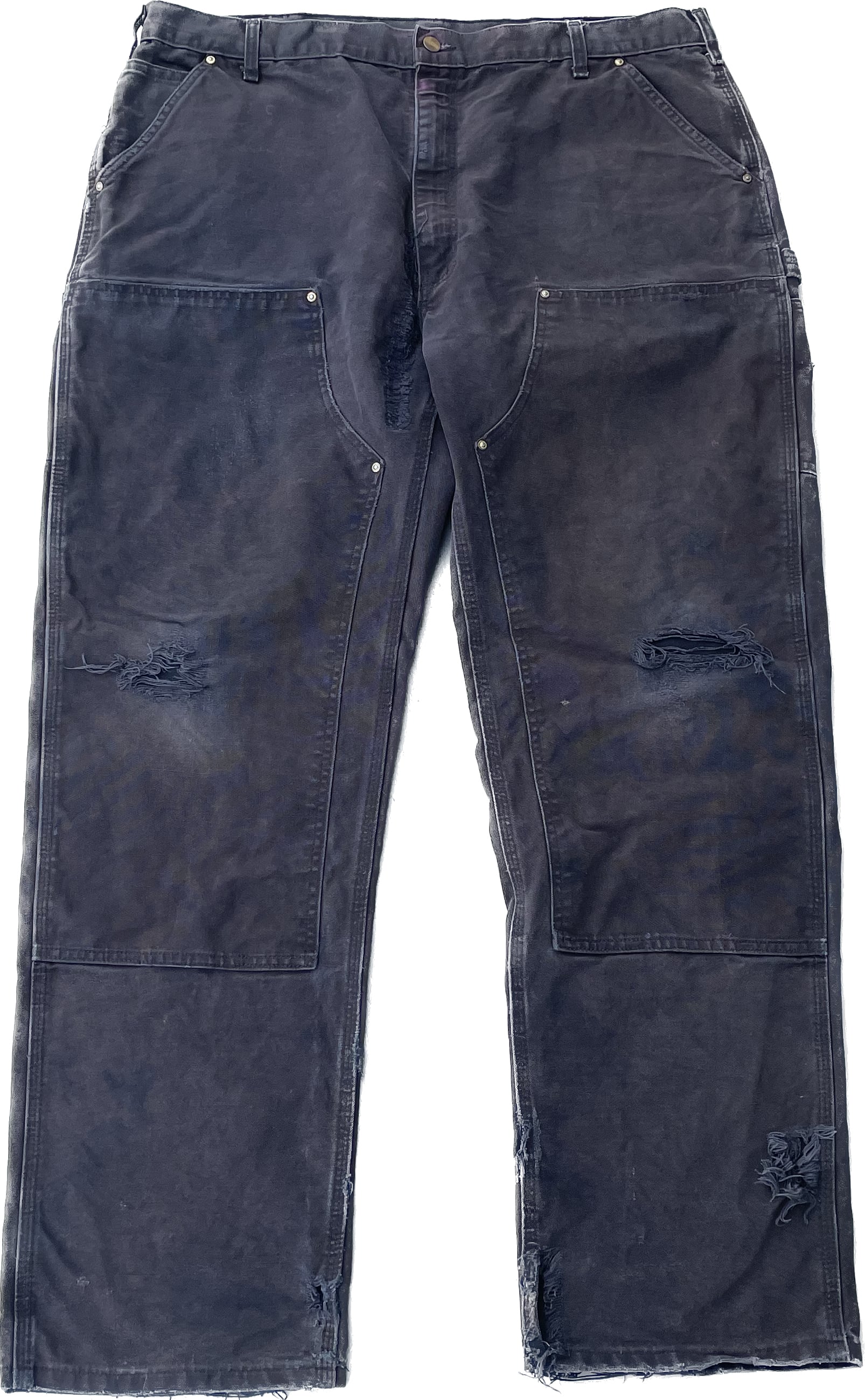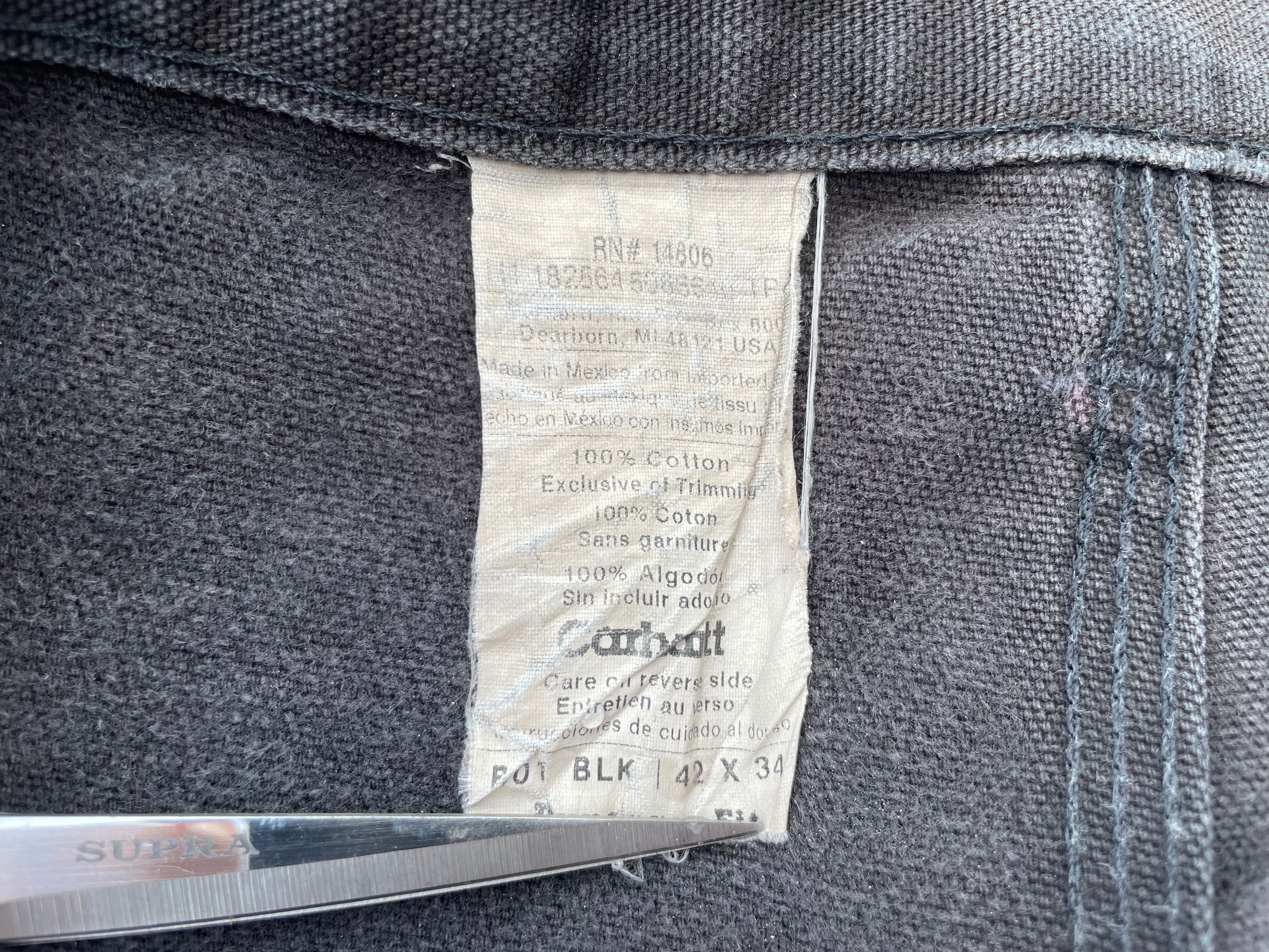 【商品詳細】カーハートのダブルニーパンツ。カラーはブラック。サイズはW42×L34。メキシコ製。カーハート定番人気のダブルニーパンツ。リアルユースな色落ちやダメージで雰囲気あります。どかんと大きめW42×L34なのでルーズに履いて下さい。状態考慮でプライス抑えてますがもはやデザインなのでお買い得だと思います。