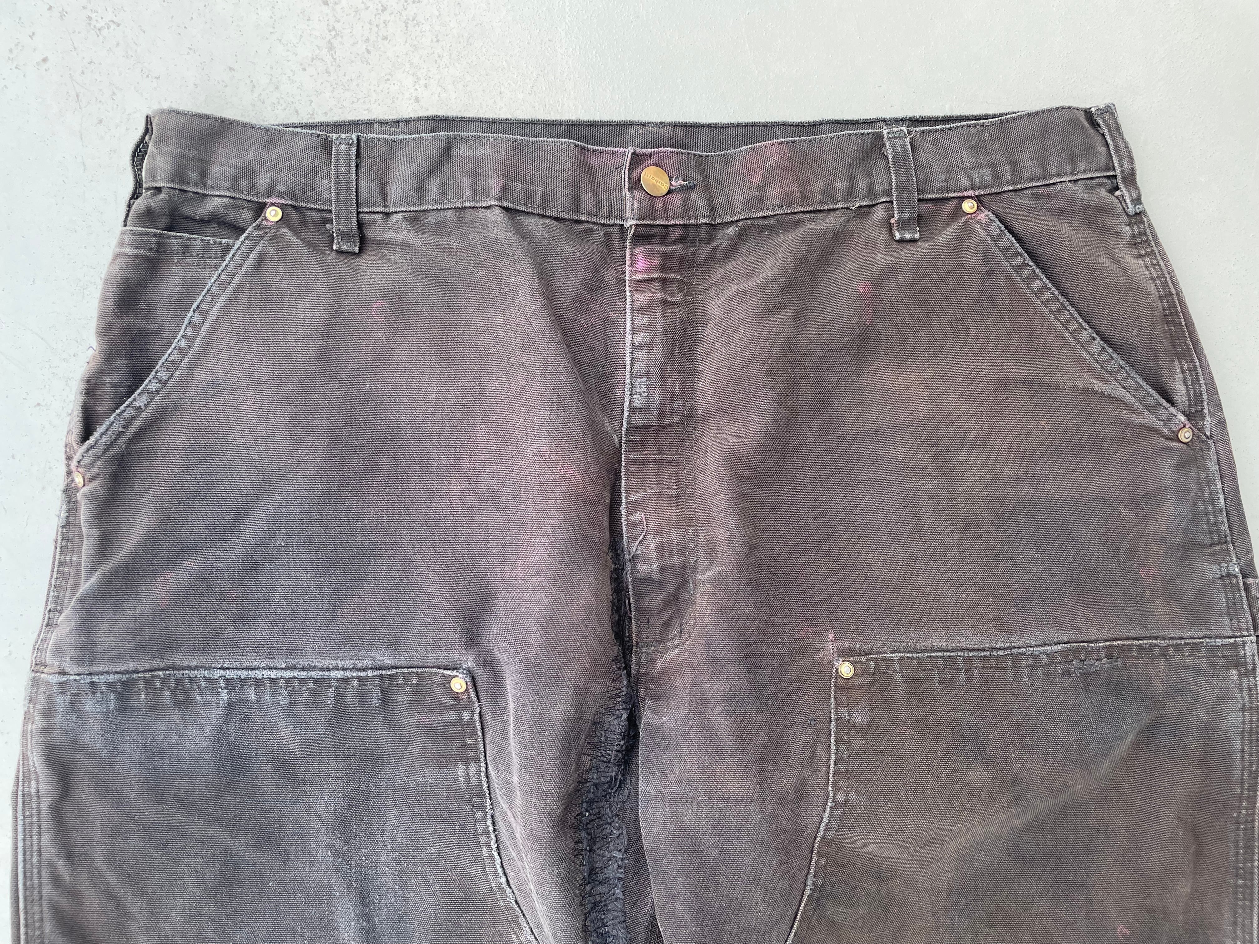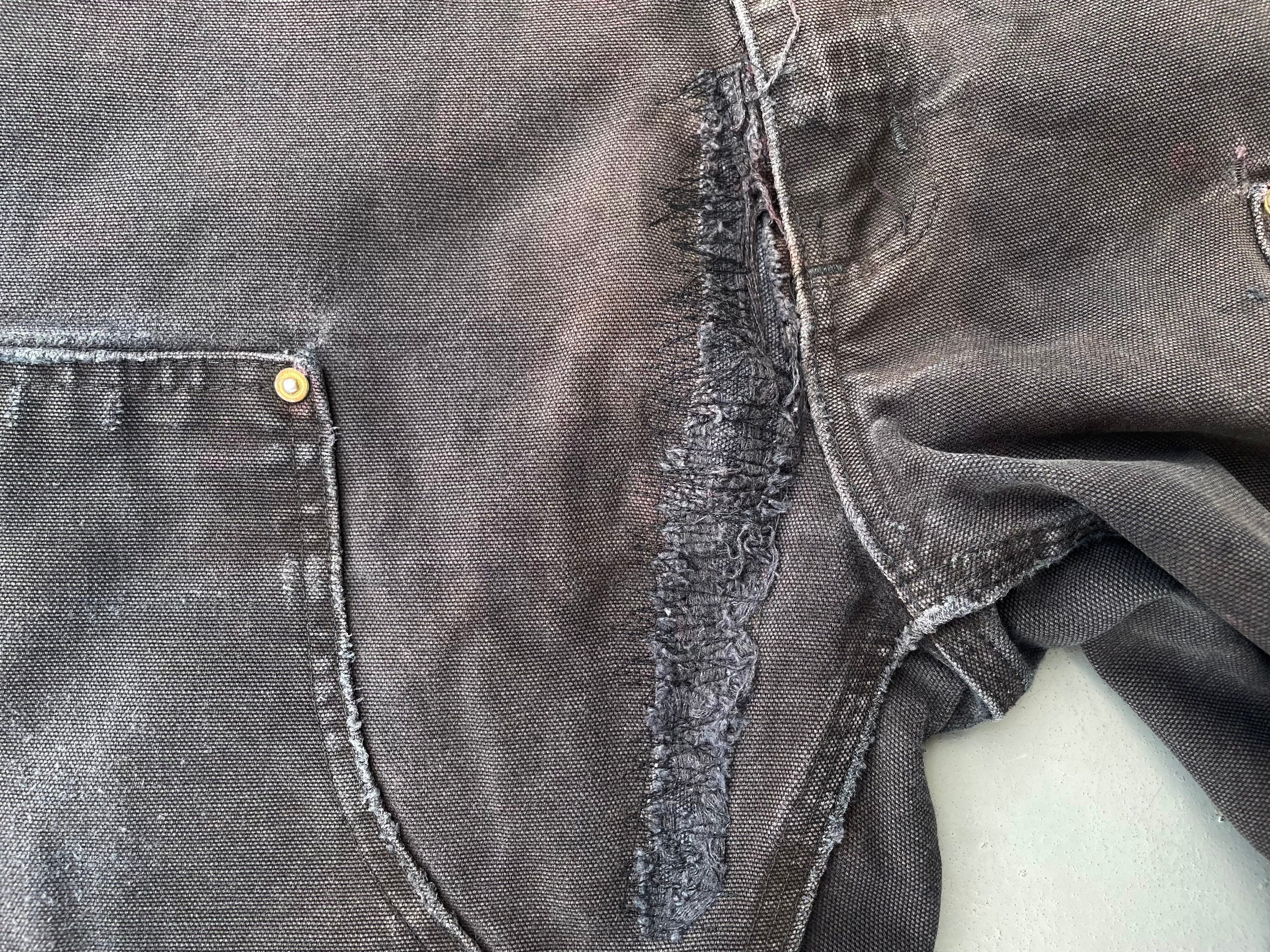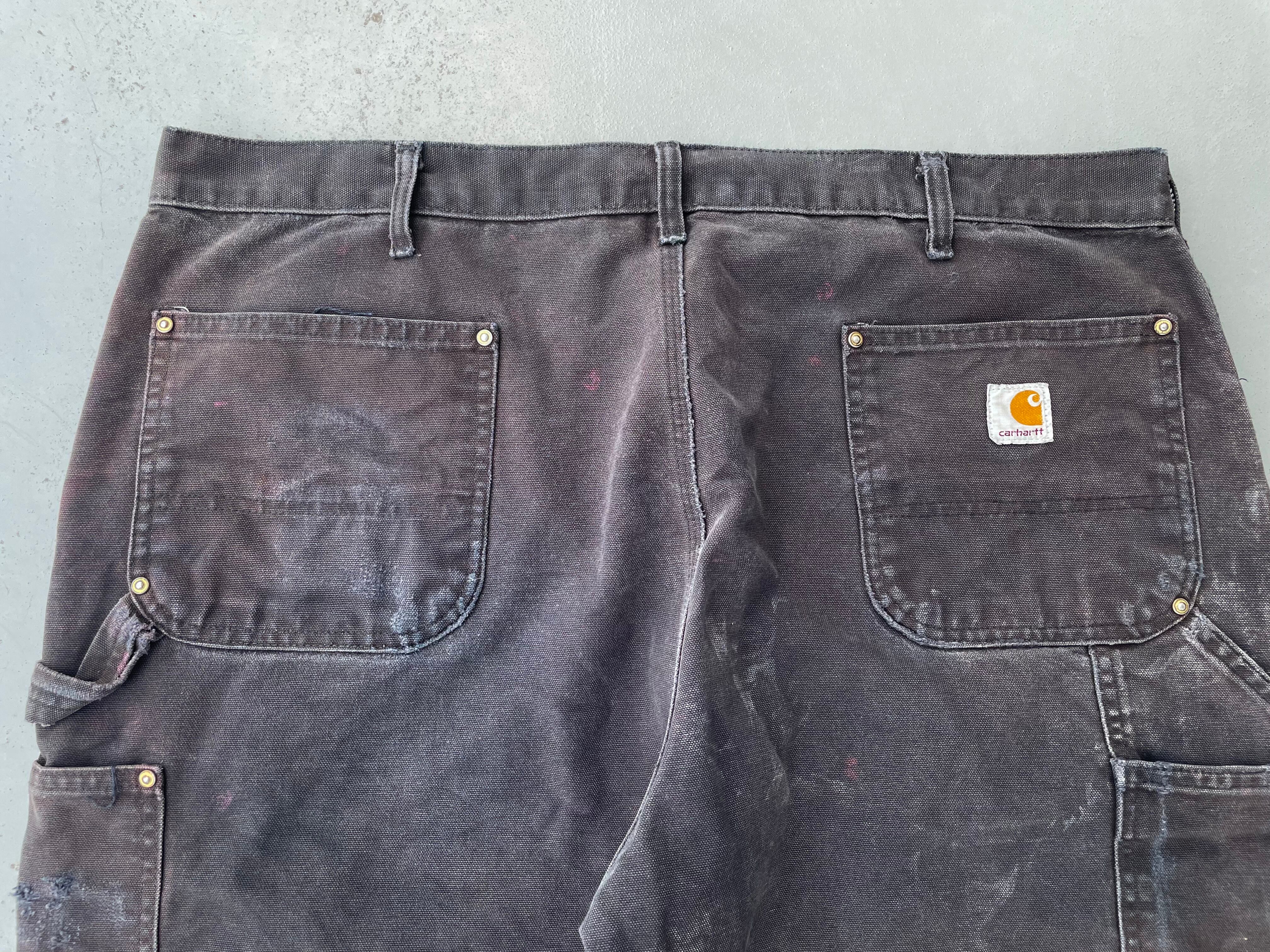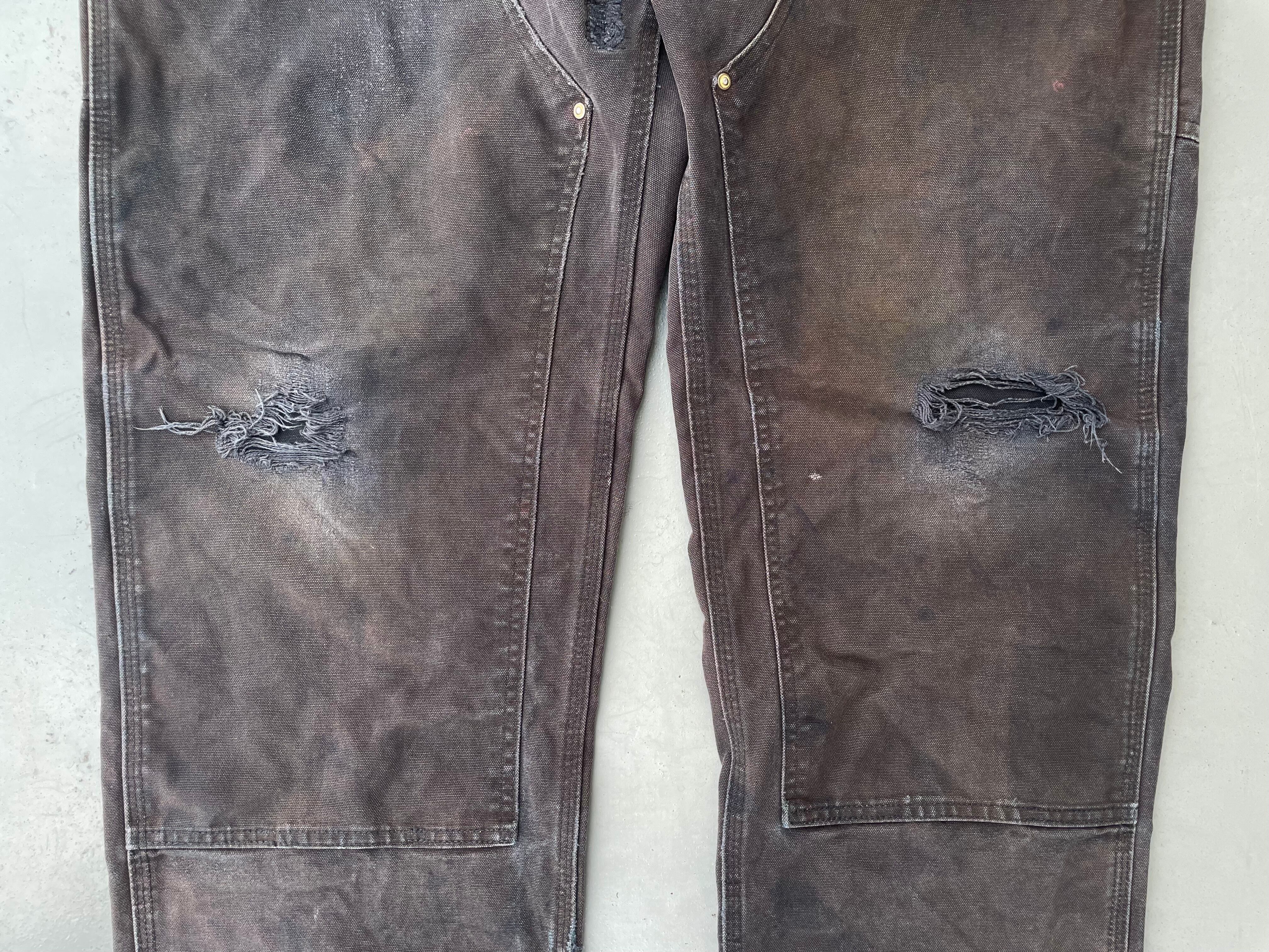 【商品詳細】カーハートのダブルニーパンツ。カラーはブラック。サイズはW42×L34。メキシコ製。カーハート定番人気のダブルニーパンツ。リアルユースな色落ちやダメージで雰囲気あります。どかんと大きめW42×L34なのでルーズに履いて下さい。状態考慮でプライス抑えてますがもはやデザインなのでお買い得だと思います。