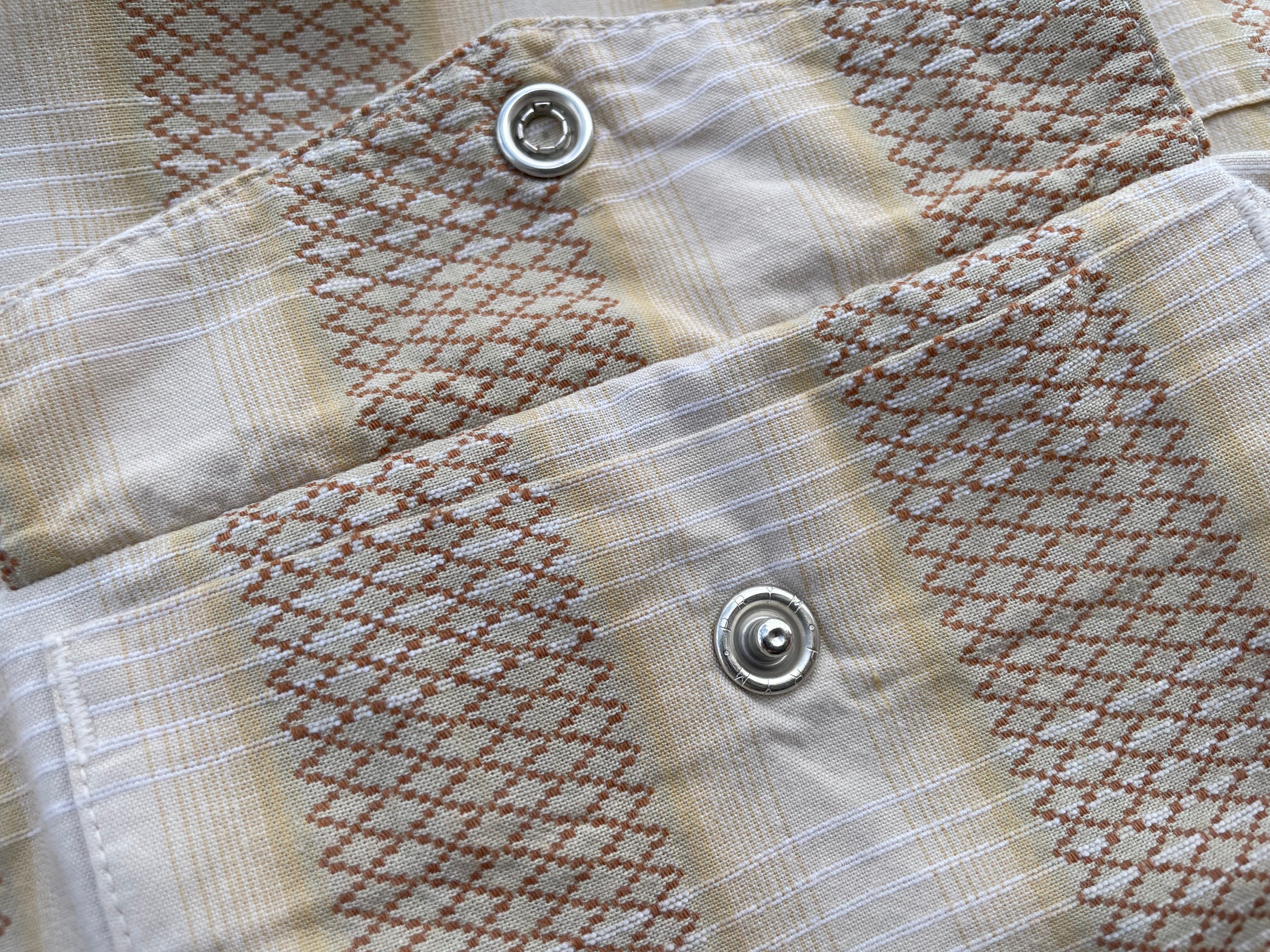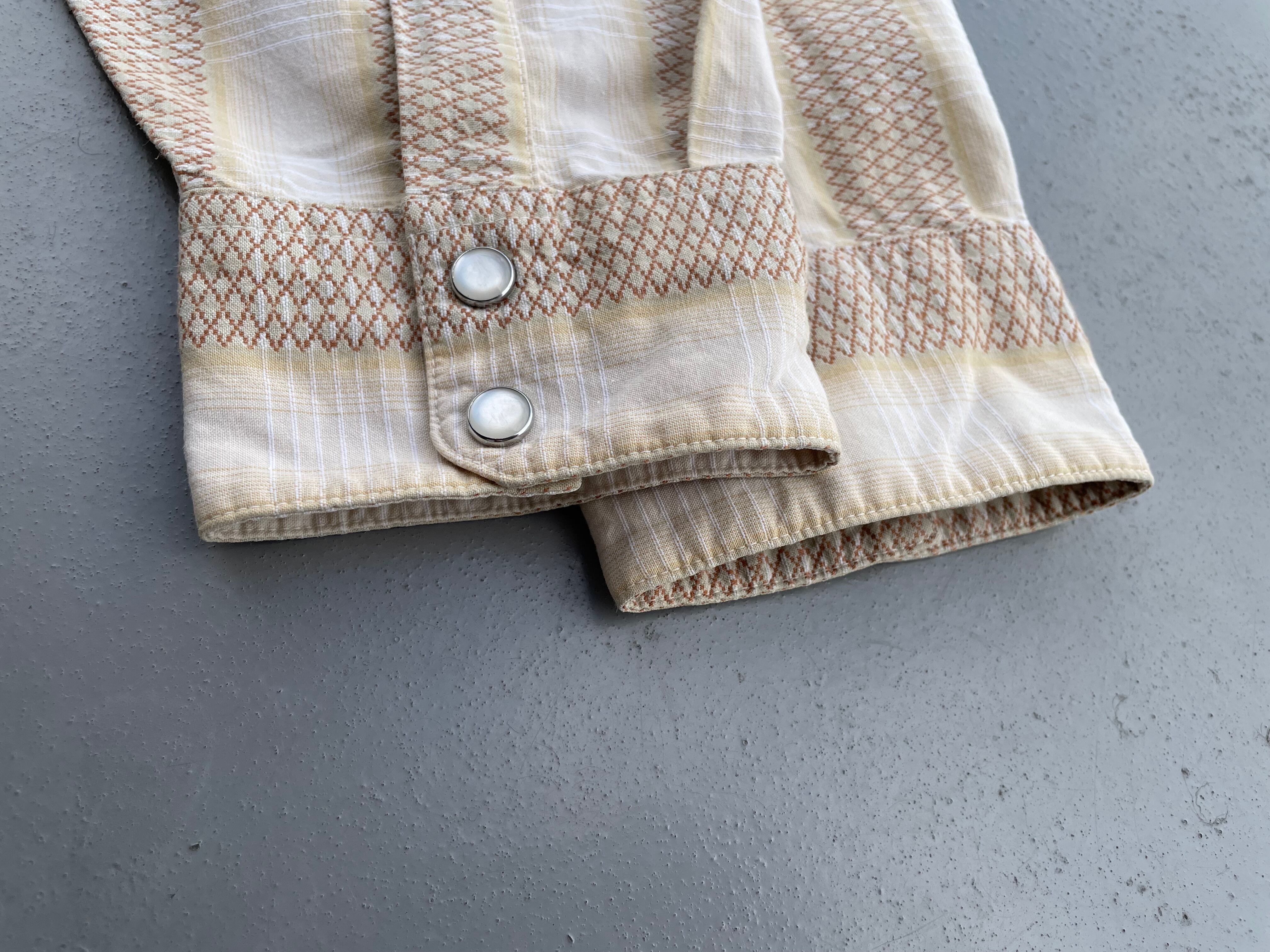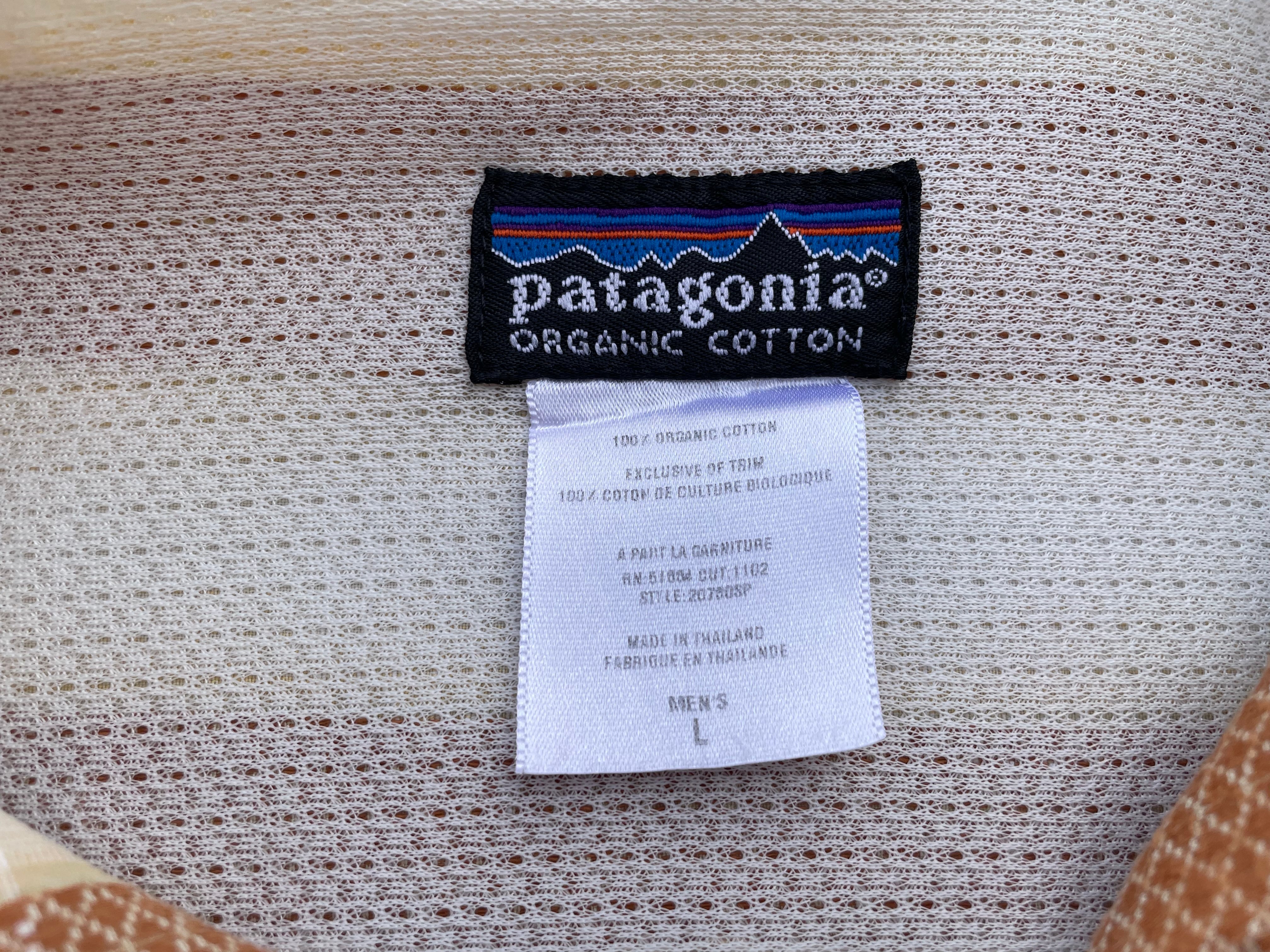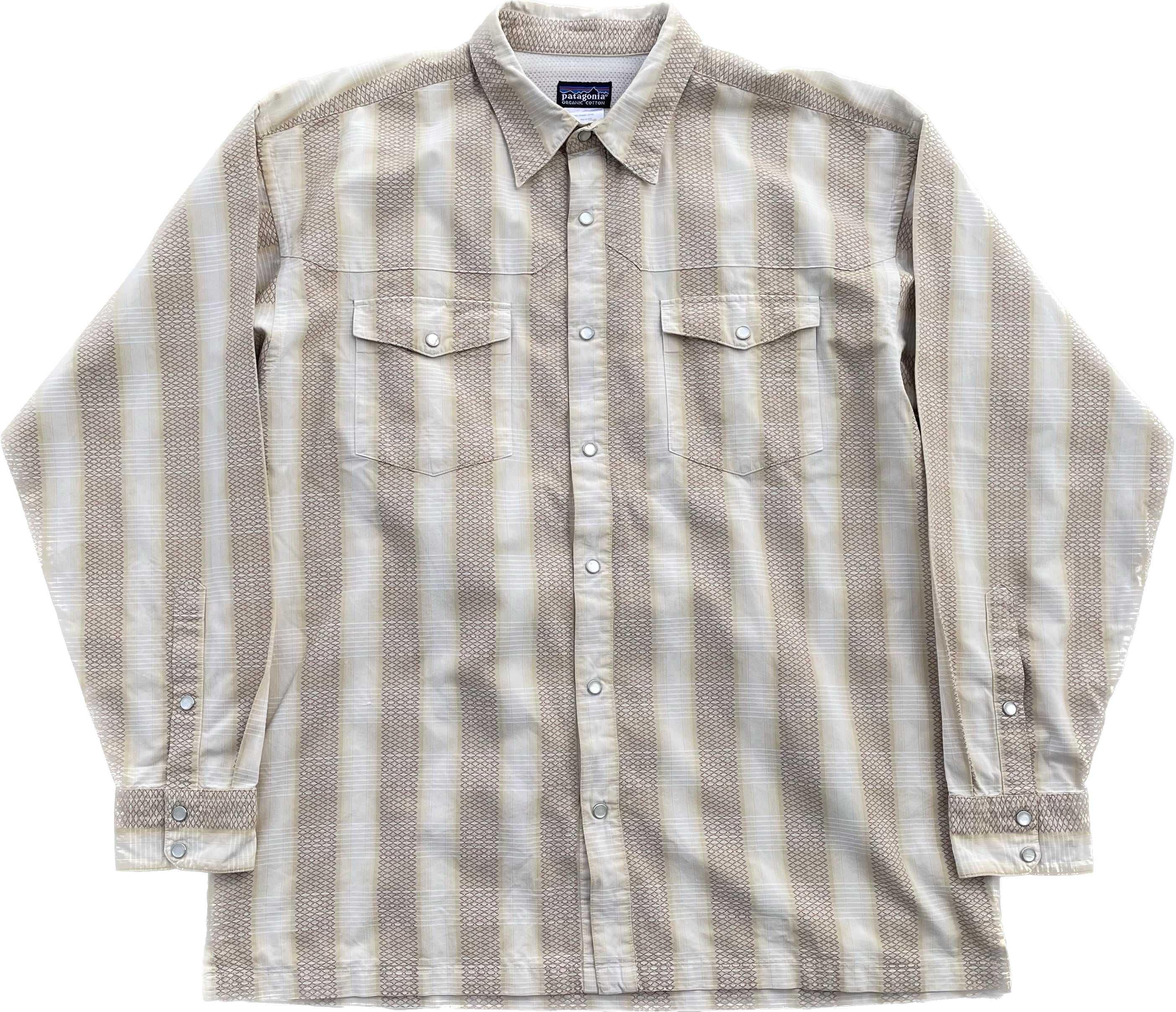 【商品詳細】パタゴニアのシャドーストライプウェスタンシャツ。サイズはL。カラーはホワイト×ブラックのオンブレパターン。03年タイ製。リズムライン定番ウェスタンシャツ。ネイティブ模様×シャドーチェックを重ねたワイドストライプ仕様の洒落た1着。ボックスシルエットで今っぽくご着用いただけるかと。ウェスタンシャツ着た事ない方でもこれならチャレンジしやすいと思います。