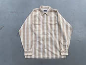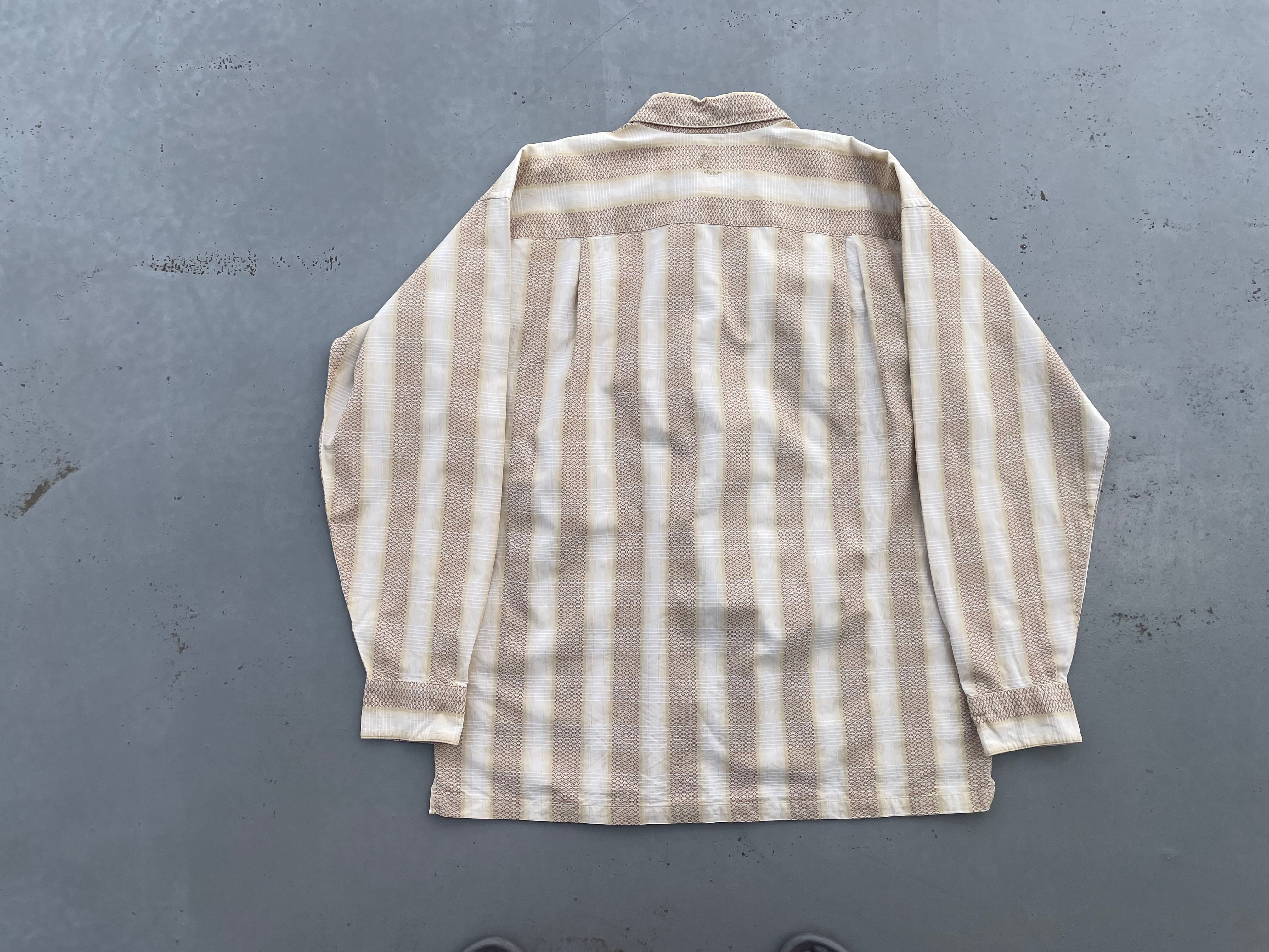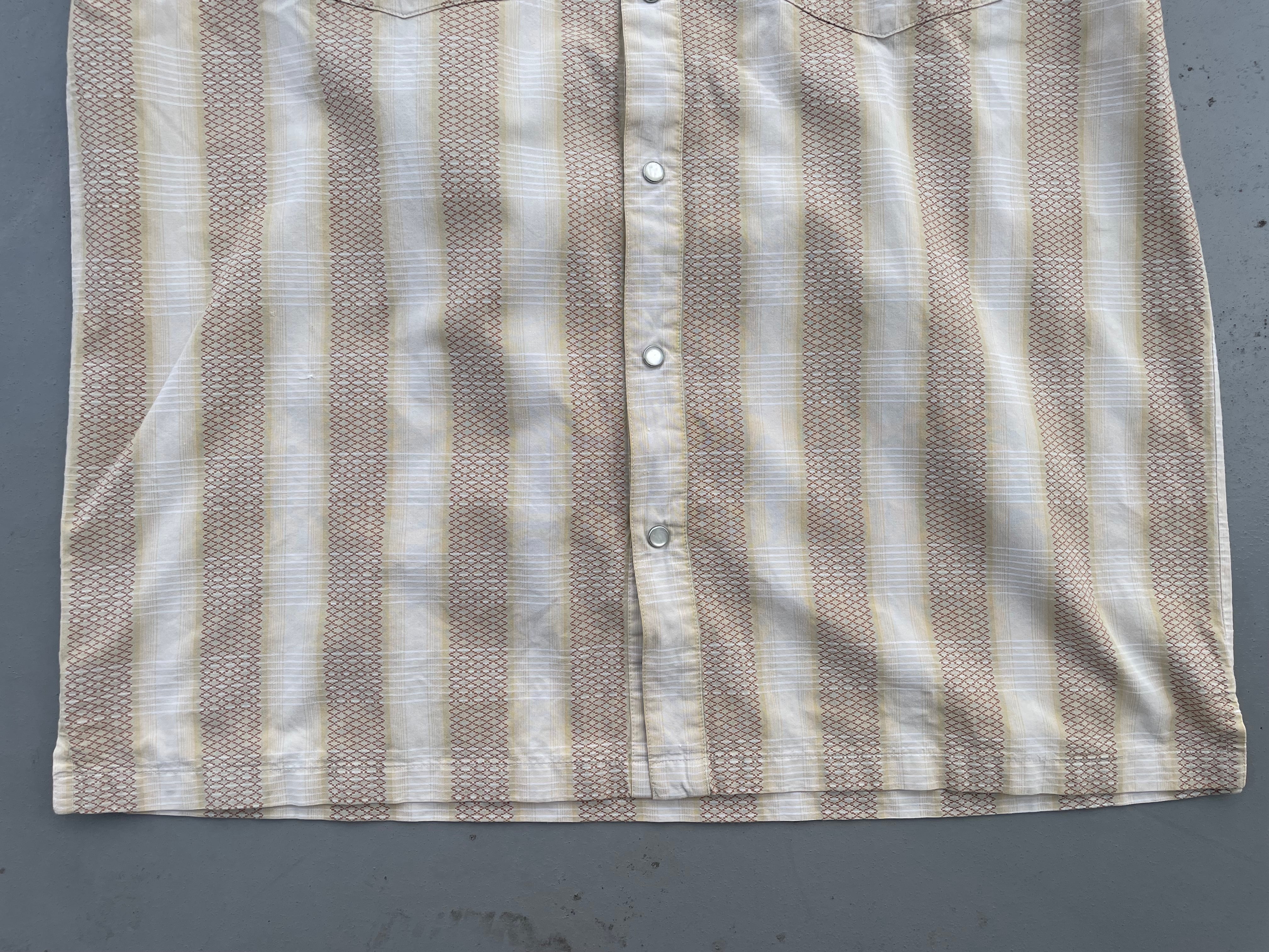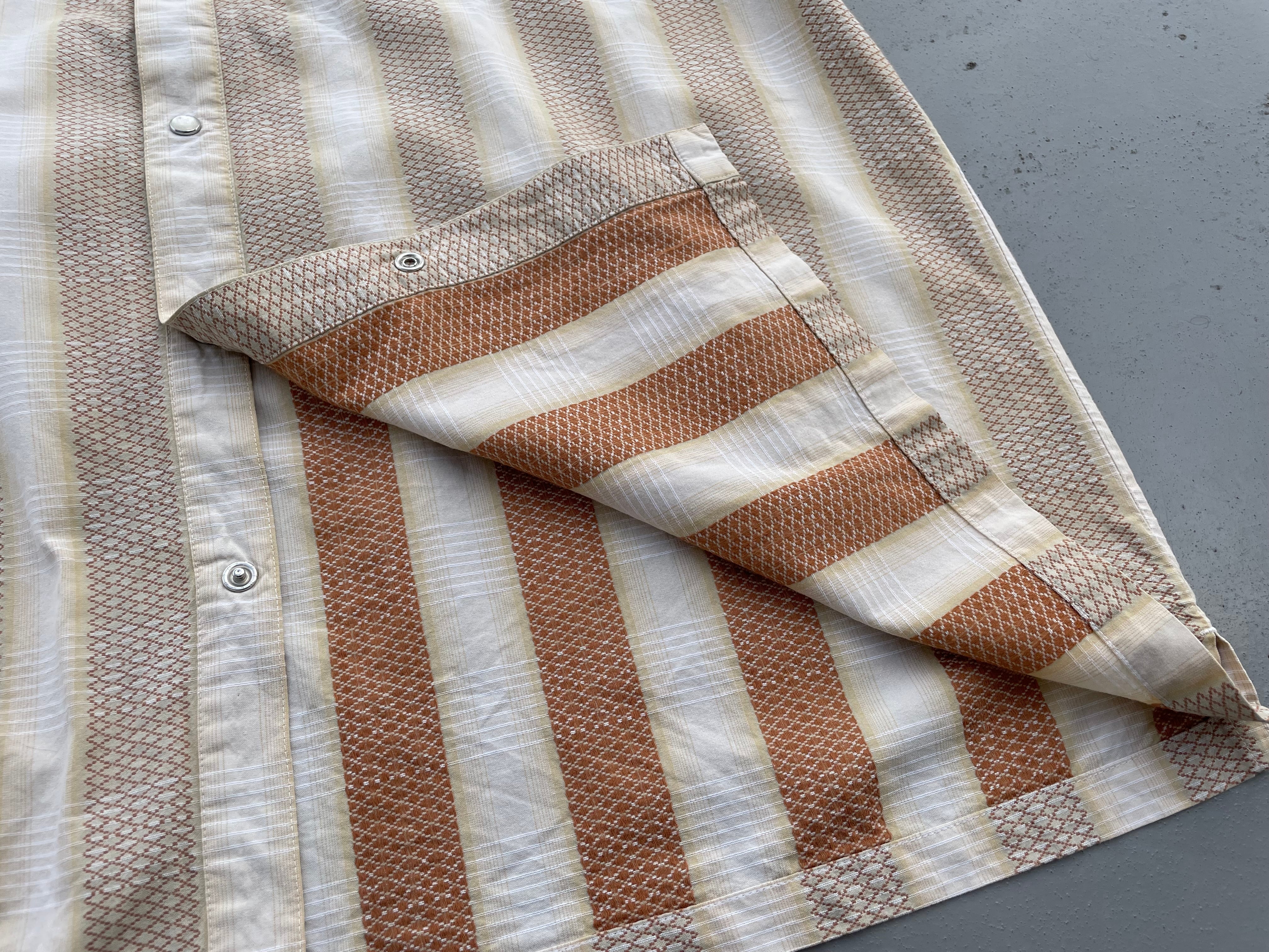 【商品詳細】パタゴニアのシャドーストライプウェスタンシャツ。サイズはL。カラーはホワイト×ブラックのオンブレパターン。03年タイ製。リズムライン定番ウェスタンシャツ。ネイティブ模様×シャドーチェックを重ねたワイドストライプ仕様の洒落た1着。ボックスシルエットで今っぽくご着用いただけるかと。ウェスタンシャツ着た事ない方でもこれならチャレンジしやすいと思います。