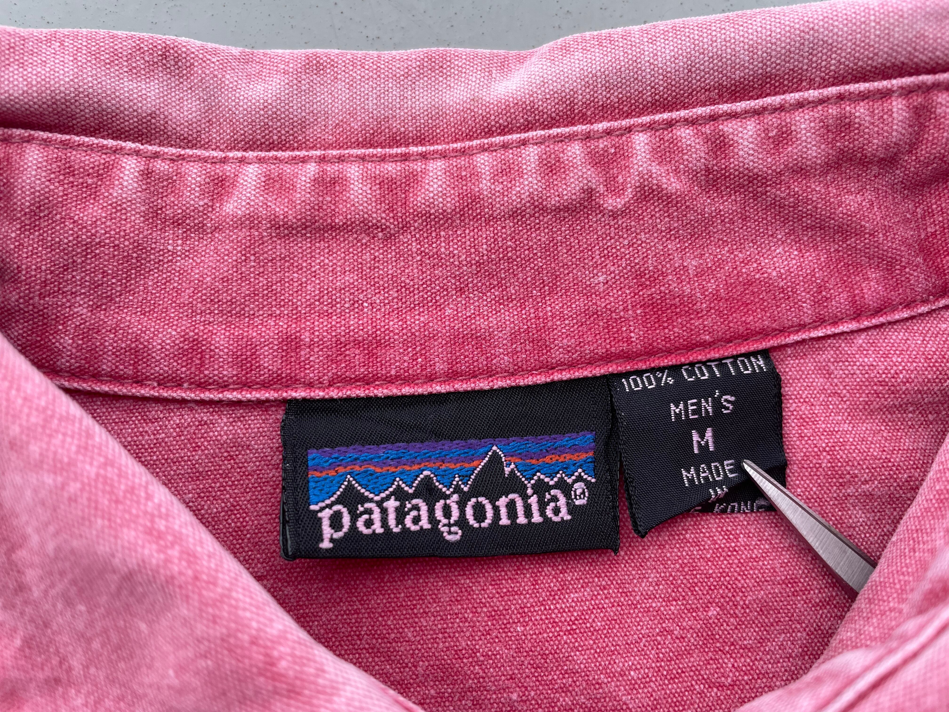【商品詳細】パタゴニアのコットンキャンバス長袖シャツ。サイズはM。カラーはサーモンピンク。80-90年代中国製。オールドパタゴニア定番のキャンバスシャツ。厚手のキャンバス地でハードにご使用いただけます。良い塩梅にペンキ飛びや汚れあり雰囲気のある個体。