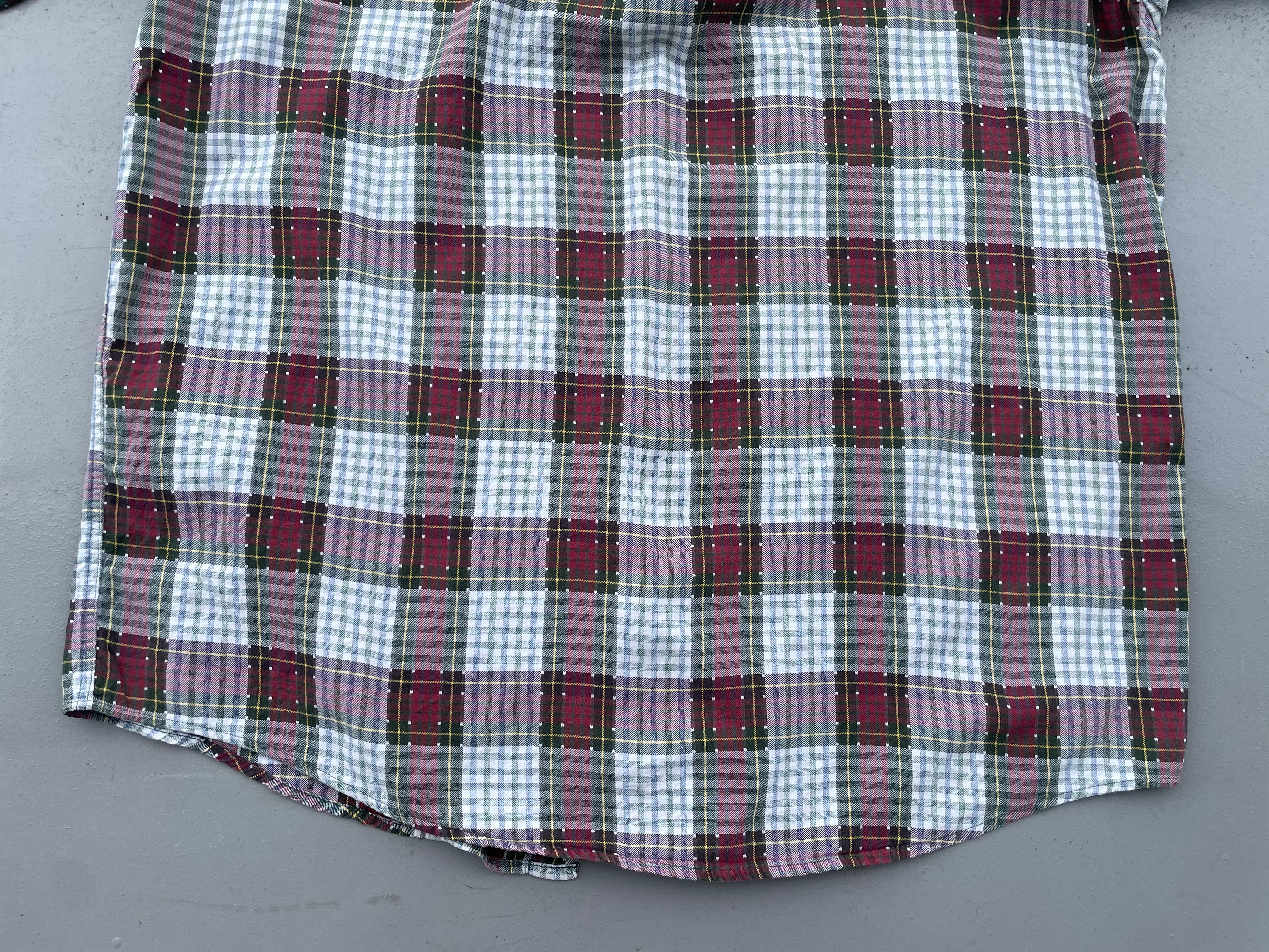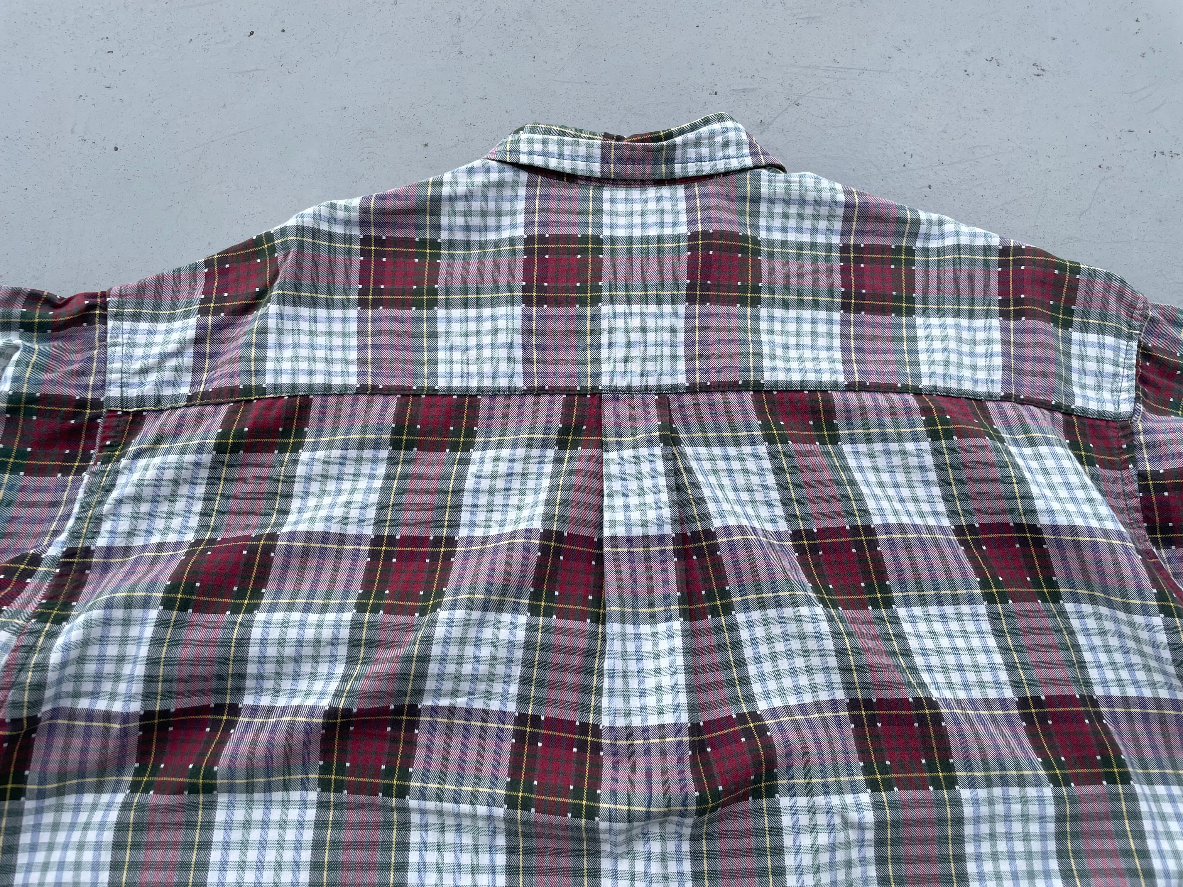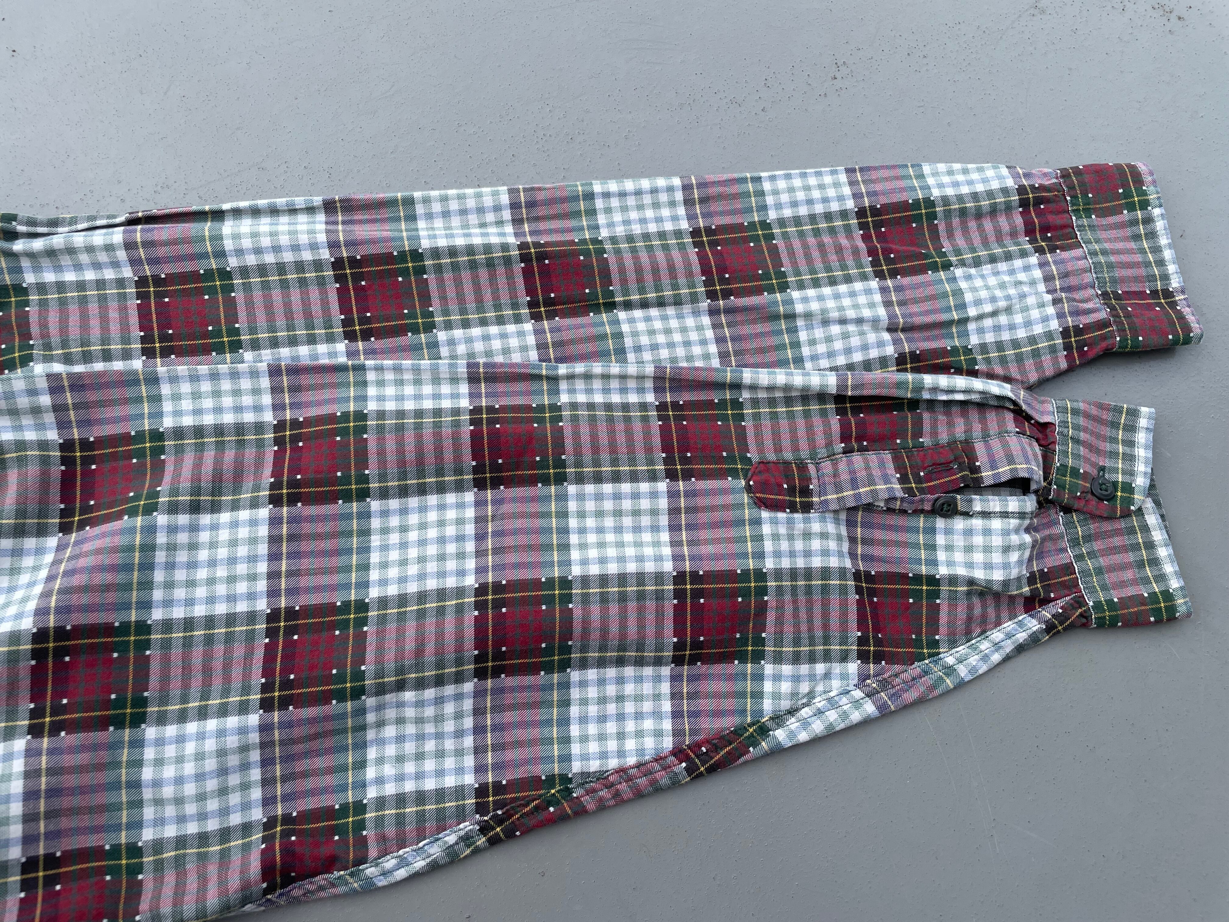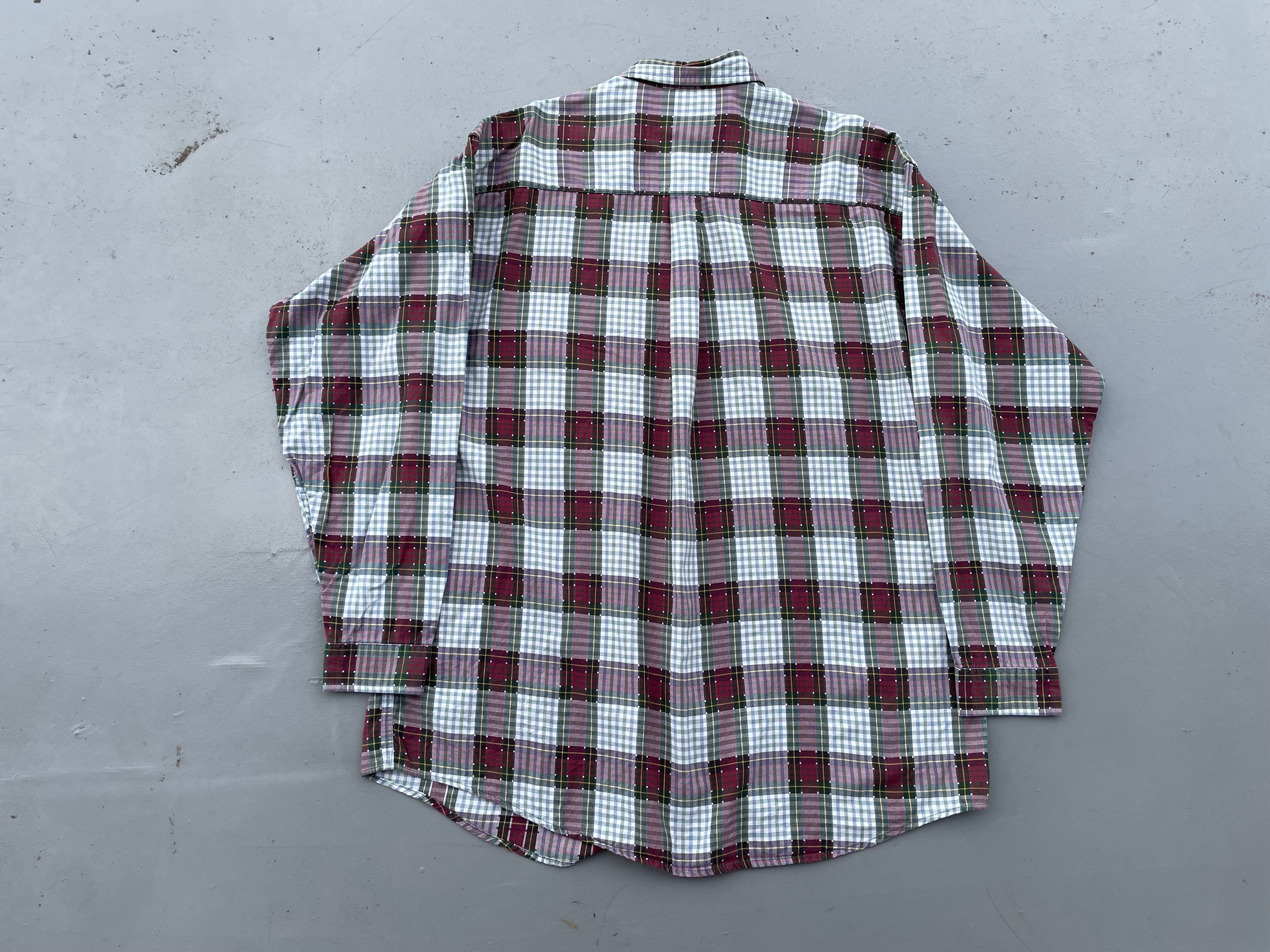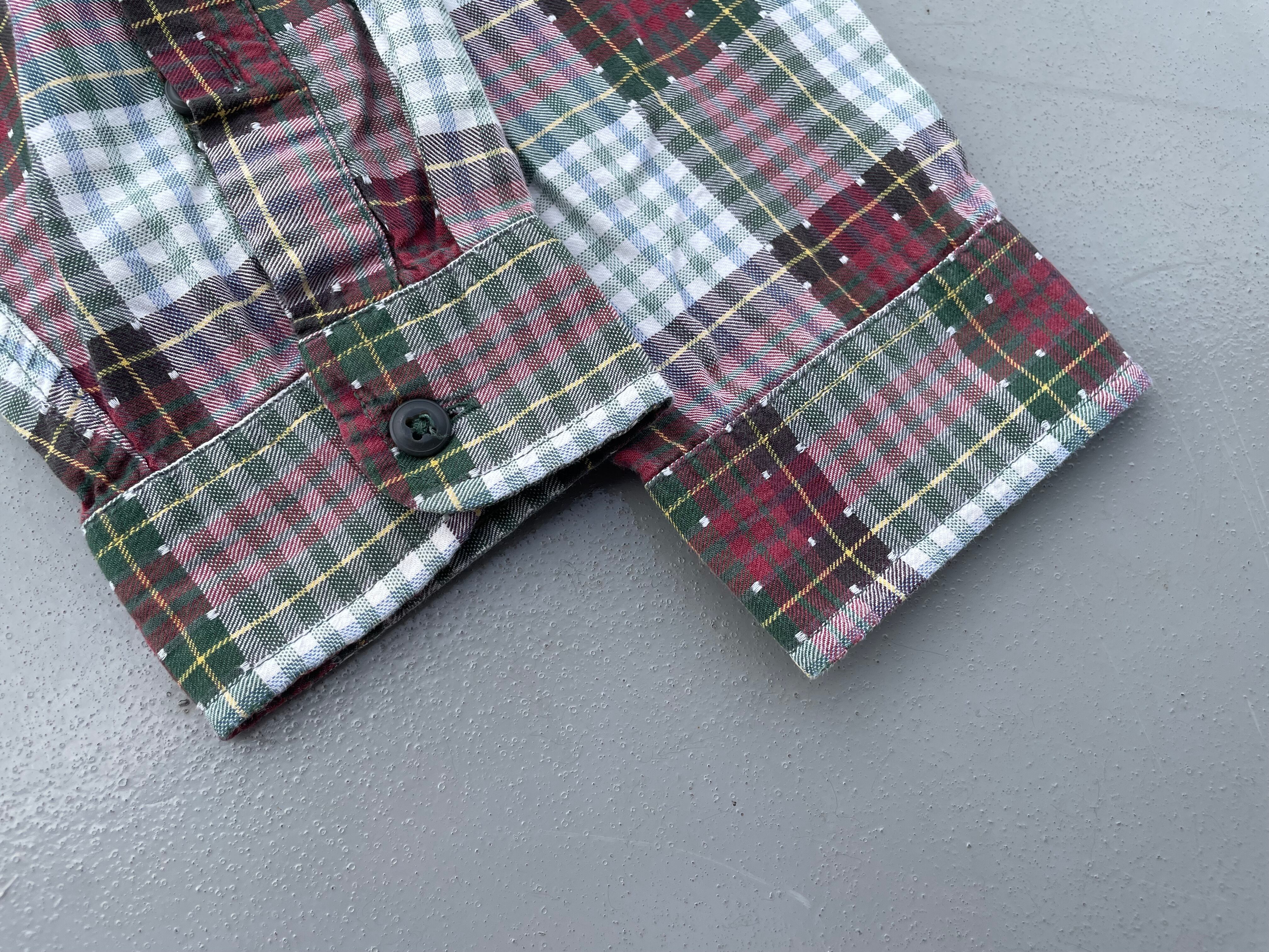 【商品詳細】パタゴニアの長袖シャツ。サイズはXL。カラーはホワイト×グリーン×レッドベースのチェックパターン。94年ポルトガル製。濃薄のボックスチェックが連なる洒落たデザイン。厚過ぎない程よい生地感でこれからの季節良さそうです。ポルトガル製×XLサイズの条件揃った個体◎リペア跡・ほつれございますが写真の通りあまり目立たないです。