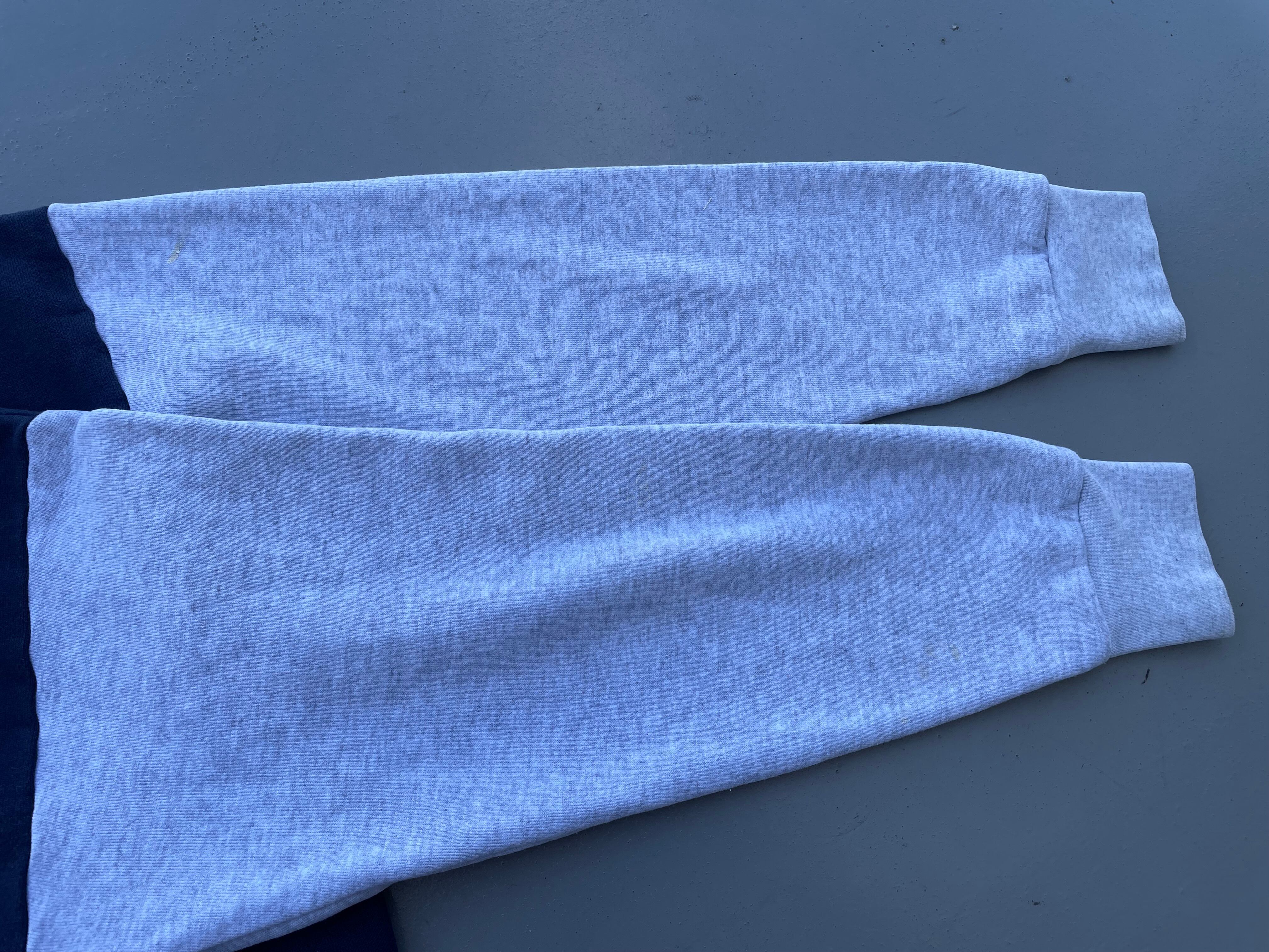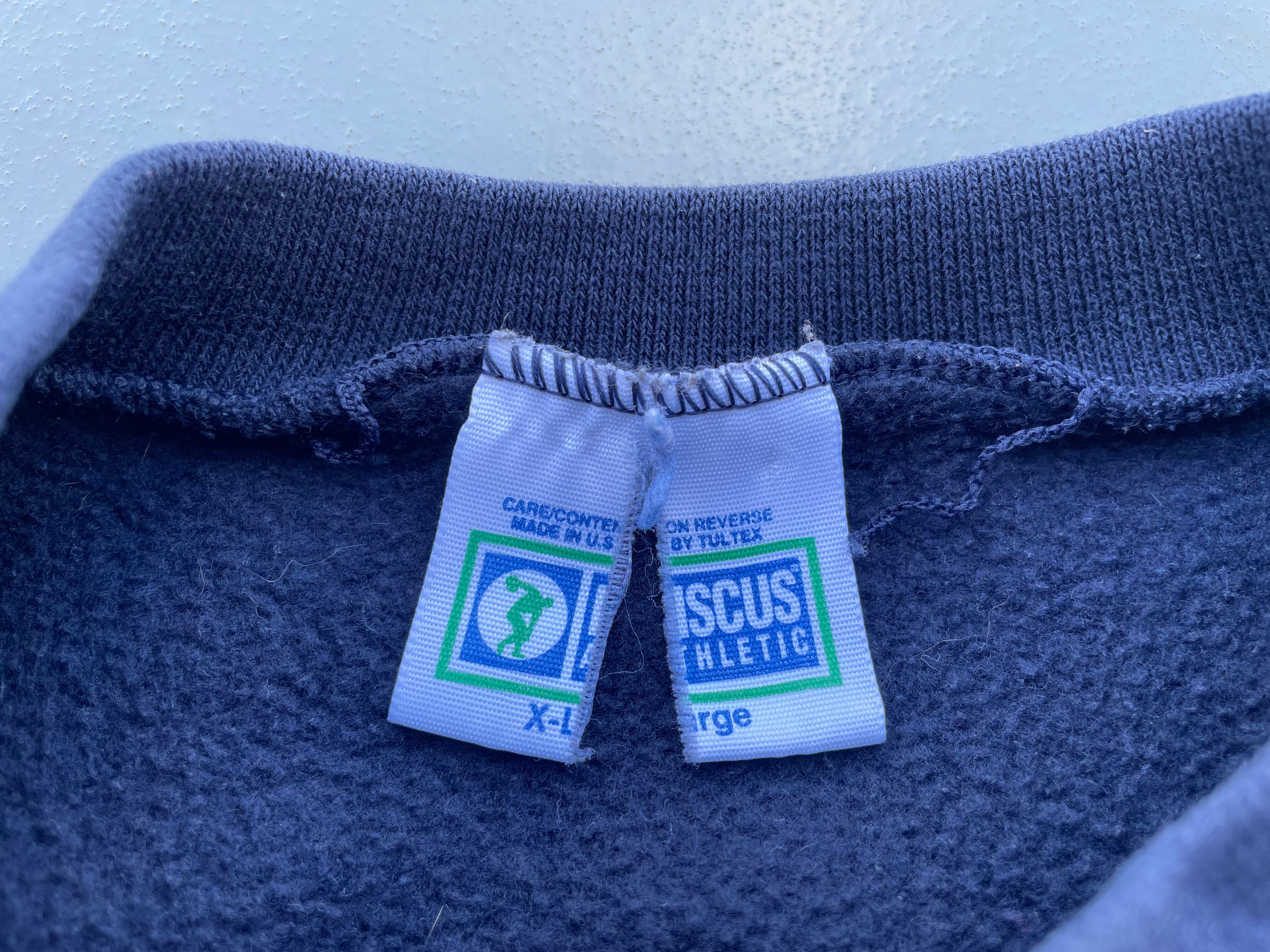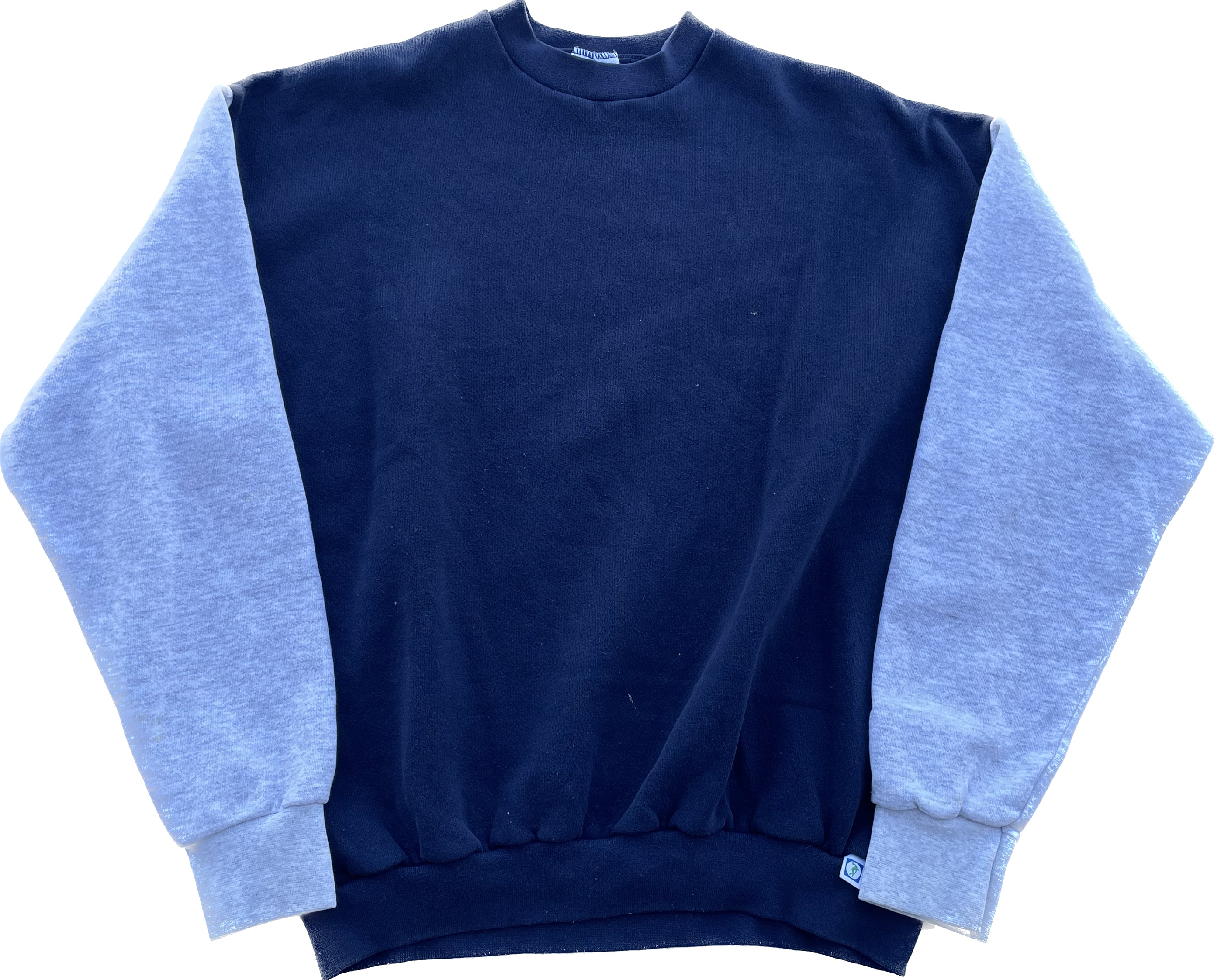 【商品詳細】ディスカス アスレチックのプルオーバースウェットシャツ。サイズはXL。カラーはネイビー×グレー。90年代頃USA製。ディスカスでは珍しい袖切替カラーのスウェット。派手になり過ぎず落ち着いた配色で着用しやすい個体かと。良い塩梅にペンキ飛びもあり雰囲気あります。嬉しい着丈長過ぎない身幅のある個体。