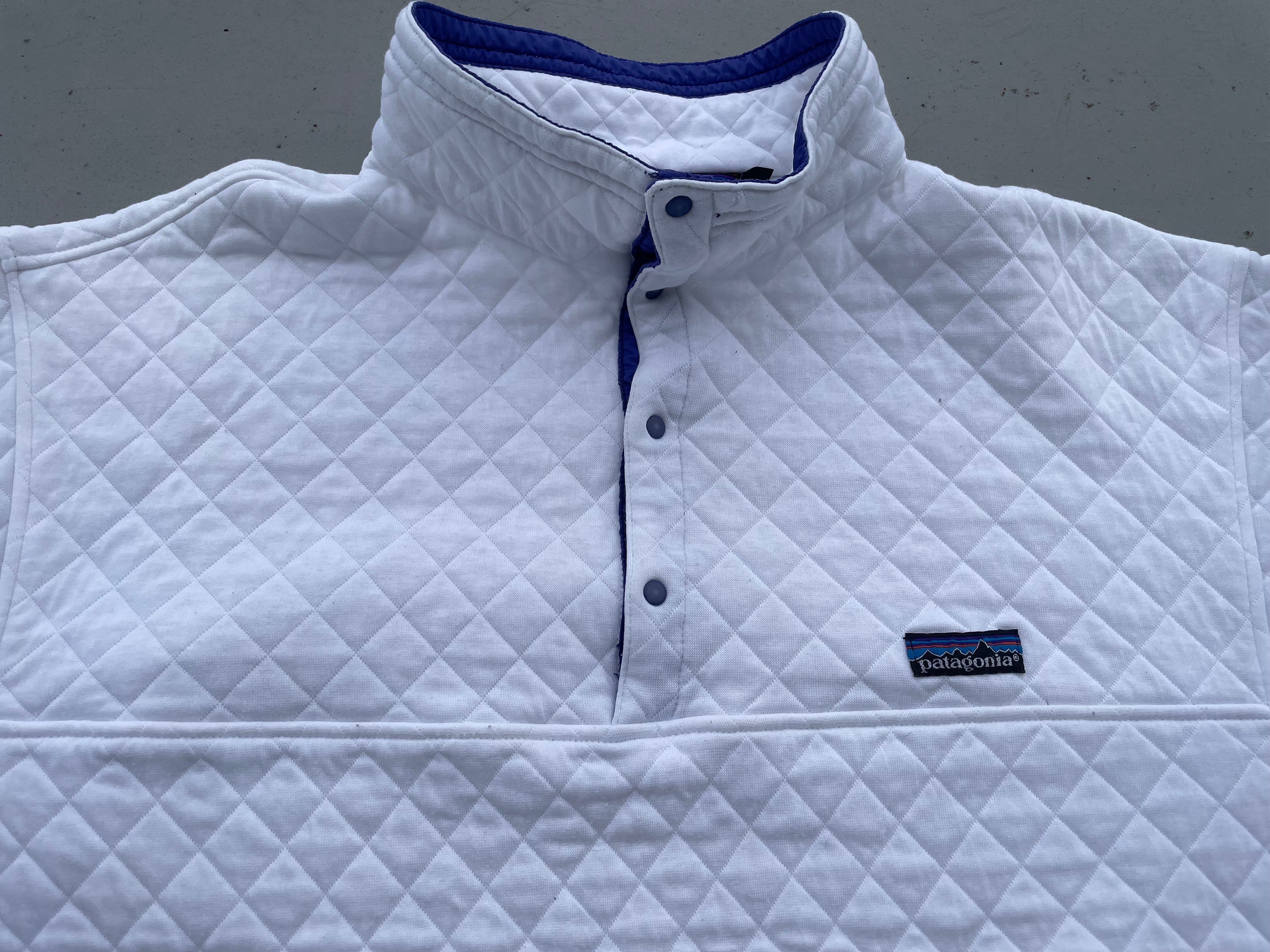 【商品詳細】パタゴニアのダイヤモンドキルトスナップ T。サイズはXL。カラーはホワイト。80年代USA製。出回り少ないモデルに加えて特に人気カラーのホワイトの個体。パイピングのブルーカラーも存在感あります。着丈長過ぎず身幅しっかりある人気のシルエット。コットン地なので気遣わずガシガシ着れます◎