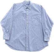 【商品詳細】コムデギャルソン オムのオーバーサイズシャツ。サイズはFREE。カラーはホワイトベースにブルー味のあるストライプが入るデザイン。99年日本製。田中オム期の中でも人気なシャツシリーズからオーバーストライプシャツです。全体的なディーテールが大きく取られており、ドレープ感のあるギャルソンシルエット。洒落たブルーストライプに加えて随所に入るグリーンのステッチが良いアクセントになってます。比較的着丈は長過ぎないのでスタイル問わず合わせやすい万能な一着。