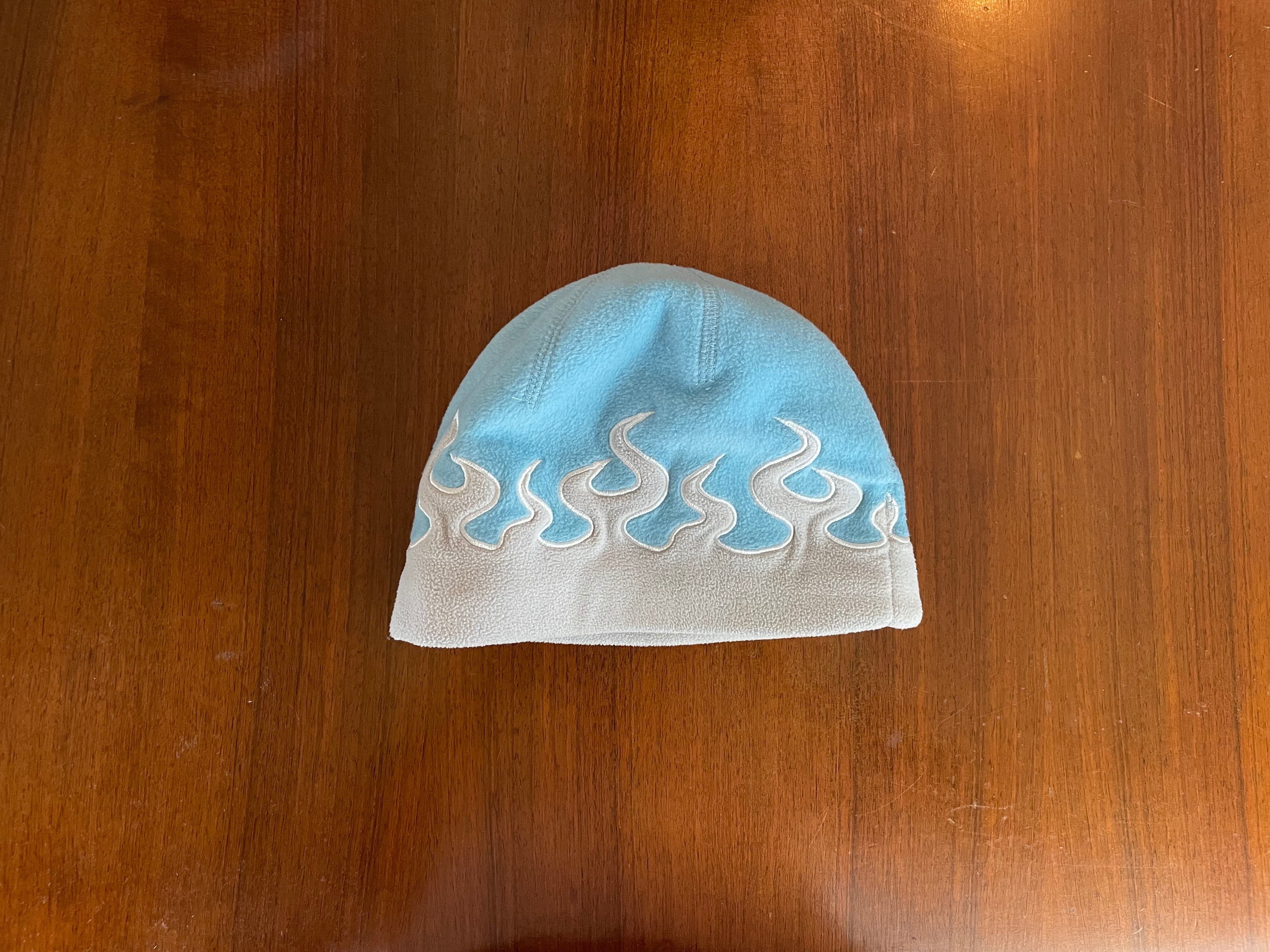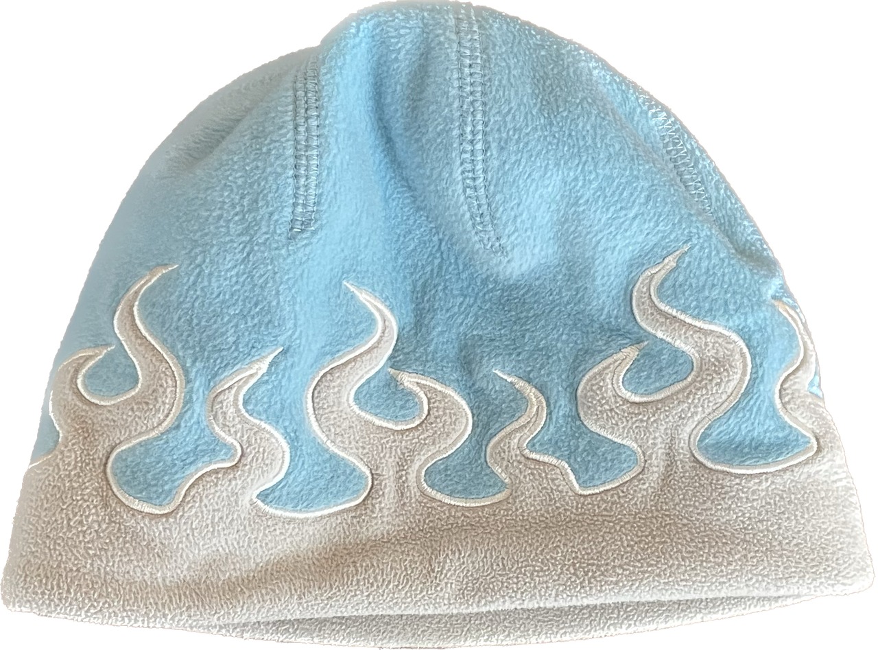 【商品詳細】エルエルビーンのフレイムフリースビーニー。サイズはKids M。カラーはライトブルー×アイボリーのツートーン。00-10年代頃中国製。エルエルビーンでは珍しいフレイムパターンデザインのビーニー。キッズモデルですが女性はもちろん、頭の小さい男性でも充分被れるサイズ感。