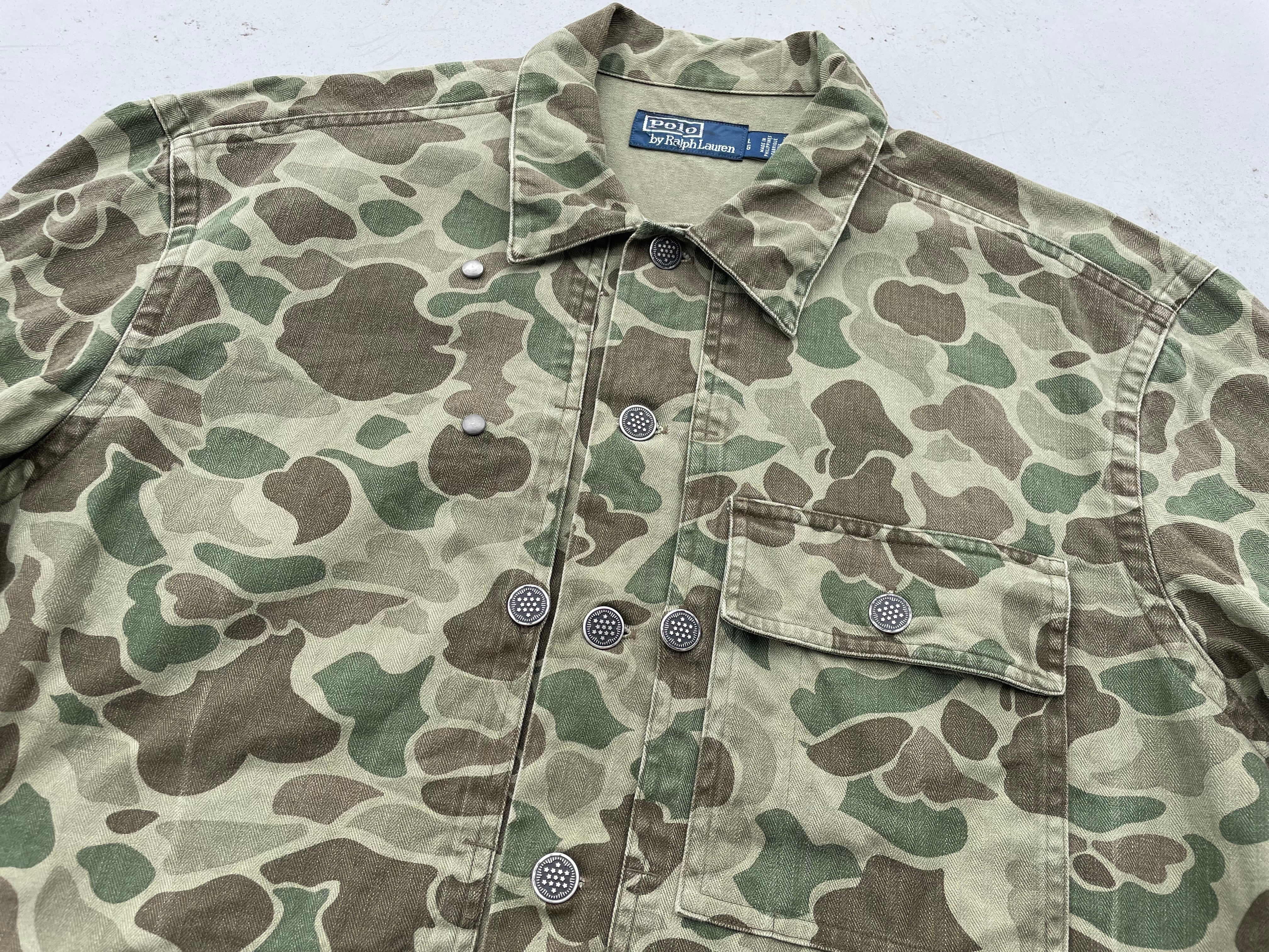 【商品詳細】ラルフローレンのヘリンボーンツイルジャケット。サイズはL。ダックハンターカモデザイン。フィリピン製。P-44をサンプリングしながらダックハンターカモ模様を施したラルフローレンらしいデザインの一着。13スター付きの本格仕様。小さいサイズの出回りが多い印象ですがこちらは大きめサイズでお探しの方も多いと思います。