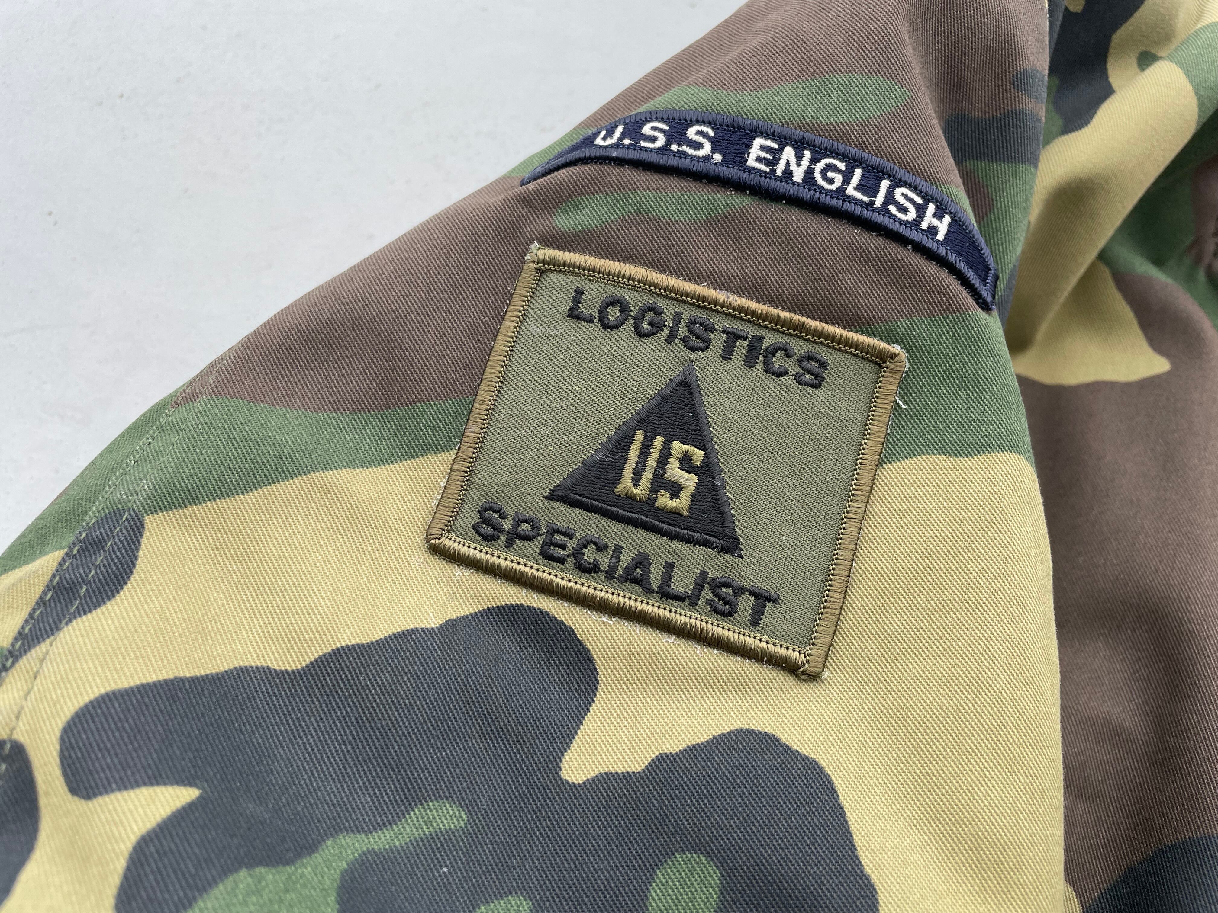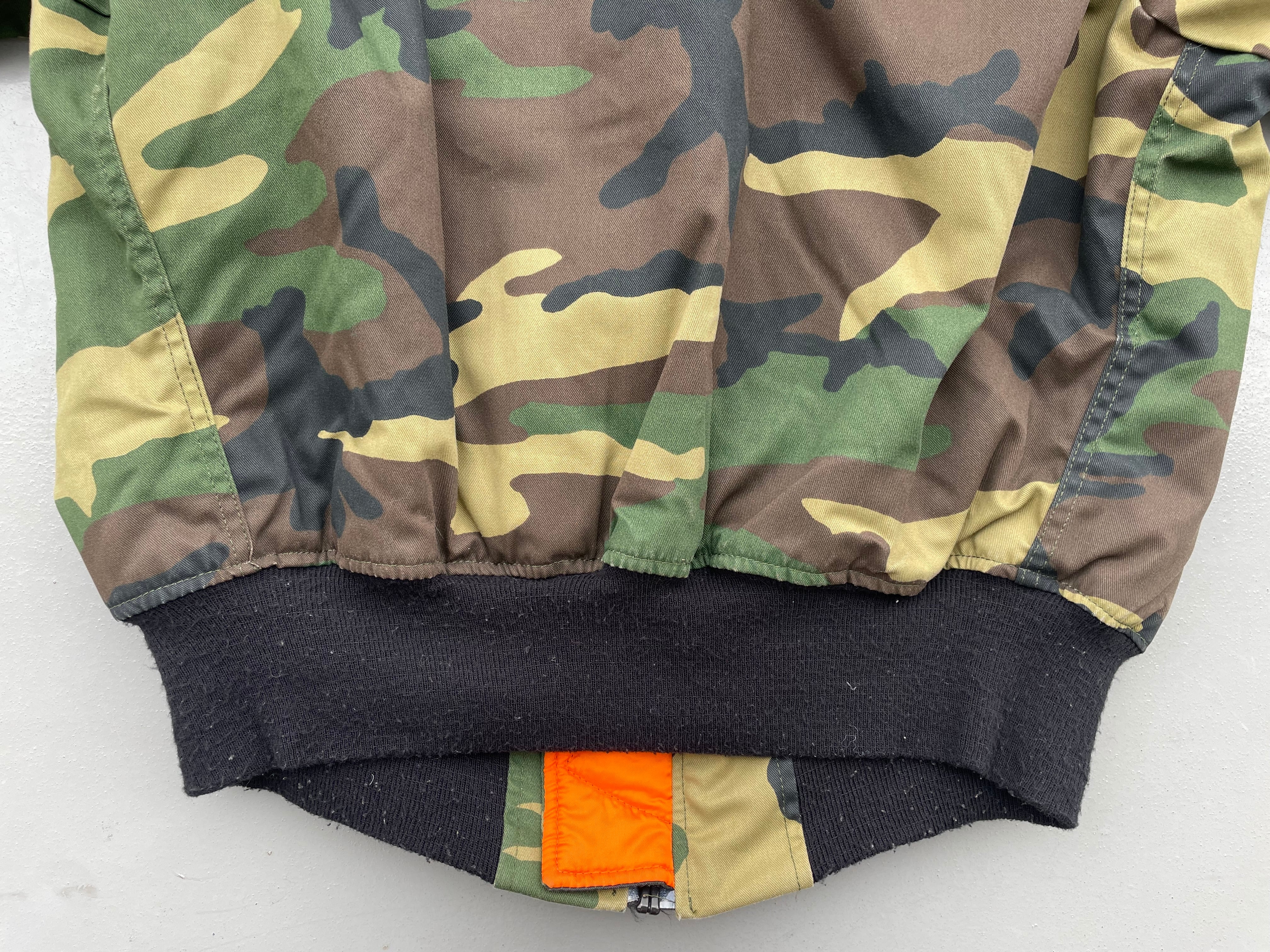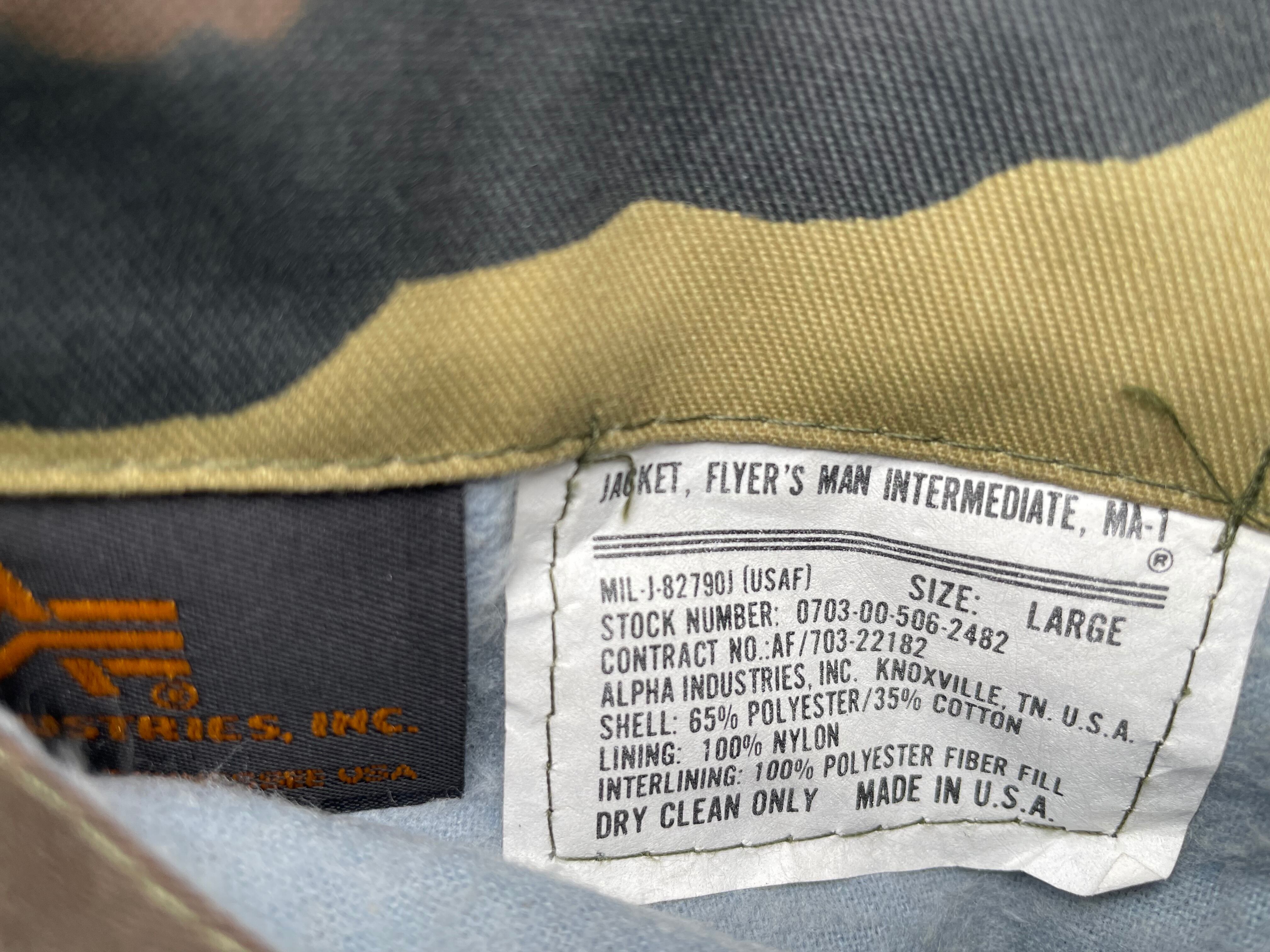 【商品詳細】アルファのMA-1。サイズはL。ウッドランドカモフラージュデザイン。00年USA製。ここ最近人気の上がってるウッドランドカモフラパターンのアルファMA-1。こちらはポリエステル×コットン混紡の個体。ワッペンも雰囲気に合ってます。嬉しい大きめサイズ。