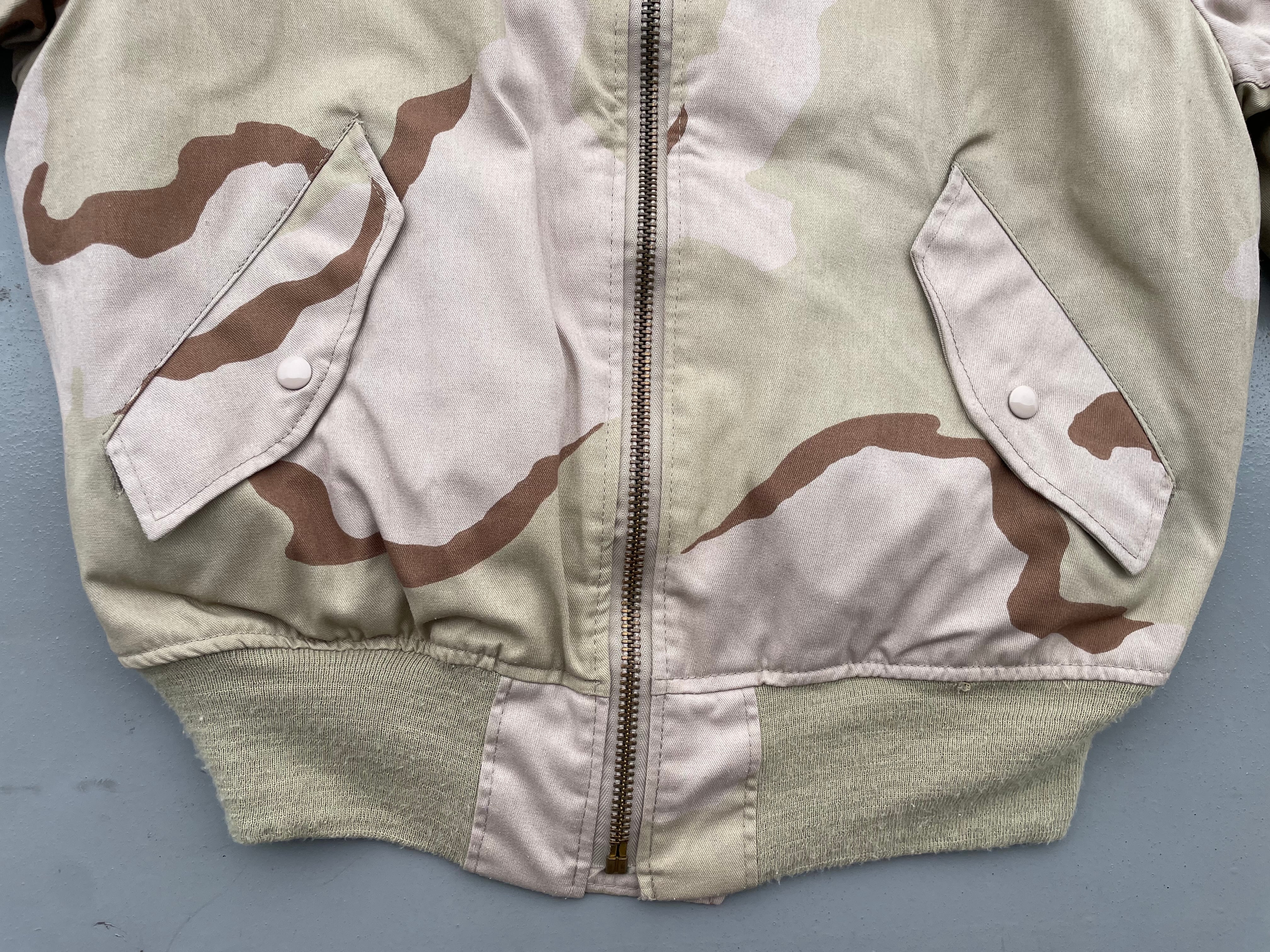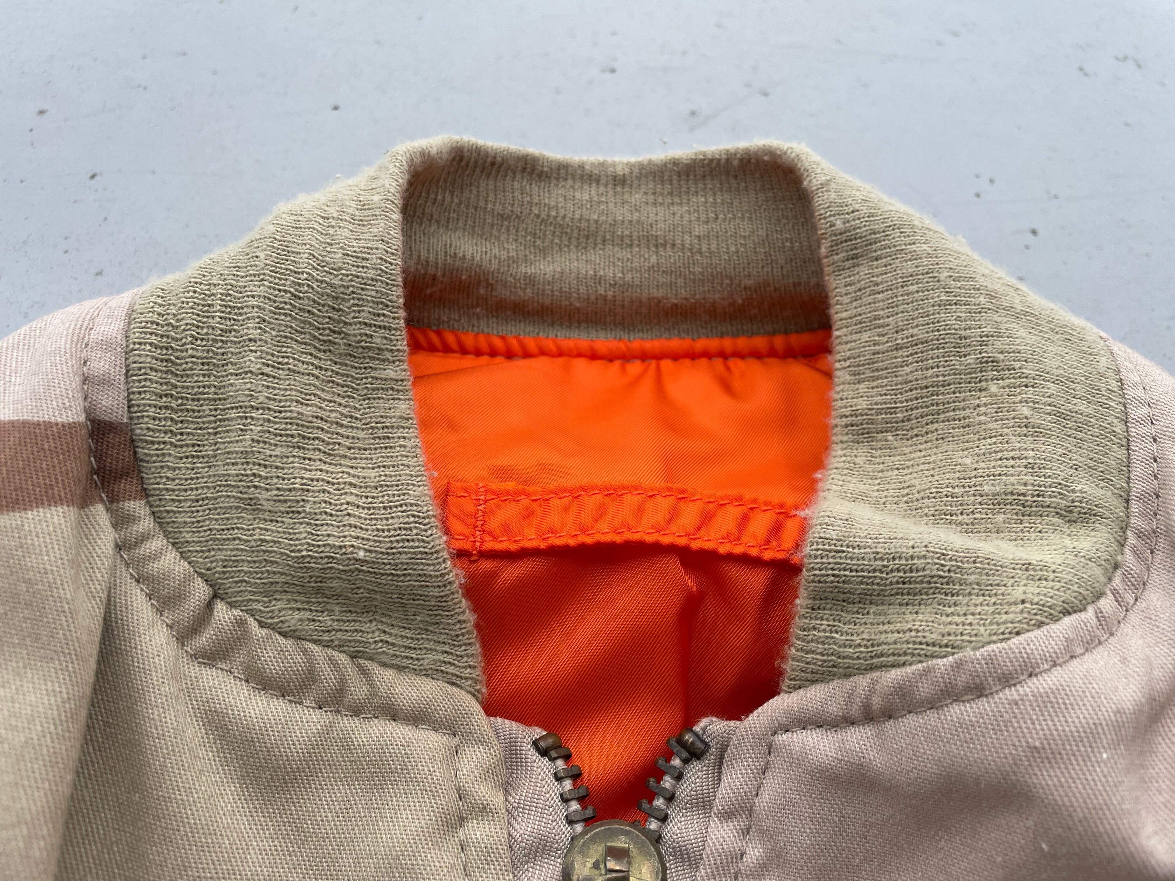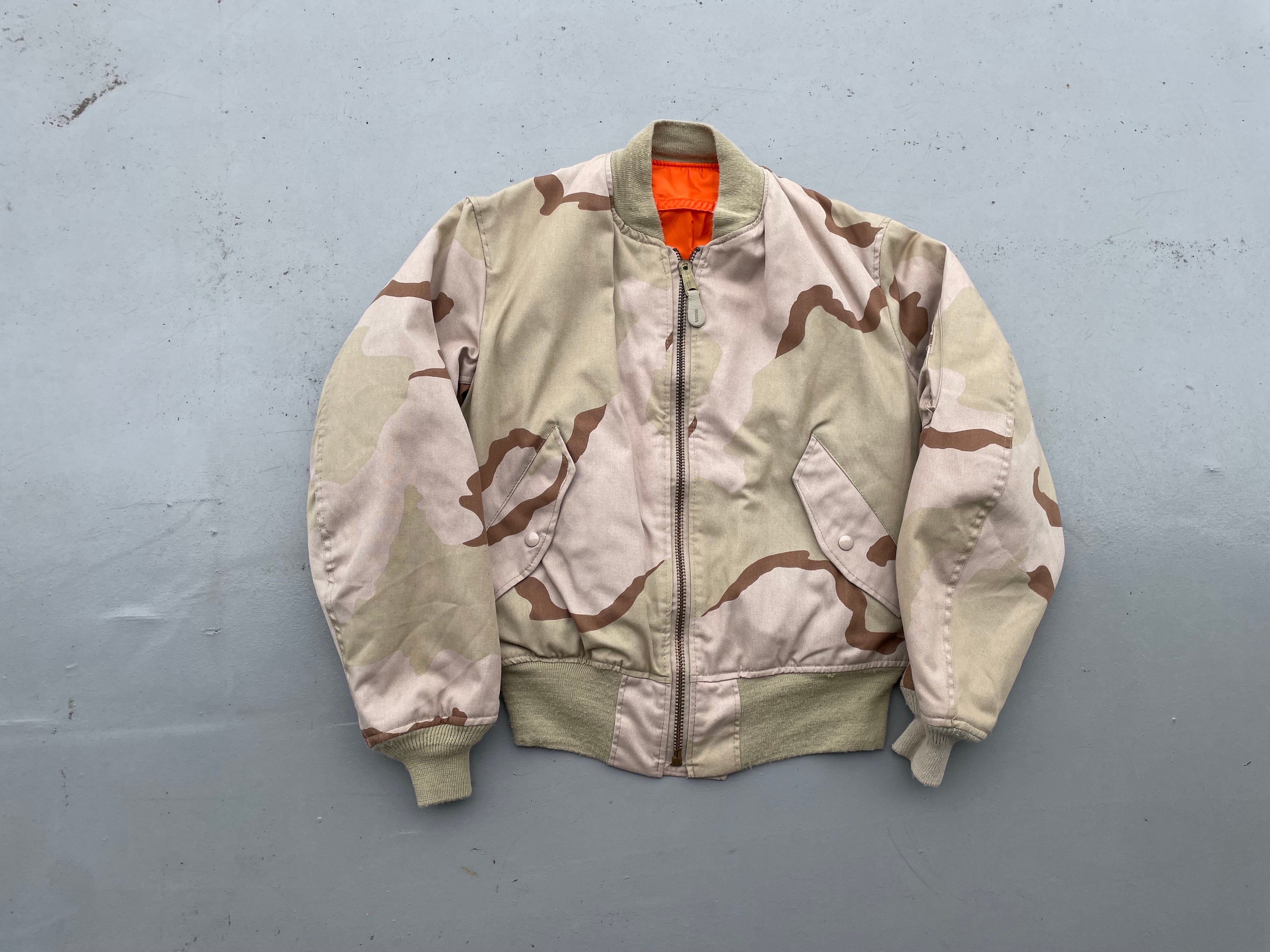 【商品詳細】アルファのMA-1。サイズはM。デザートカモフラージュデザイン。00年USA製。ここ最近人気の上がってるカモフラパターンのアルファMA-1。こちらはまだあまり知られてないデザートカモ仕様の個体。人気の柔らかいポリコットン混紡。嬉しい実寸大きめサイズ。