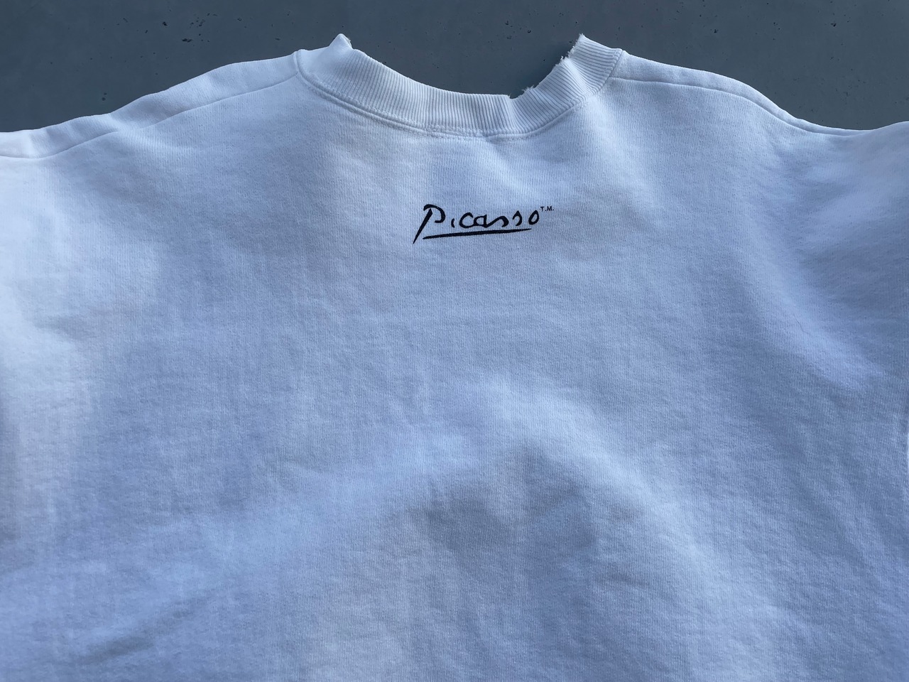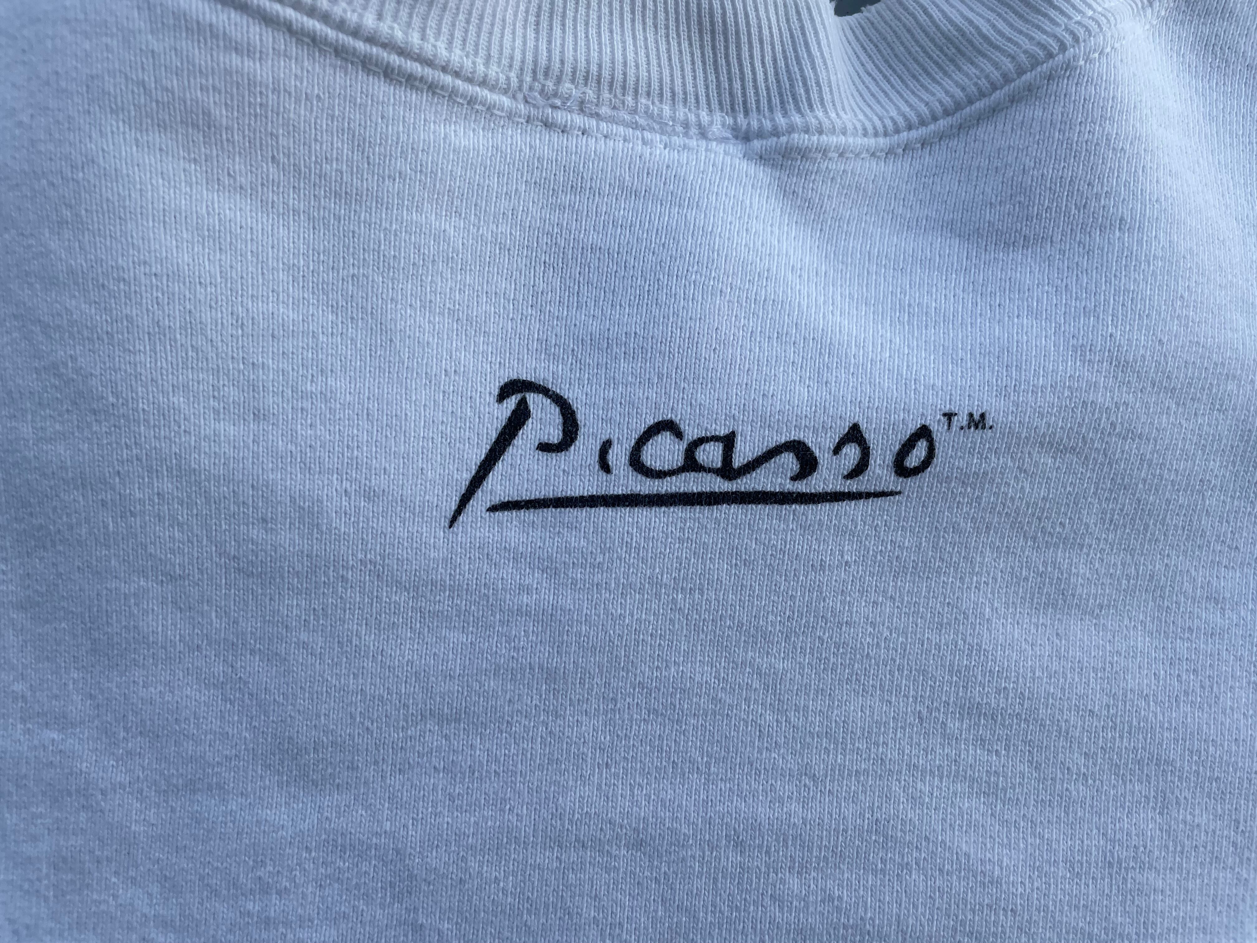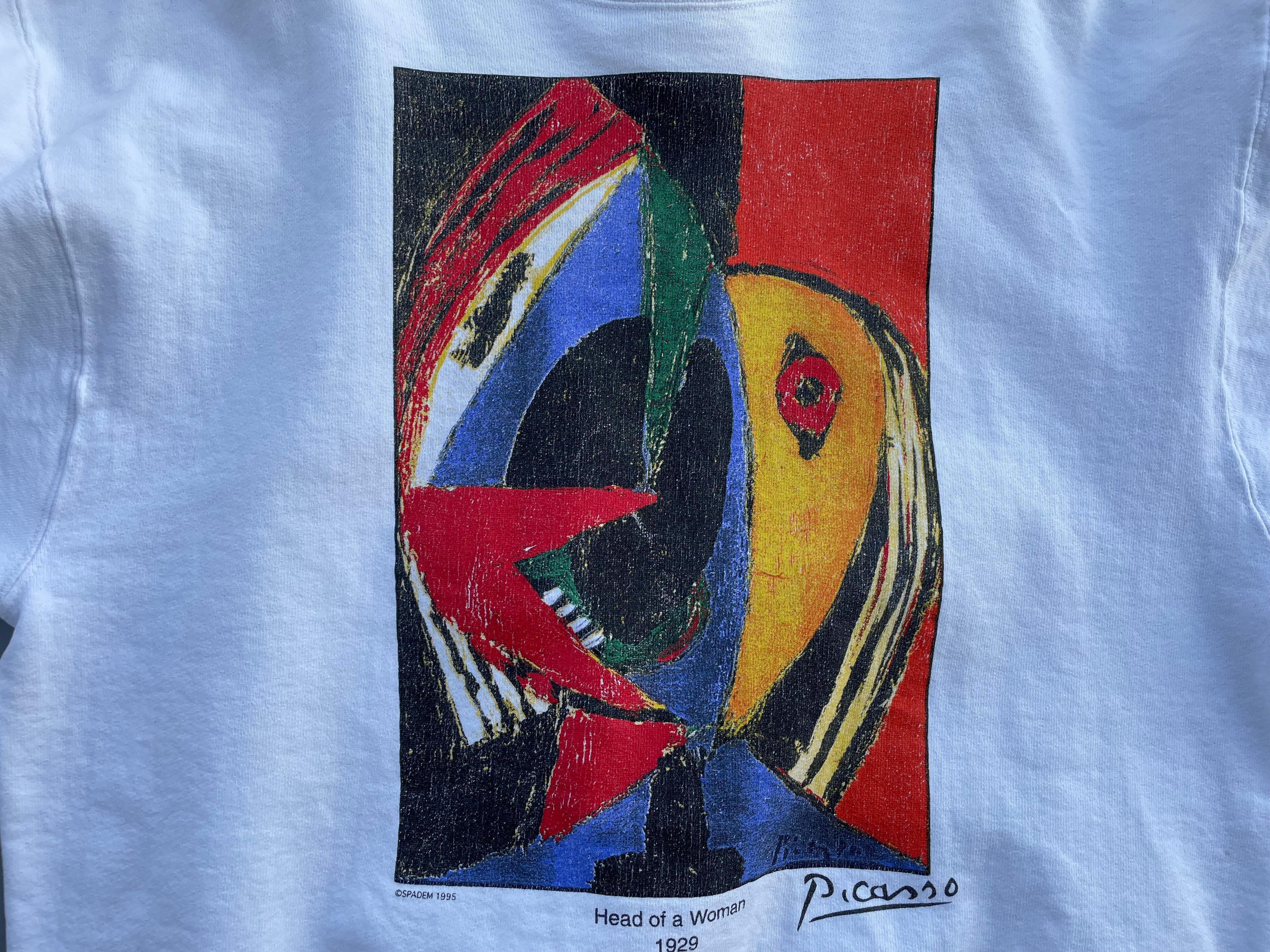 【商品詳細】パブロ ピカソのスウェットシャツ。サイズはL。カラーはホワイト。95年USA製。1929年にピカソが作成した作品”Head of a Woman”がフロントに入ったアートな1着。ガシッとした厚みのある生地でへビーにご着用いただけそうです。この辺のアート物は評価分かれますがピカソ物は今後も人気は上がっていきそうですね。
