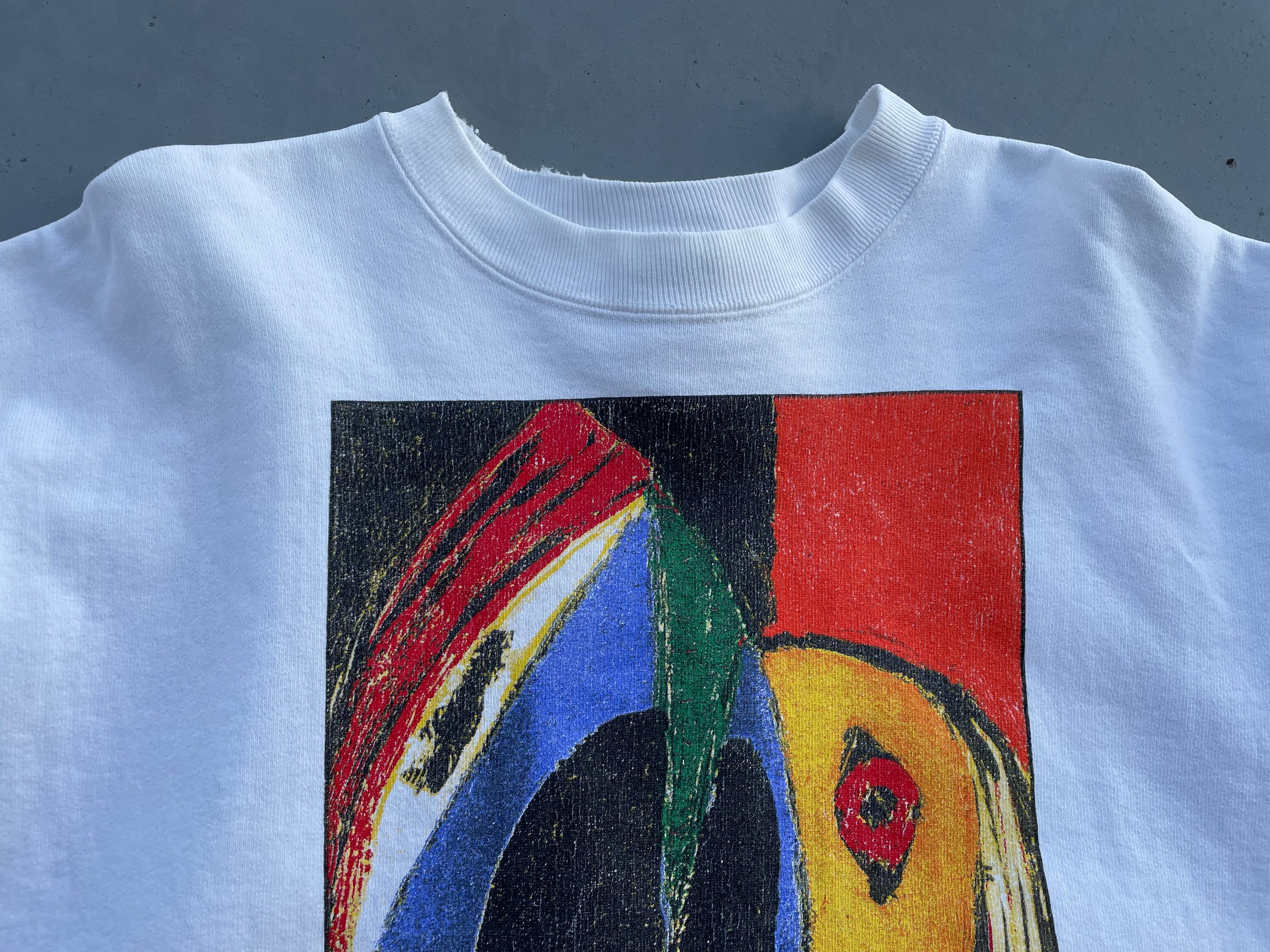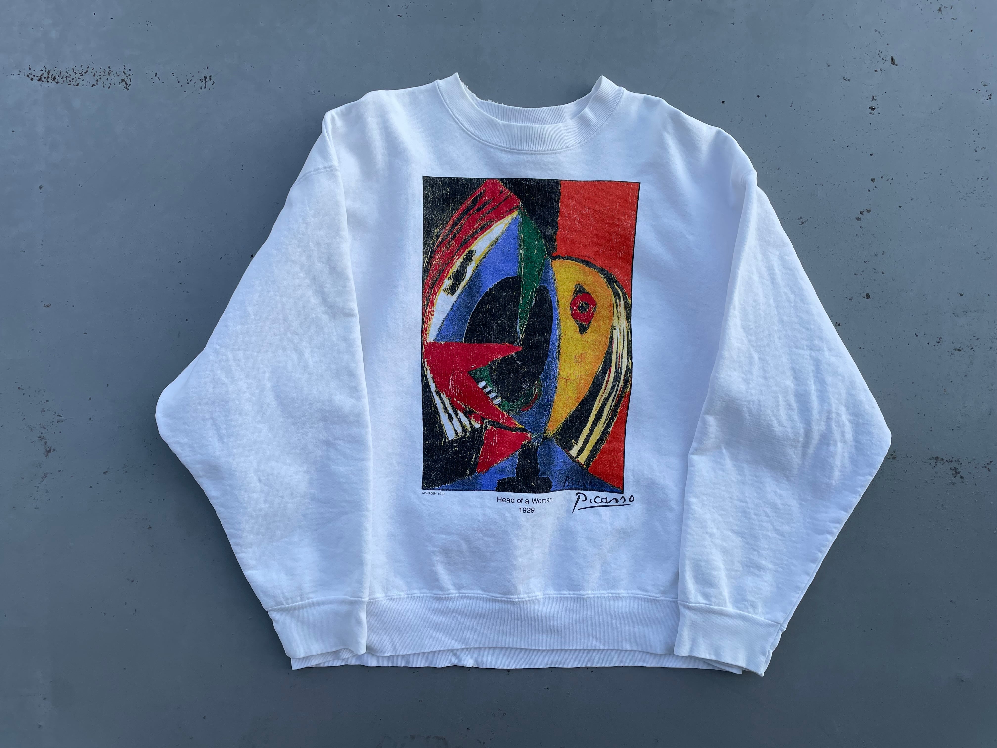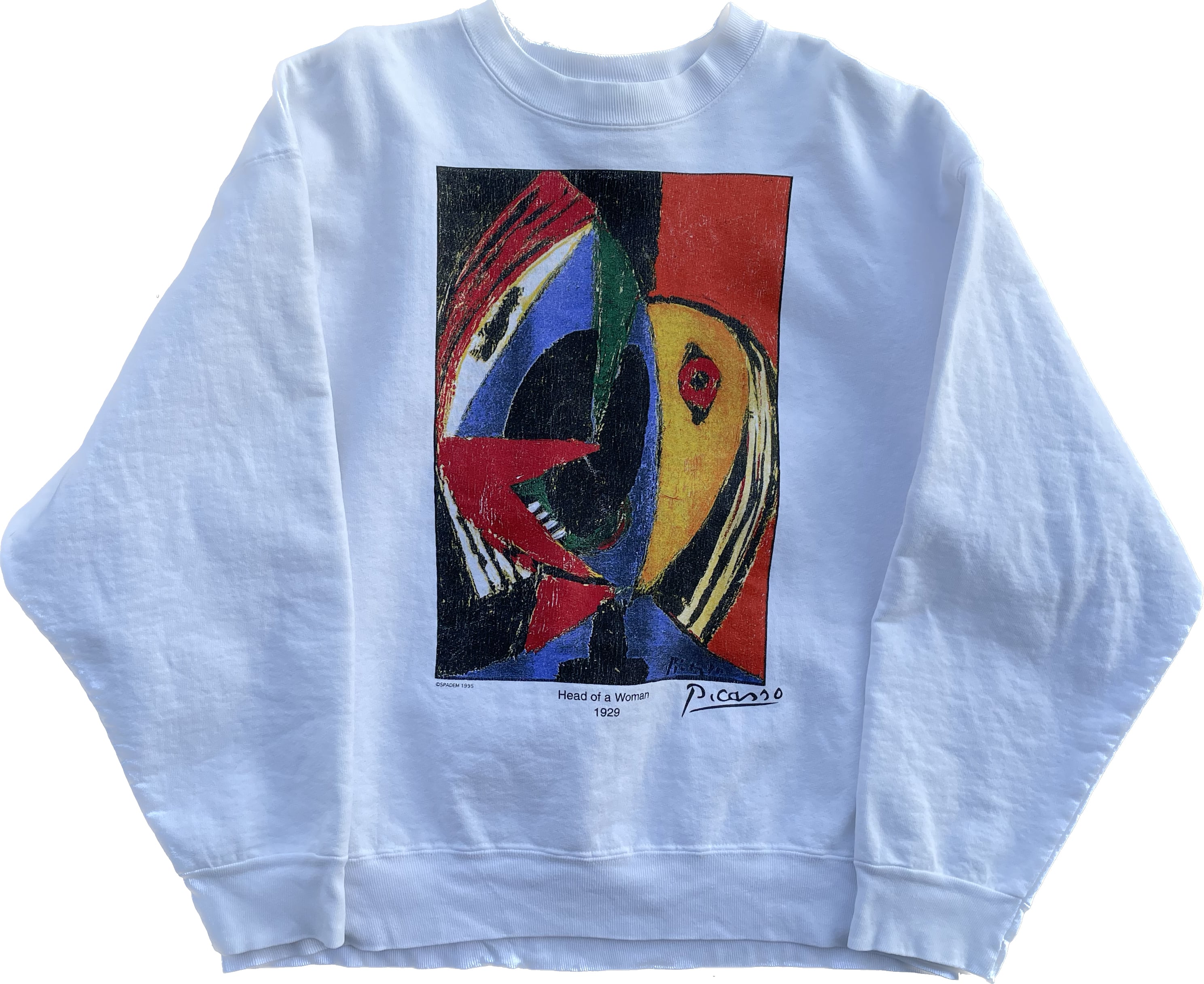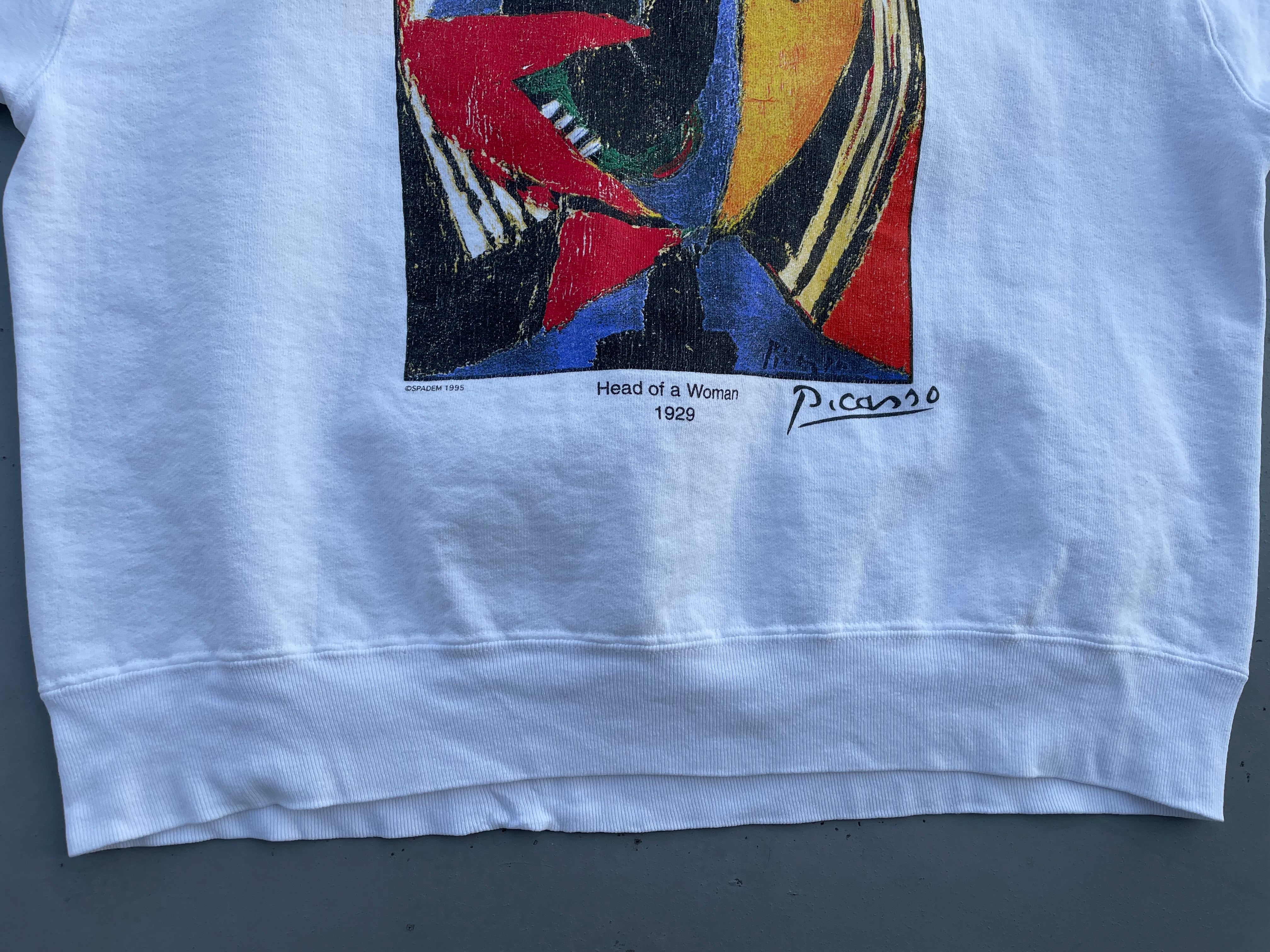 【商品詳細】パブロ ピカソのスウェットシャツ。サイズはL。カラーはホワイト。95年USA製。1929年にピカソが作成した作品”Head of a Woman”がフロントに入ったアートな1着。ガシッとした厚みのある生地でへビーにご着用いただけそうです。この辺のアート物は評価分かれますがピカソ物は今後も人気は上がっていきそうですね。