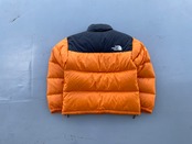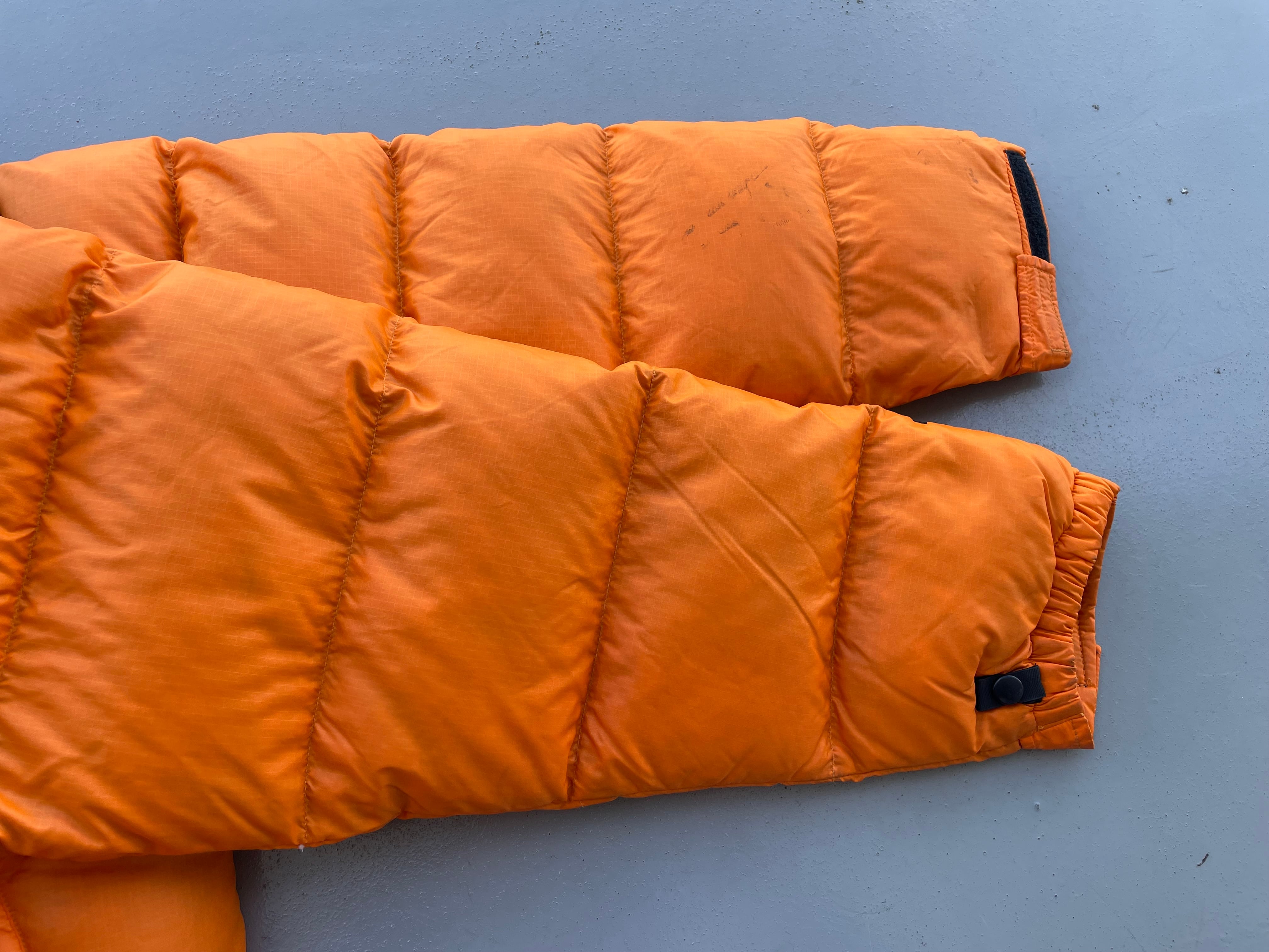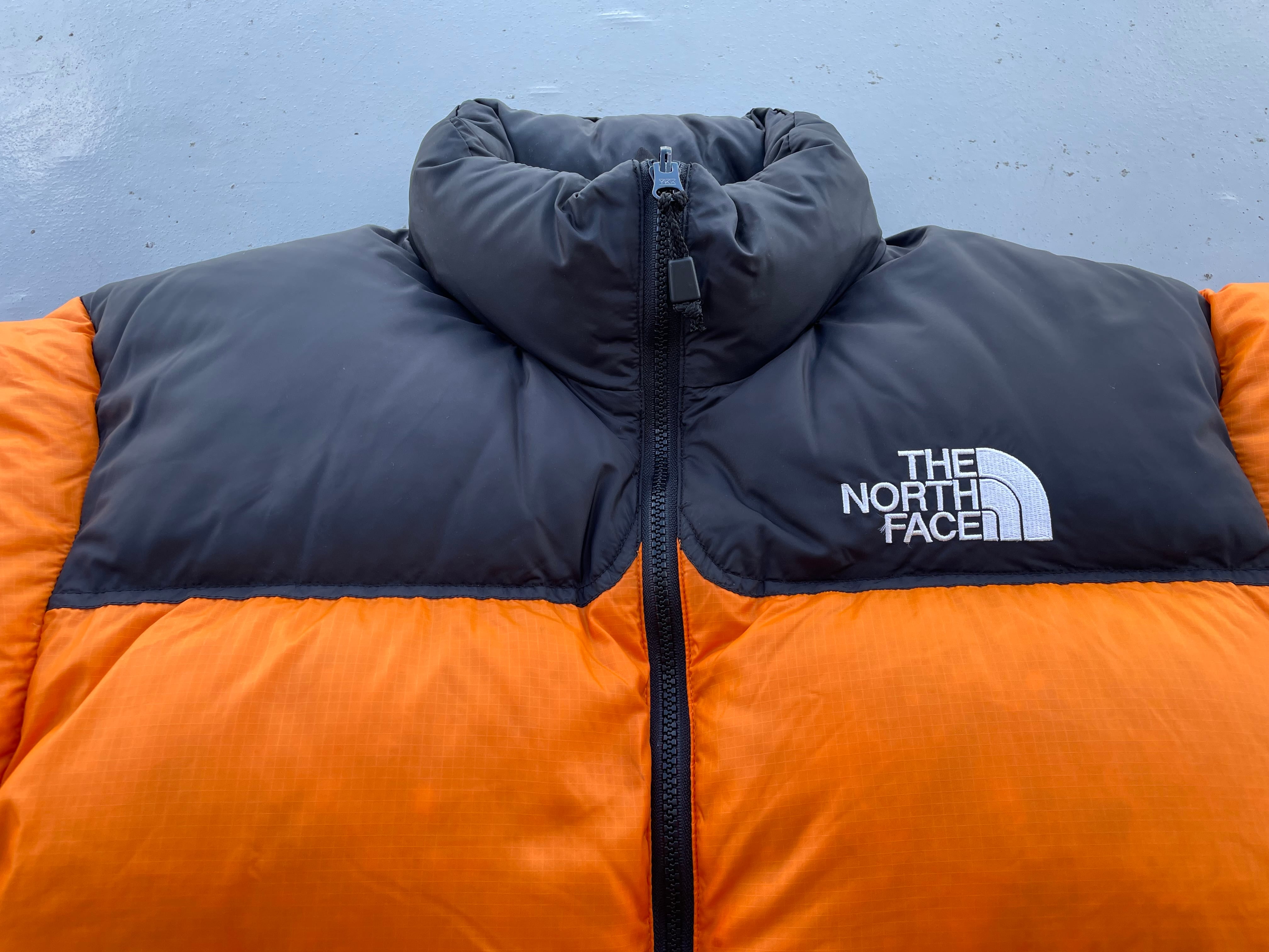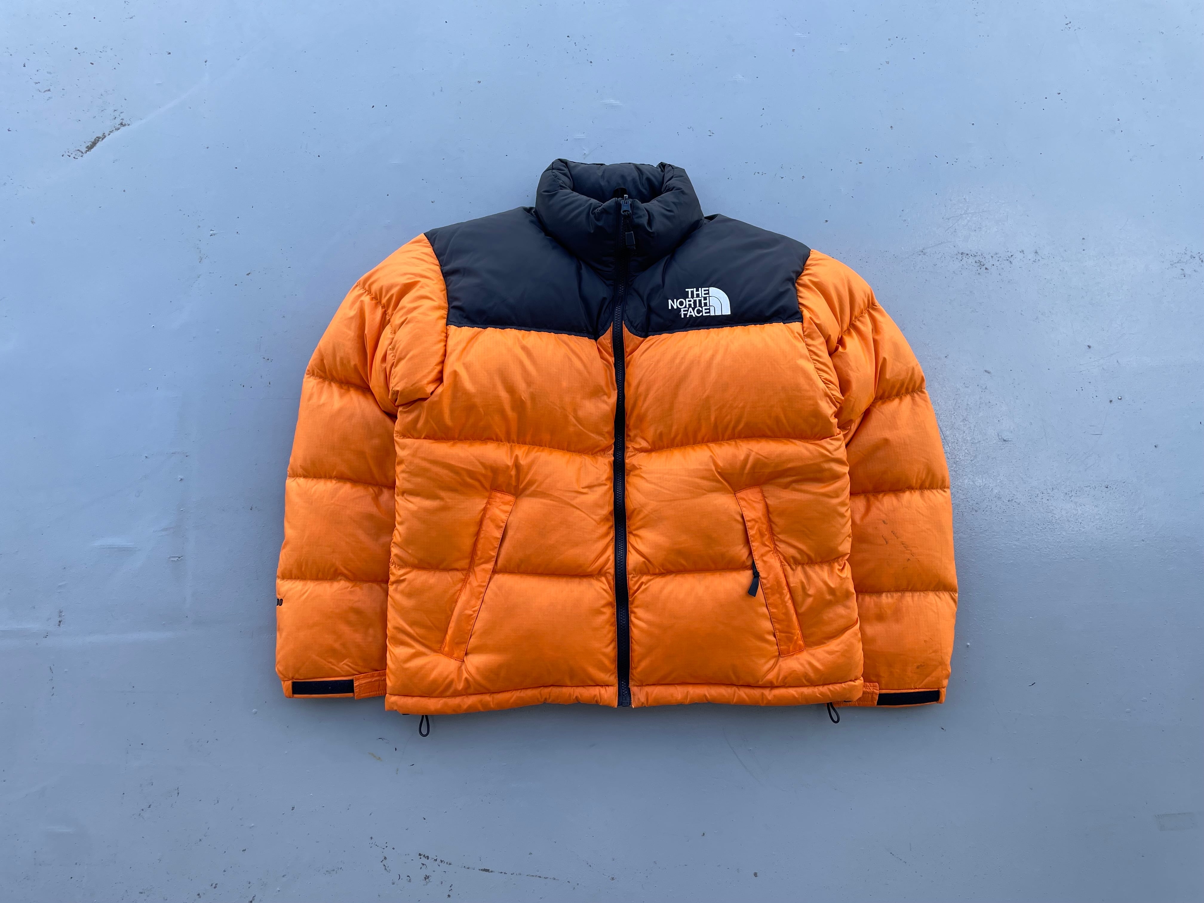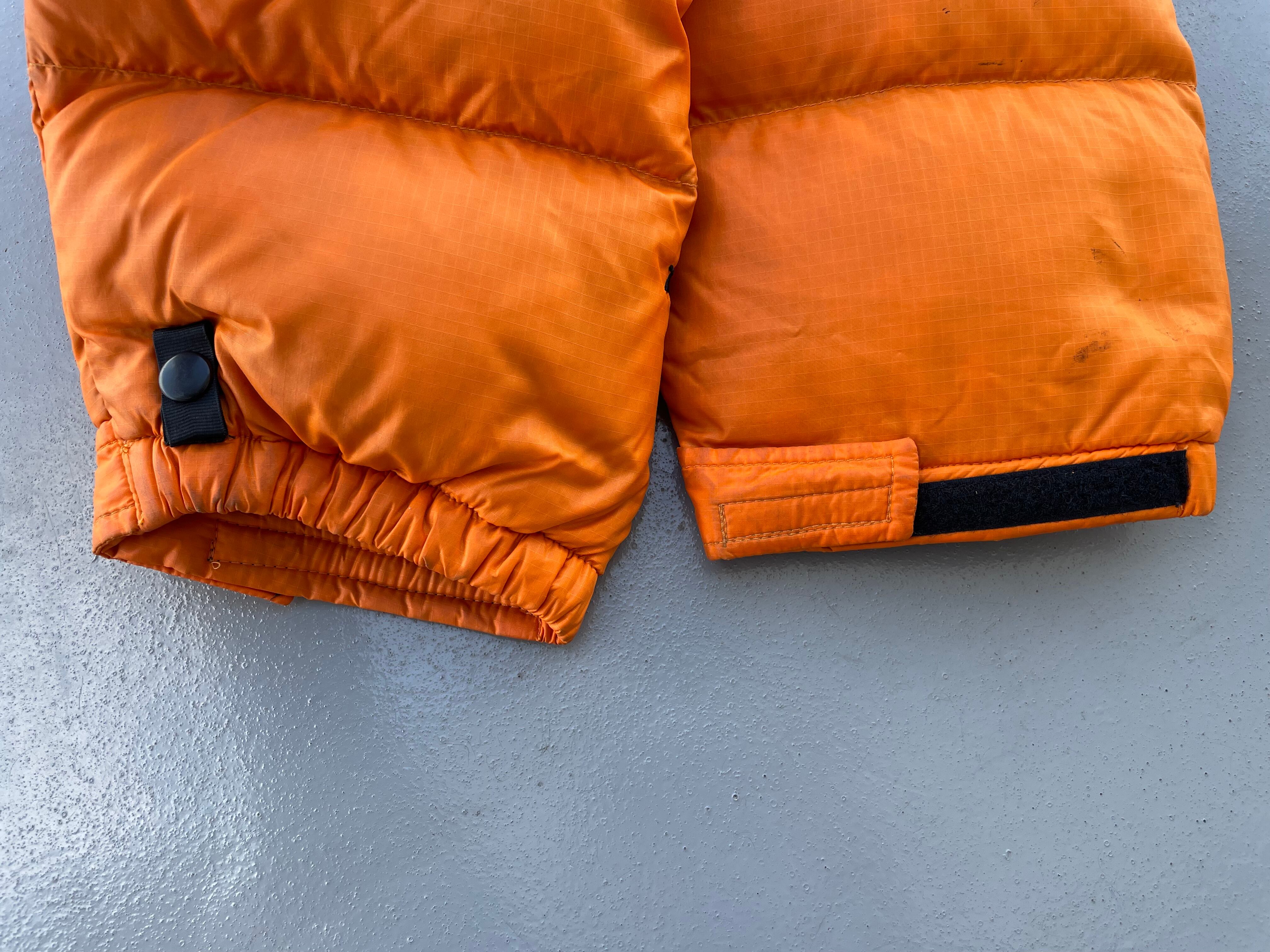 【商品詳細】ノースフェイスのヌプシジャケット。サイズはM。カラーはオレンジ×ブラック。90年代バングラディシュ製。700フィルパワーのダウンを使用しており保温性が高く且つ軽い仕上がりでデイリーに使用しやすい一着。ヌプシを代表するオレンジカラー◎