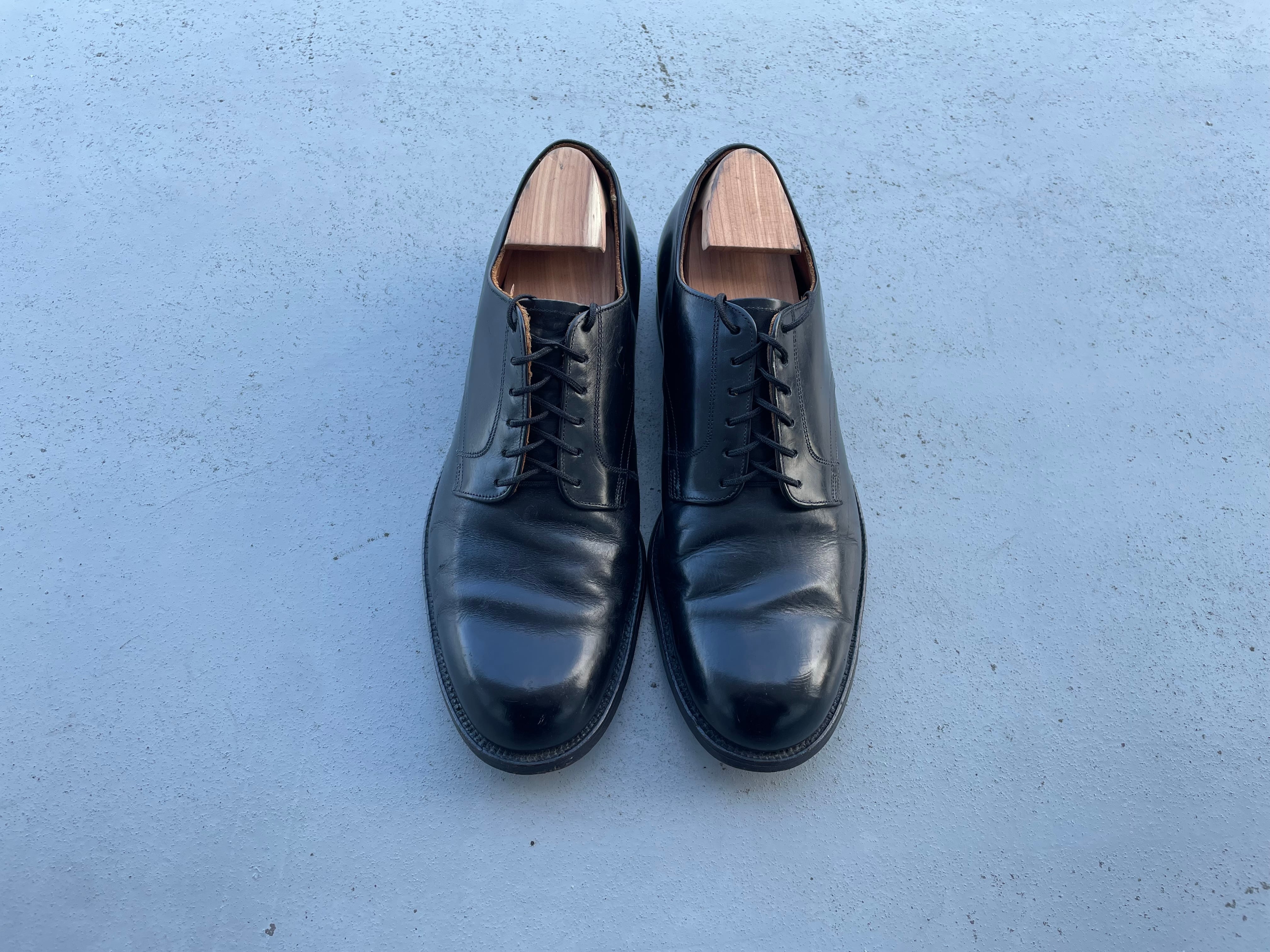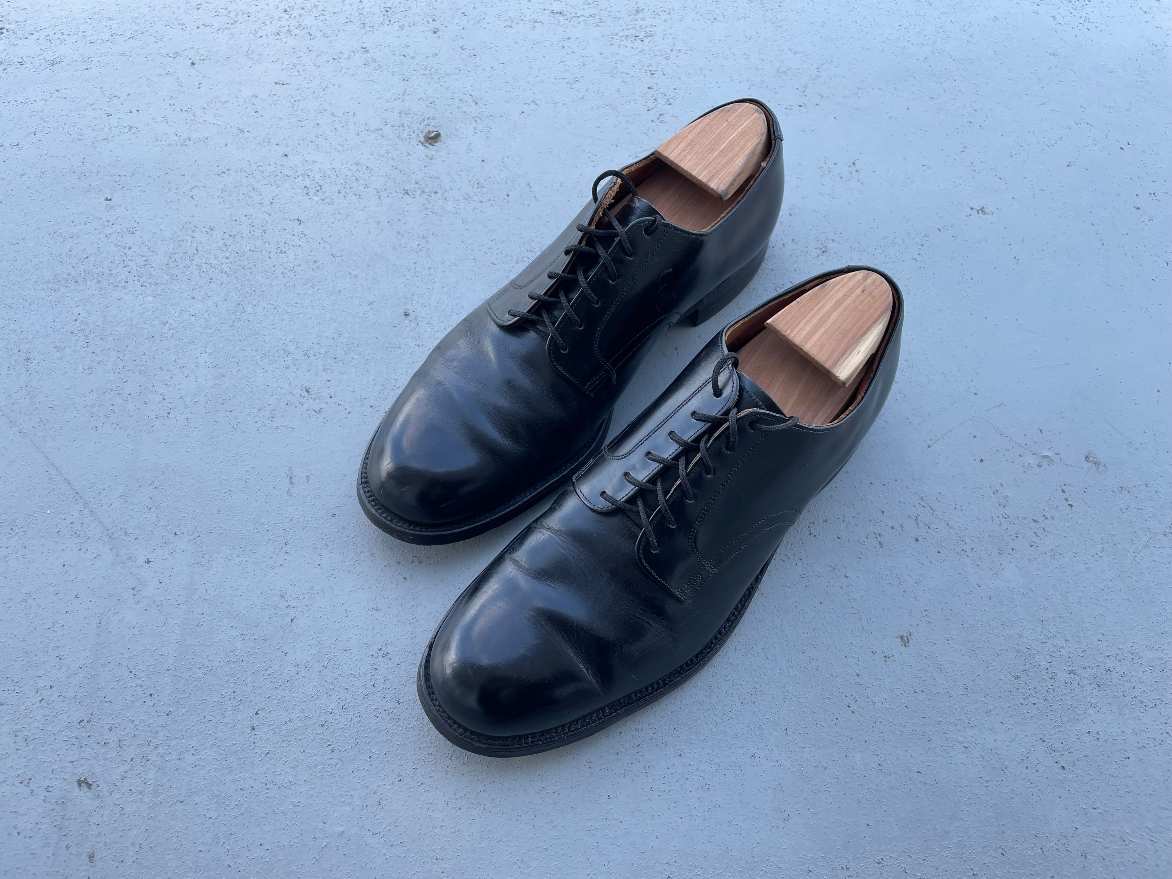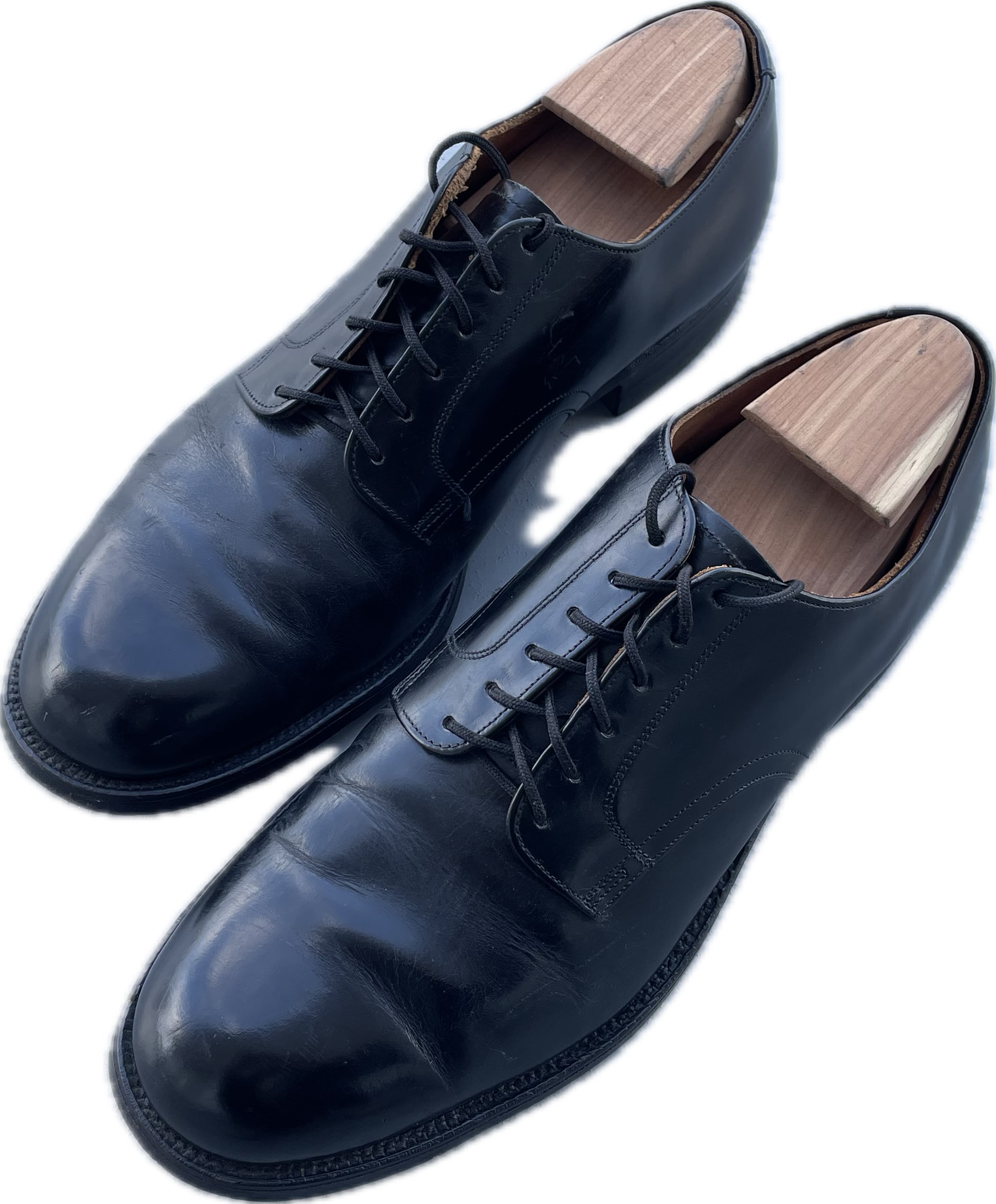 【商品詳細】U.S.NAVYのサービスシューズ。サイズは9R。カラーはブラック。タン裏フェルト。67年International Shoe社製。オールドのガラスレザー仕様◎年代物ですが状態良い方だと思います。
