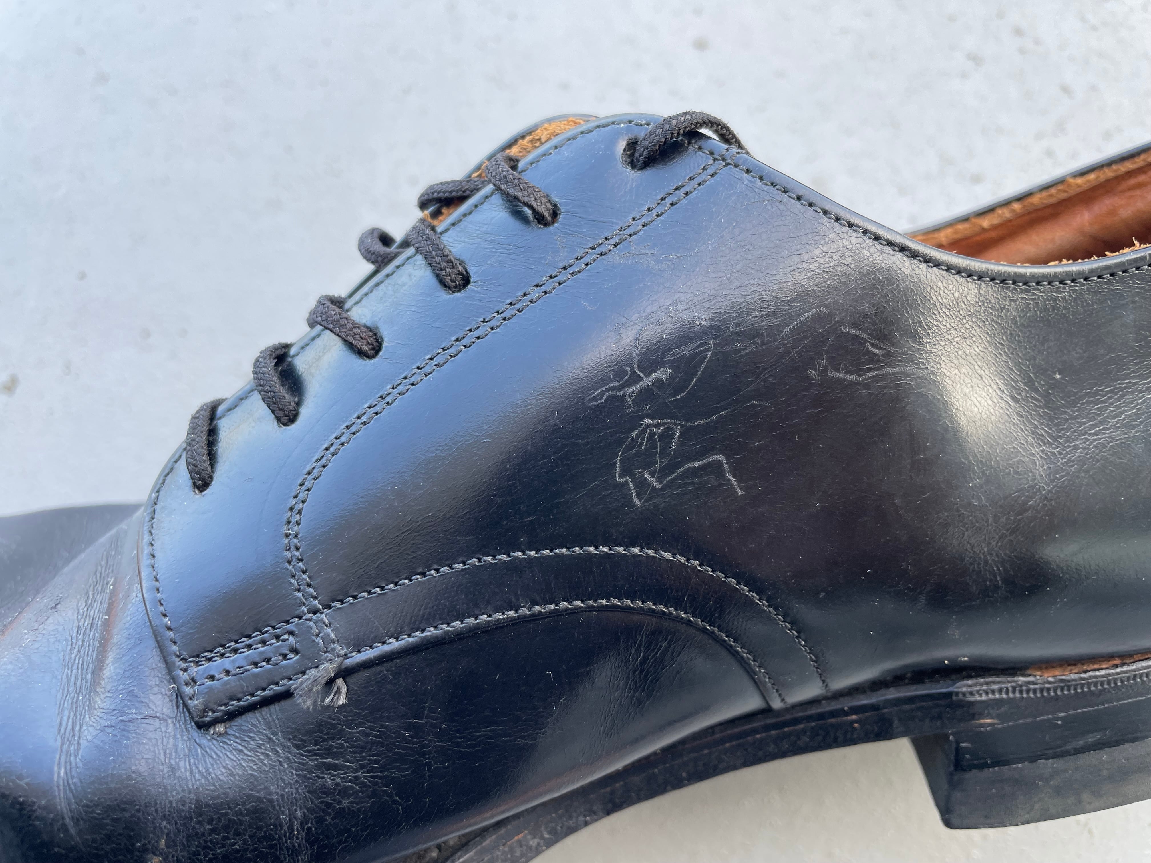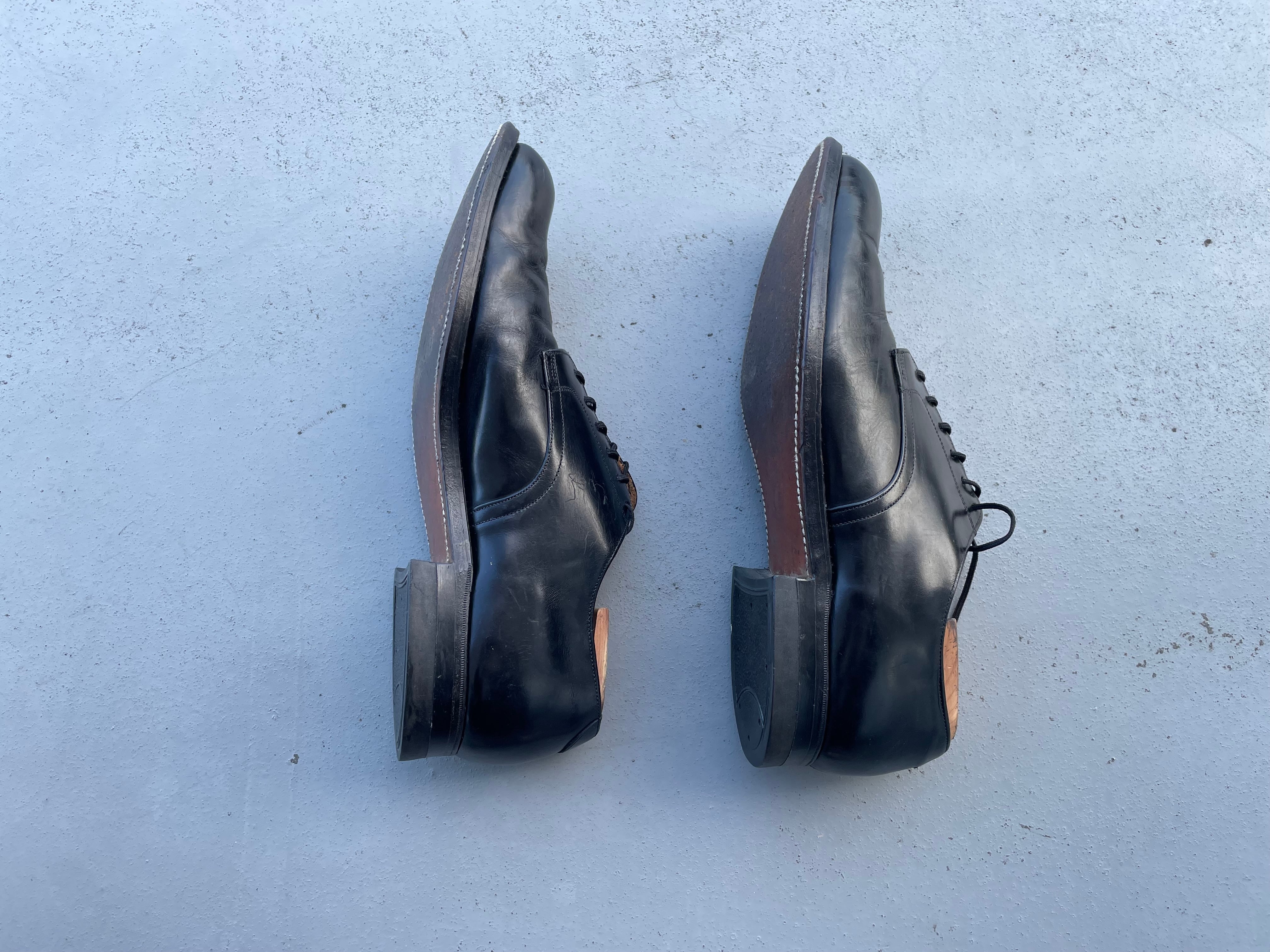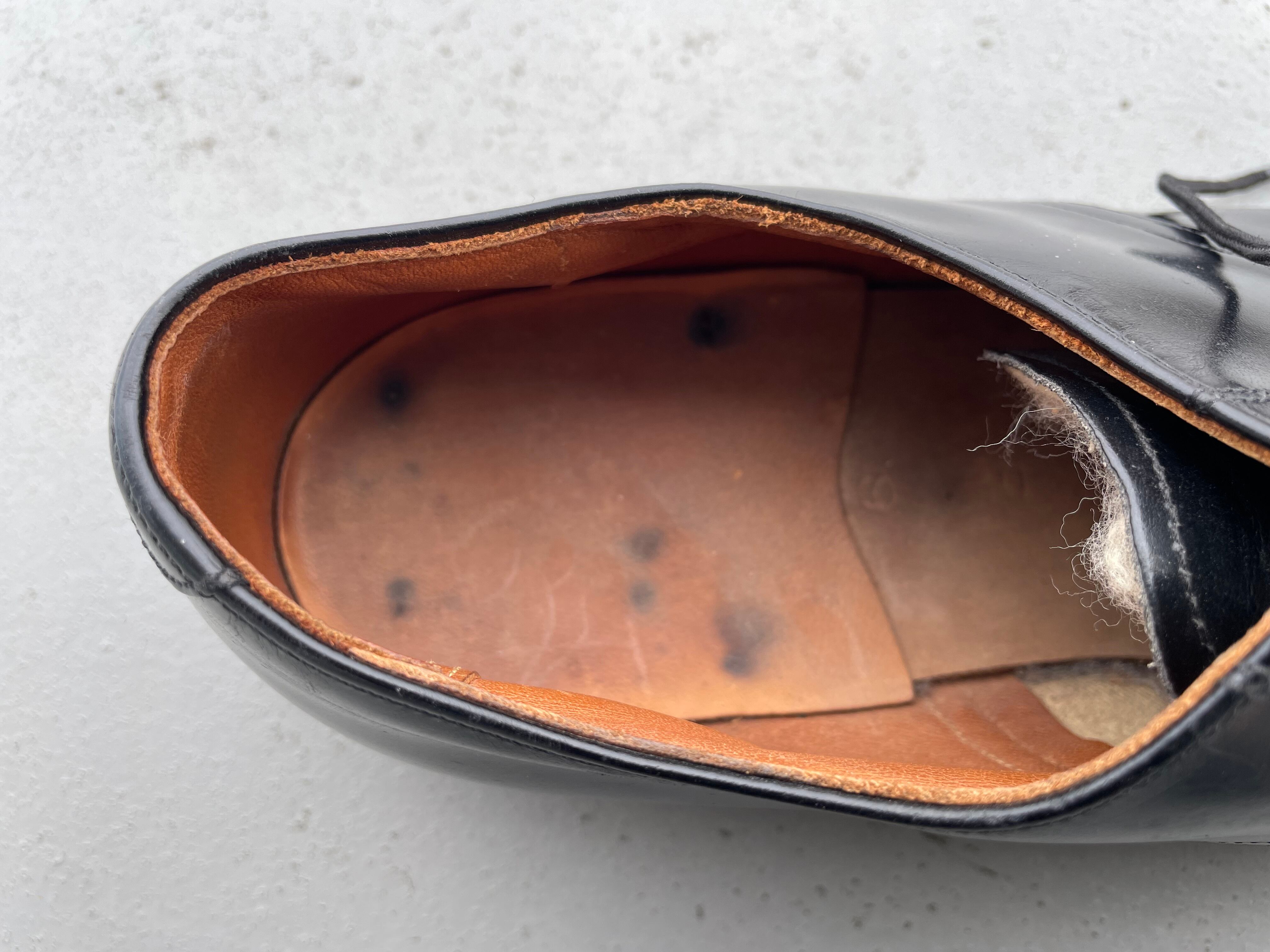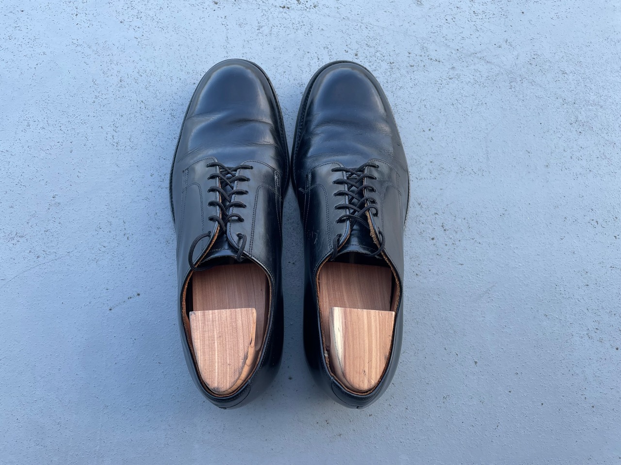 【商品詳細】U.S.NAVYのサービスシューズ。サイズは9R。カラーはブラック。タン裏フェルト。67年International Shoe社製。オールドのガラスレザー仕様◎年代物ですが状態良い方だと思います。