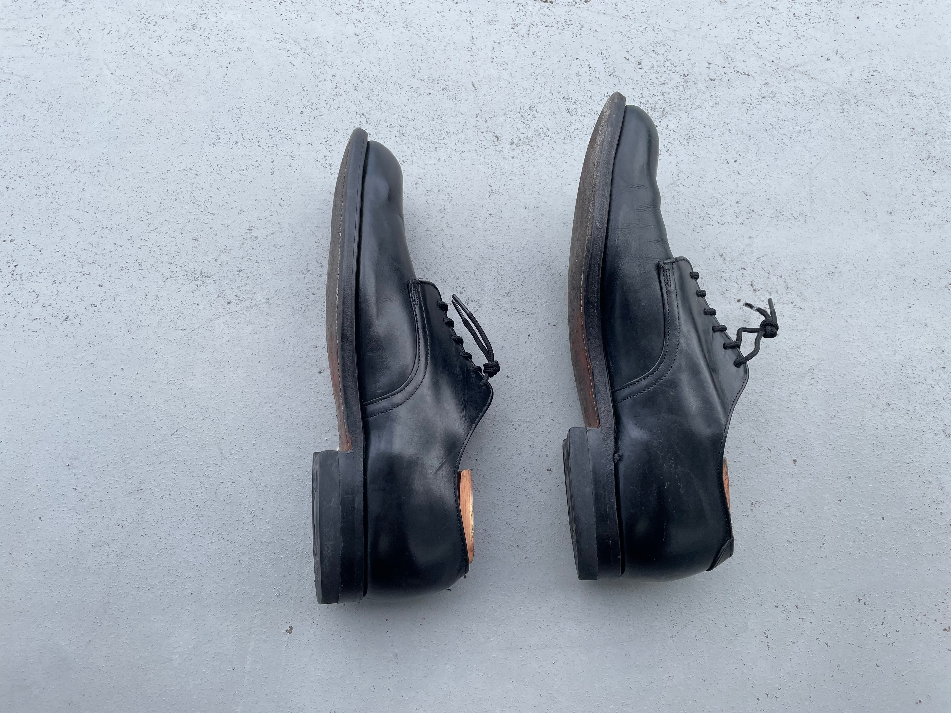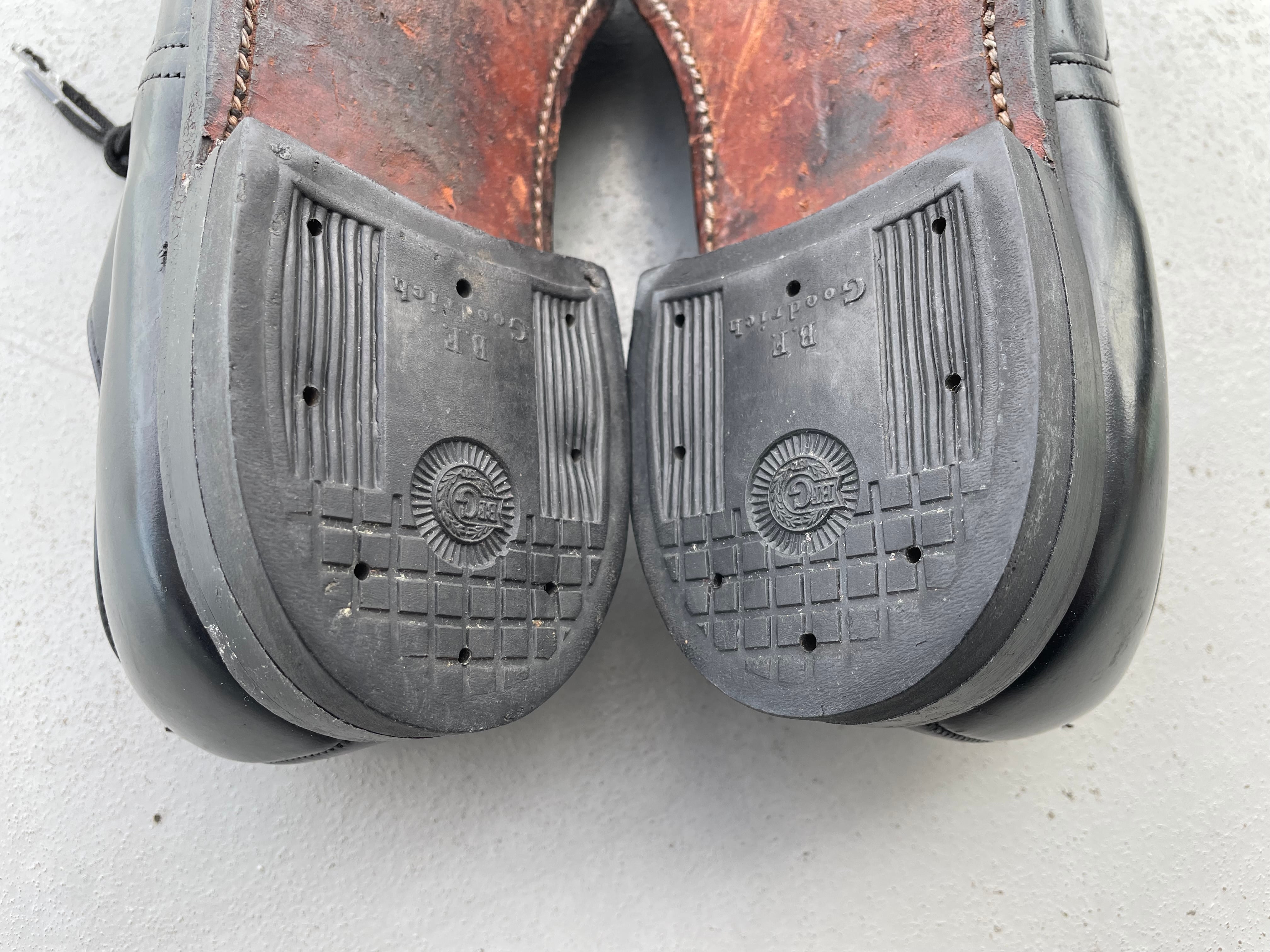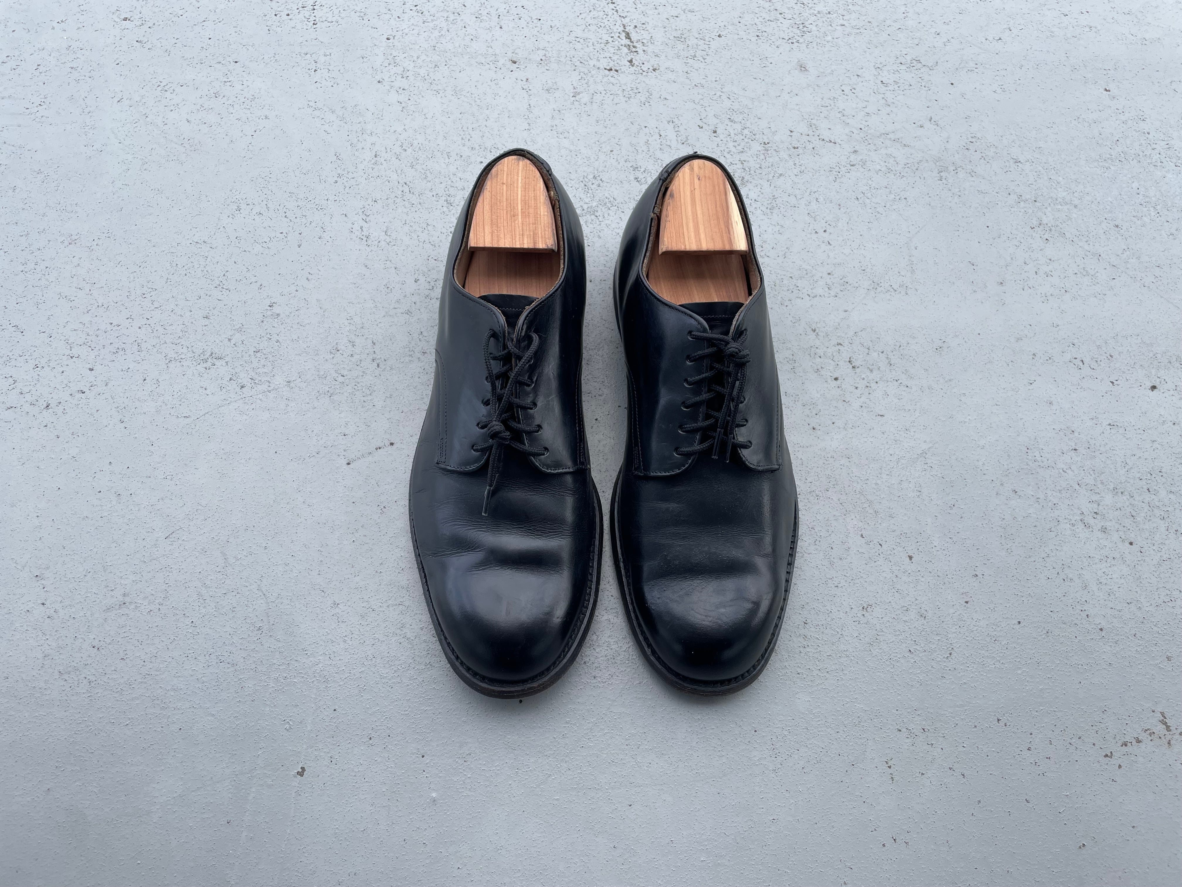 【商品詳細】U.S.NAVYのサービスシューズ。サイズは8 1/2R。カラーはブラック。70年製。ソールはB.F. Goodrich。たん裏フェルト。オールドのガラスレザー仕様◎