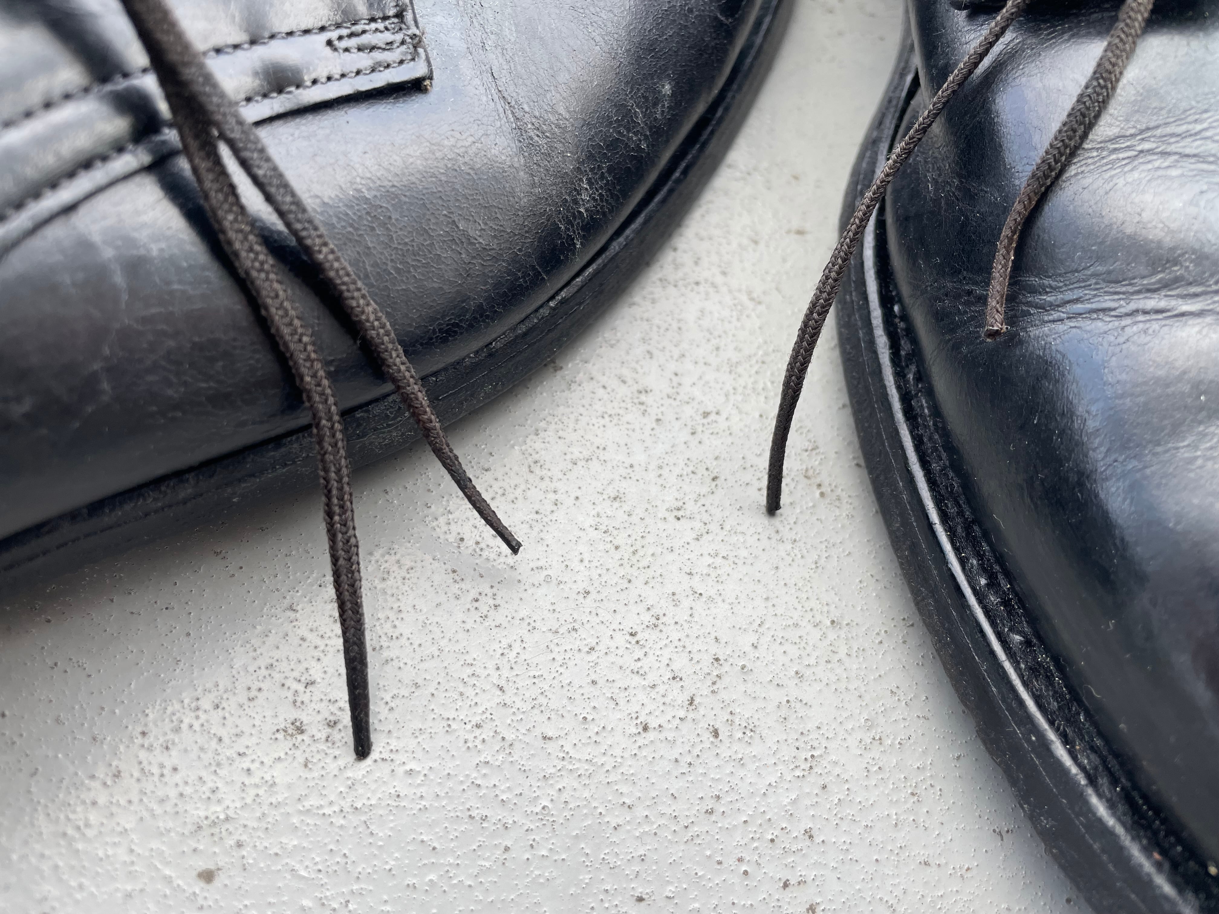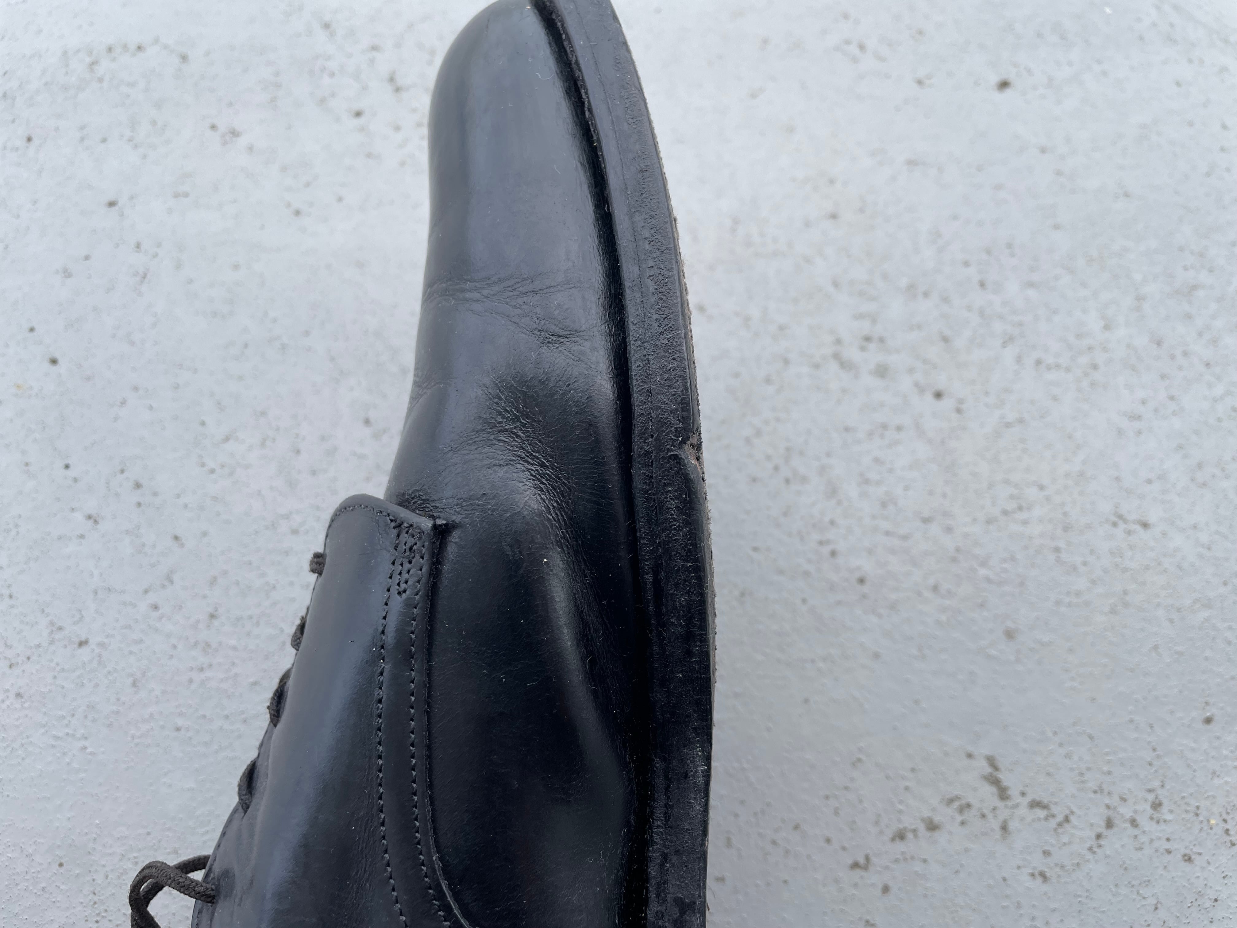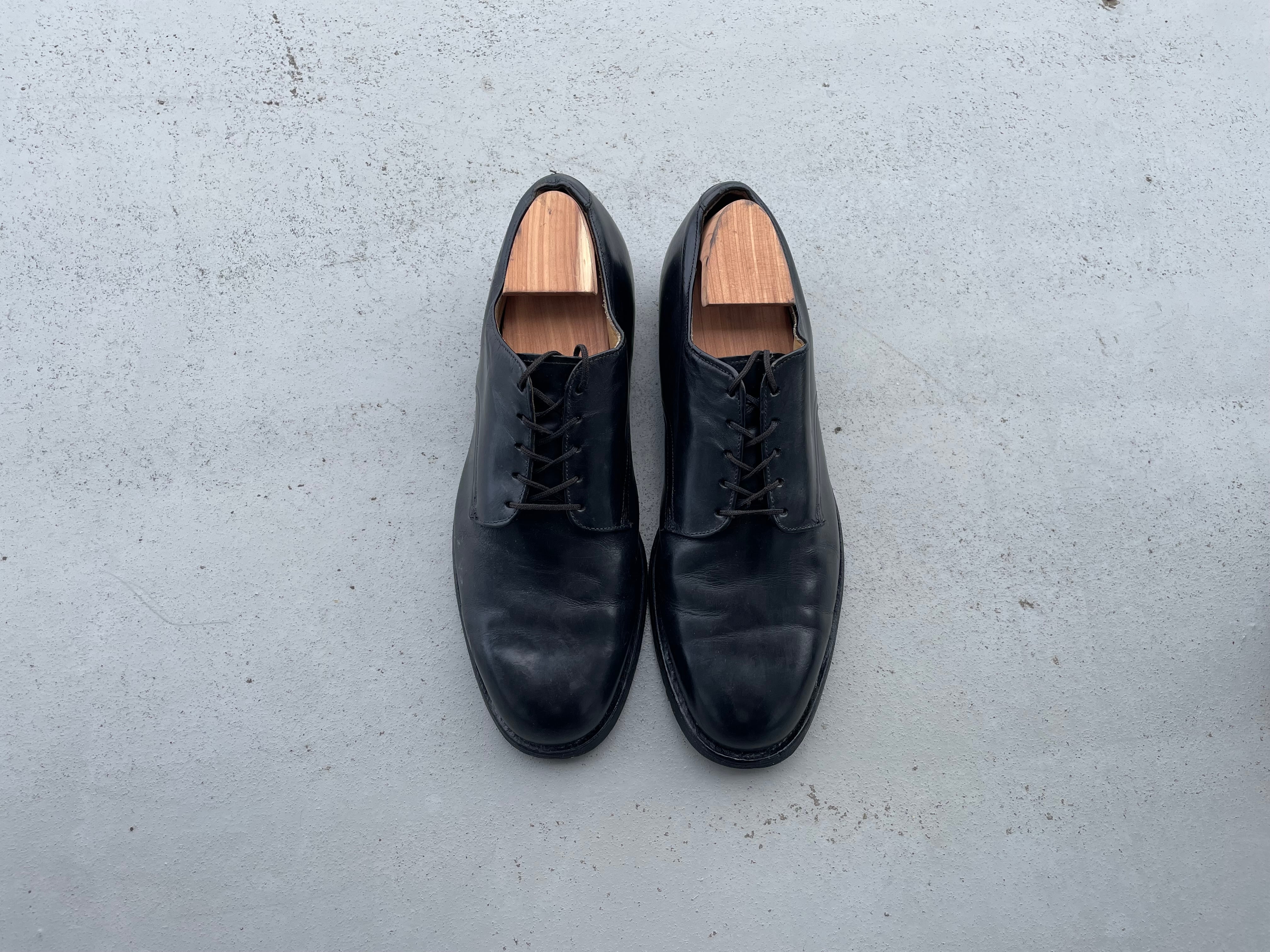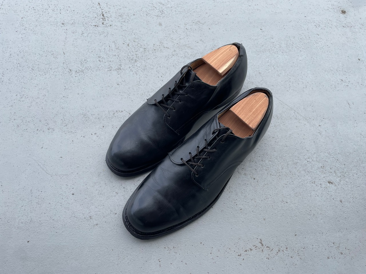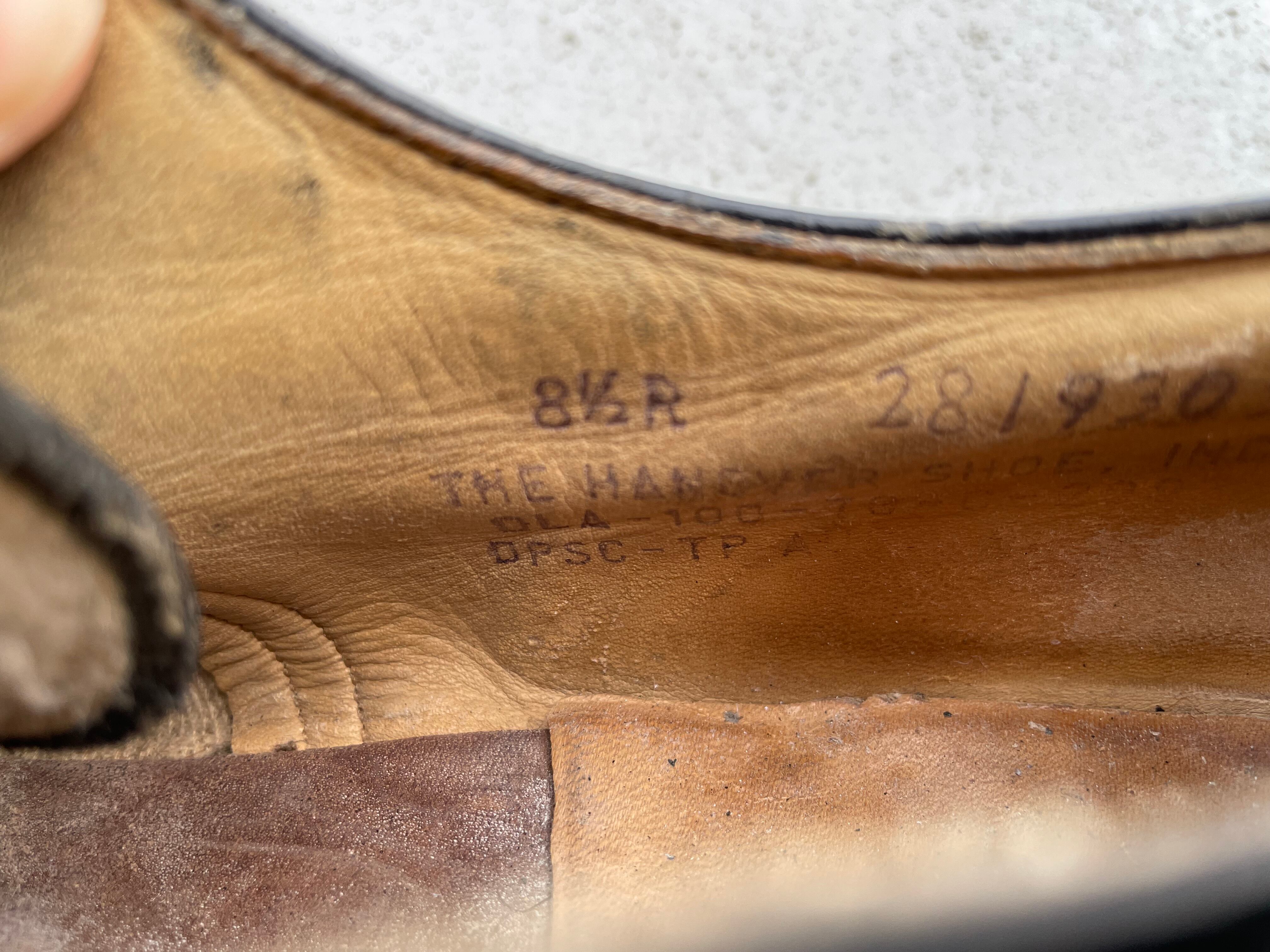 【商品詳細】U.S.NAVYのサービスシューズ。サイズは8 1/2R。カラーはブラック。78年THE HANOVER SHOE社製。ソールはBILTRITE。たん裏フェルト。OLDのガラスレザー仕様◎一部へこみ等ございますが全体通すと状態良い方と思います。