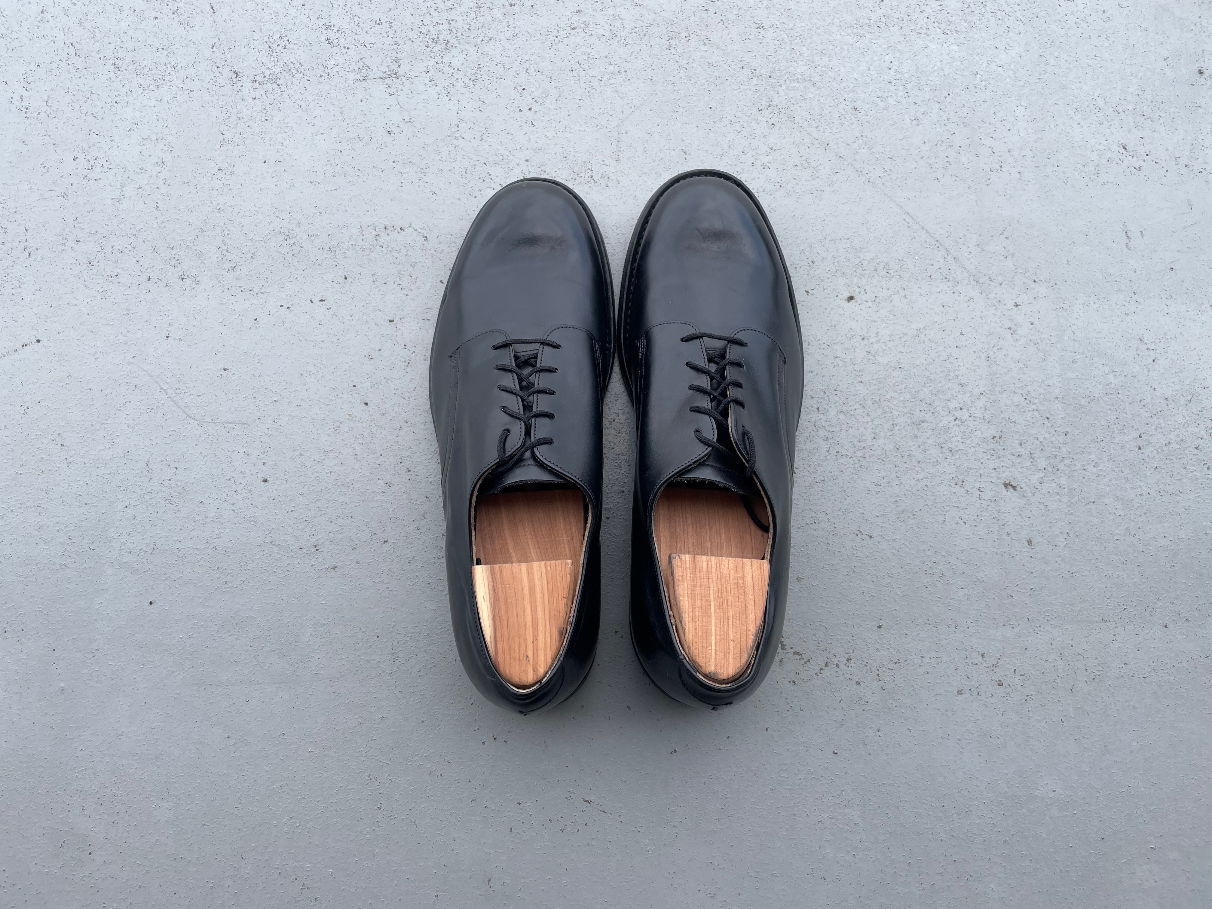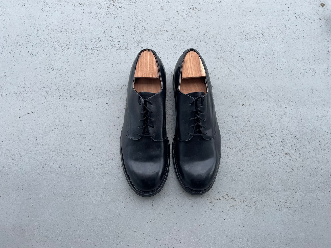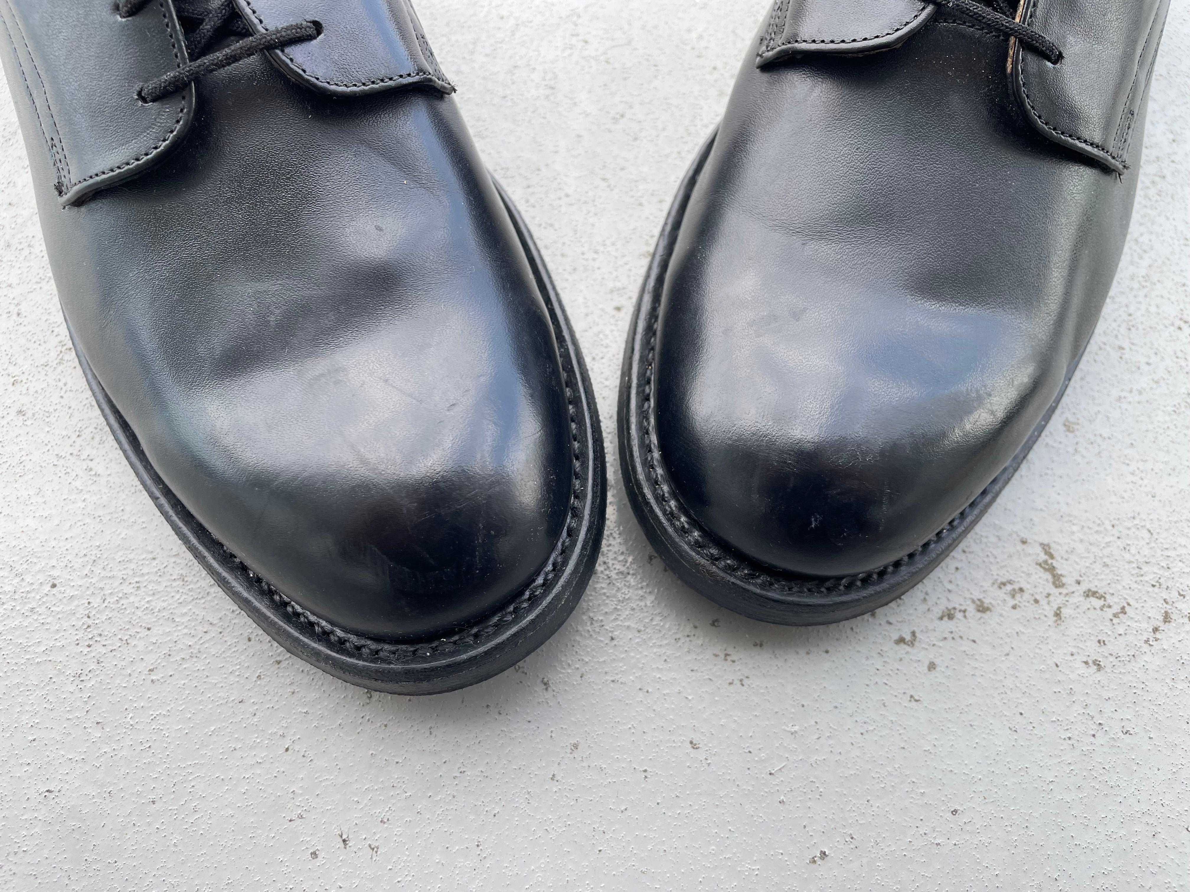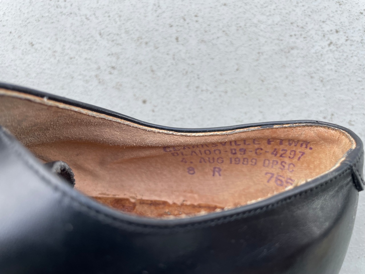 【商品詳細】U.S.NAVYのサービスシューズ。サイズは8R。カラーはブラック。89年CLARKSVILLE FTWR製。vulcanソール。オールドのガラスレザー仕様◎