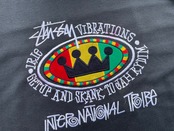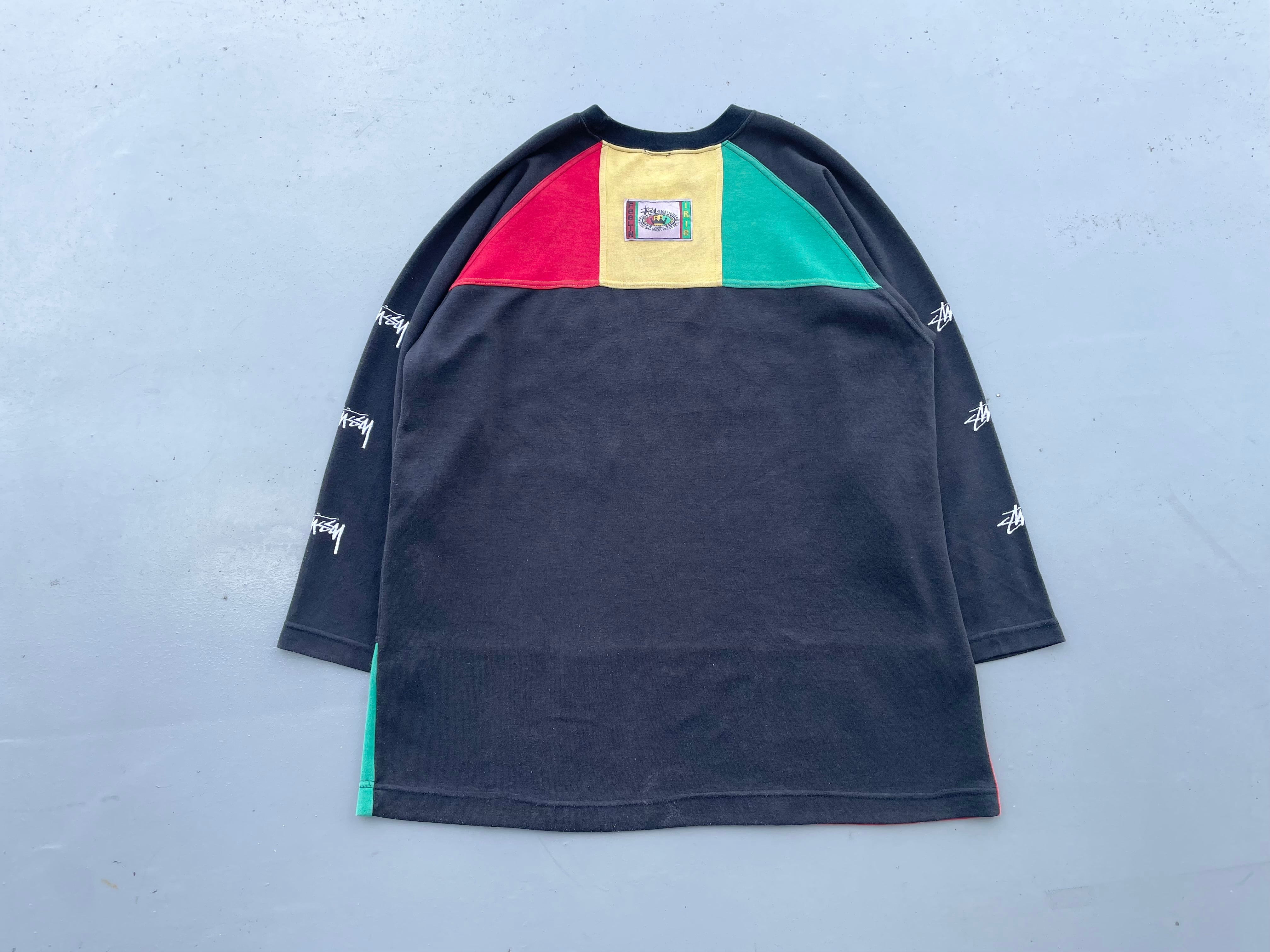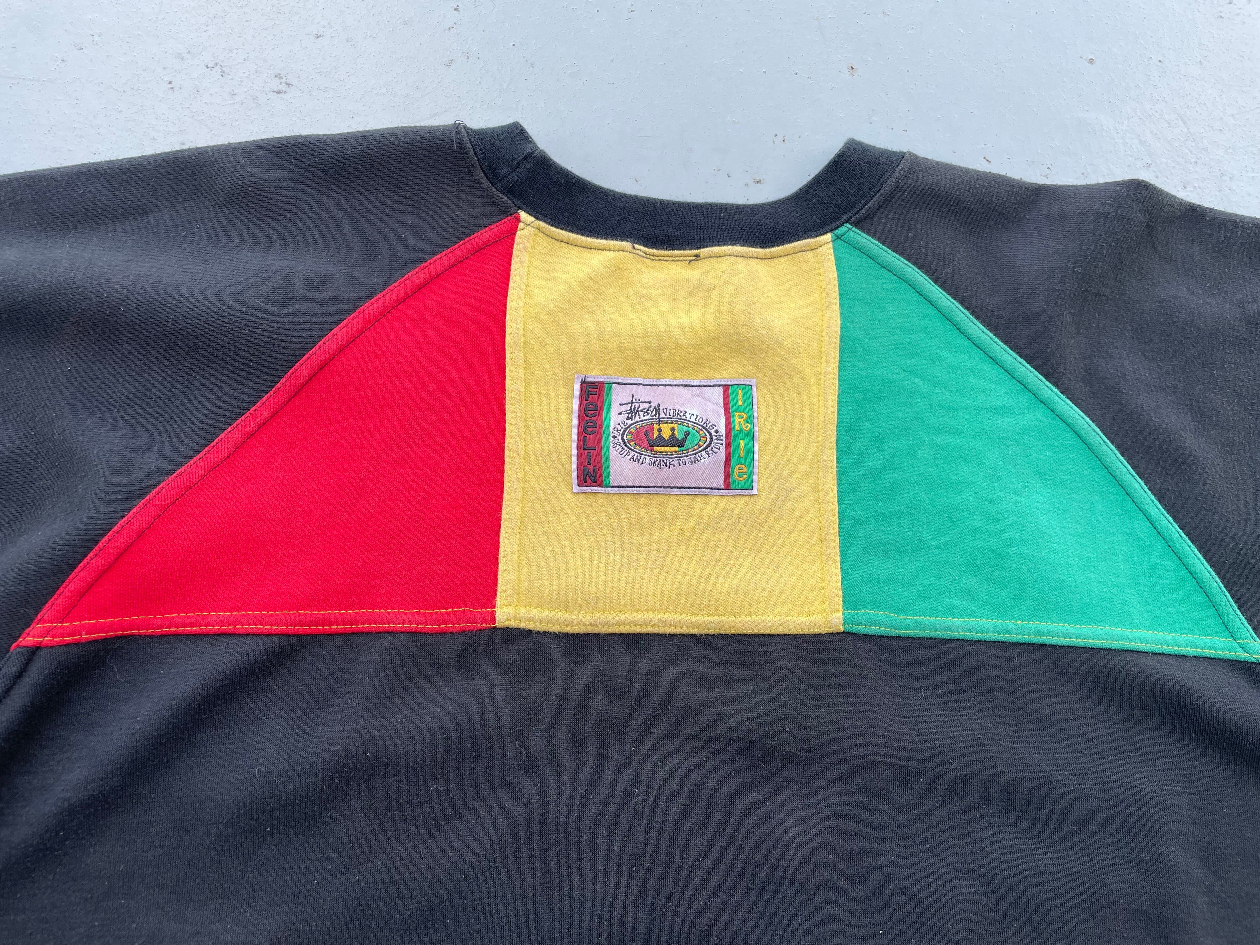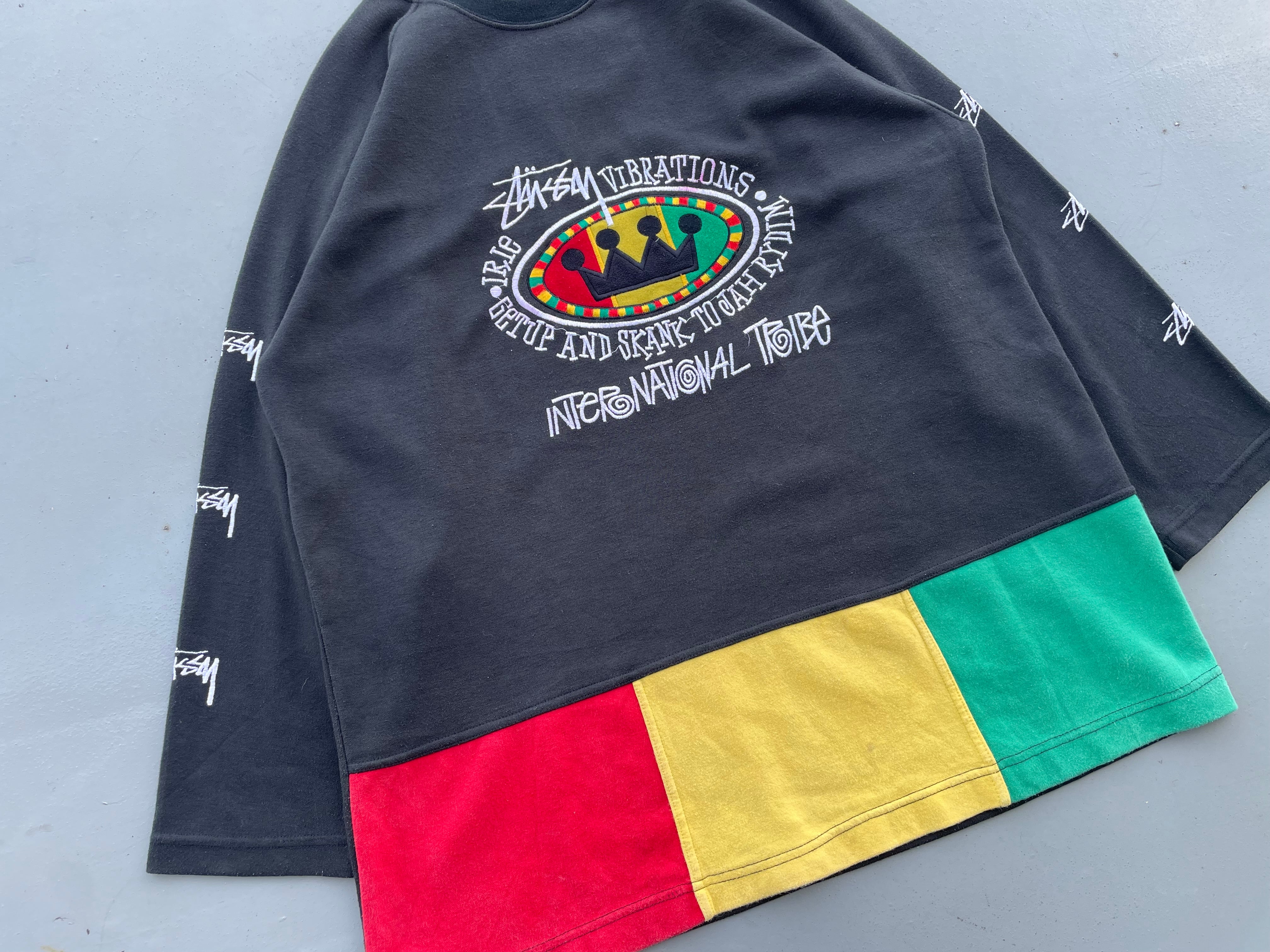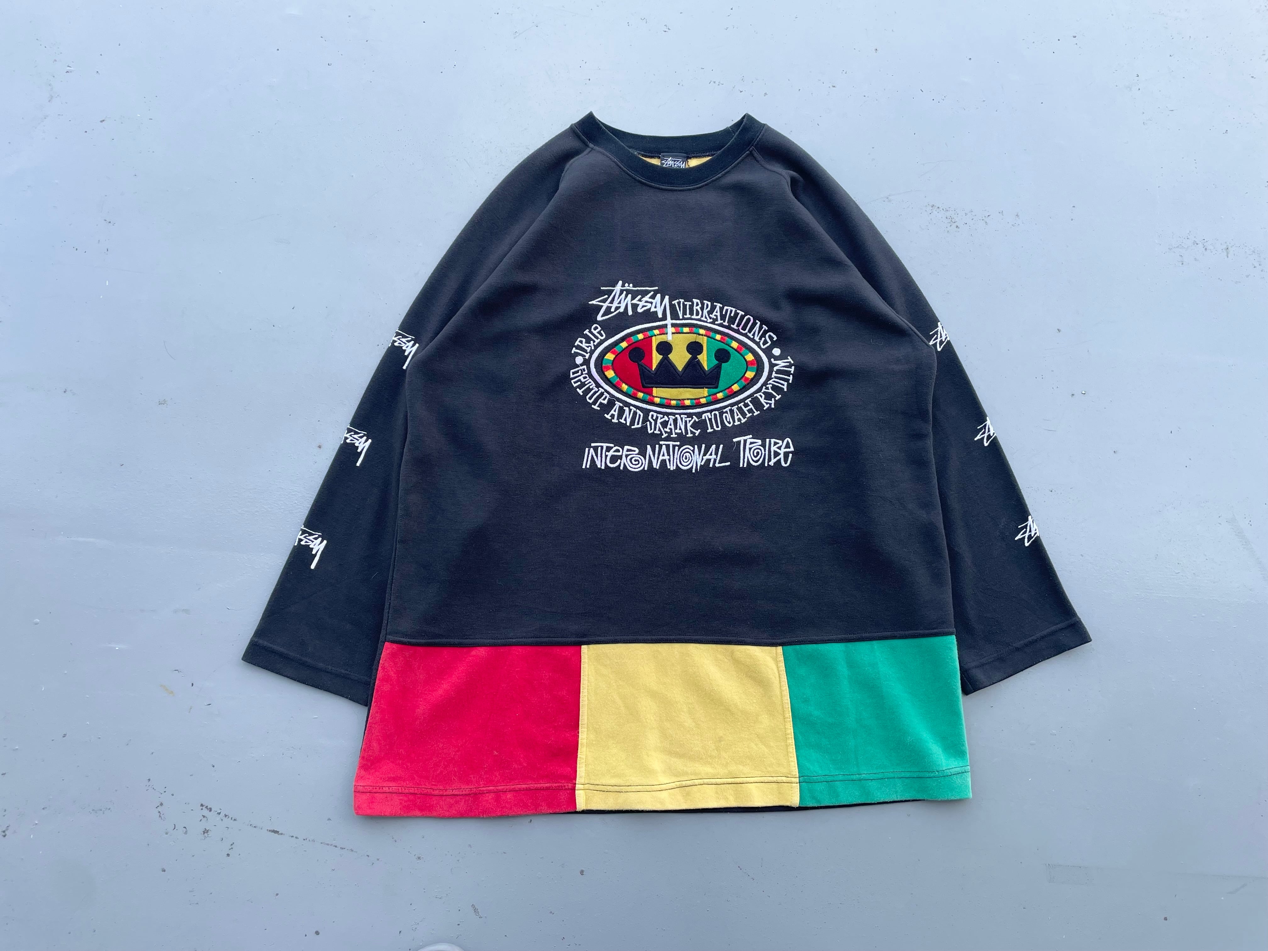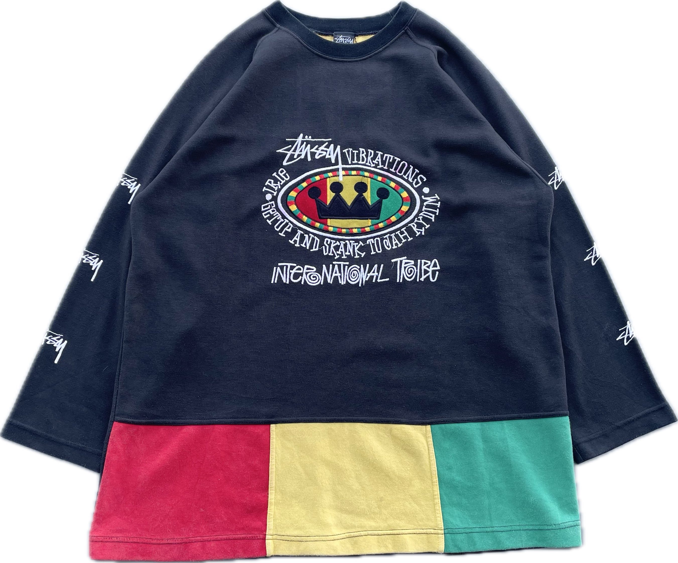 【商品詳細】STUSSYのブートレグスウェット。サイズはフリー。カラーはブラック。90年代製。特にブート物の人気が高いSTUSSY。こちらはフロントに定番ラスタカラーとクラウン、両袖にはSTUSSYと刺繍された豪華な仕様になってます。タグ見て分かるように良い意味で適当なのがなんか良いですね。汚れありますが記載の通りよく見ないとほぼ分からないのであまり気にならないと思います。
