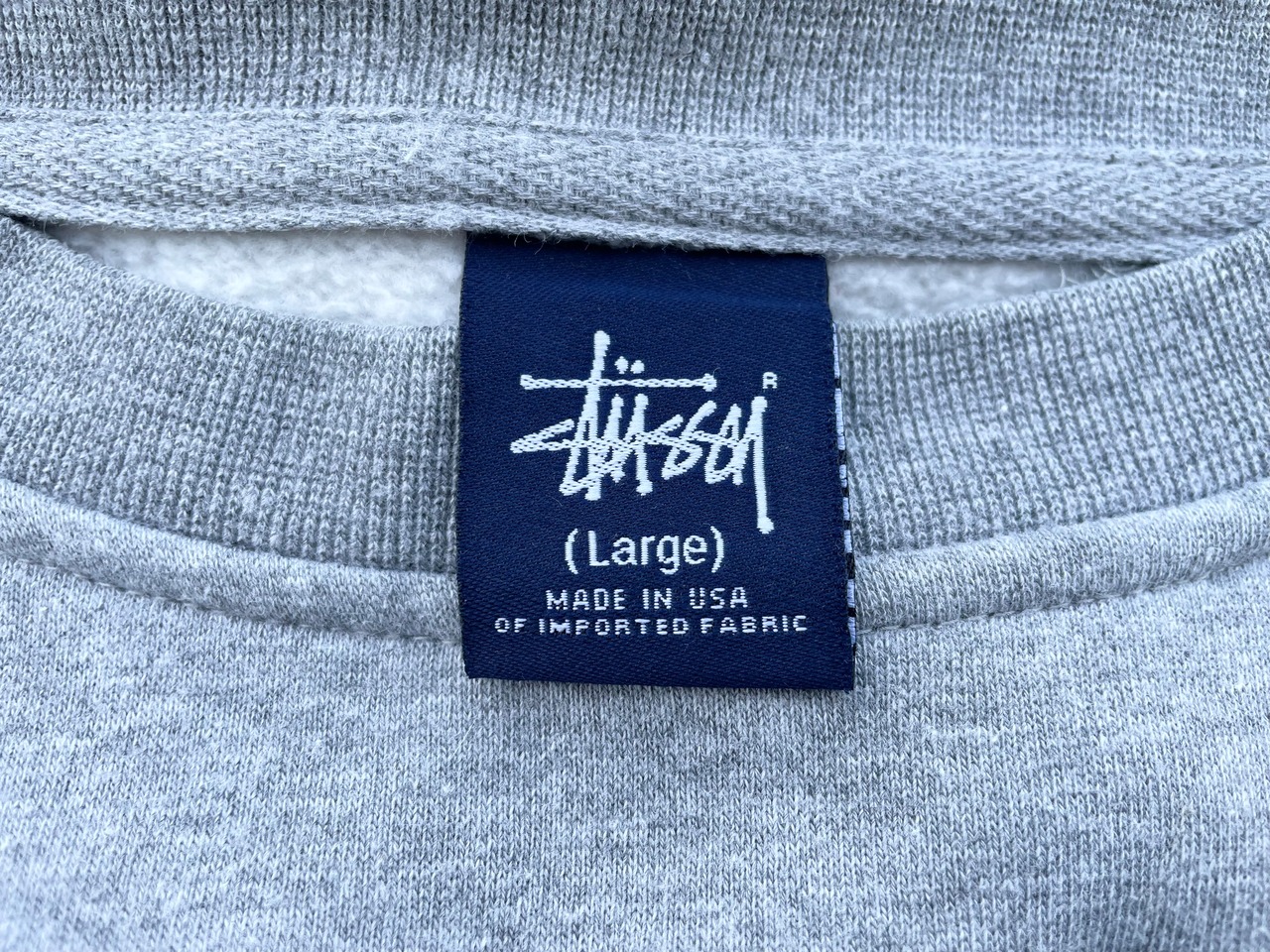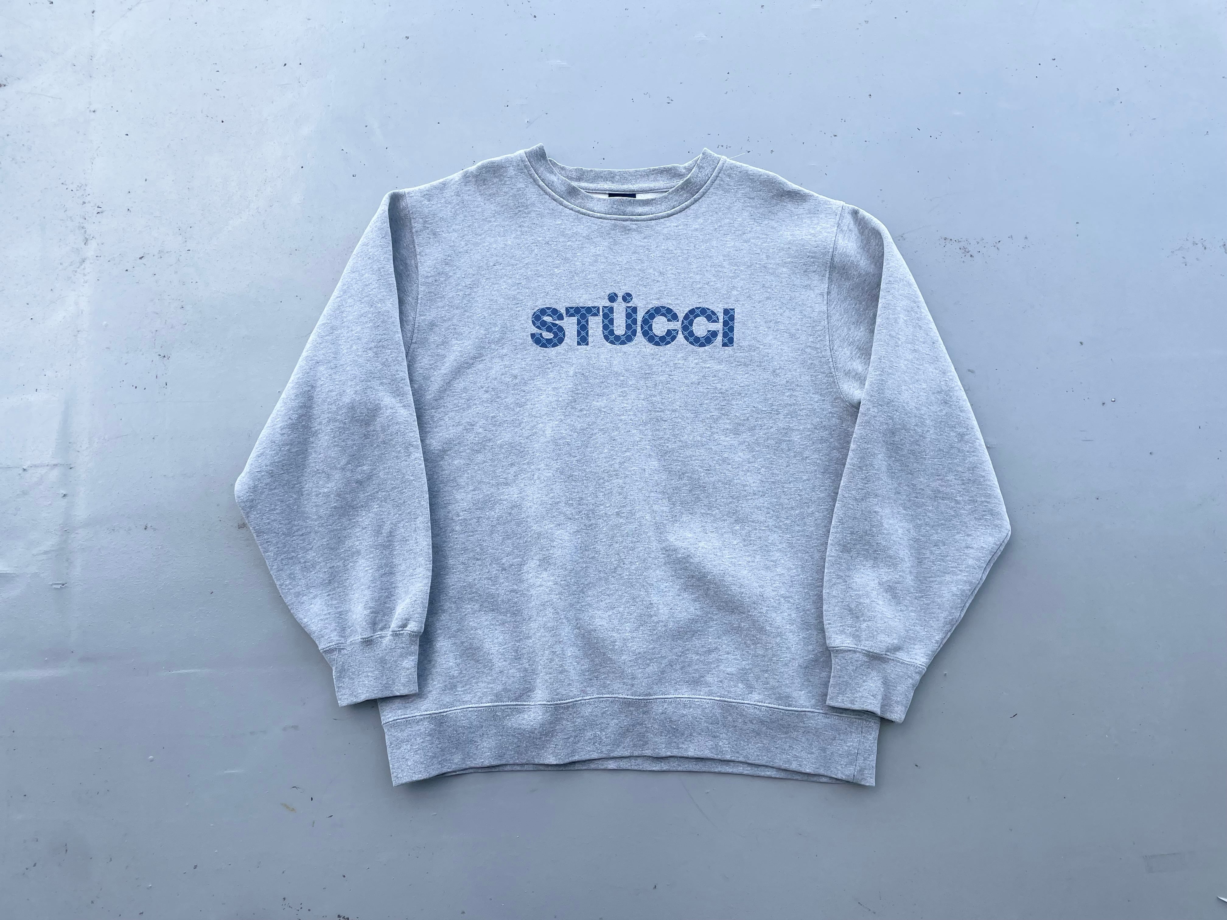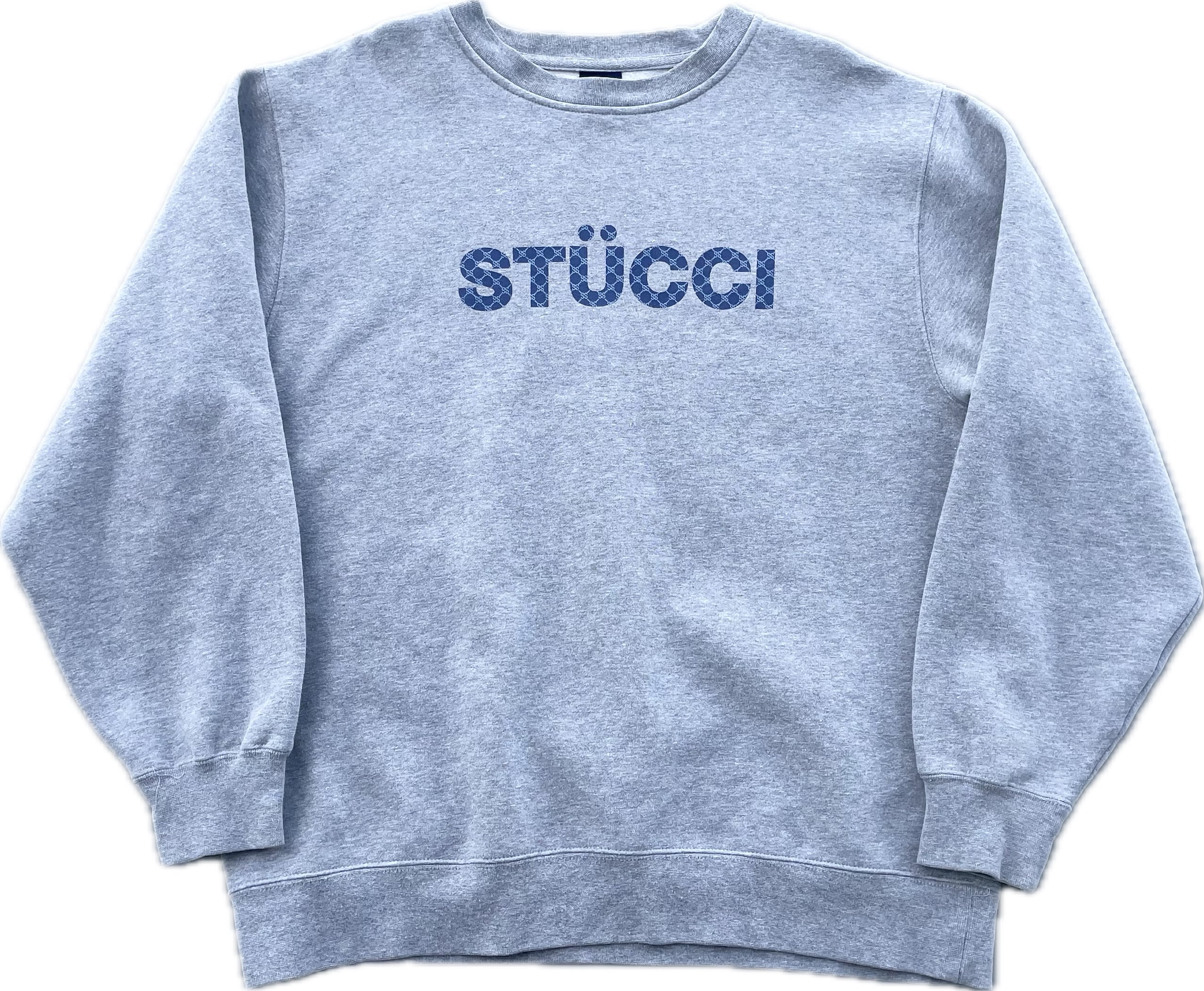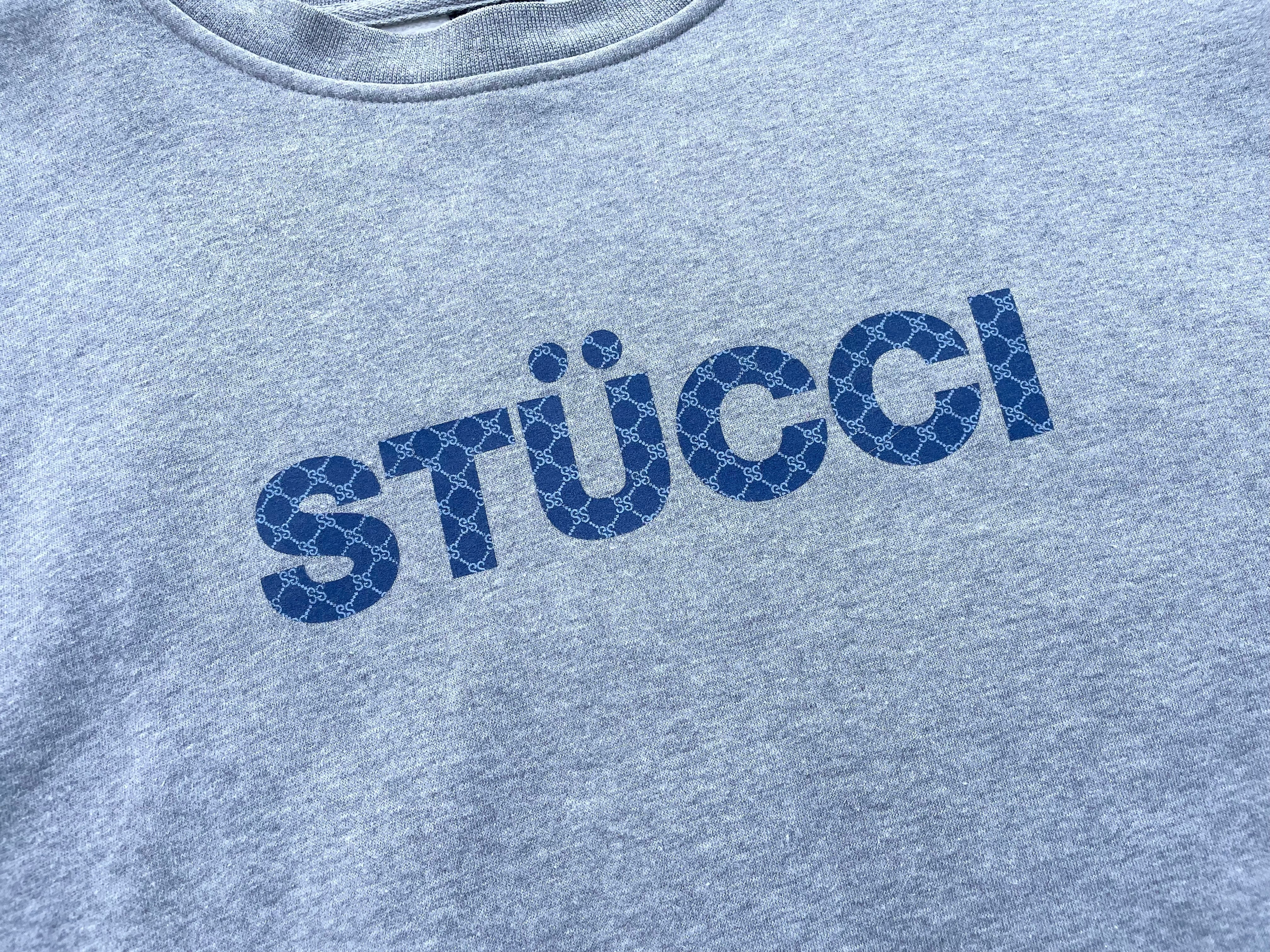 【商品詳細】STUSSYのスウェット。サイズはXL。カラーはグレー。90年代USA製。STUSSY人気のパロディ物。こちらは某ハイブランドとSTUSSYを文字ったミックスロゴプリント。STÜCCIの中身を見るとGGモノグラム風のSSモノグラムになっている洒落たデザイン。中国製が多いデザインですがこちらは嬉しいUSA物。サイズも完璧だと思います。