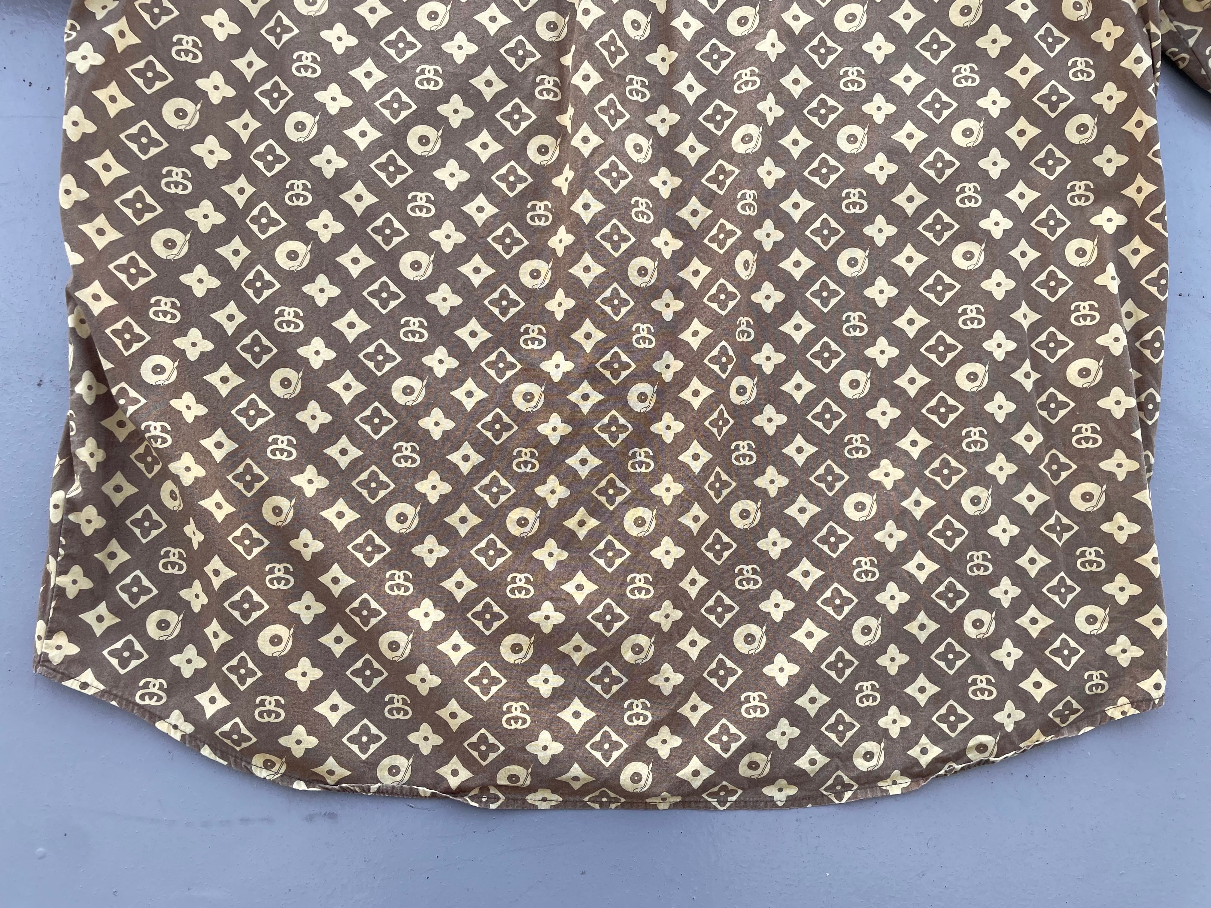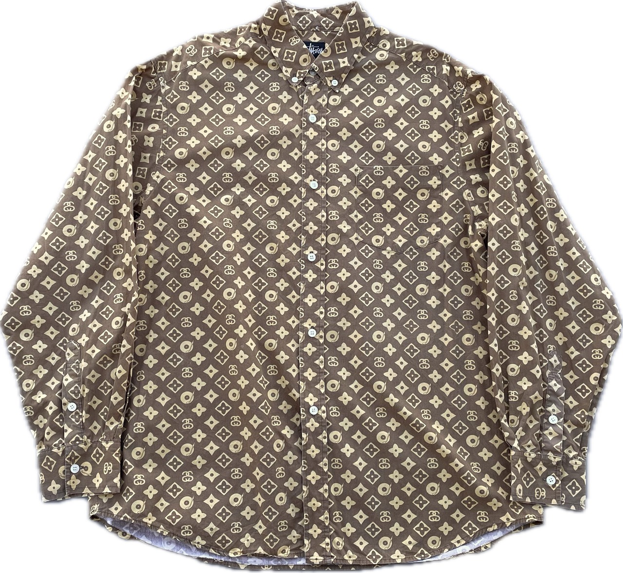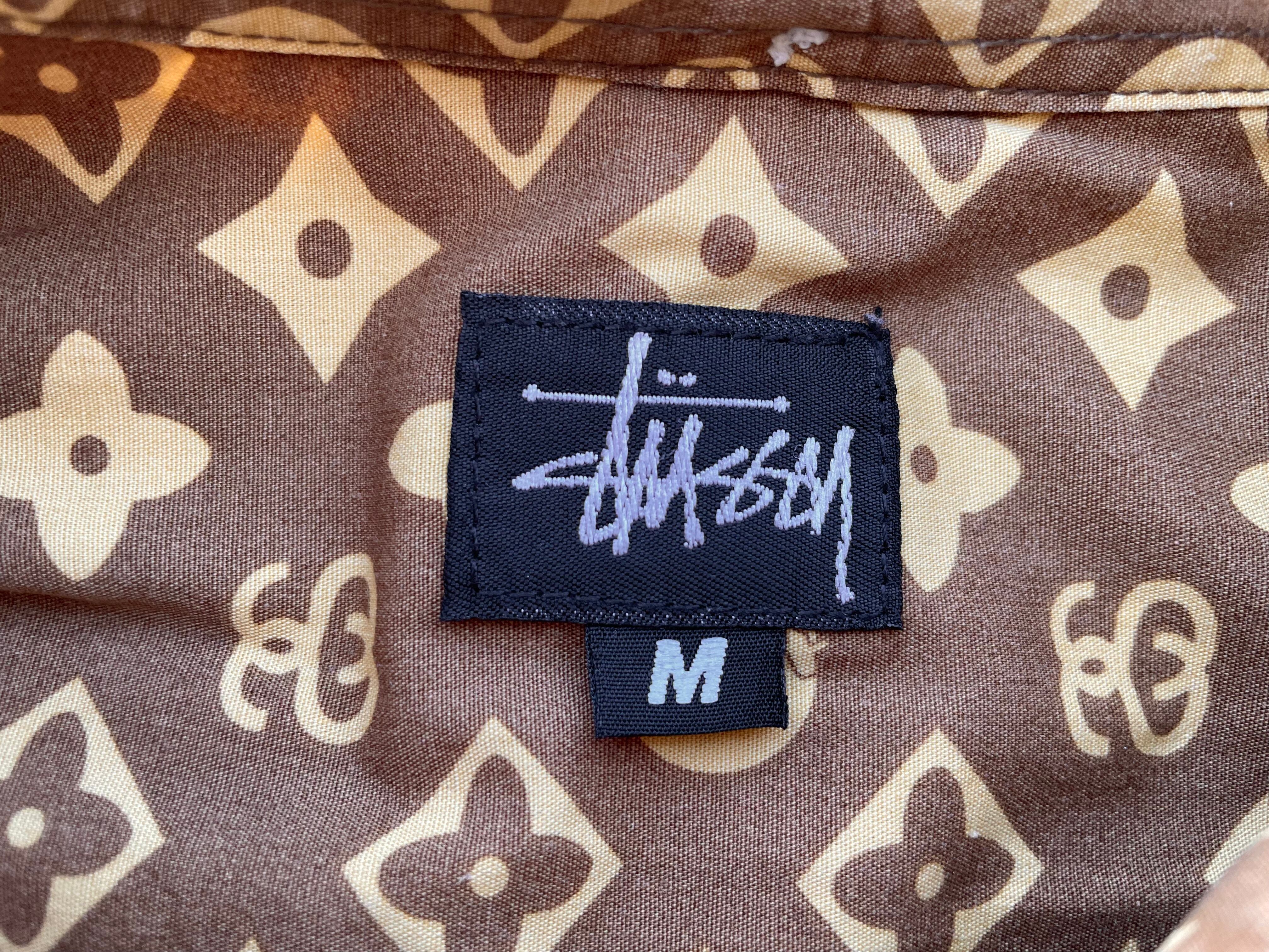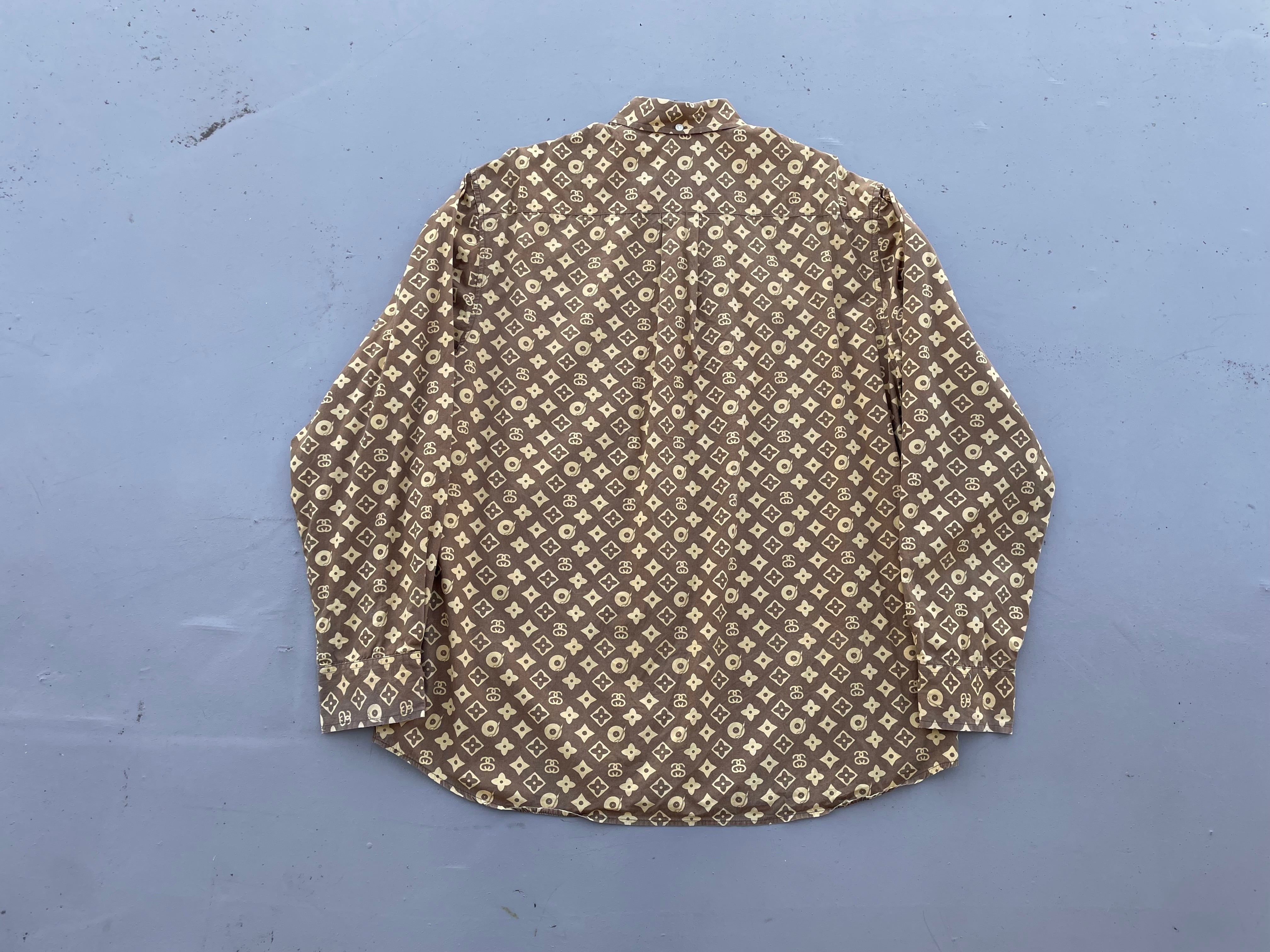 【商品詳細】STUSSYの長袖シャツ。サイズはM。カラーはブラウン×イエローベース。90年代USA製。STUSSY人気のパロディ物。パッと見て分かる某ハイブランドのモノグラムパターンをSTUSSY風に落とし込んだ粋なデザイン。カラーもブランドを意識した感じなんですかね。ほぼ田中オム期のオーバーサイズシャツのディテールで所謂ギャルソンシルエット。Mサイズですが実寸の通り大きめの作り。半袖よりも長袖は出ないです。