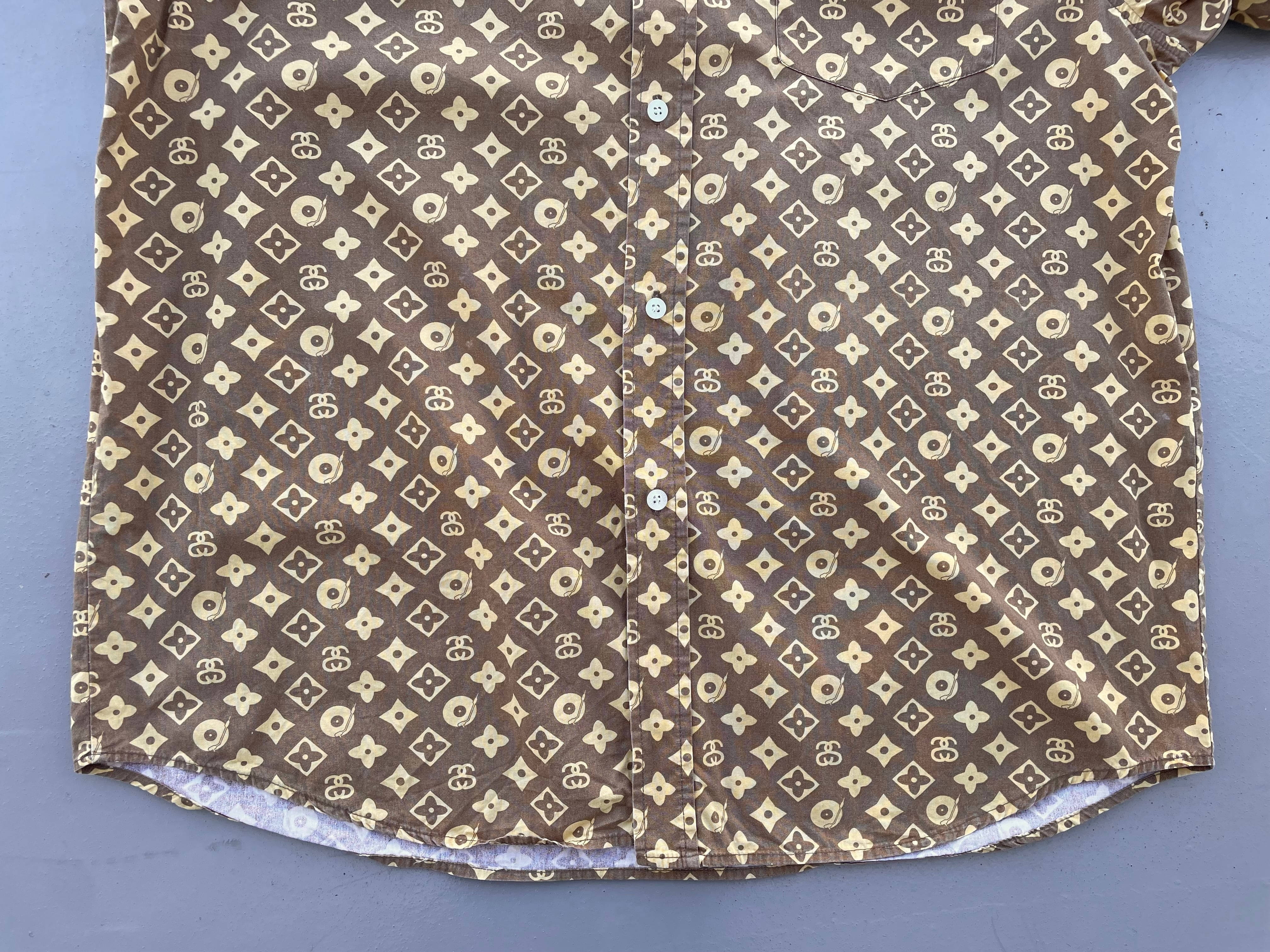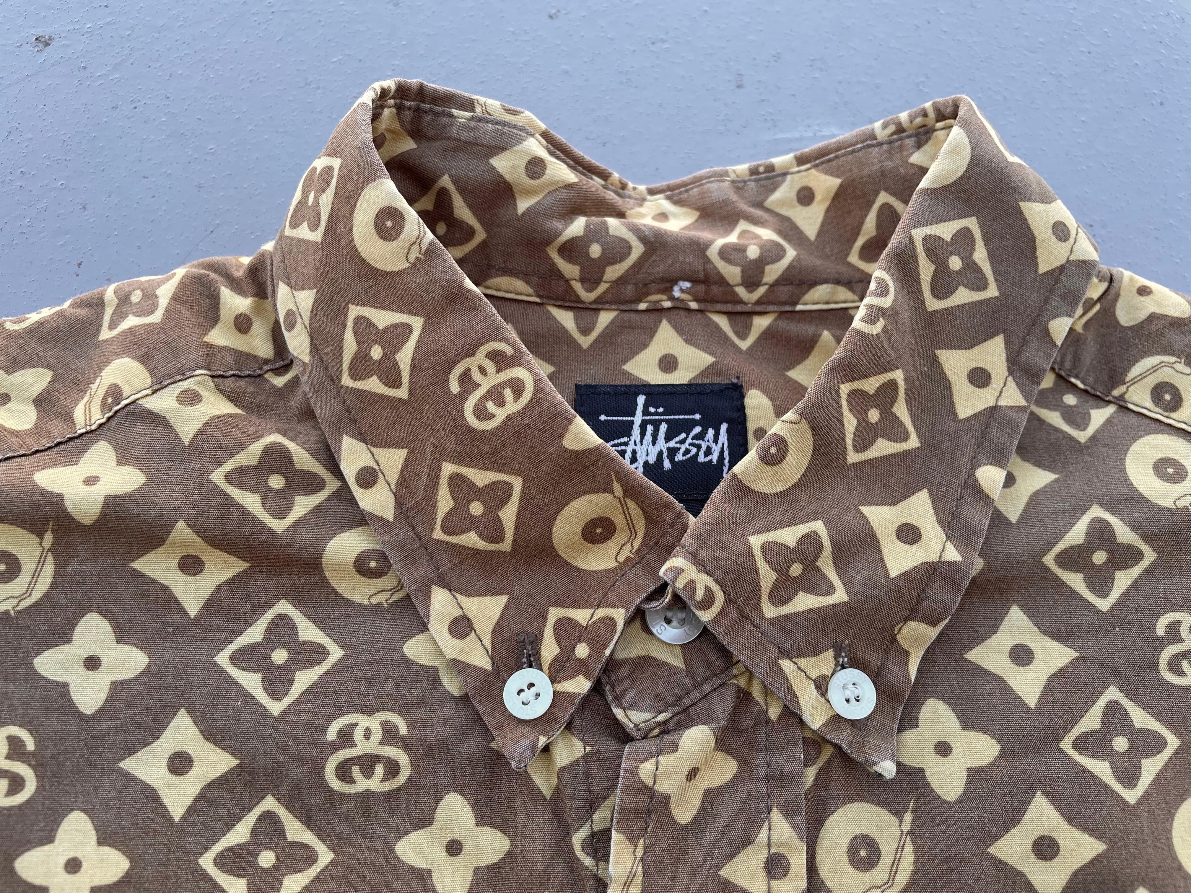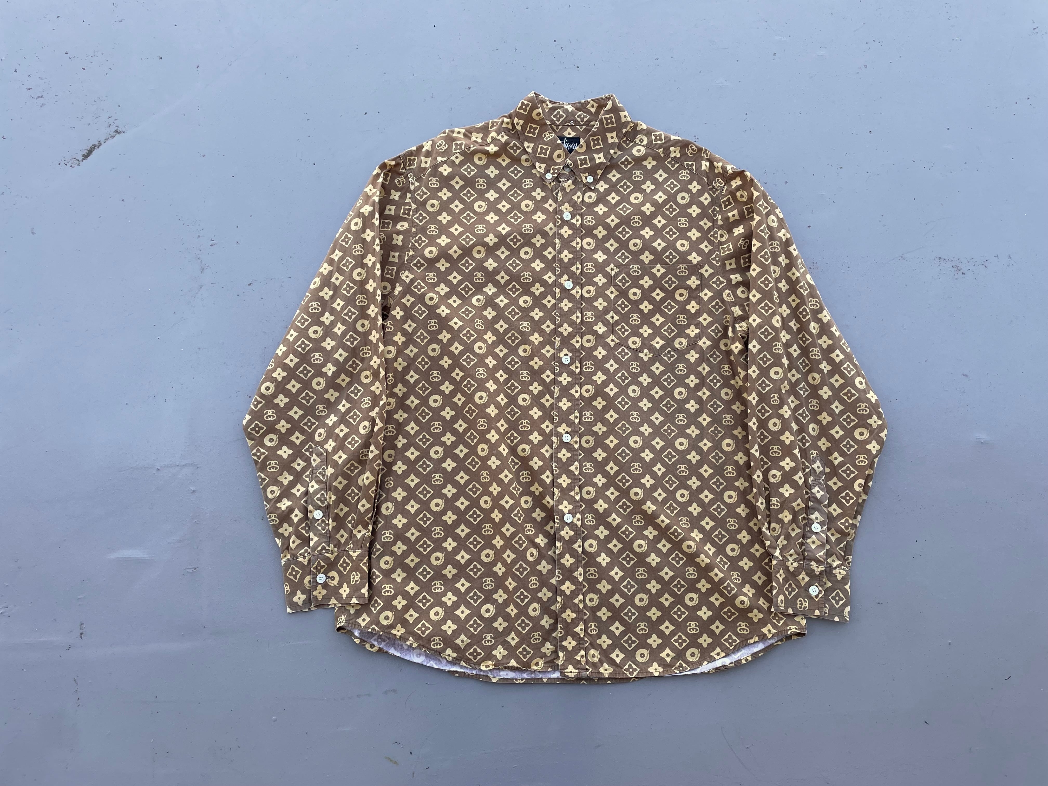 【商品詳細】STUSSYの長袖シャツ。サイズはM。カラーはブラウン×イエローベース。90年代USA製。STUSSY人気のパロディ物。パッと見て分かる某ハイブランドのモノグラムパターンをSTUSSY風に落とし込んだ粋なデザイン。カラーもブランドを意識した感じなんですかね。ほぼ田中オム期のオーバーサイズシャツのディテールで所謂ギャルソンシルエット。Mサイズですが実寸の通り大きめの作り。半袖よりも長袖は出ないです。