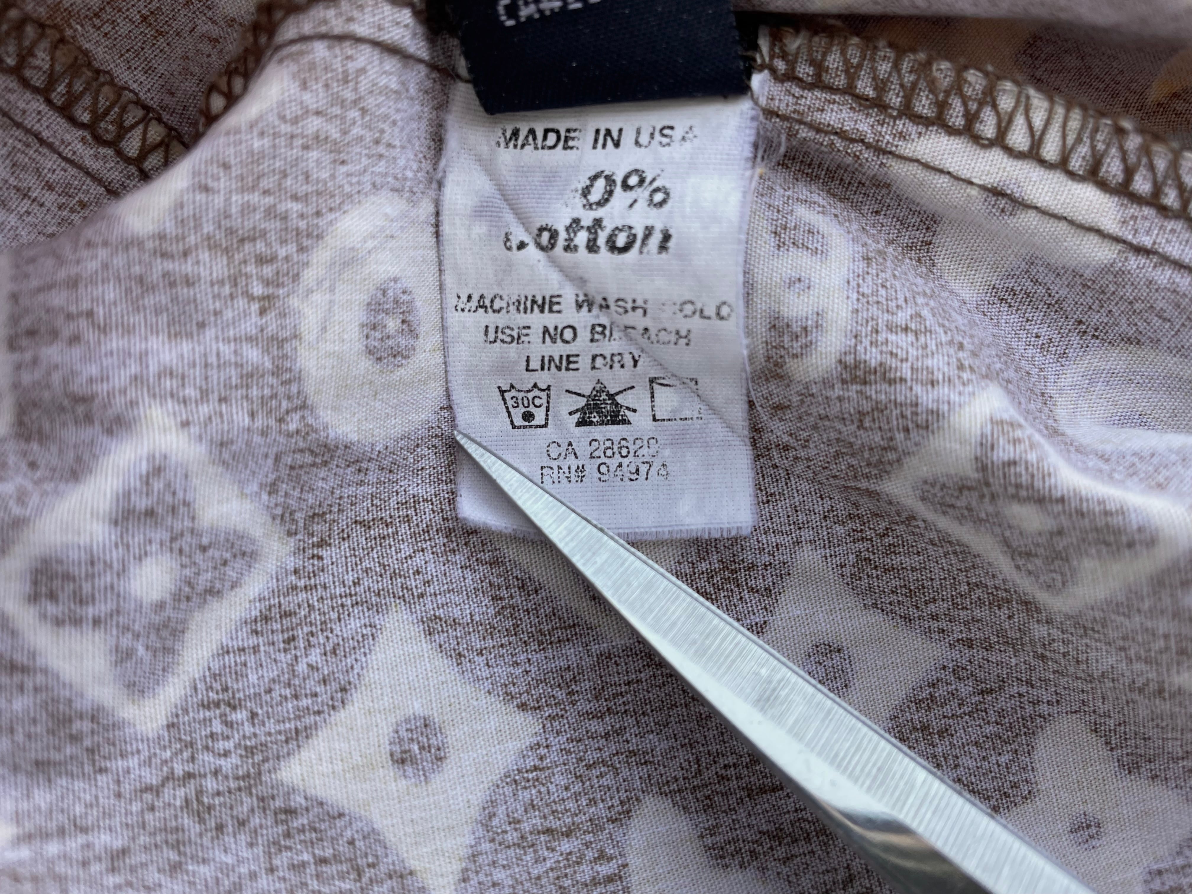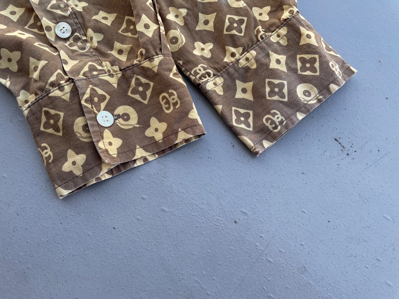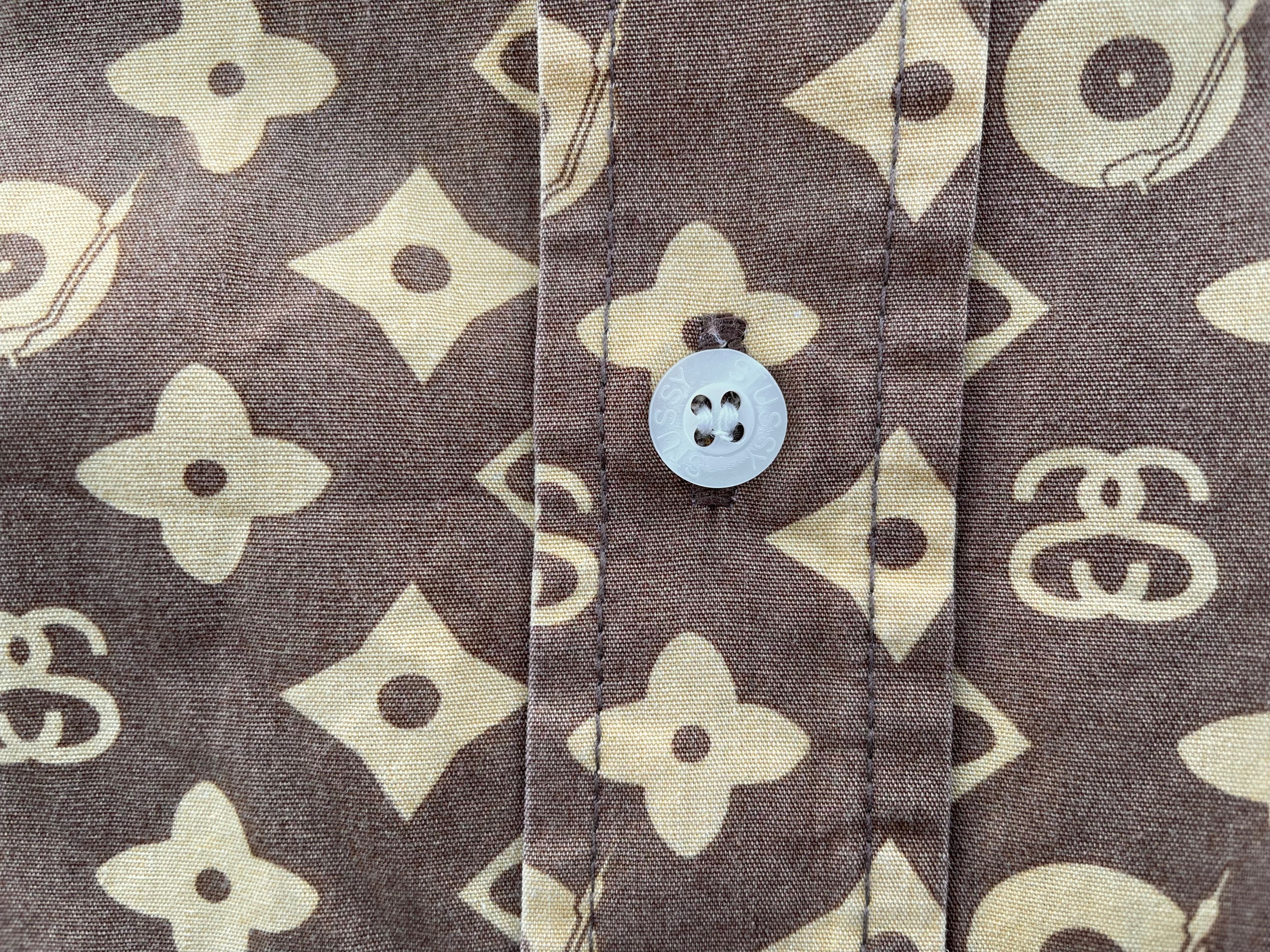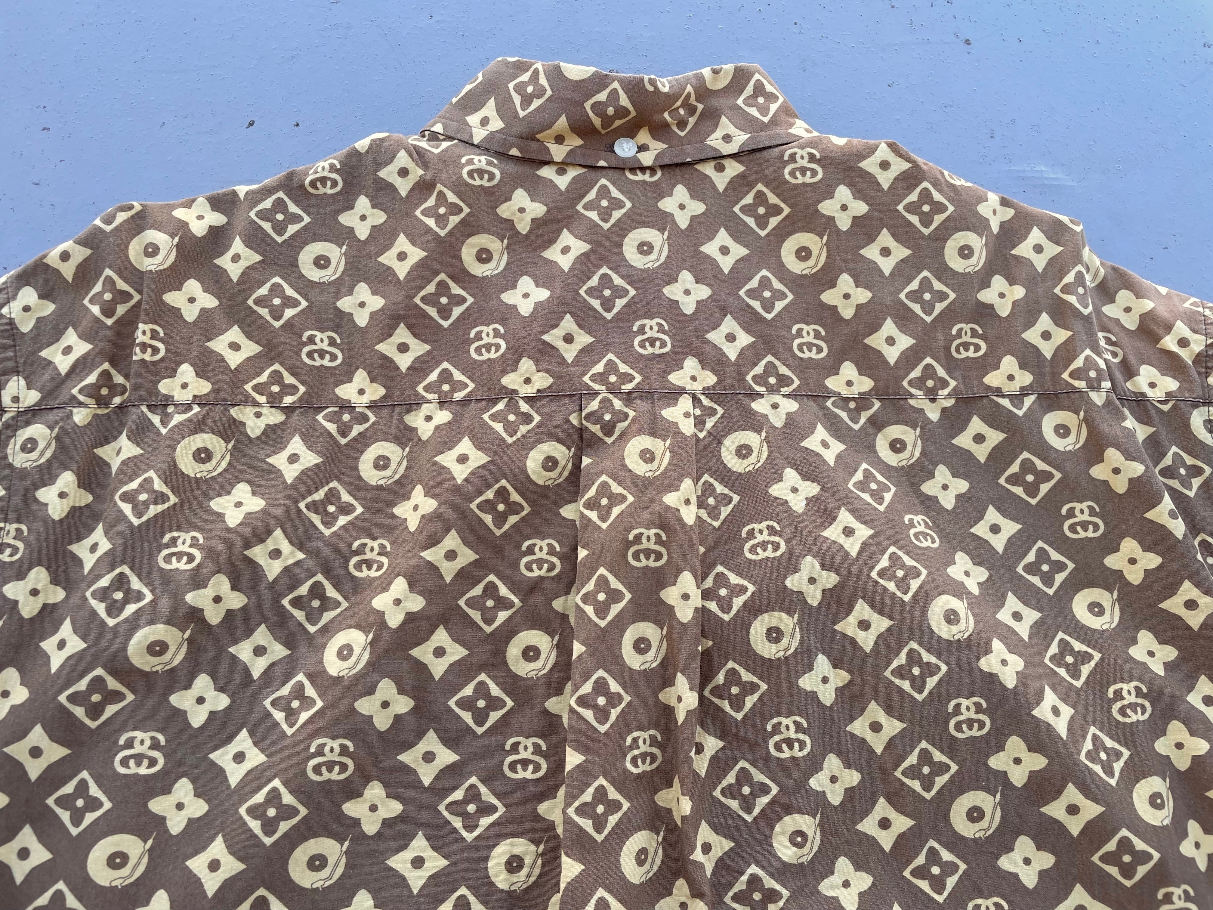 【商品詳細】STUSSYの長袖シャツ。サイズはM。カラーはブラウン×イエローベース。90年代USA製。STUSSY人気のパロディ物。パッと見て分かる某ハイブランドのモノグラムパターンをSTUSSY風に落とし込んだ粋なデザイン。カラーもブランドを意識した感じなんですかね。ほぼ田中オム期のオーバーサイズシャツのディテールで所謂ギャルソンシルエット。Mサイズですが実寸の通り大きめの作り。半袖よりも長袖は出ないです。