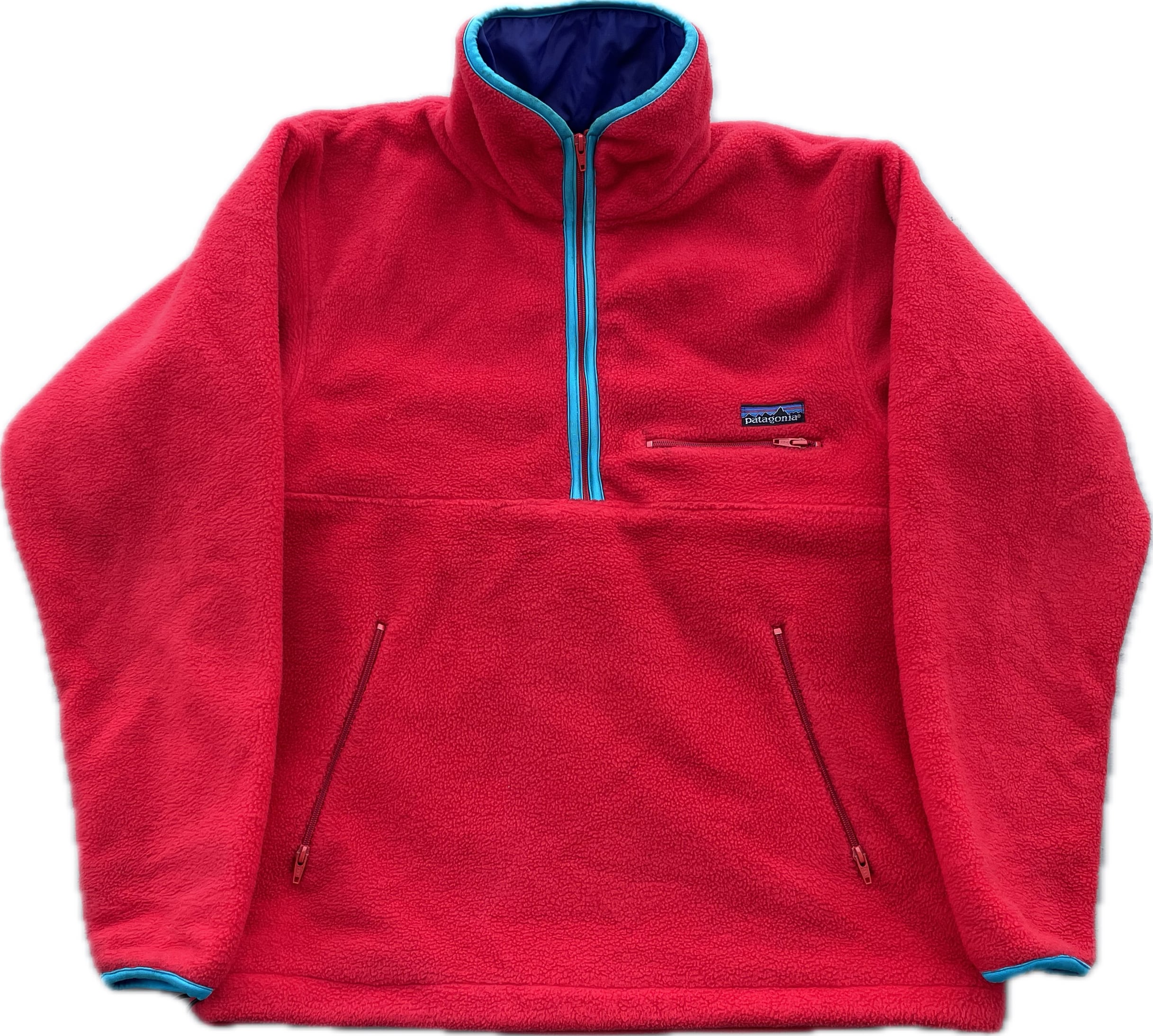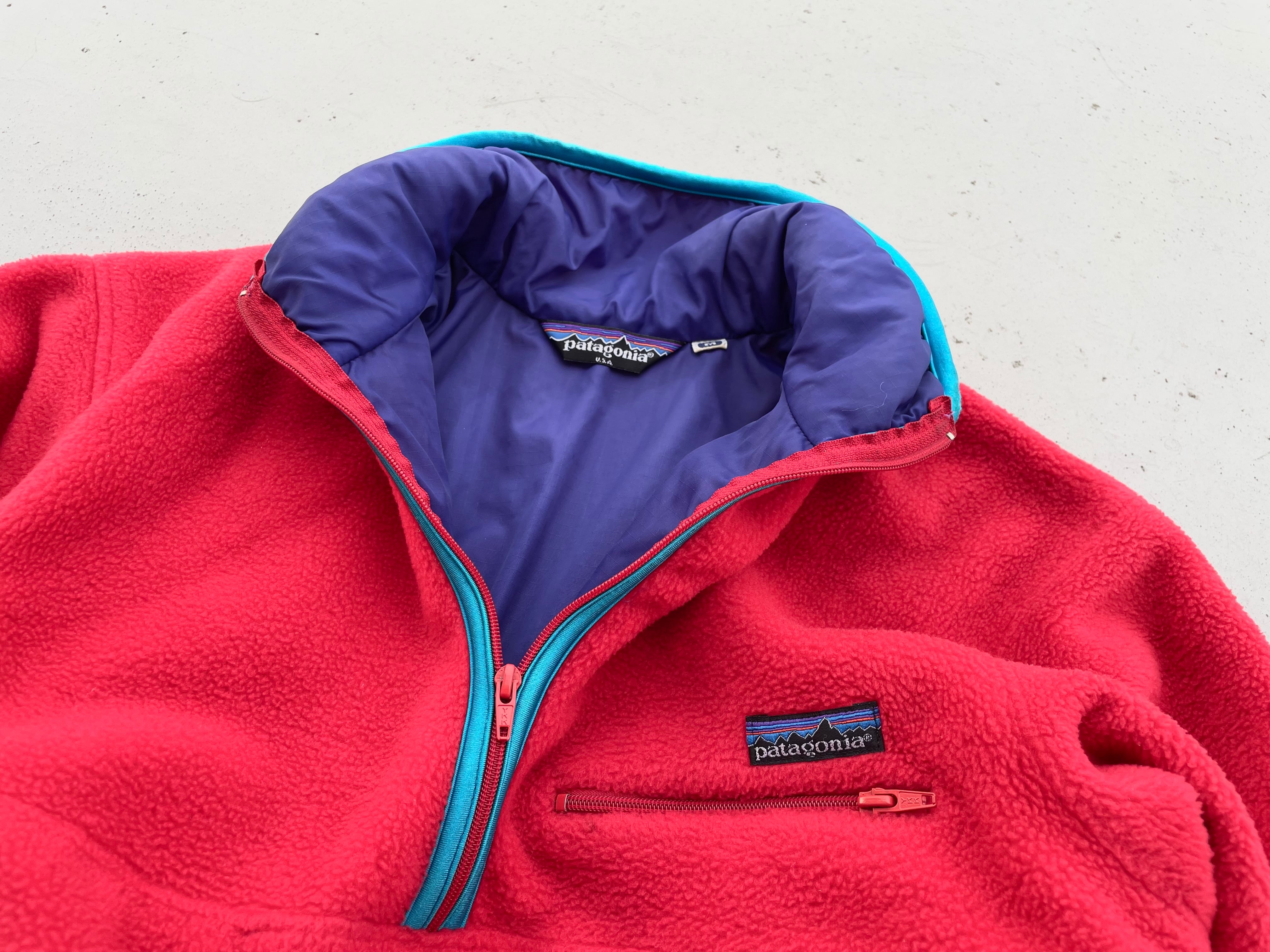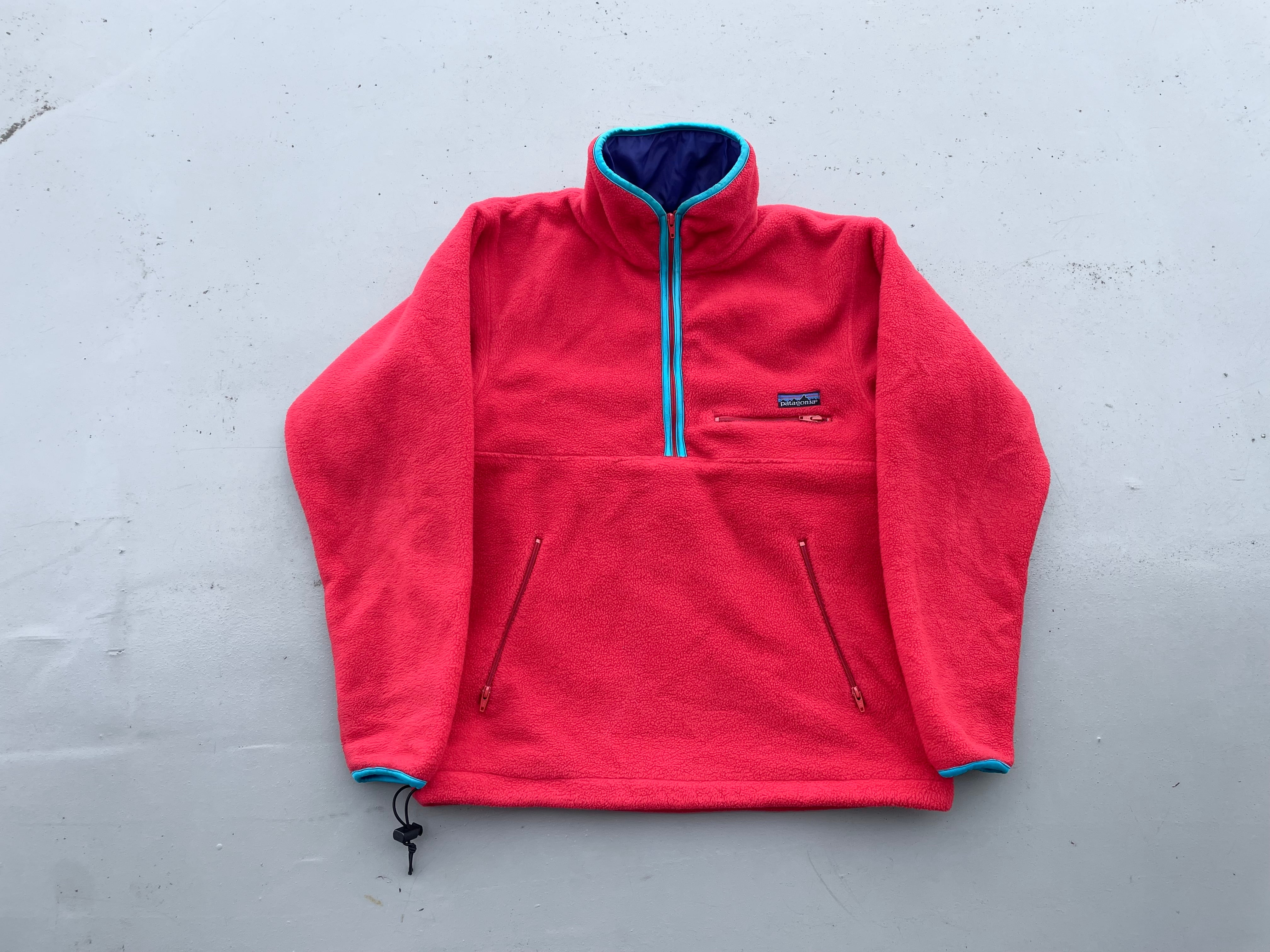 【商品詳細】PatagoniaのPullover Glissade Jacket。サイズはM。カラーはレッド×パープル。80年代製。こちらは人気モデルグリセードの初期タイプ。片面仕様や斜めに入る八の字ジップ、45Cファスナー仕様等、90年代以降のグリセードとディテールに違いがあります。所謂真っ赤ではなく白みのあるレッドカラーで着用しやすいかと。加えてターコイズブルーのパイピングと内側のエッグプラントなパープルカラー仕様でトータルクールな一着。古い個体ではありますがフリース地はフカルカで状態は良いです。まじで良いカラーですね〜