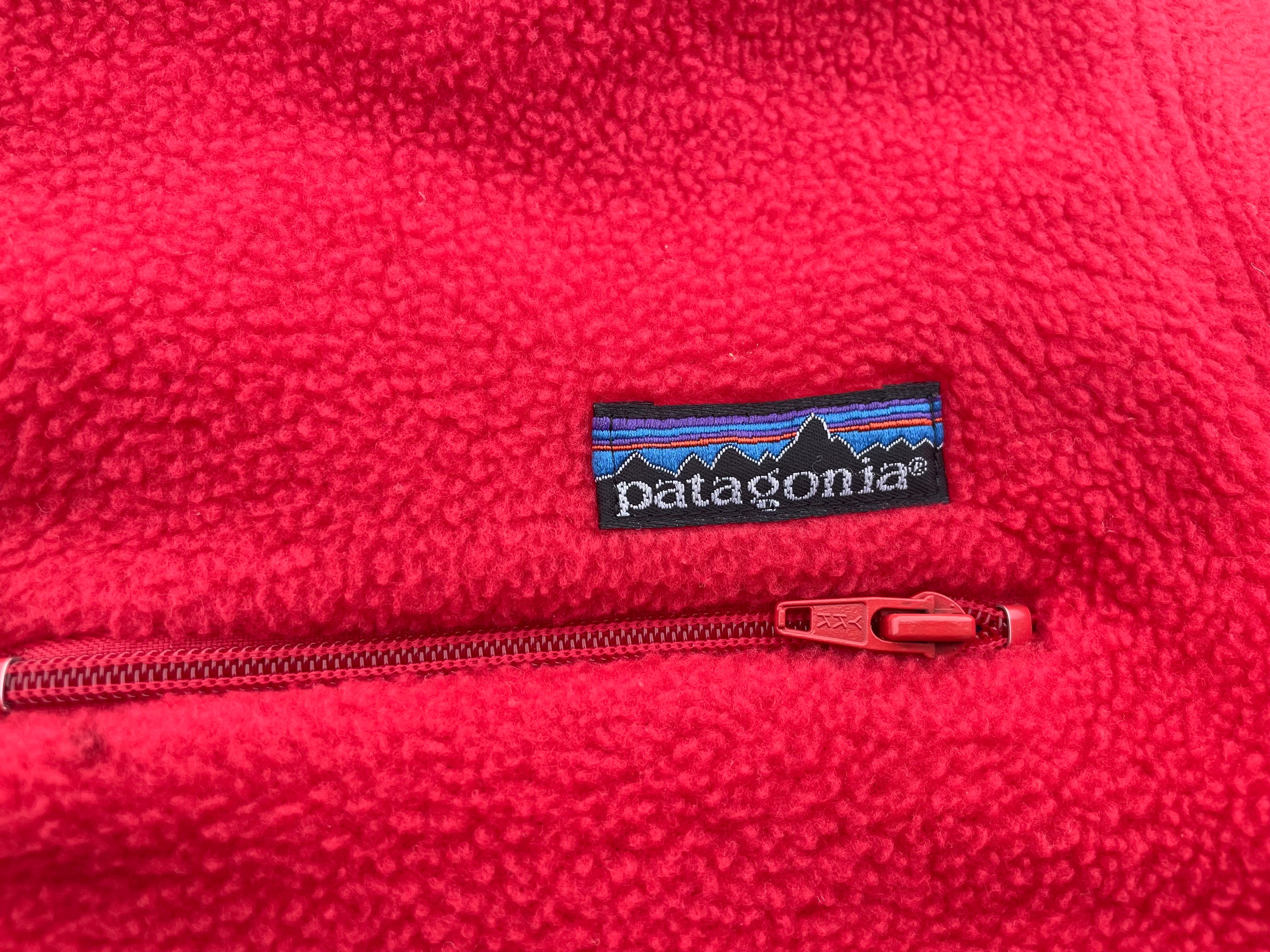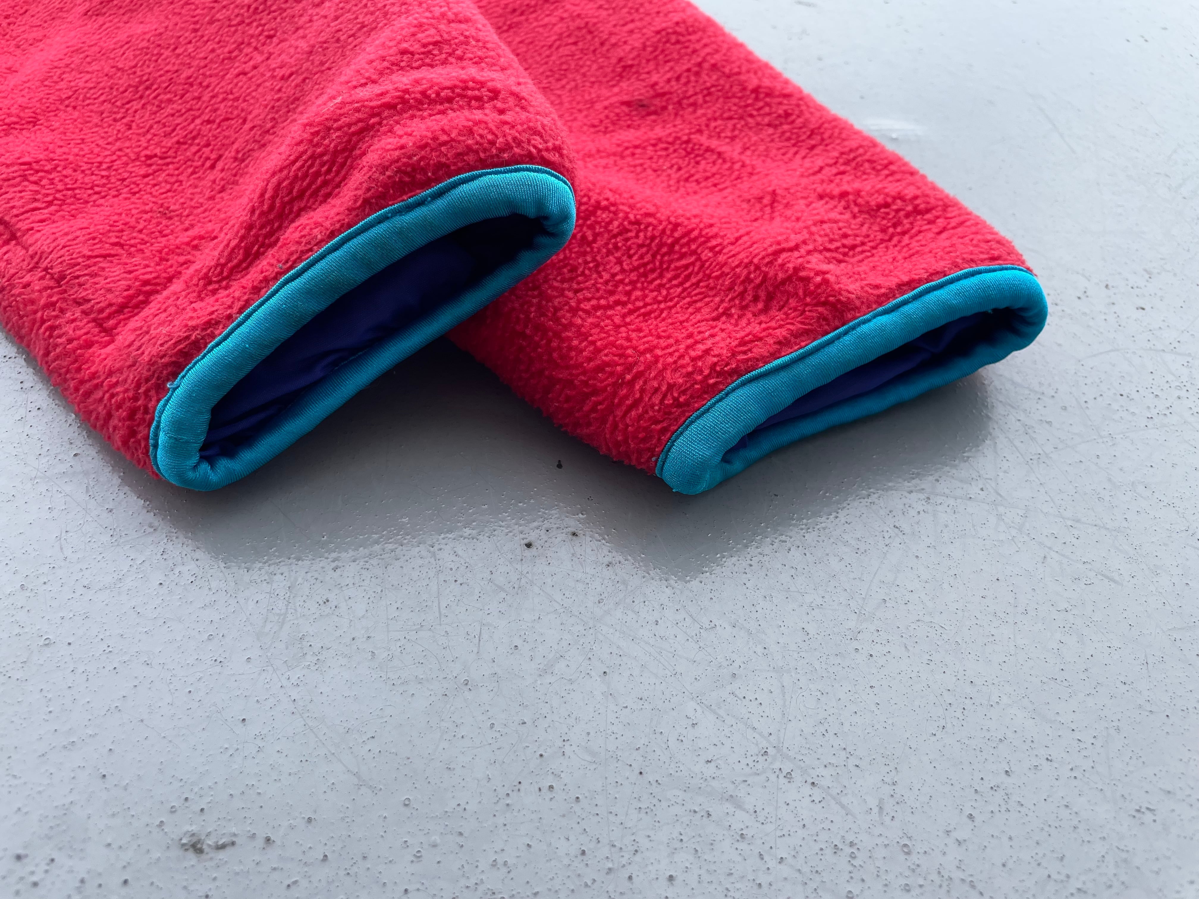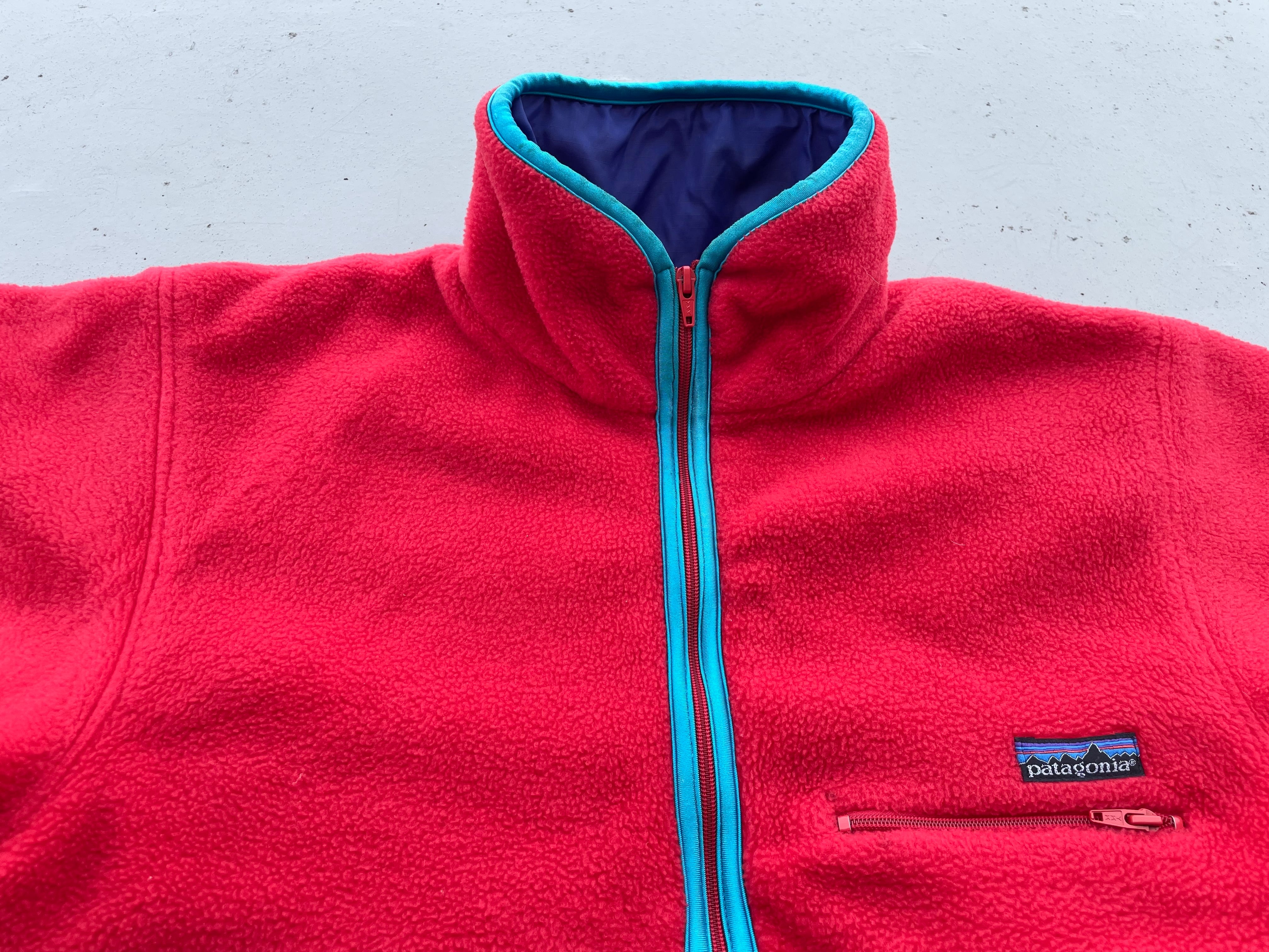 【商品詳細】PatagoniaのPullover Glissade Jacket。サイズはM。カラーはレッド×パープル。80年代製。こちらは人気モデルグリセードの初期タイプ。片面仕様や斜めに入る八の字ジップ、45Cファスナー仕様等、90年代以降のグリセードとディテールに違いがあります。所謂真っ赤ではなく白みのあるレッドカラーで着用しやすいかと。加えてターコイズブルーのパイピングと内側のエッグプラントなパープルカラー仕様でトータルクールな一着。古い個体ではありますがフリース地はフカルカで状態は良いです。まじで良いカラーですね〜