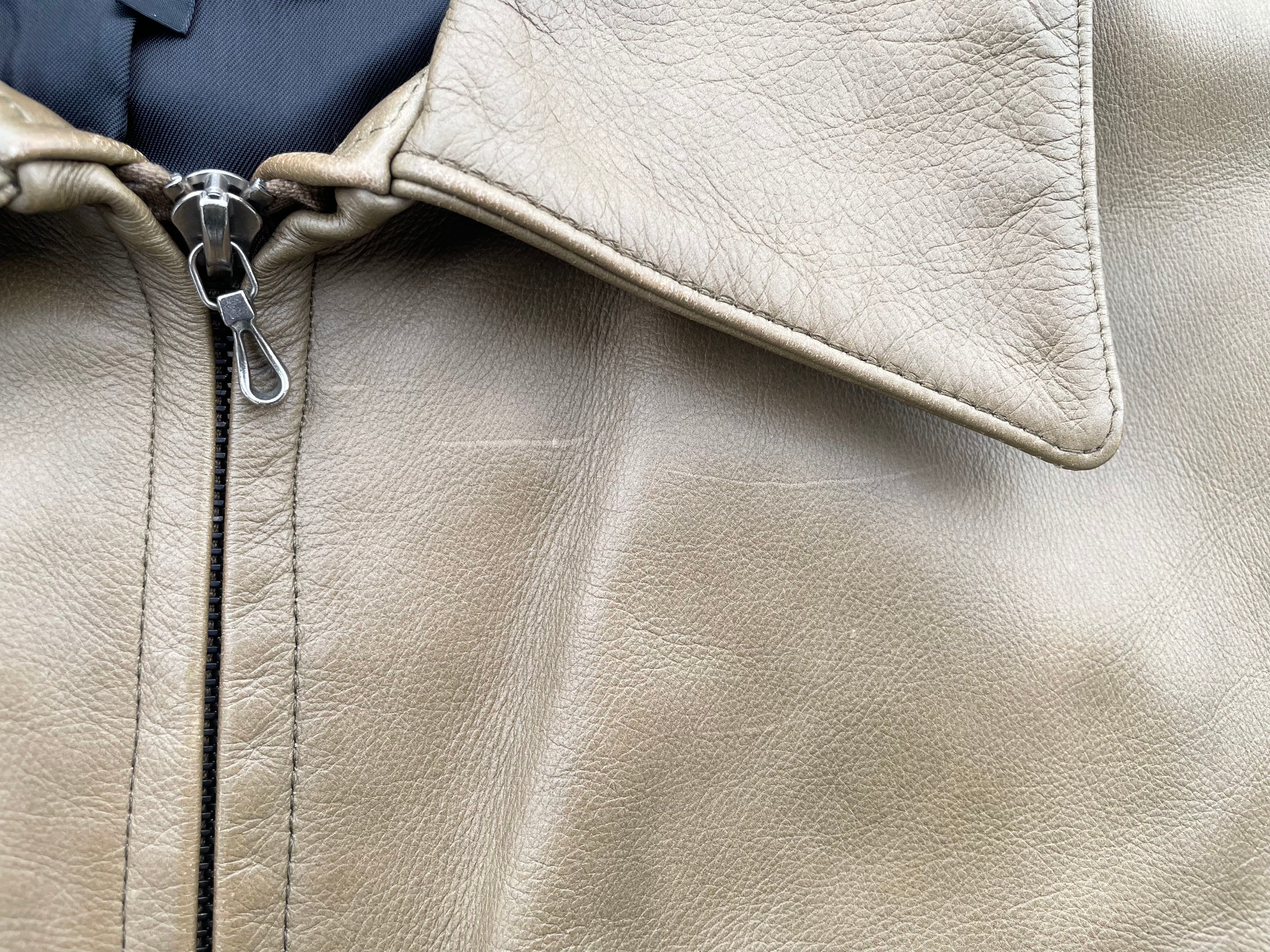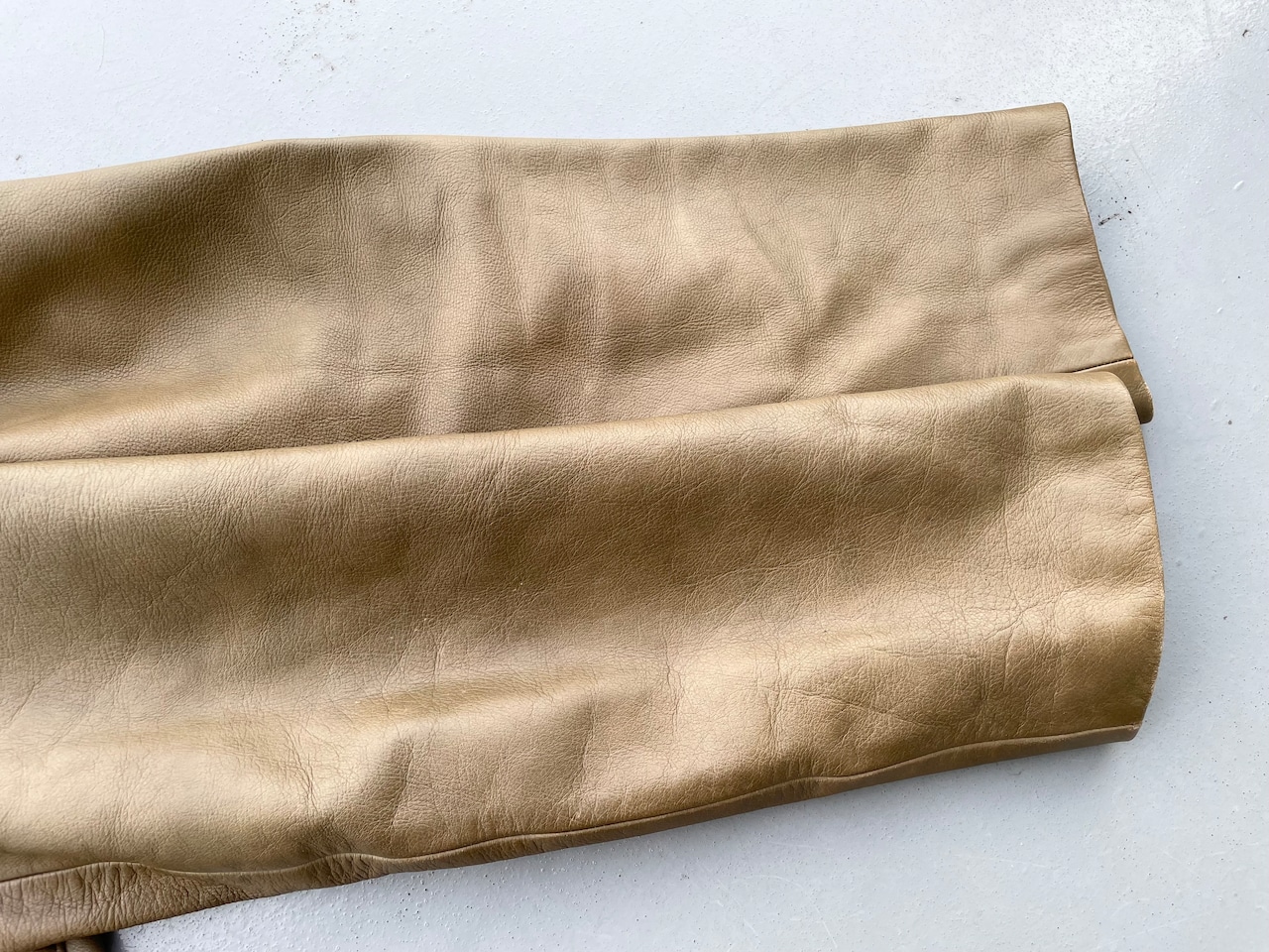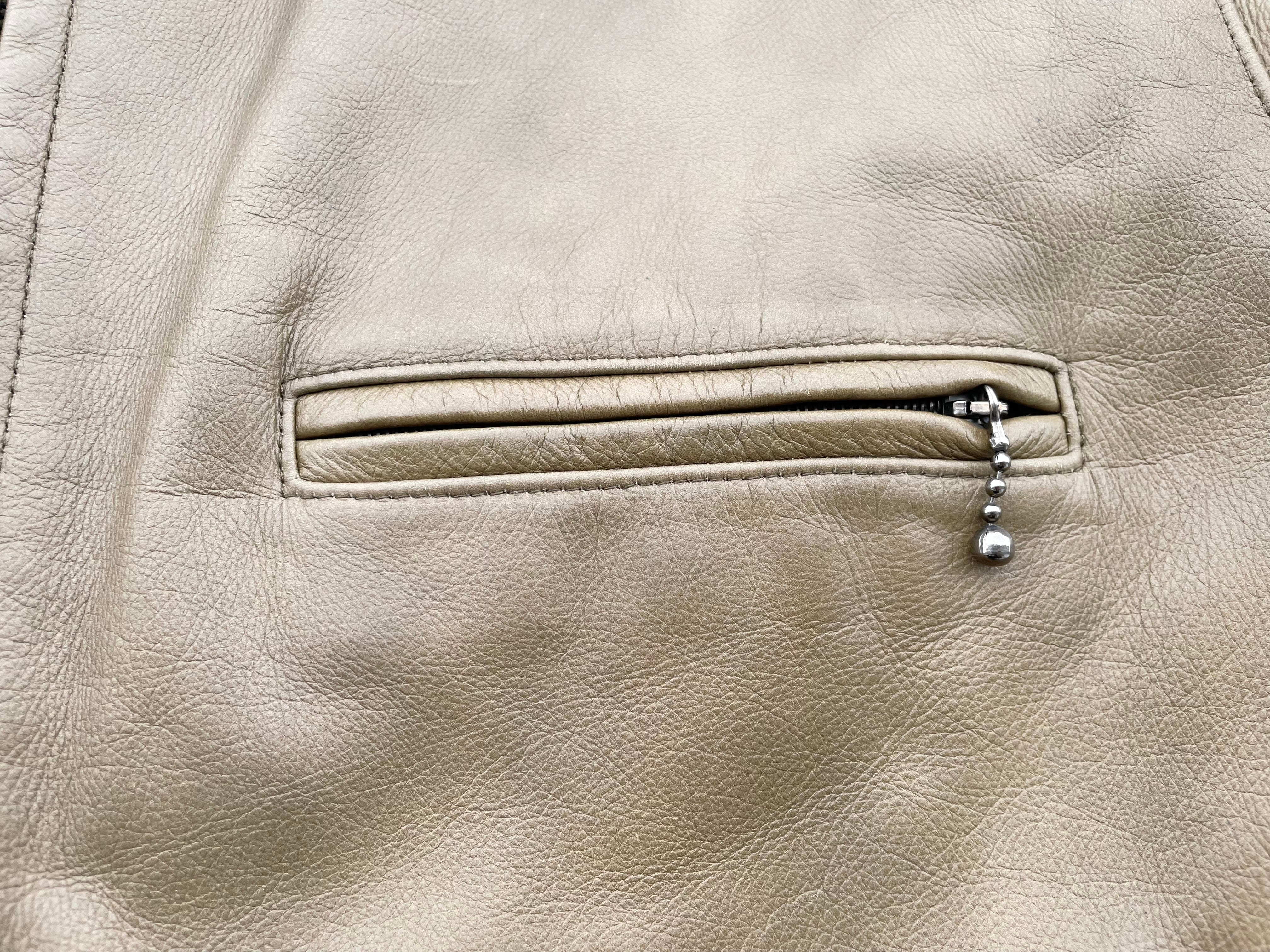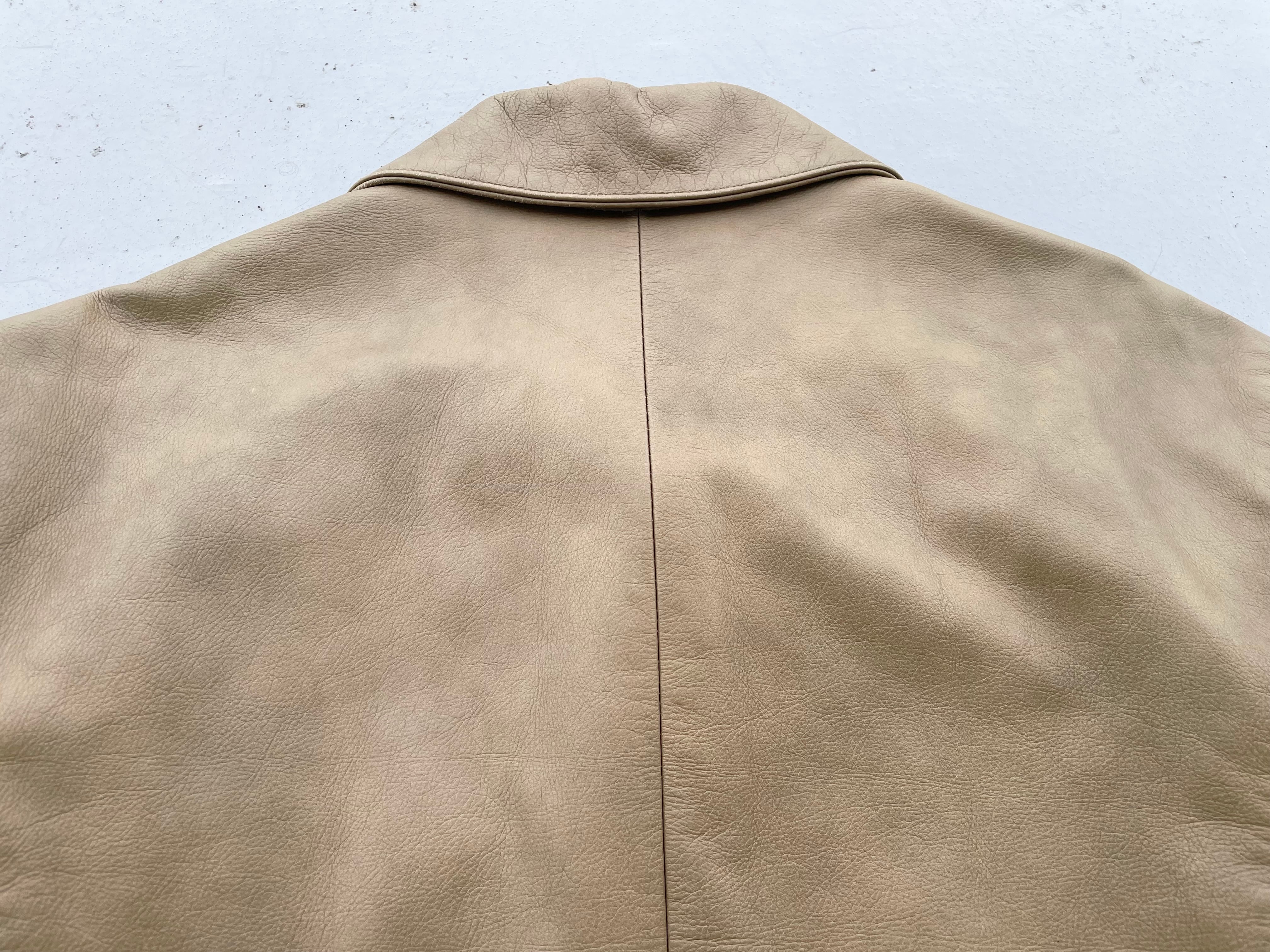【商品詳細】アーペーセーのレザージャケット。サイズはL。カラーは明るめのカーキ。90年代フランス製。サイドポケットと八の字ポケットのみつく無駄を削ぎ落としたアーバンなルック。ディテールは人気のシングル仕様。柔らかいシボ革を使用しており着用しやすいのもポイント高いです。アーペーセーでは珍しい大きめLサイズ。加えて嬉しいフランス製。良い意味でアーペーセーぽくないのが良いですね。持ってる人少ないと思います。