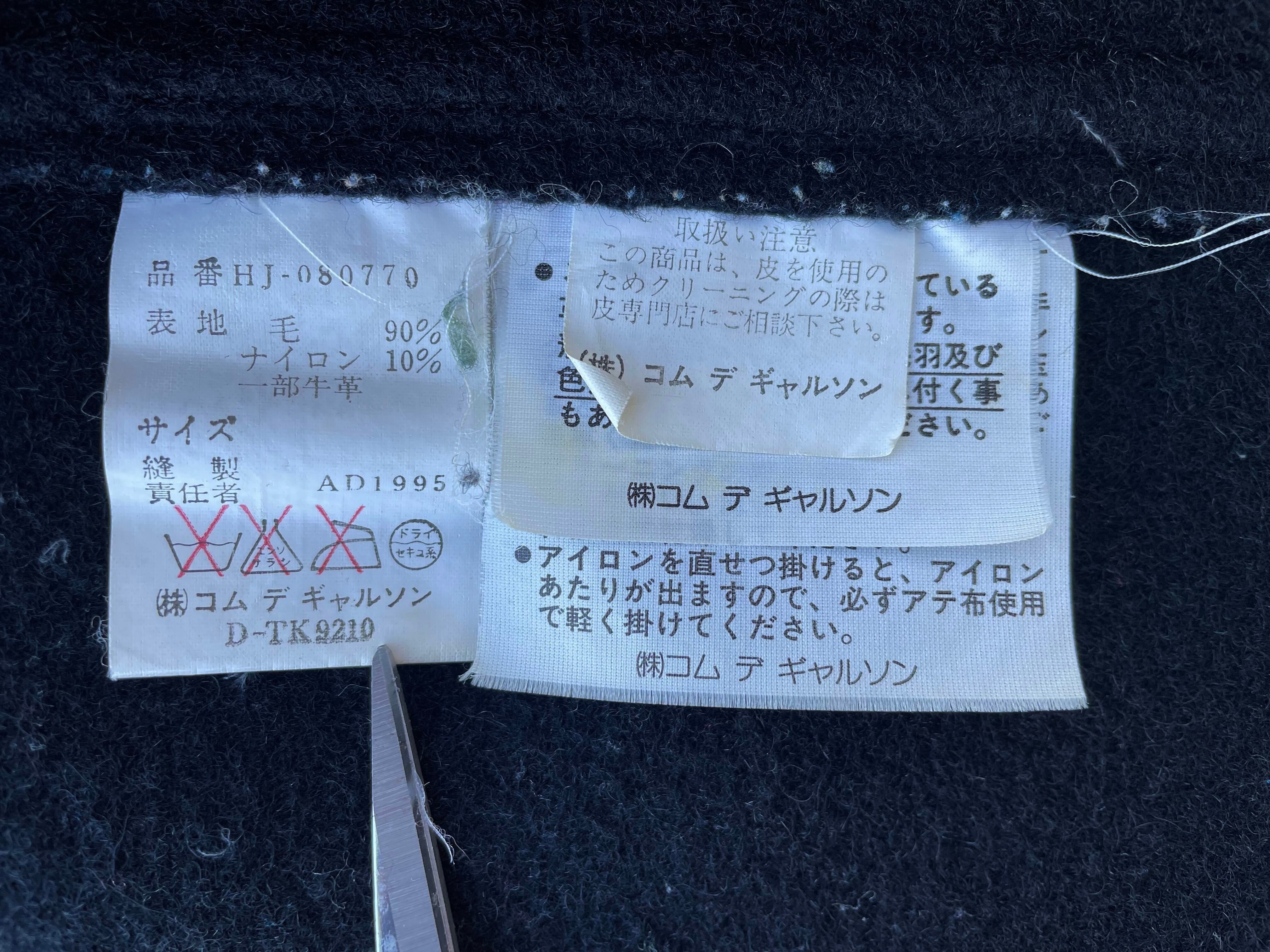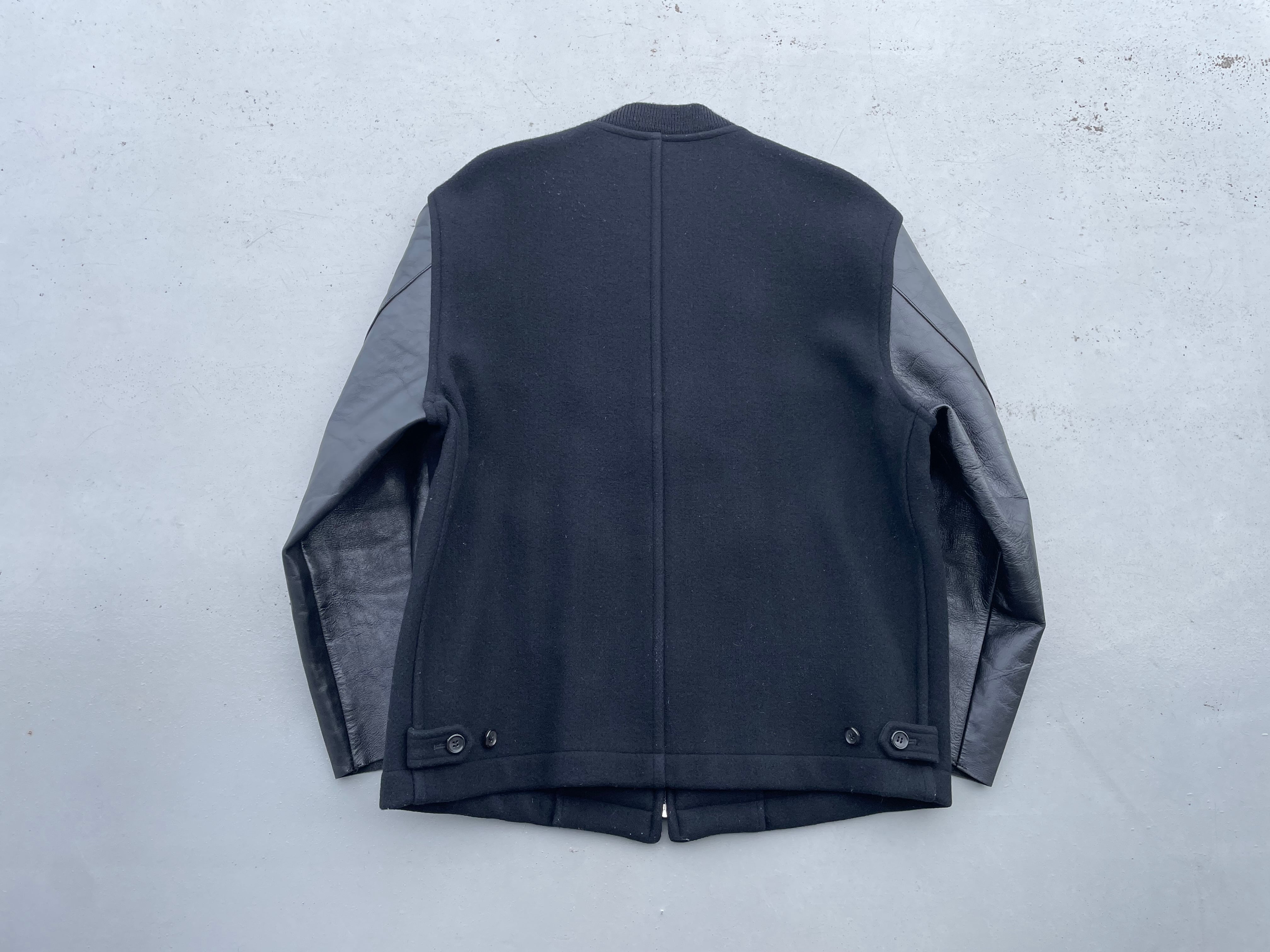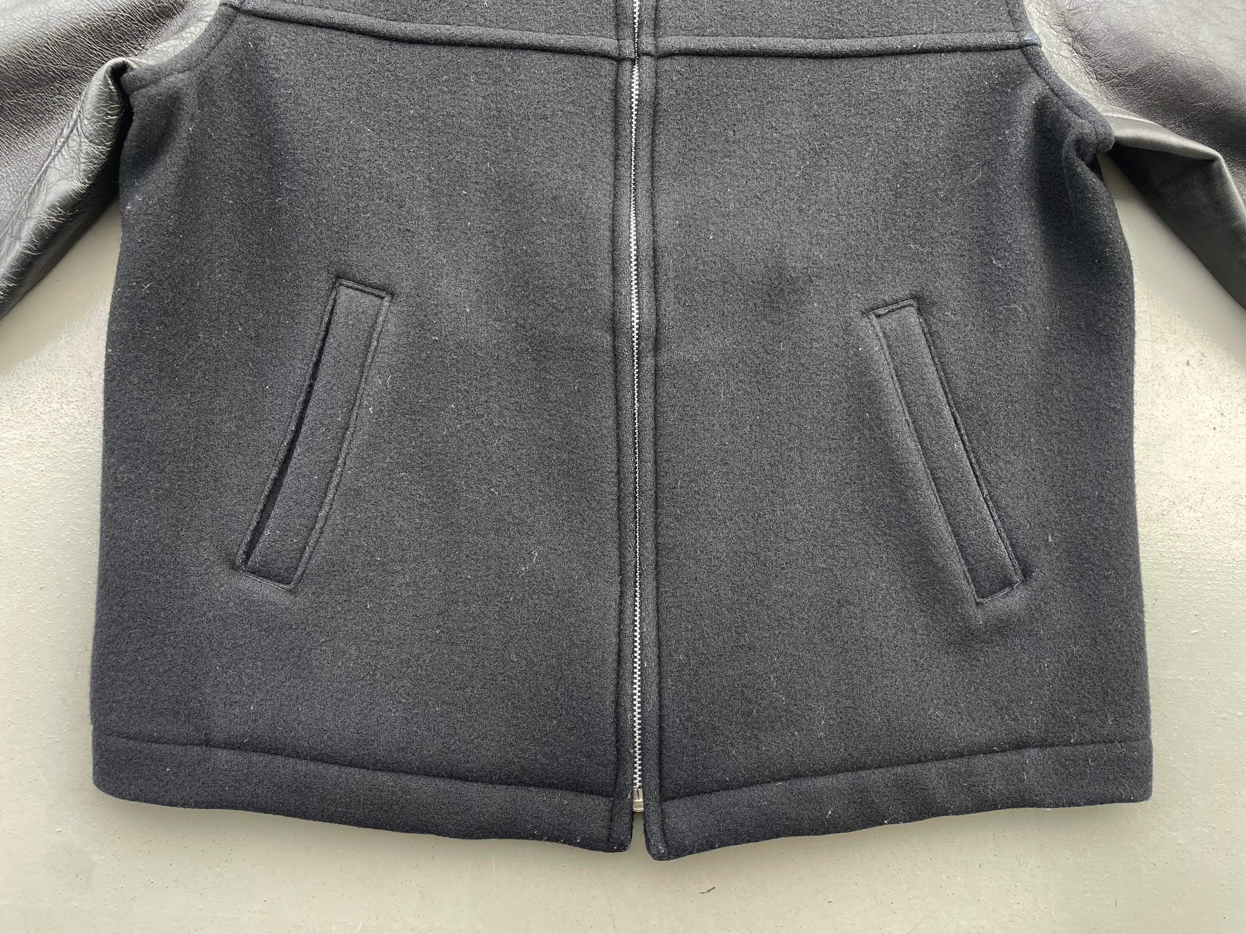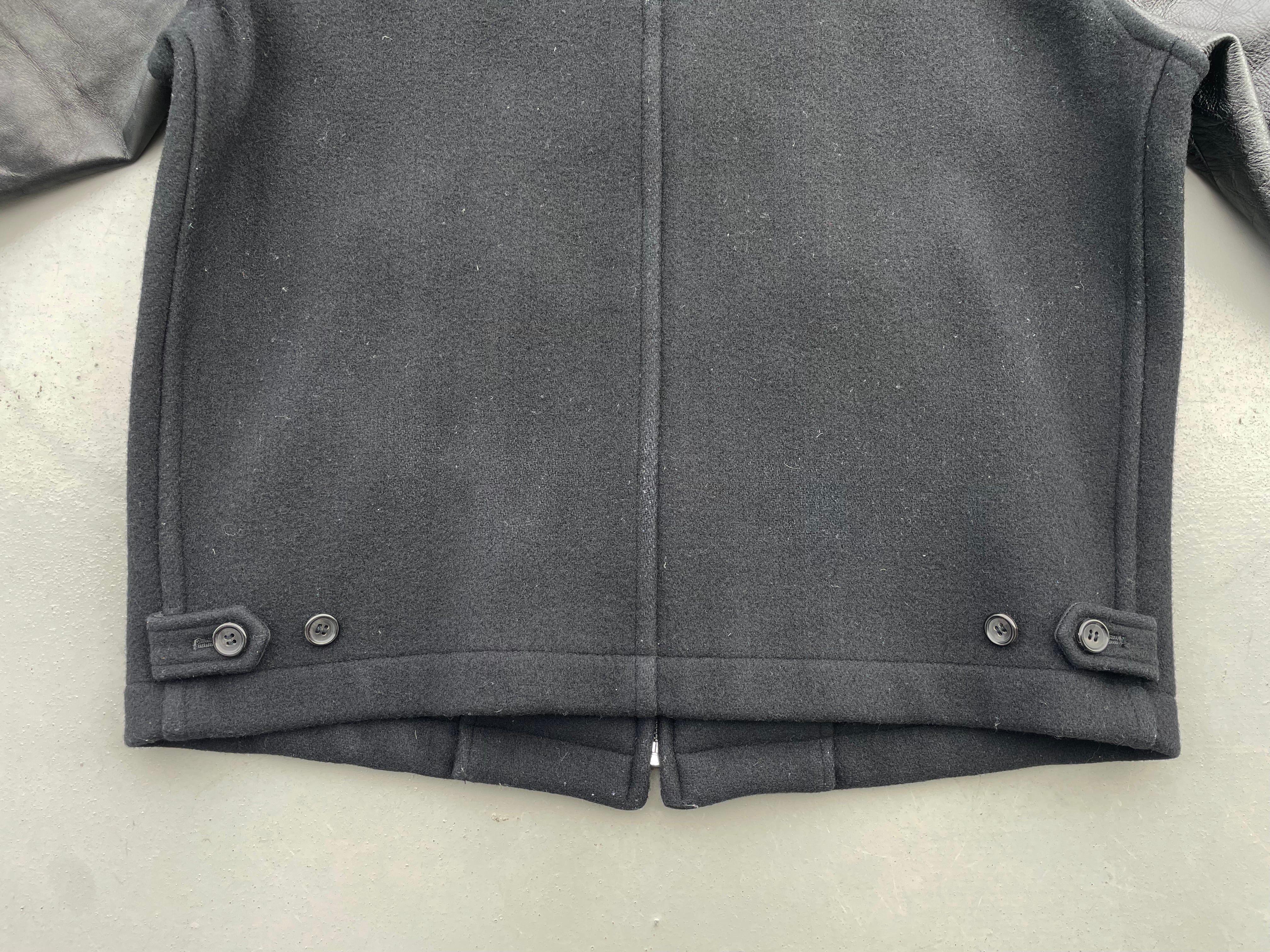 【商品詳細】コムデギャルソンのボンバージャケット。サイズはM。カラーはブラック。95年代日本製。ボディはウール、スリーブはレザー仕様のギャルソンらしい変わり種ジャケット。オールブラック・無地仕様でモード過ぎない佇まいで田中オム期らしいアイテム。古い個体ですが状態も良いと思います。