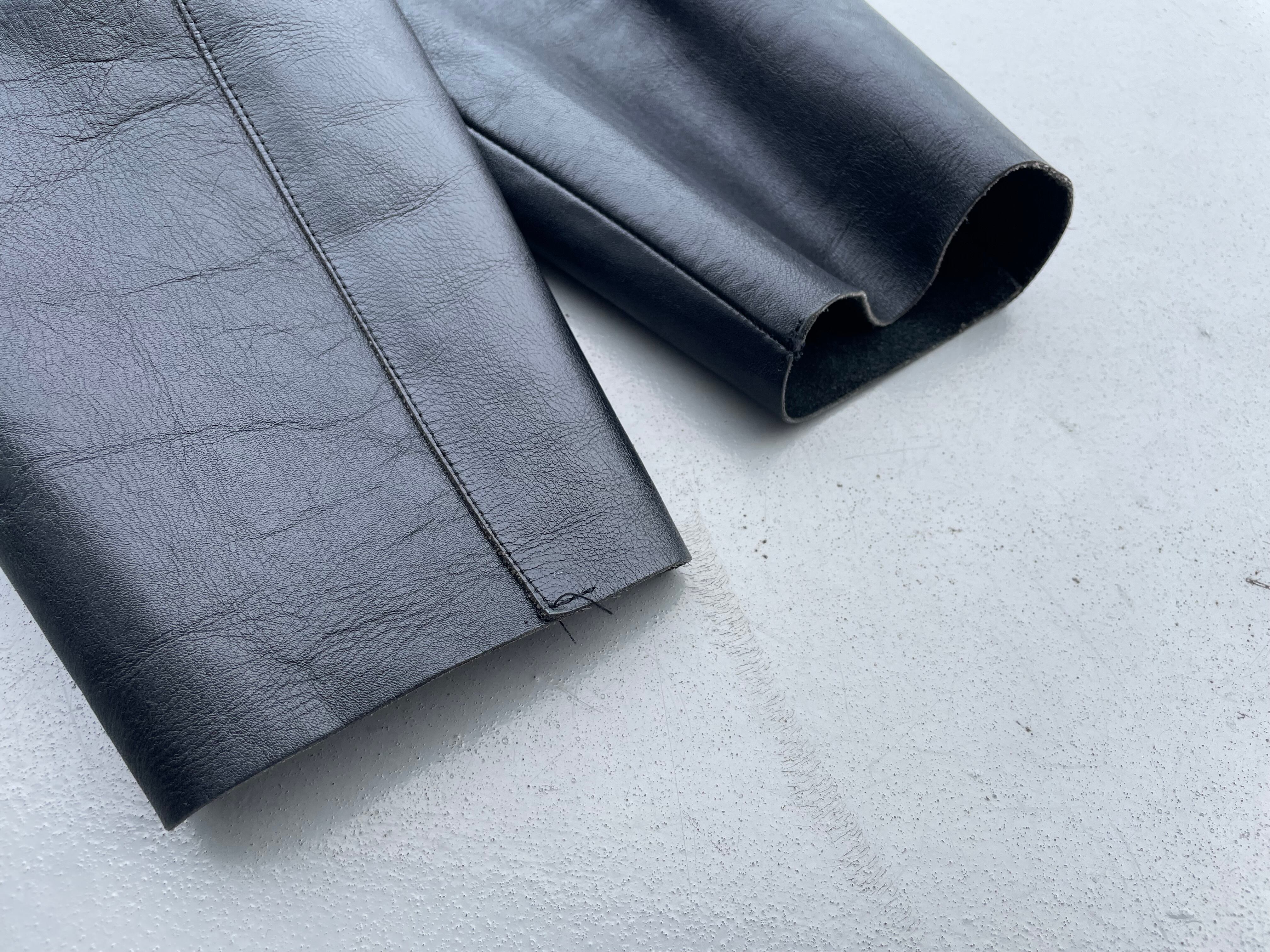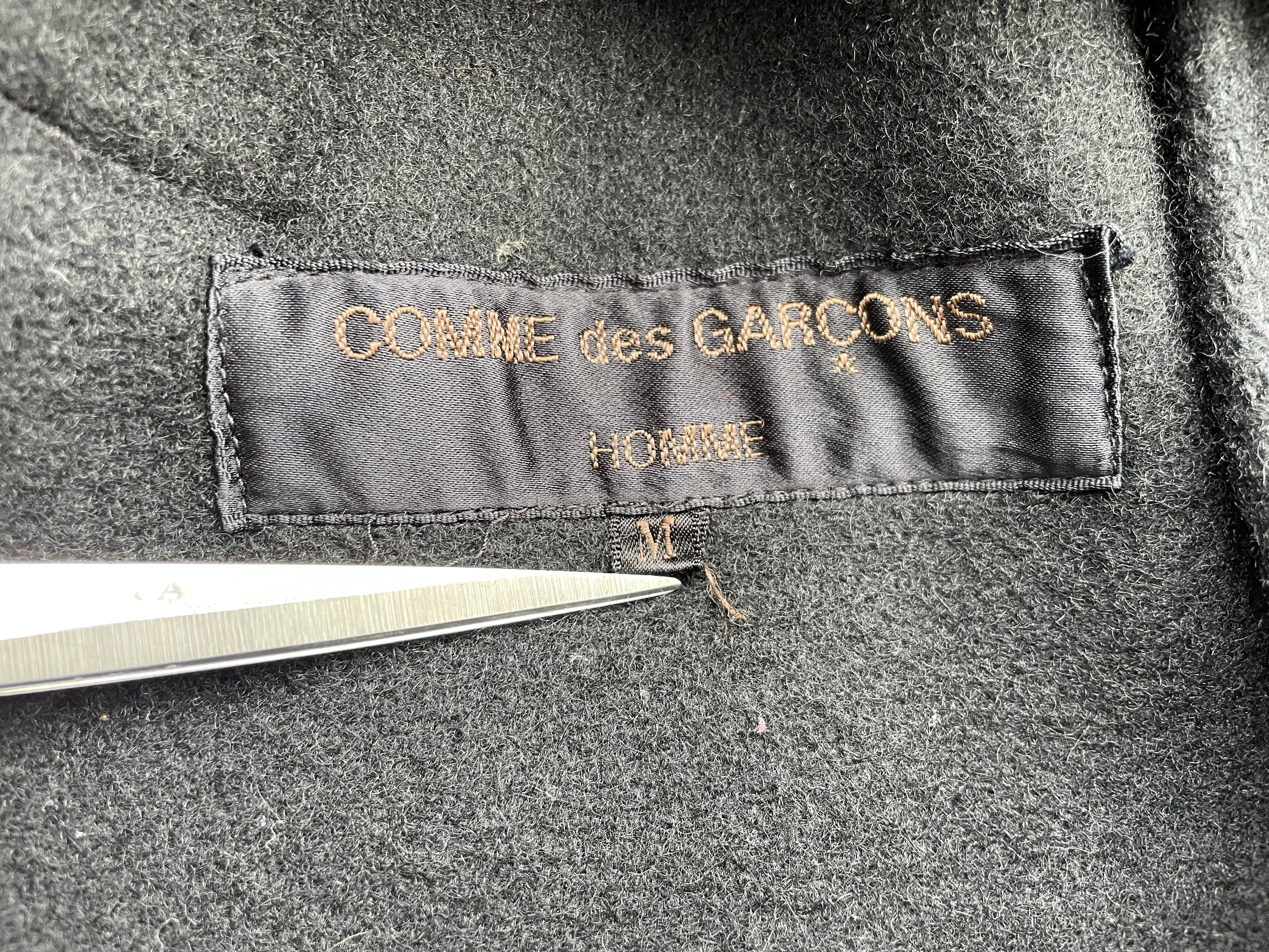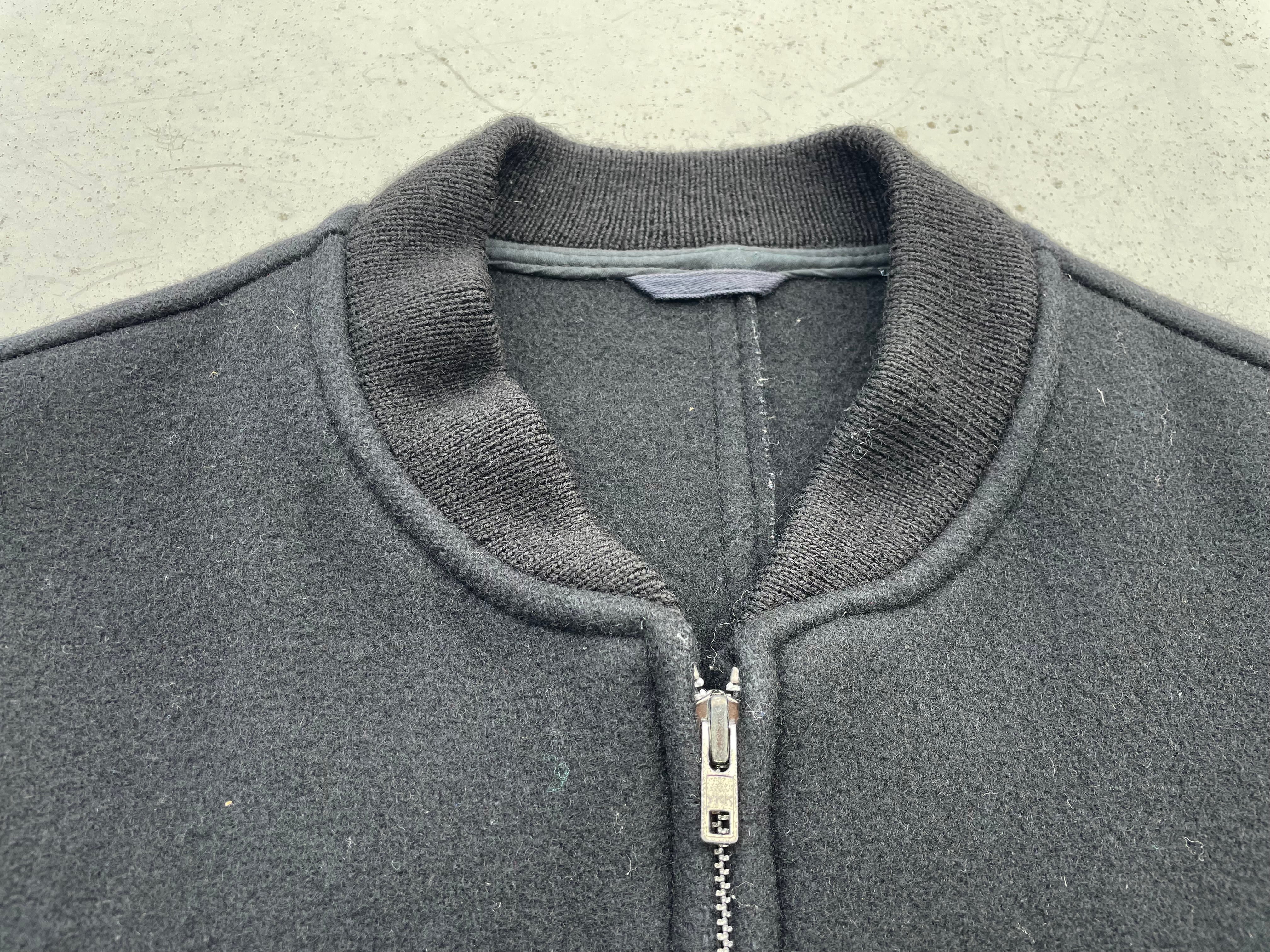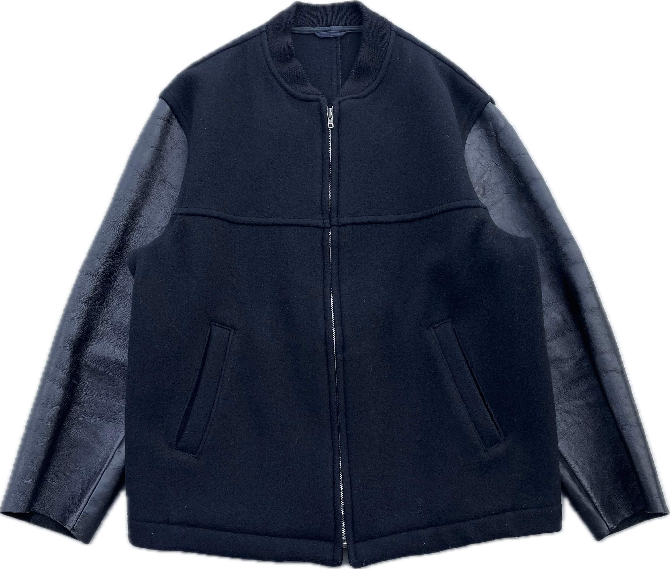 【商品詳細】コムデギャルソンのボンバージャケット。サイズはM。カラーはブラック。95年代日本製。ボディはウール、スリーブはレザー仕様のギャルソンらしい変わり種ジャケット。オールブラック・無地仕様でモード過ぎない佇まいで田中オム期らしいアイテム。古い個体ですが状態も良いと思います。