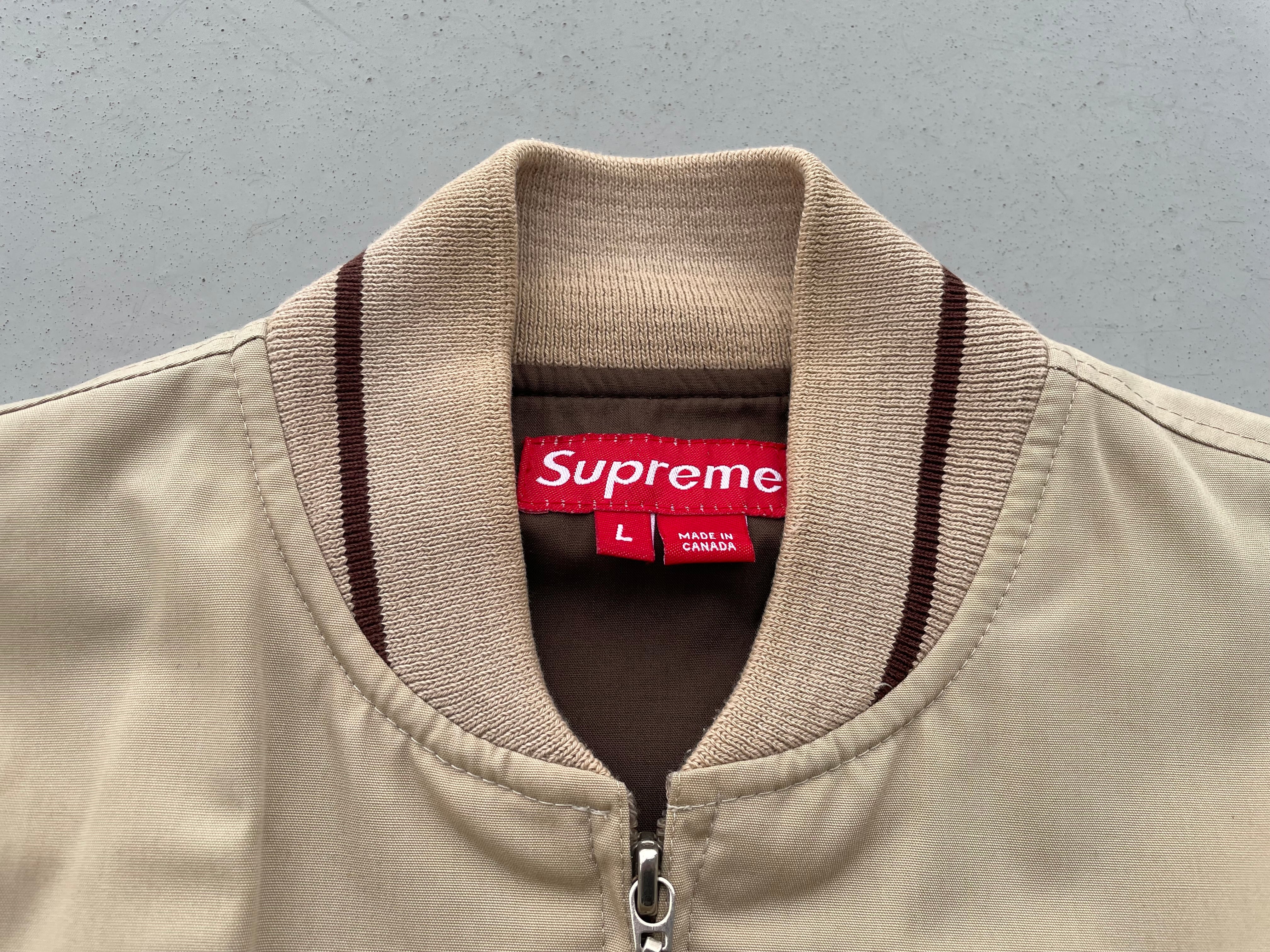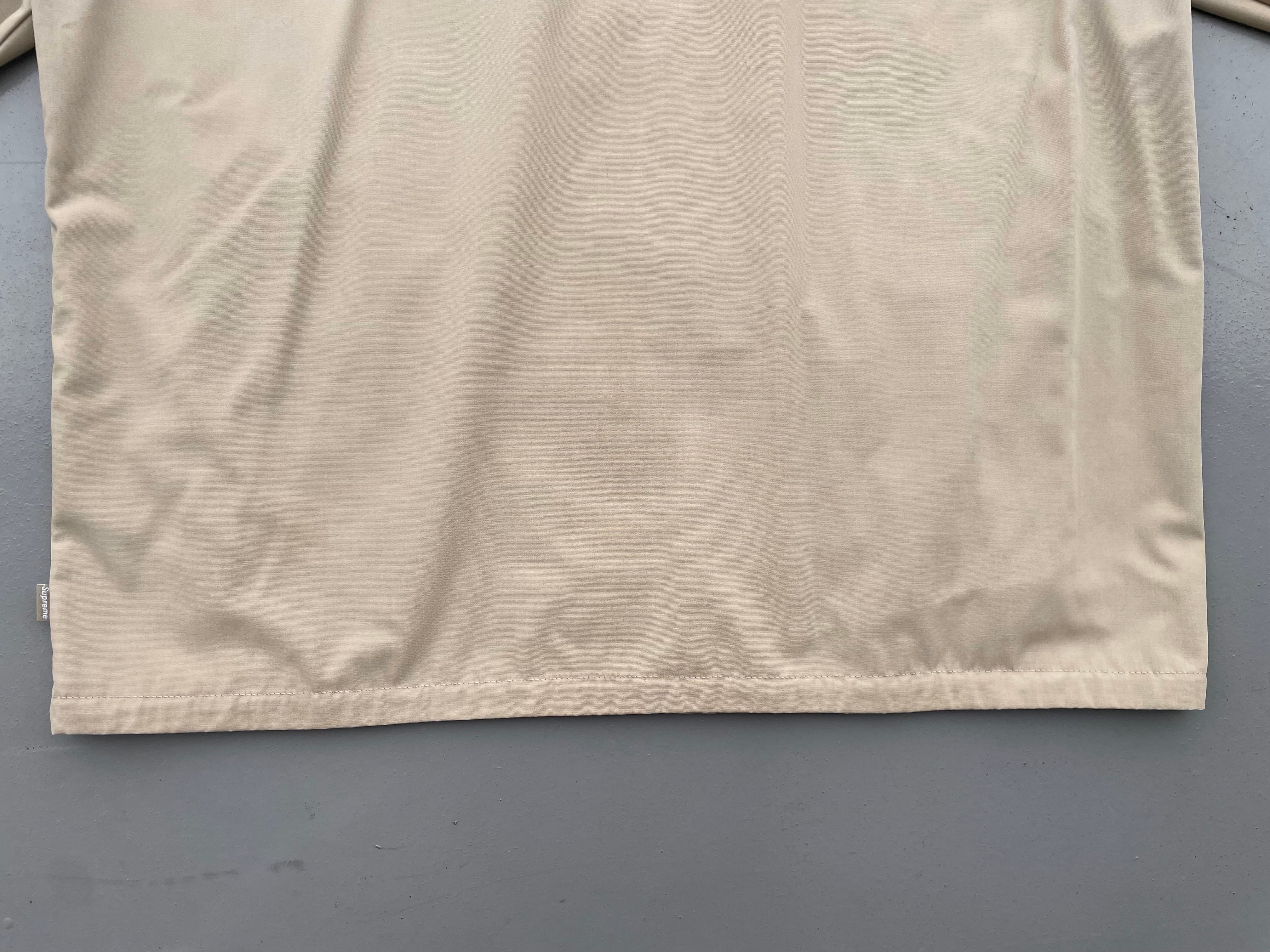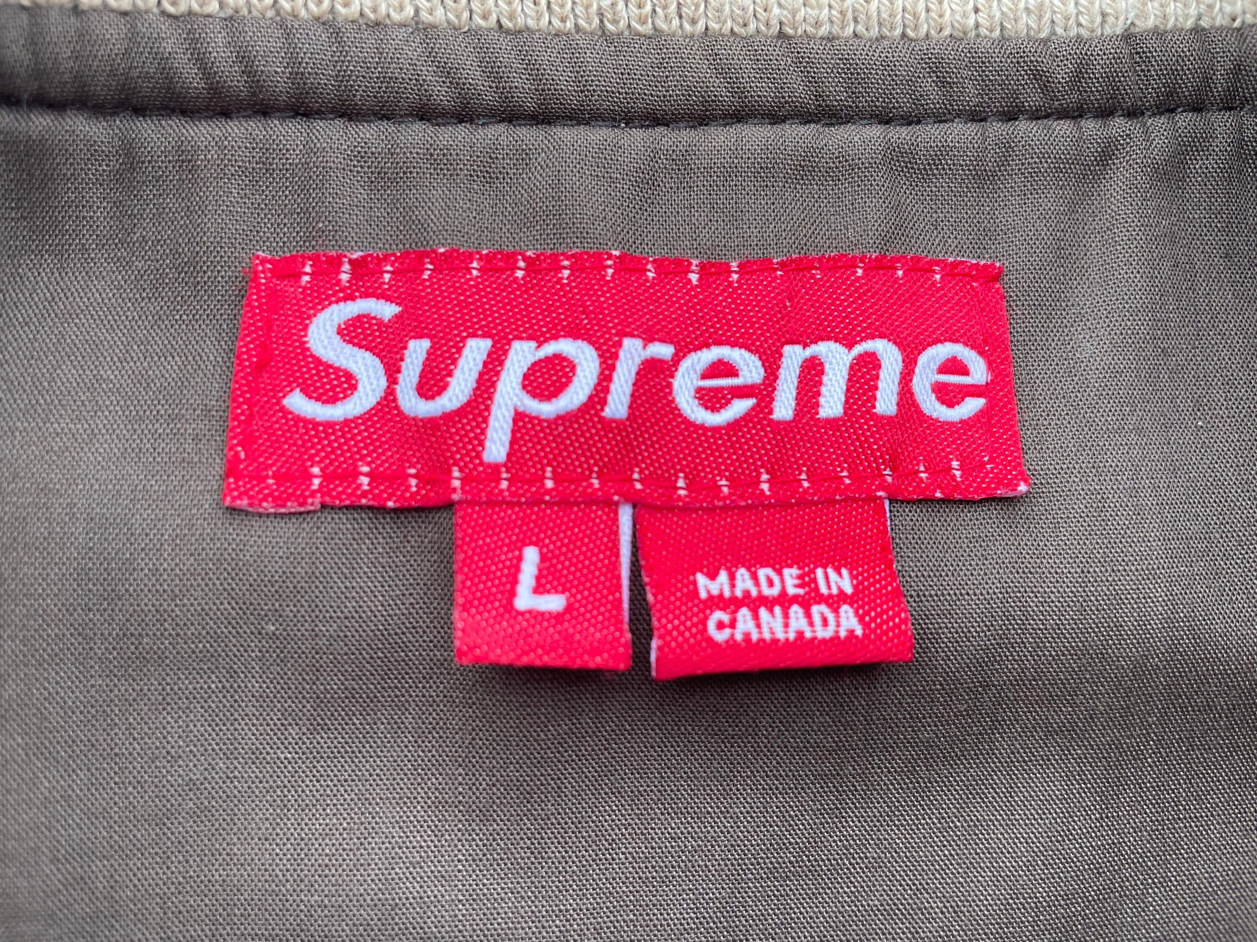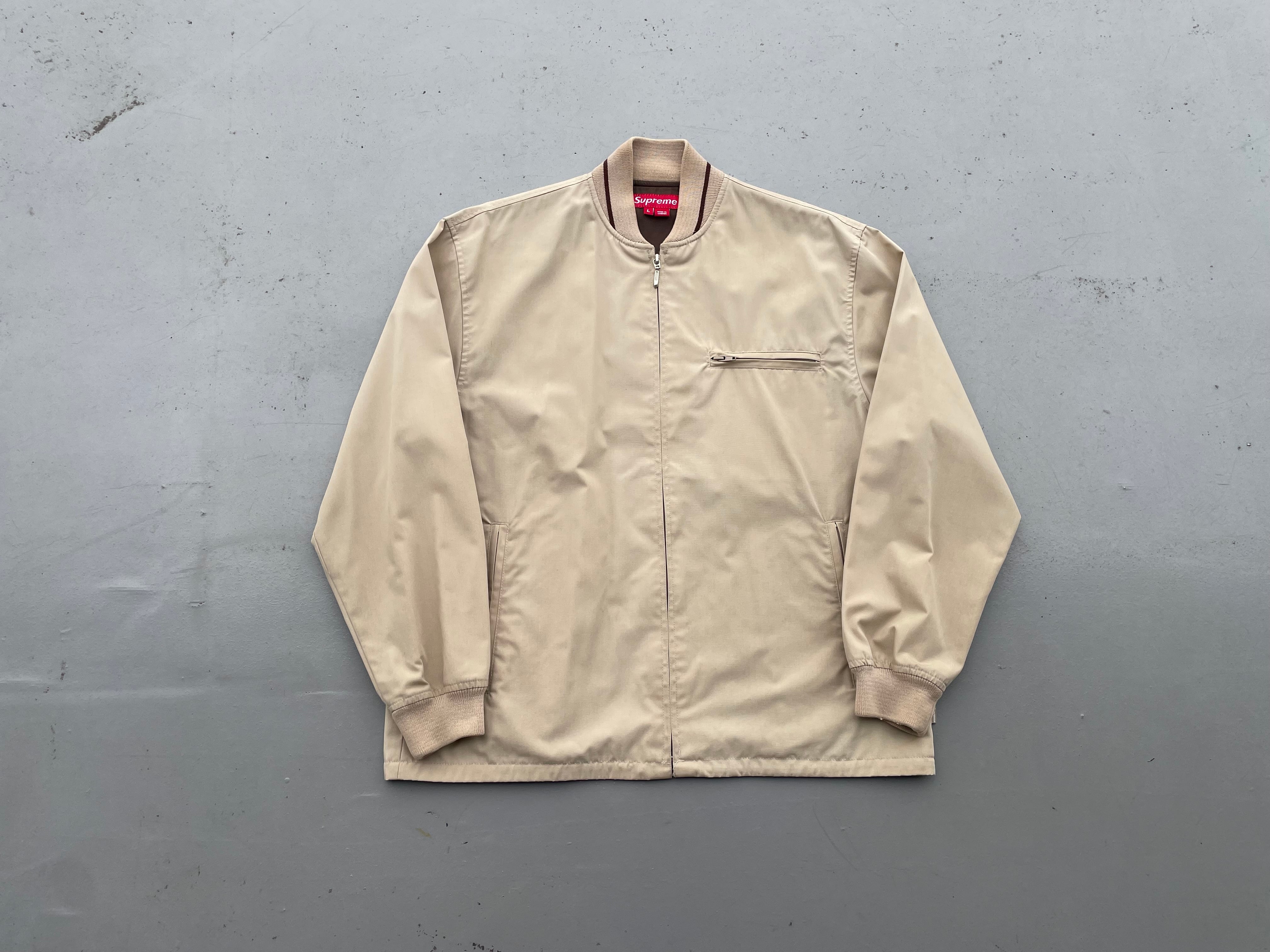 【商品詳細】シュプリームのダービージャケット。サイズはL。カラーはベージュ。90-00年代カナダ製。珍しいオールドシュプリームのダービージャケット。コットンポリ混のしっとりした肌触りの上品な仕上がり。裾ドローコード付なので縛って着用も可能です。身幅もたっぷりあるので着回し力高めの一着。