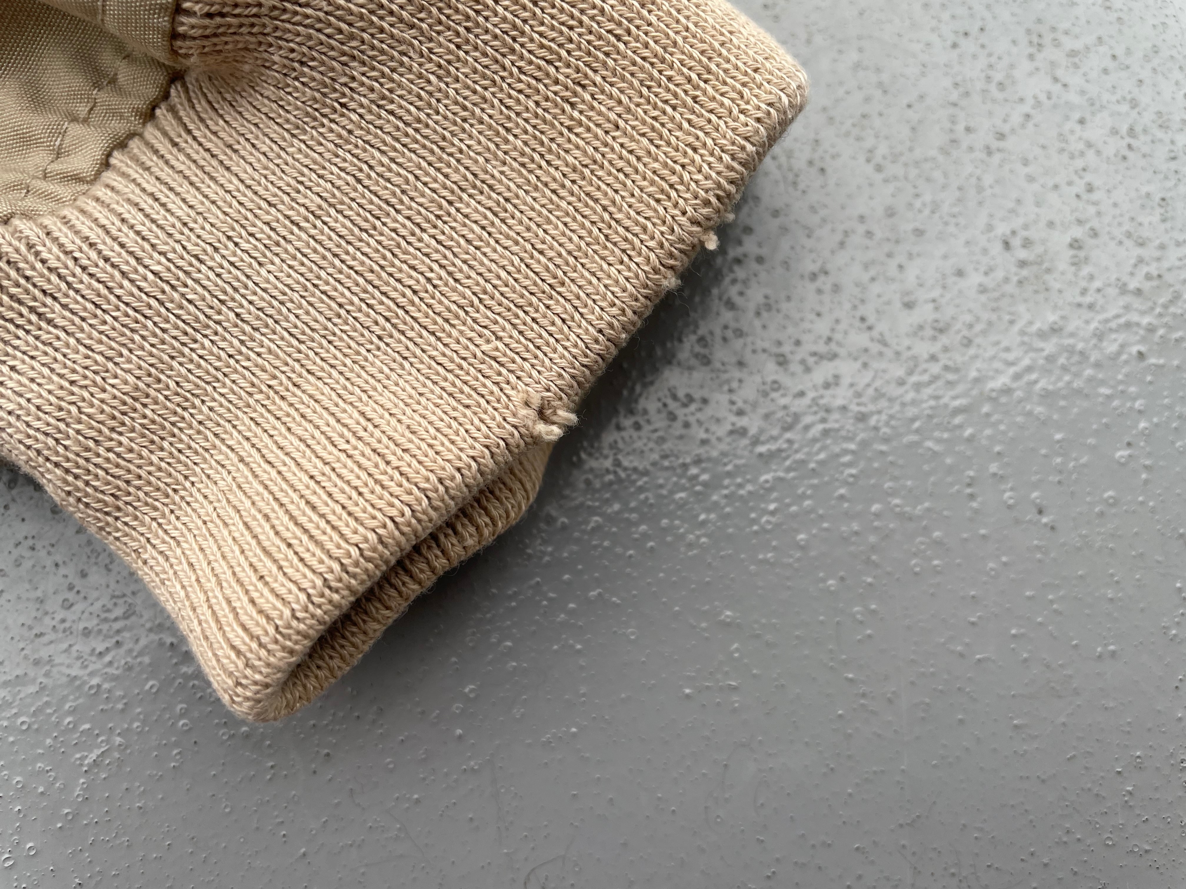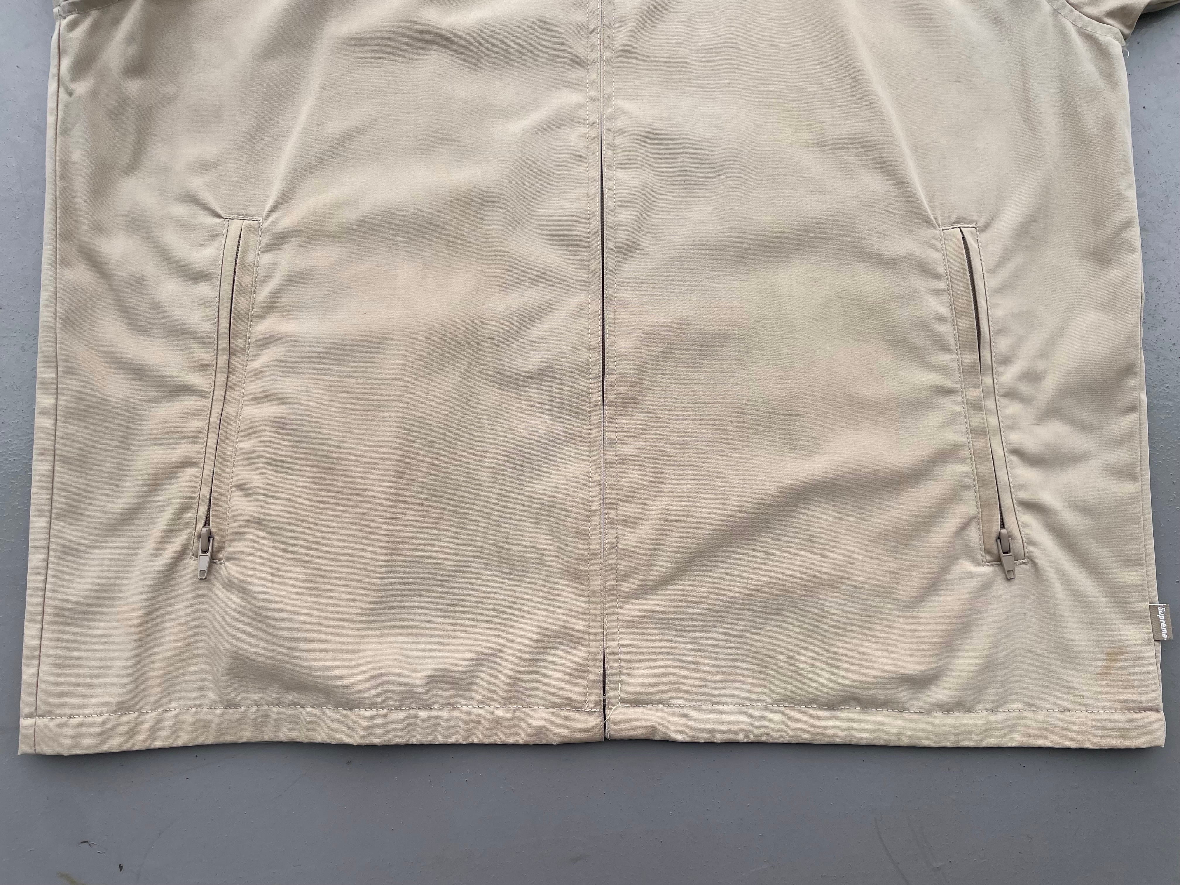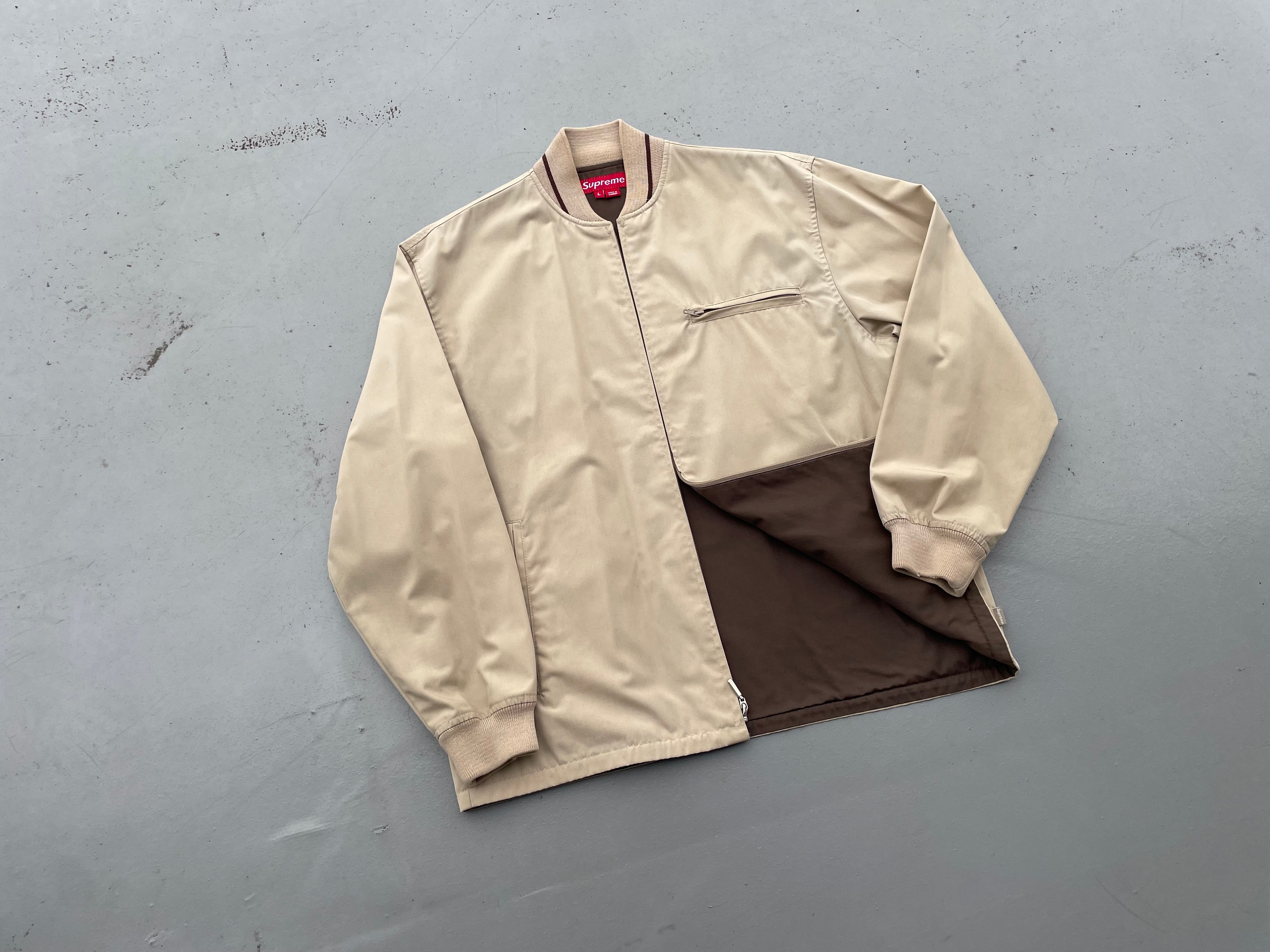 【商品詳細】シュプリームのダービージャケット。サイズはL。カラーはベージュ。90-00年代カナダ製。珍しいオールドシュプリームのダービージャケット。コットンポリ混のしっとりした肌触りの上品な仕上がり。裾ドローコード付なので縛って着用も可能です。身幅もたっぷりあるので着回し力高めの一着。