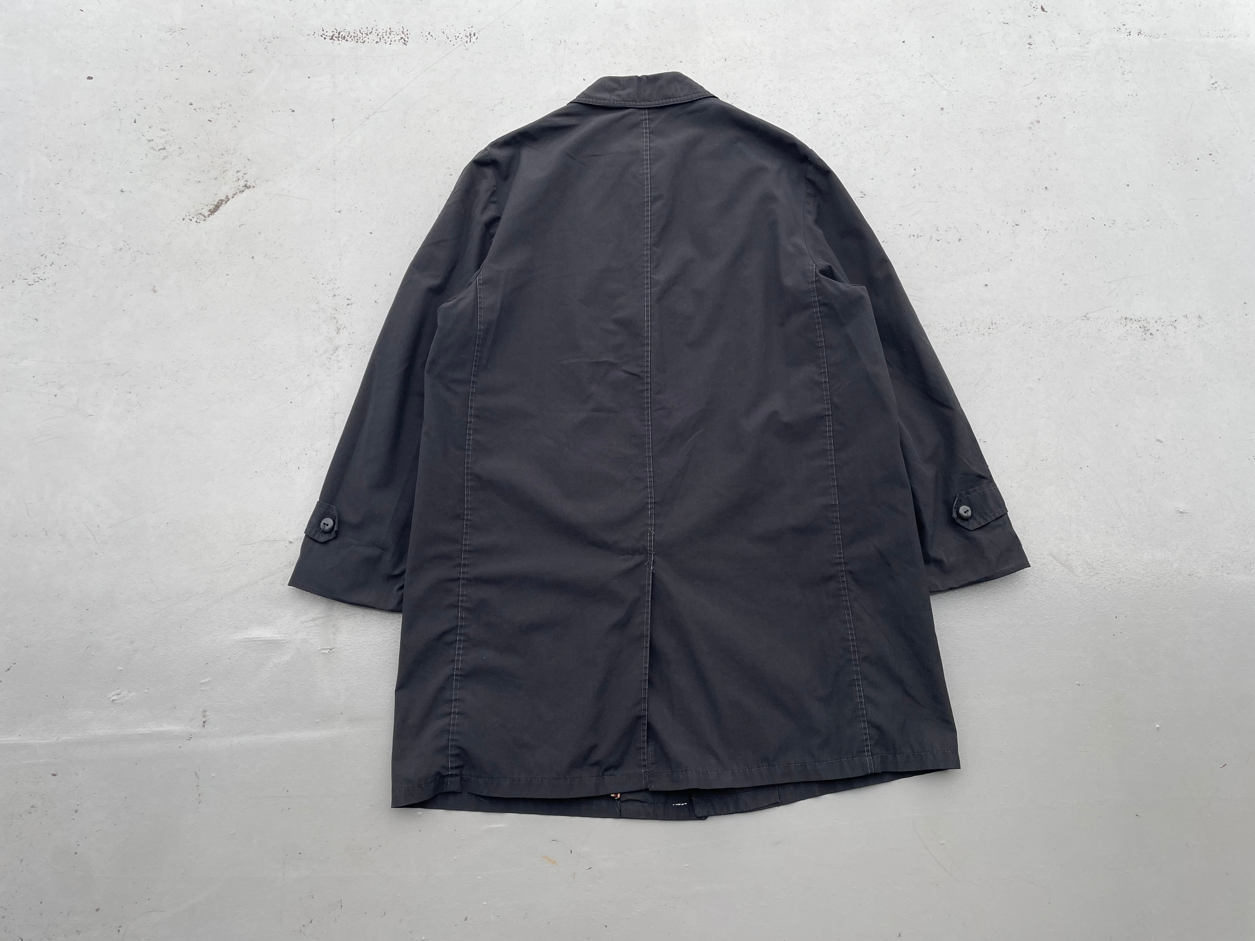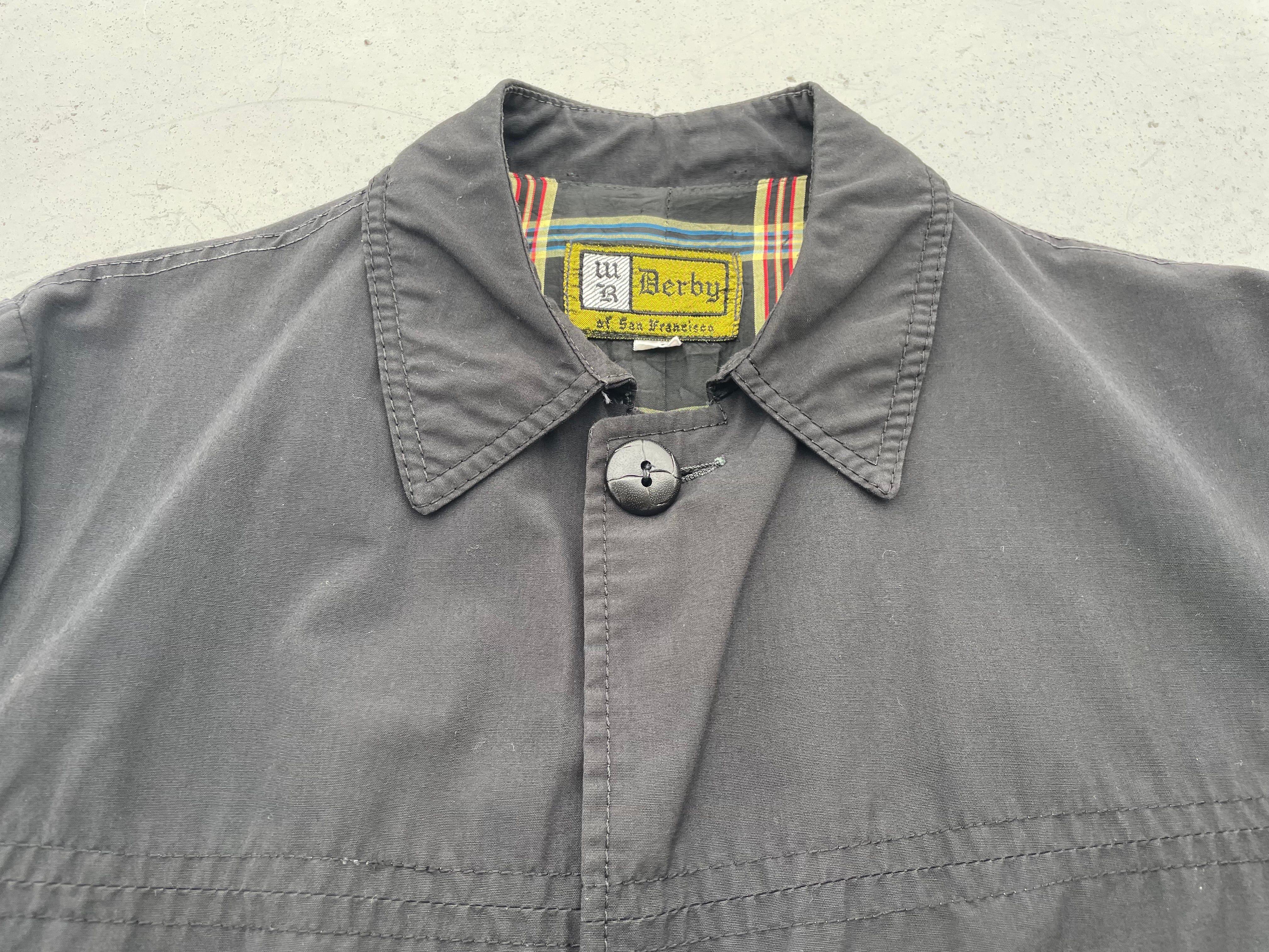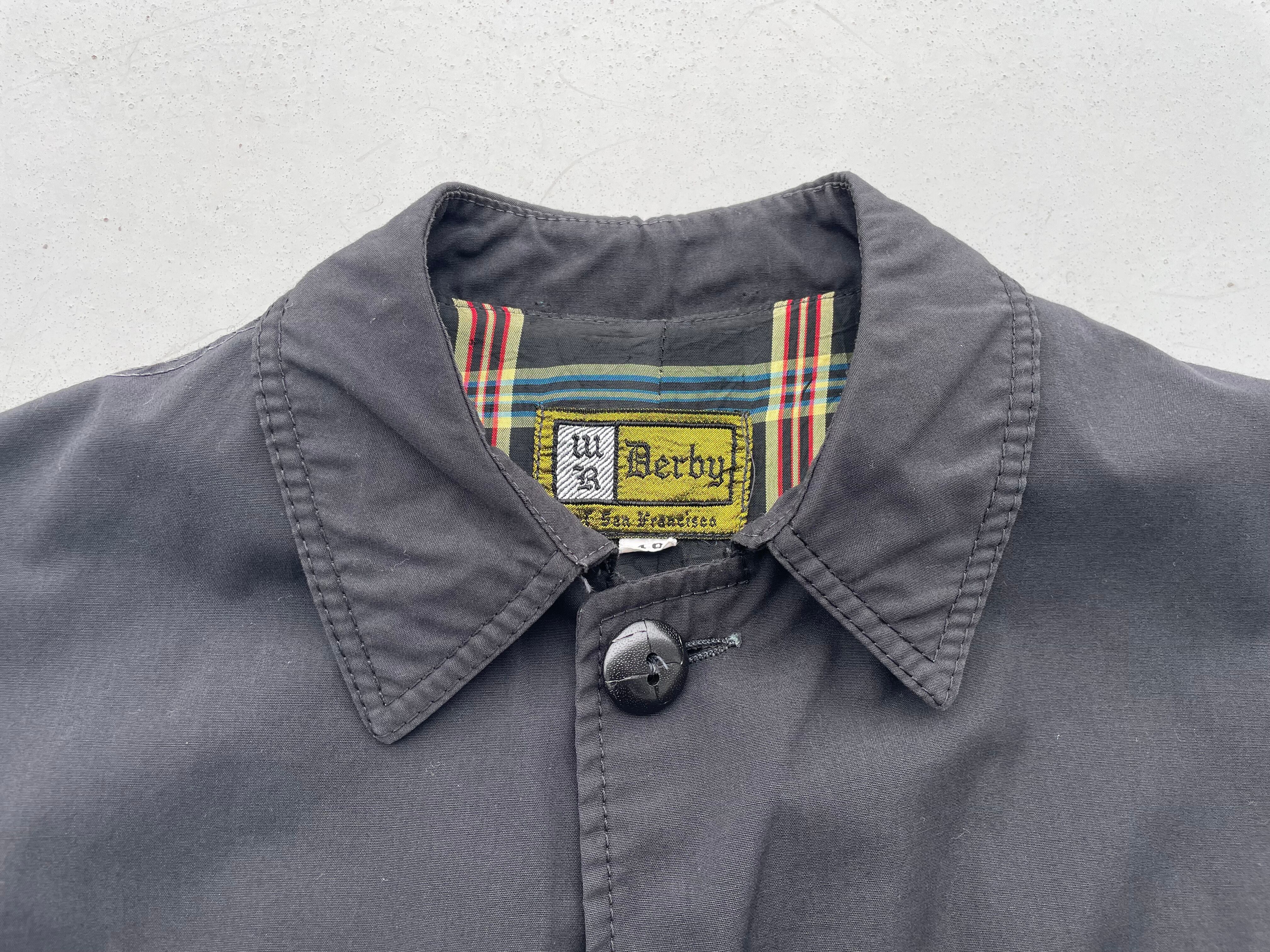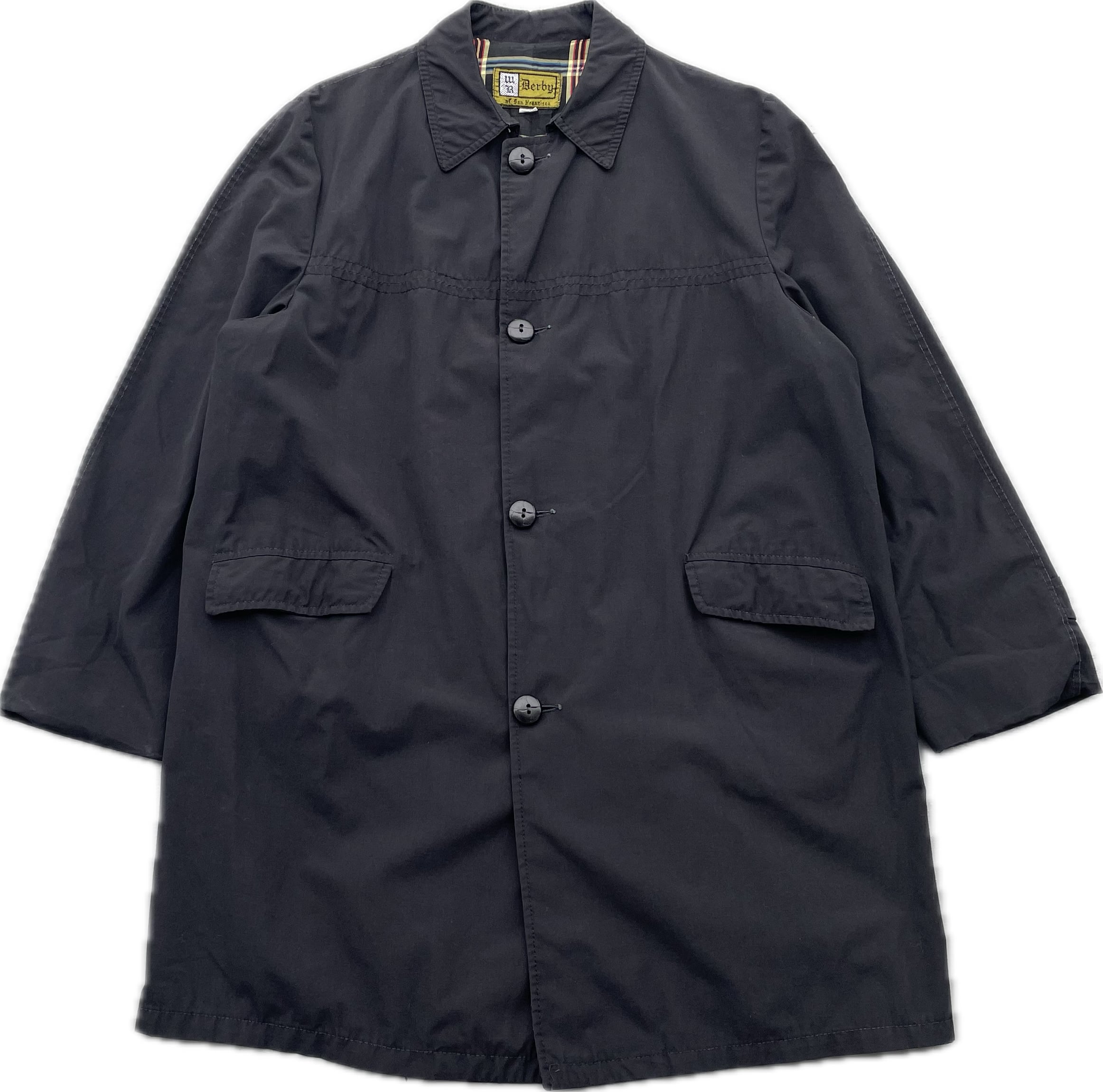 【商品詳細】ダービーオブサンフランシスコのバルマカーンコート。サイズは40。カラーはブラック。60年代頃製オールドイングリッシュタグ。同ブランドでは珍しいバルマカーンコート。セットインスリーブでシルエットが綺麗な一着。コットンポリのようなシャリ感のある生地でこれからの季節活躍しそうです。肩幅若干狭いですが身幅たっぷりあるので問題なく着込めます。良い意味で裏切ってきている一着かと。2次流通でもあまり出ない系かと思います。