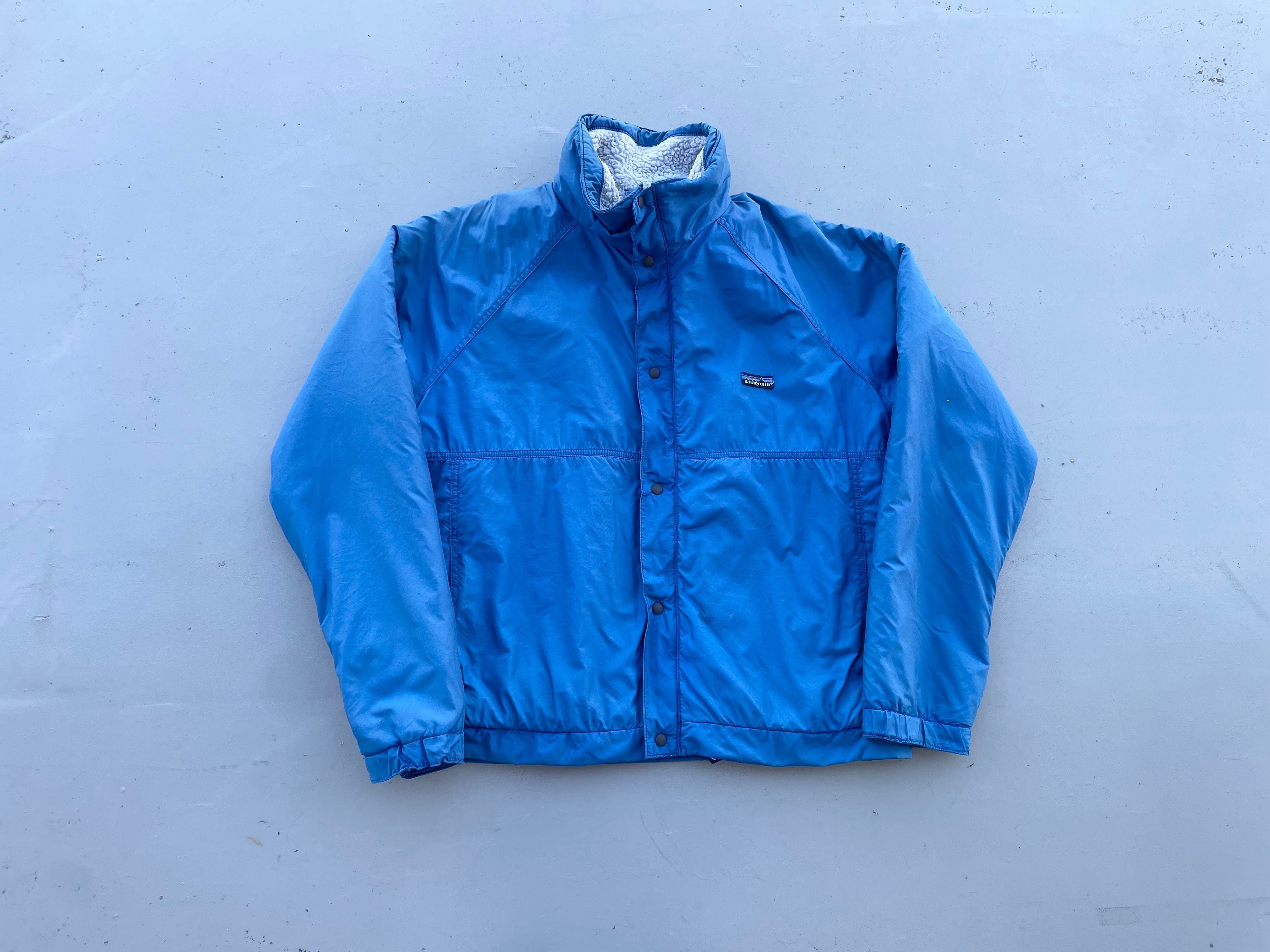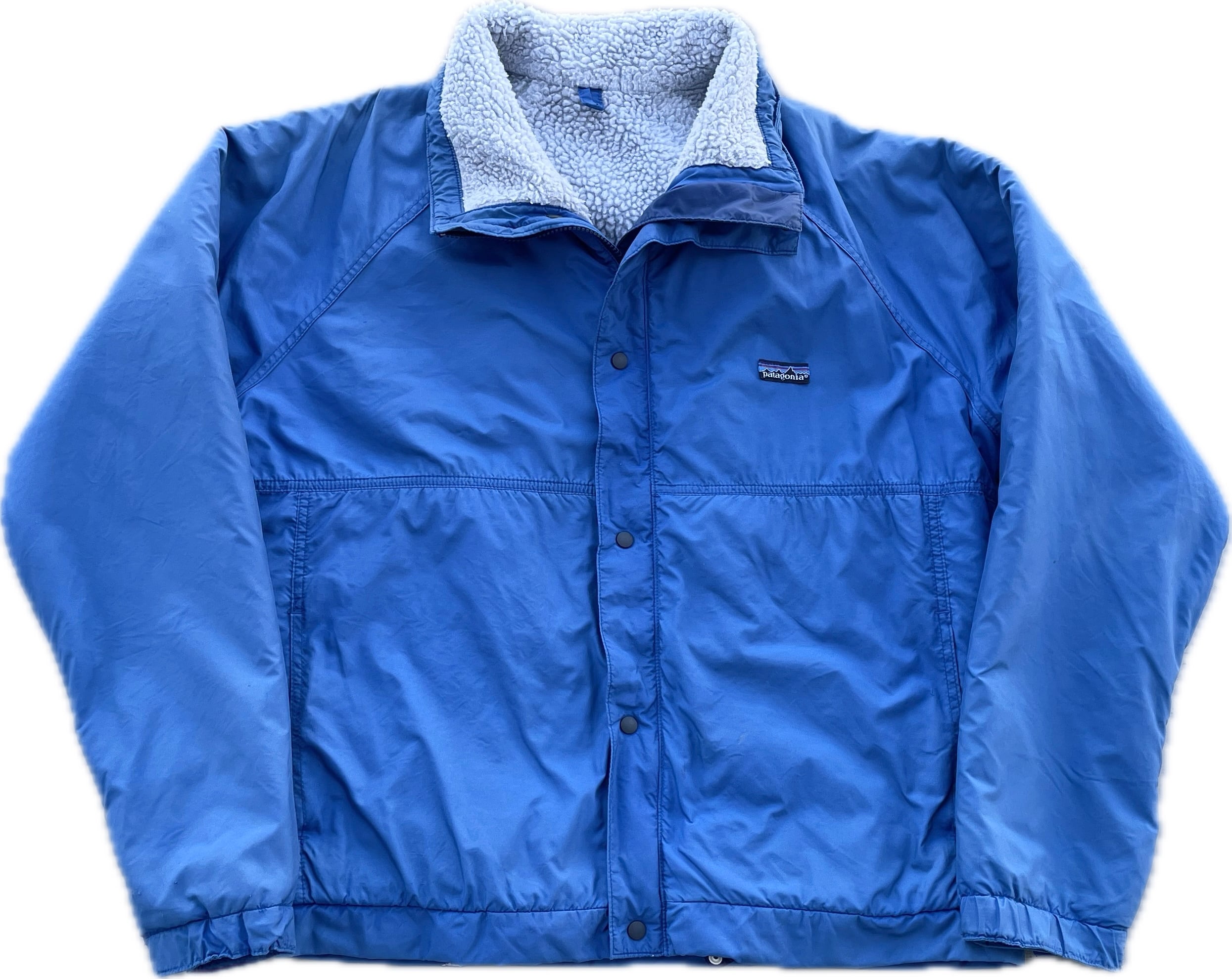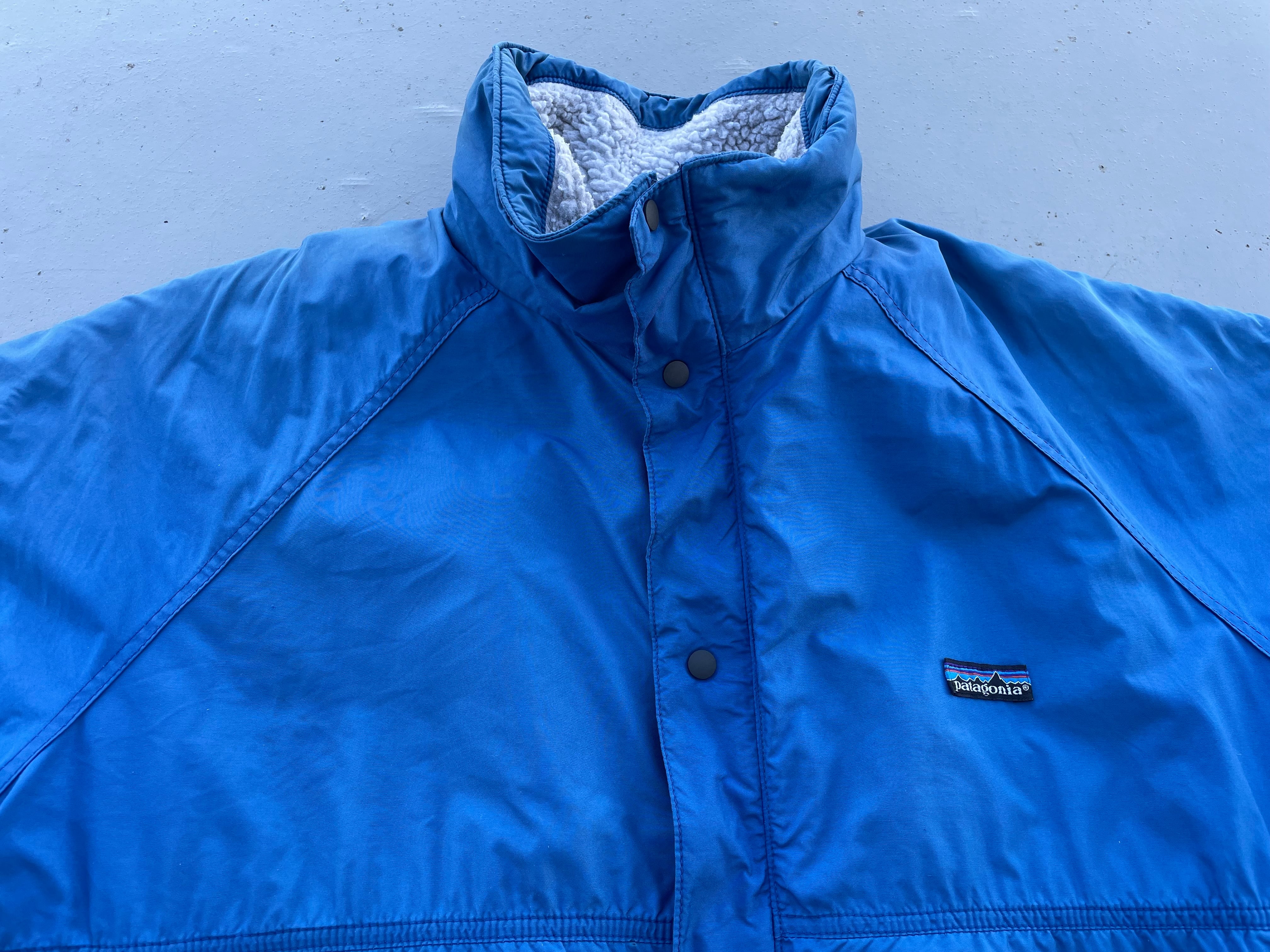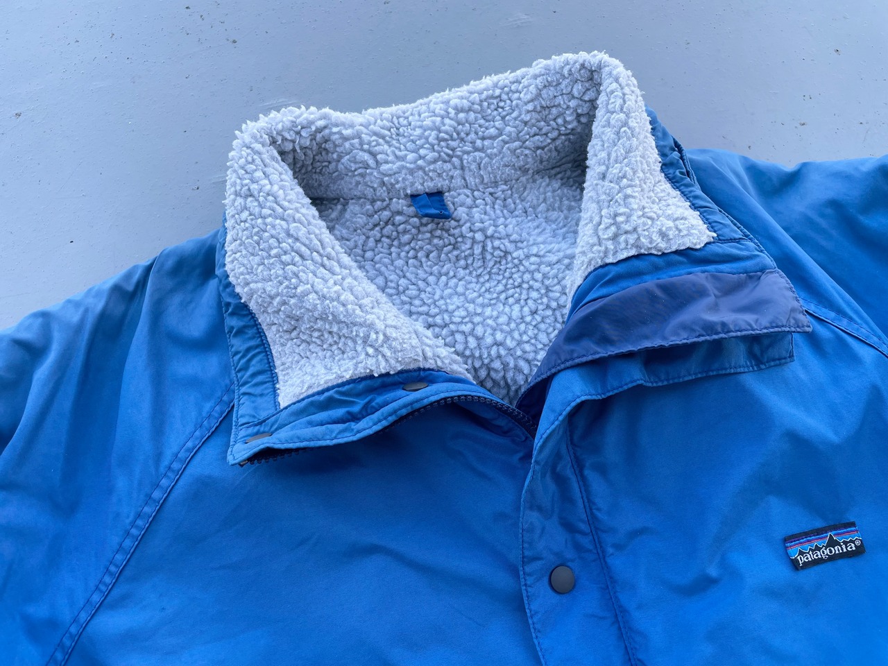 【商品詳細】パタゴニアのシェルドパイルジャケット。サイズはXL。カラーはブルー。80年代製。レジスターマーク入りのオールドモデルの個体。ナイロン地に加えてライニングはレトロカーディガンのような毛立ちのディープパイルを使用しており、寒い日だけでなく雨の日にも使える優れ者。全体的に使用感ございますが良い雰囲気で着れます。シェルとパイルカラーがオールドな雰囲気で良いです。球数少ない系です。