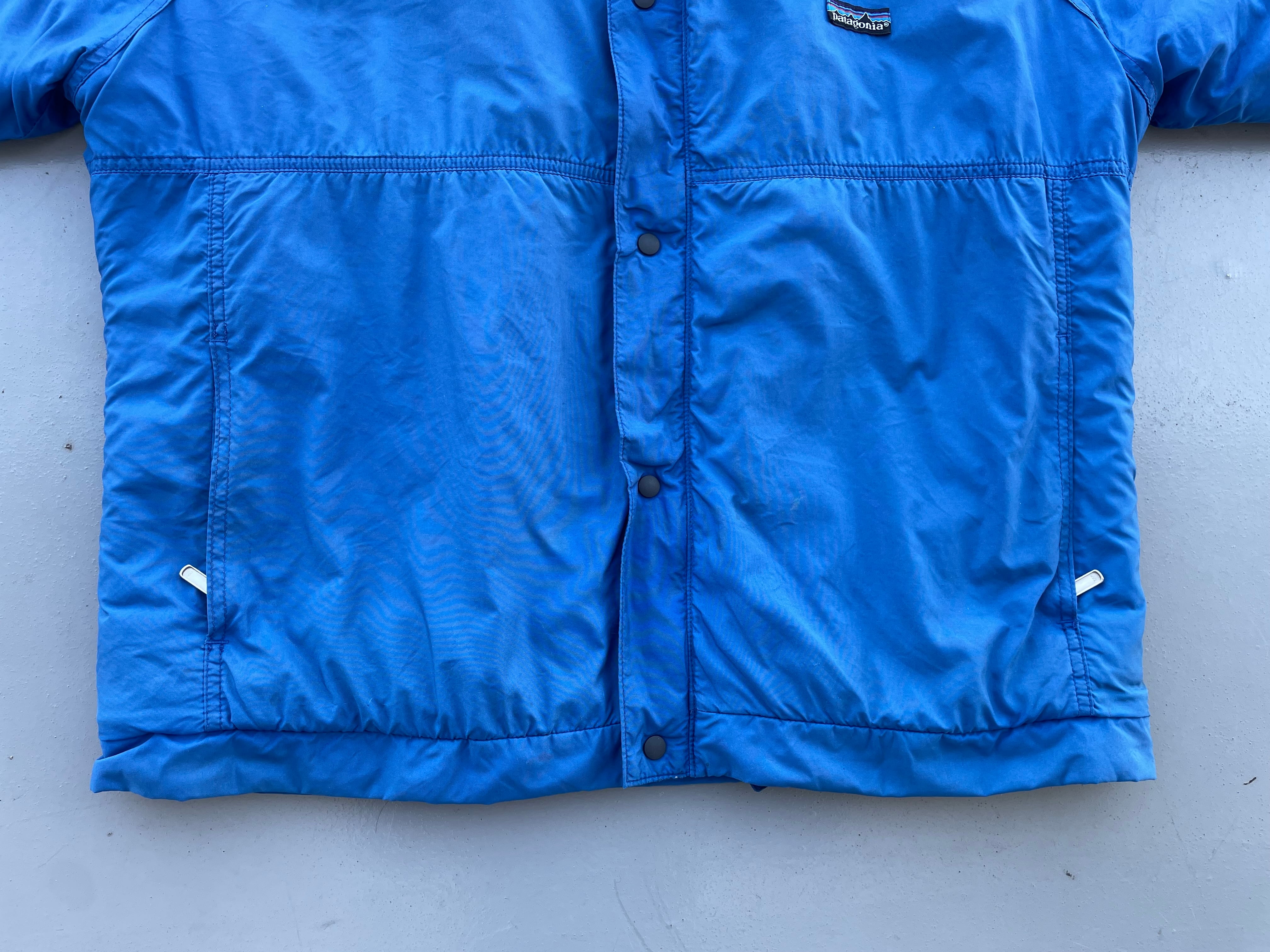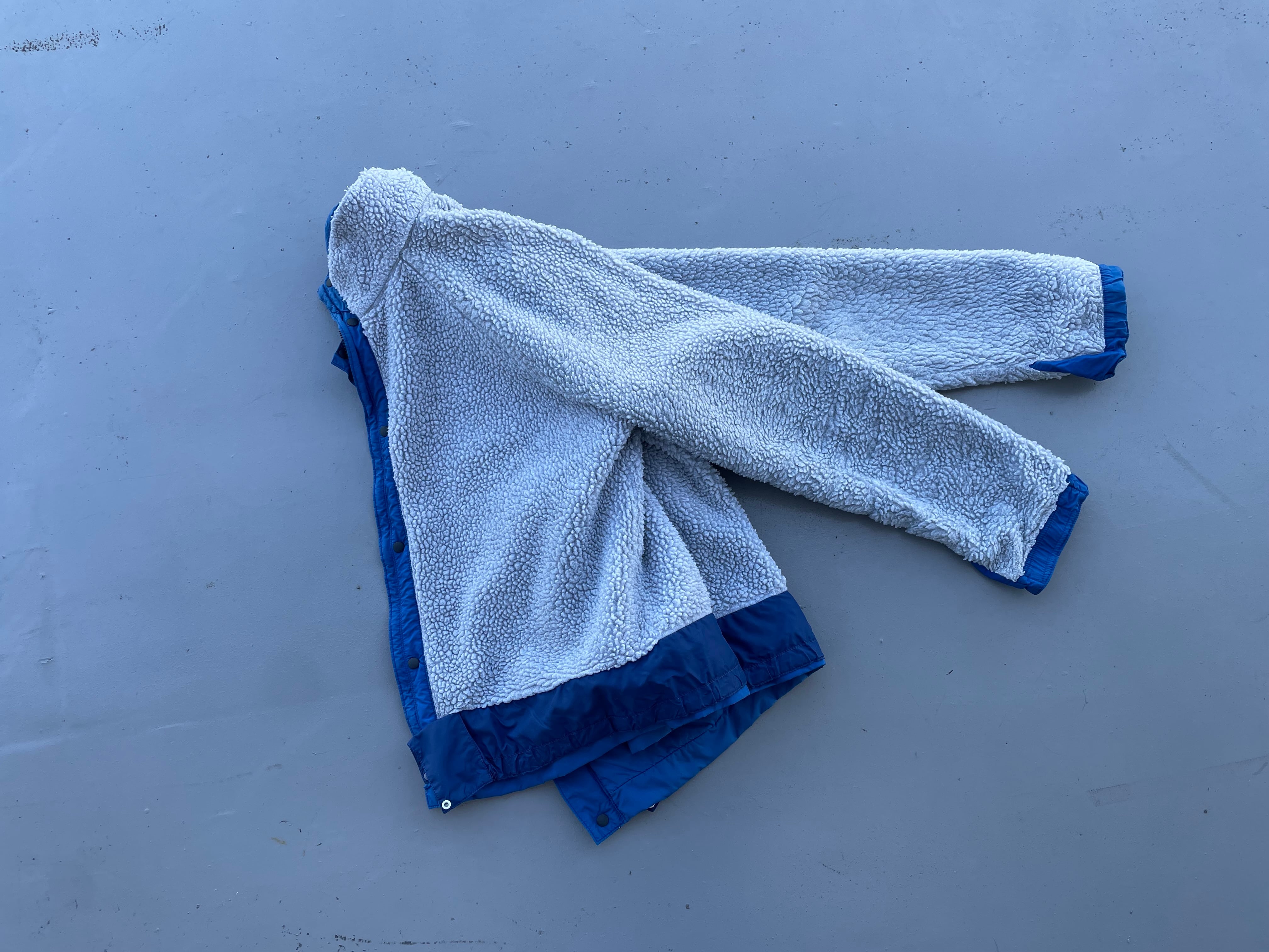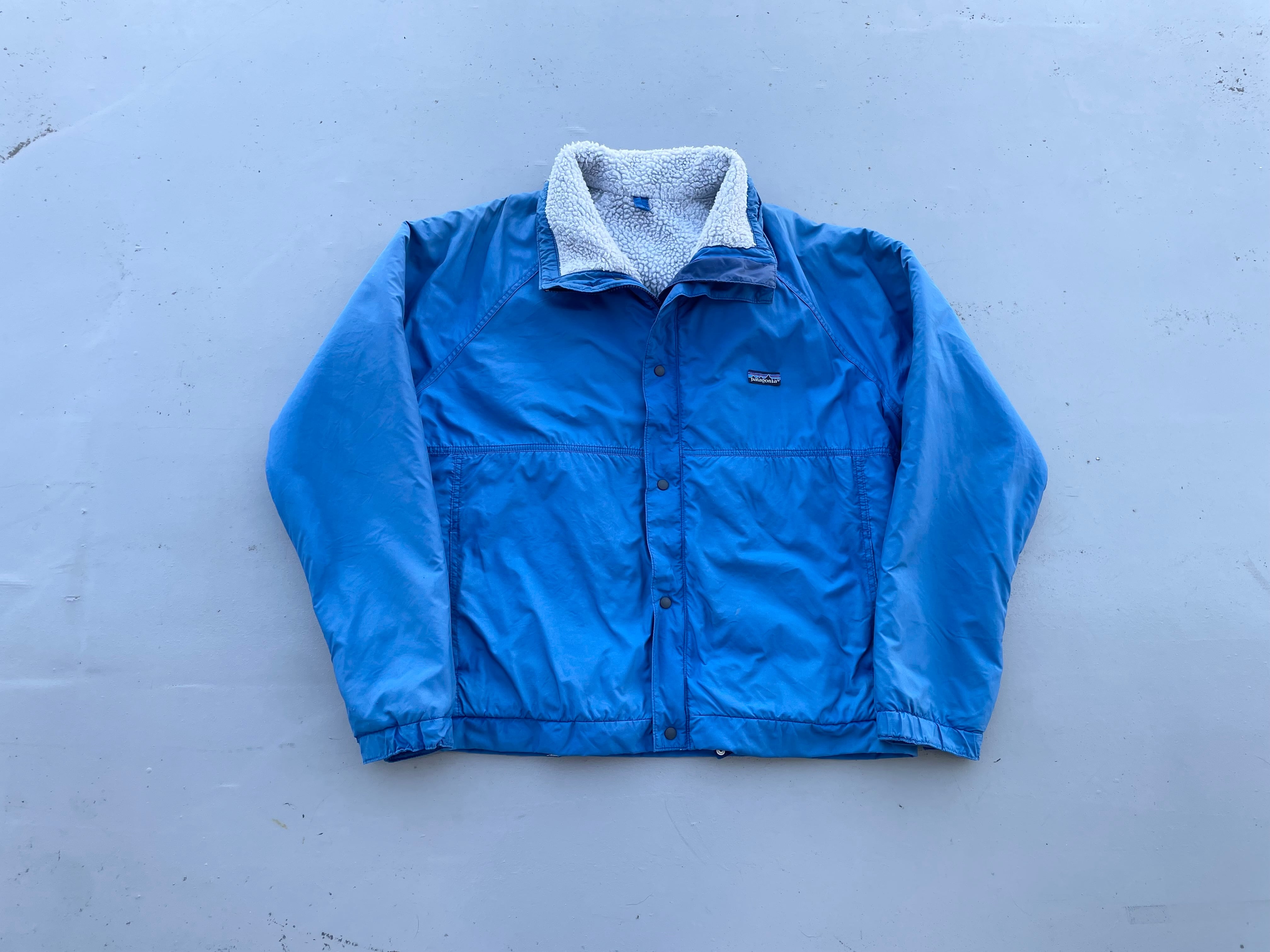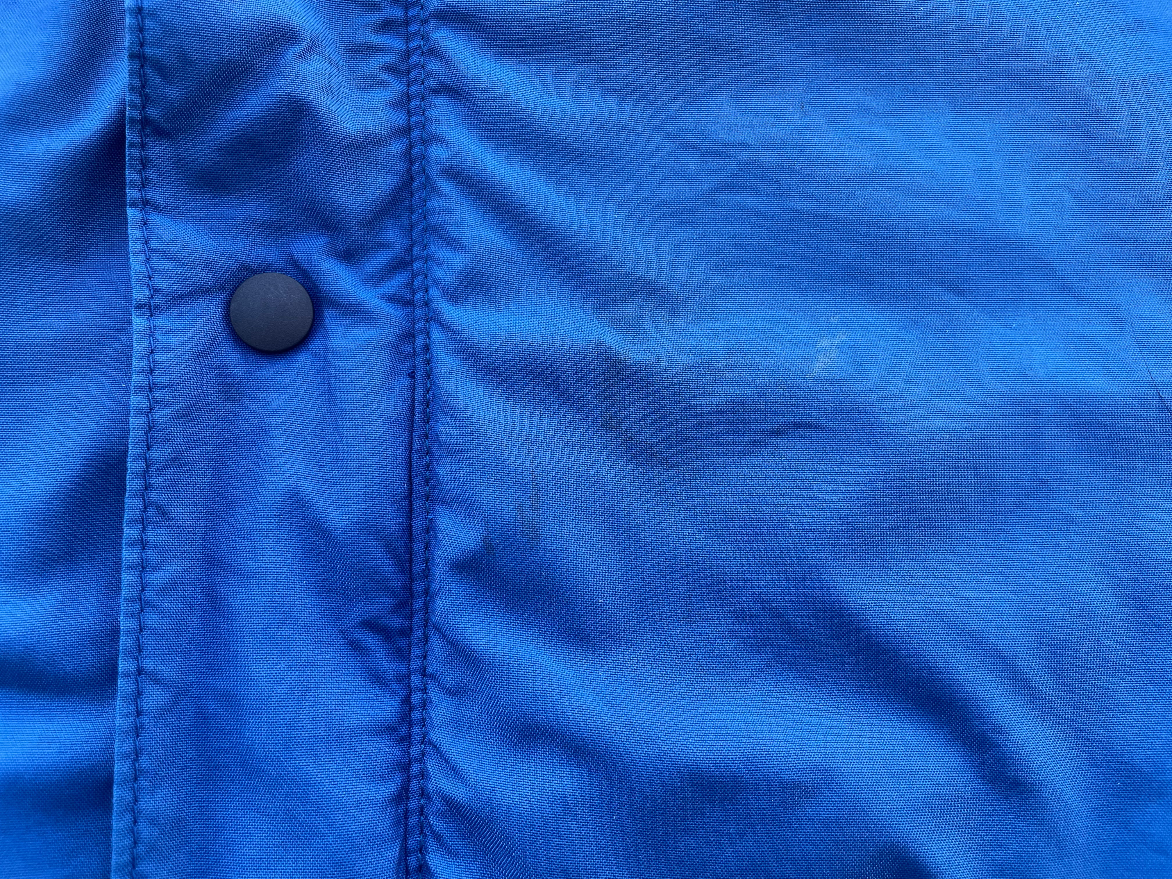 【商品詳細】パタゴニアのシェルドパイルジャケット。サイズはXL。カラーはブルー。80年代製。レジスターマーク入りのオールドモデルの個体。ナイロン地に加えてライニングはレトロカーディガンのような毛立ちのディープパイルを使用しており、寒い日だけでなく雨の日にも使える優れ者。全体的に使用感ございますが良い雰囲気で着れます。シェルとパイルカラーがオールドな雰囲気で良いです。球数少ない系です。