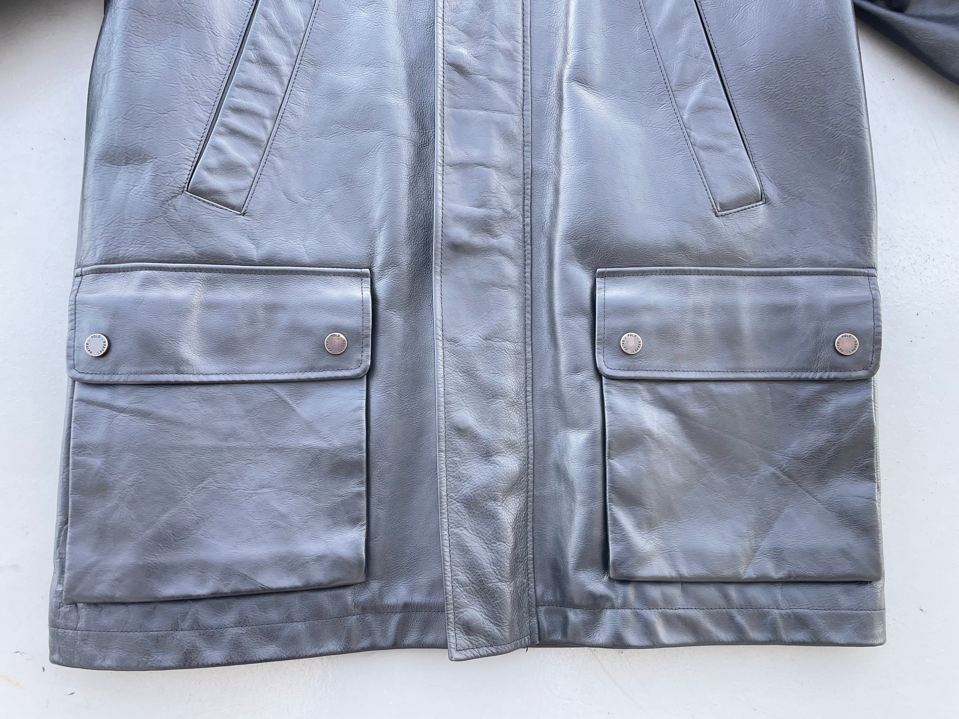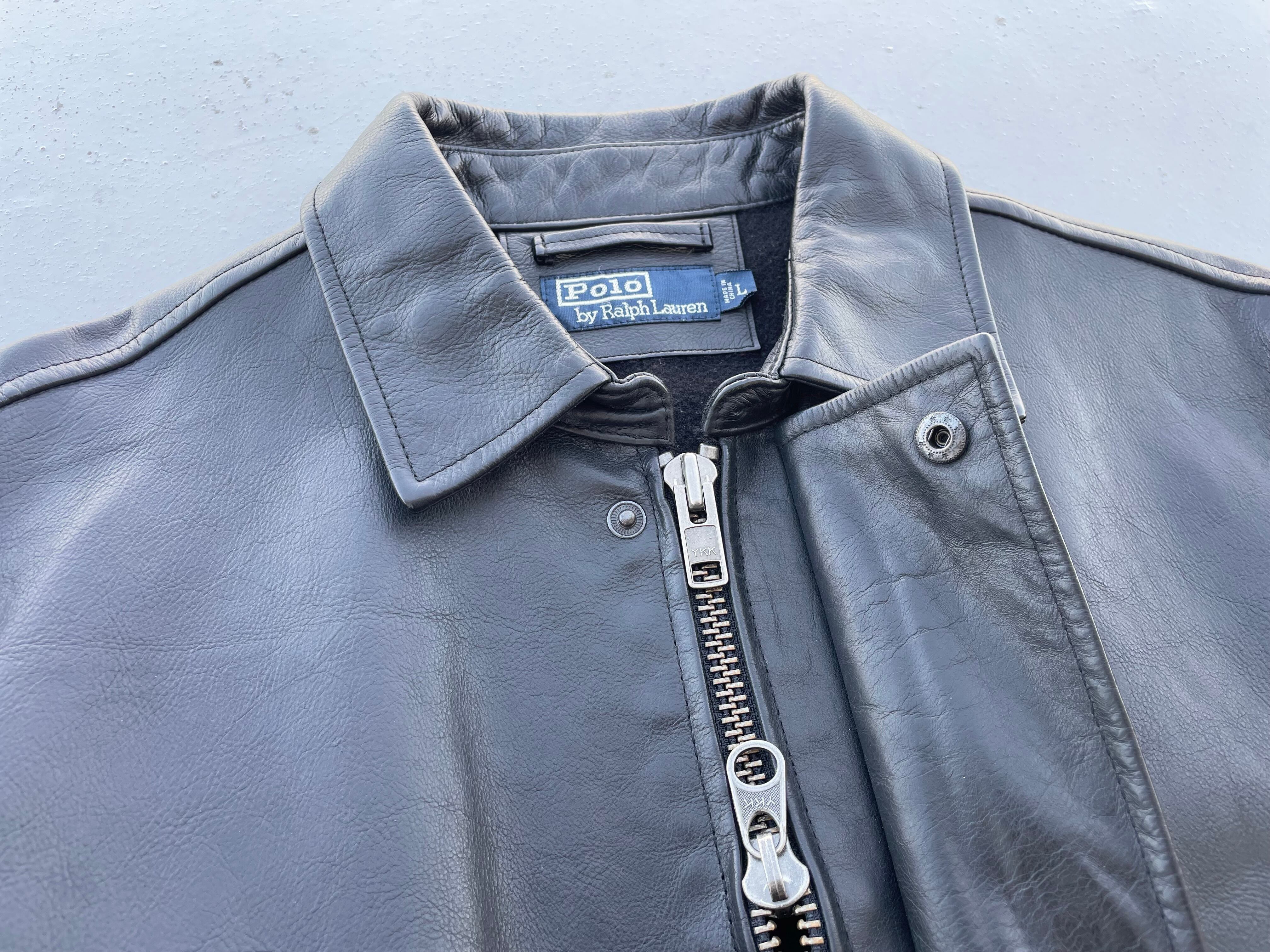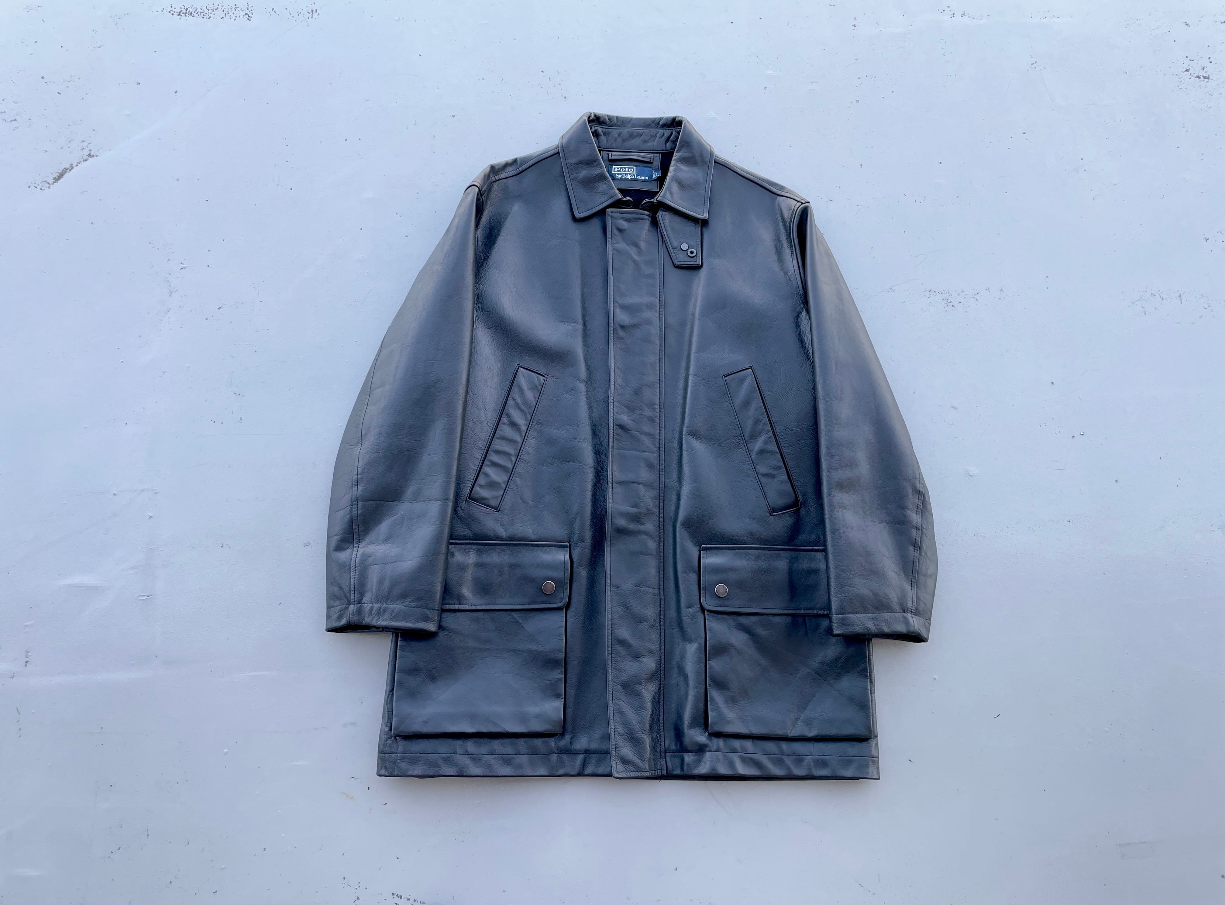 【商品詳細】ラルフローレンのレザーカーコート。サイズはL。カラーはブラック。90年代中国製。ラルフローレン人気のカーコート。こちらは前立てタイプのモデル。前立ての裏にはスナップボタンとジッパーが付いており寒い時期もしっかり保温保湿してくれます。また襟裏にはチンスト付きなので首元も暖かいです。ライニングはフリース張り。ダブルジッパー仕様で色んな着方を楽しめそうです。年代物ですが状態良いです。年々見なくなってますね。