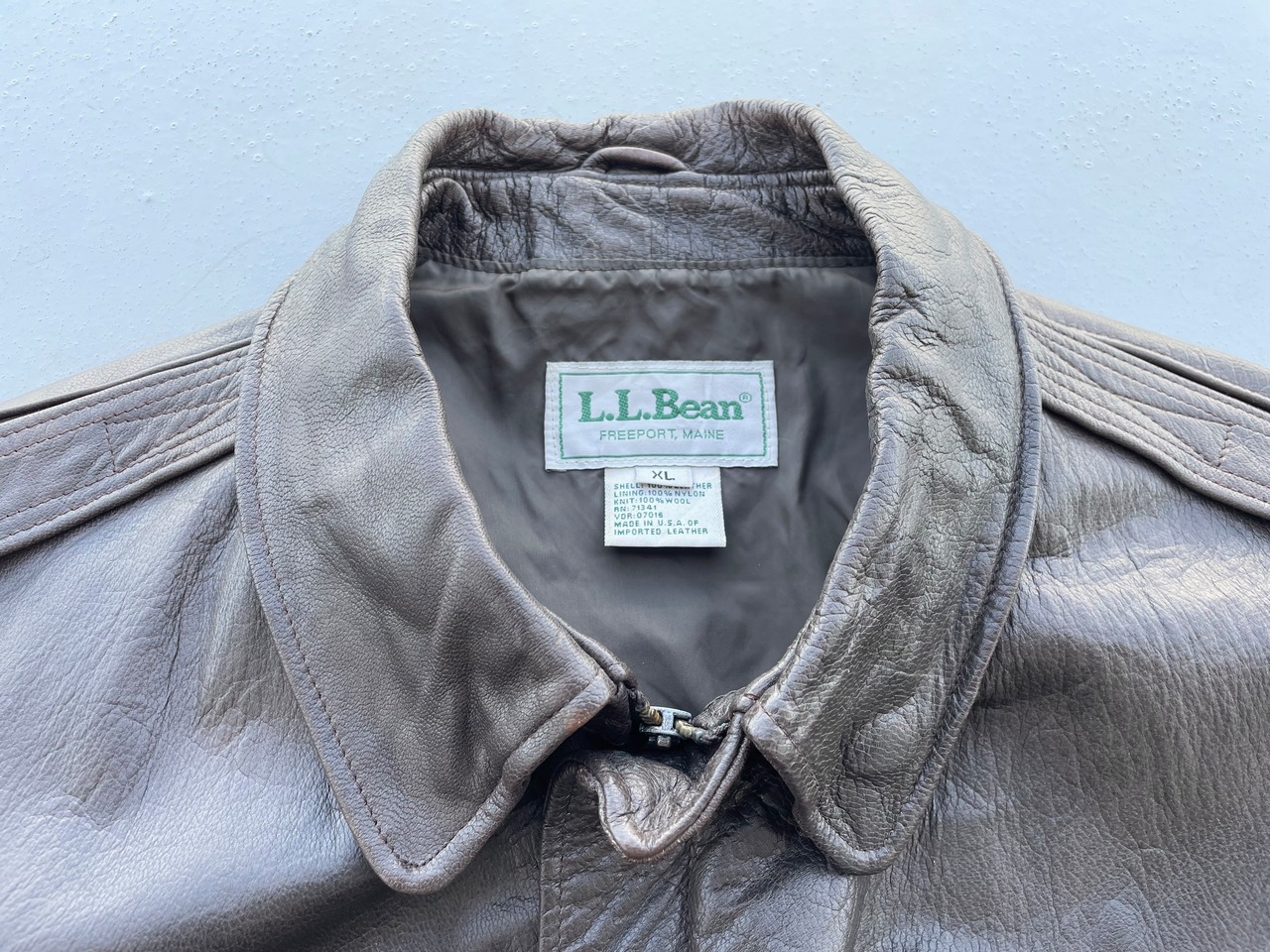【商品詳細】エルエルビーンのレザージャケット。サイズはXL。カラーはブラウン。80年代USA製。エルエルビーン人気のA-2タイプレザージャケット。シボ感のある柔らかいレザーを使用しており本格的な作りでありながらタウンユースとしても使える一着。こちらはシンサレートの入っていないタイプで今時期から活躍するかと。大きめサイズで中に着込めるのも嬉しいですね。使用感はありますが大きな傷やリブの穴抜け等無く、悪くないコンディションです。