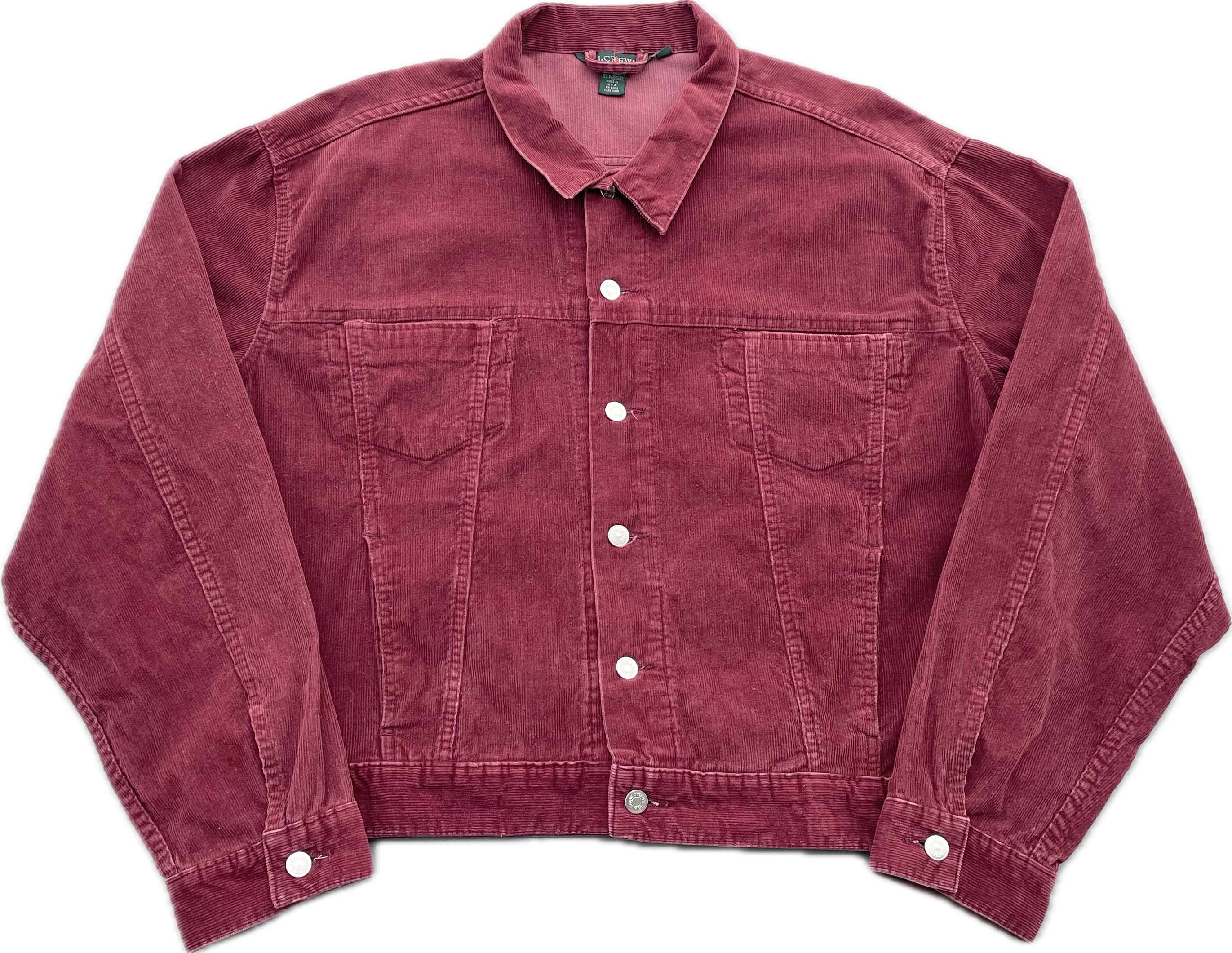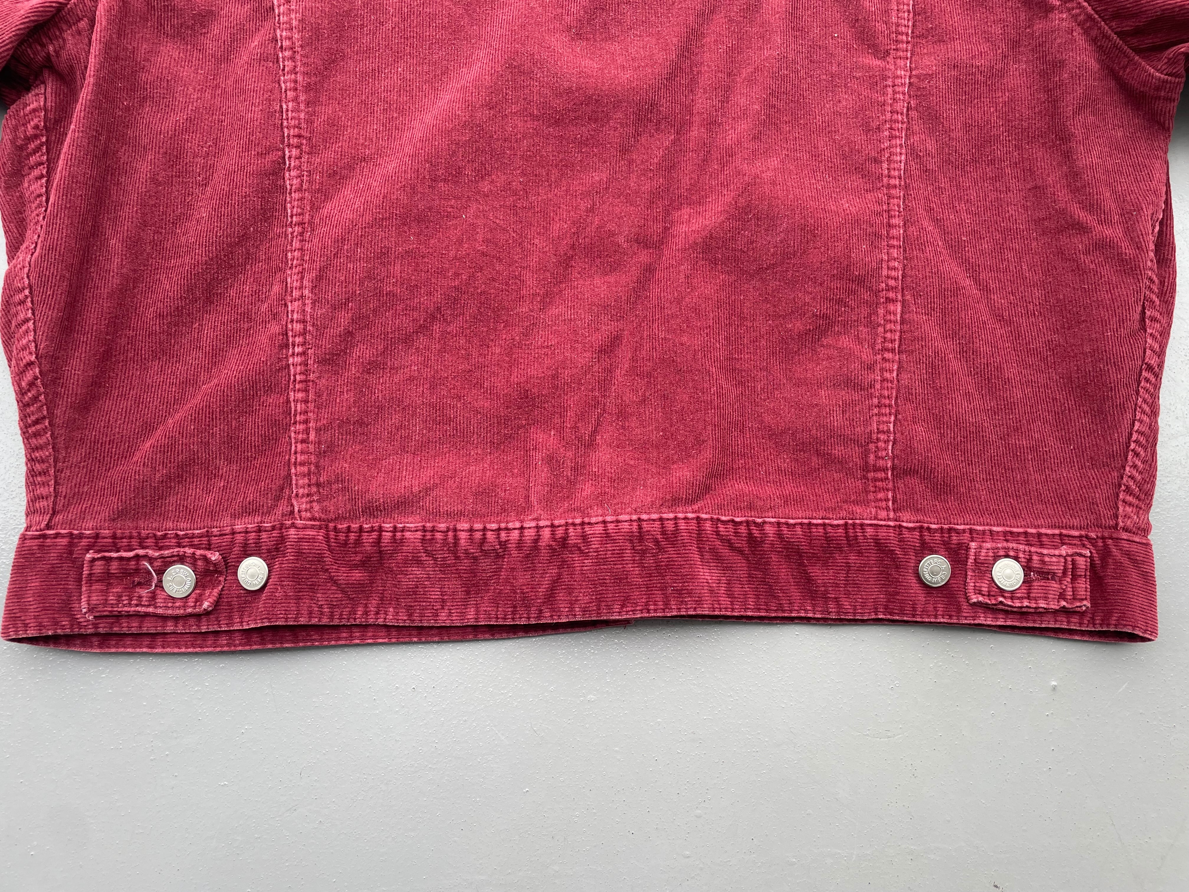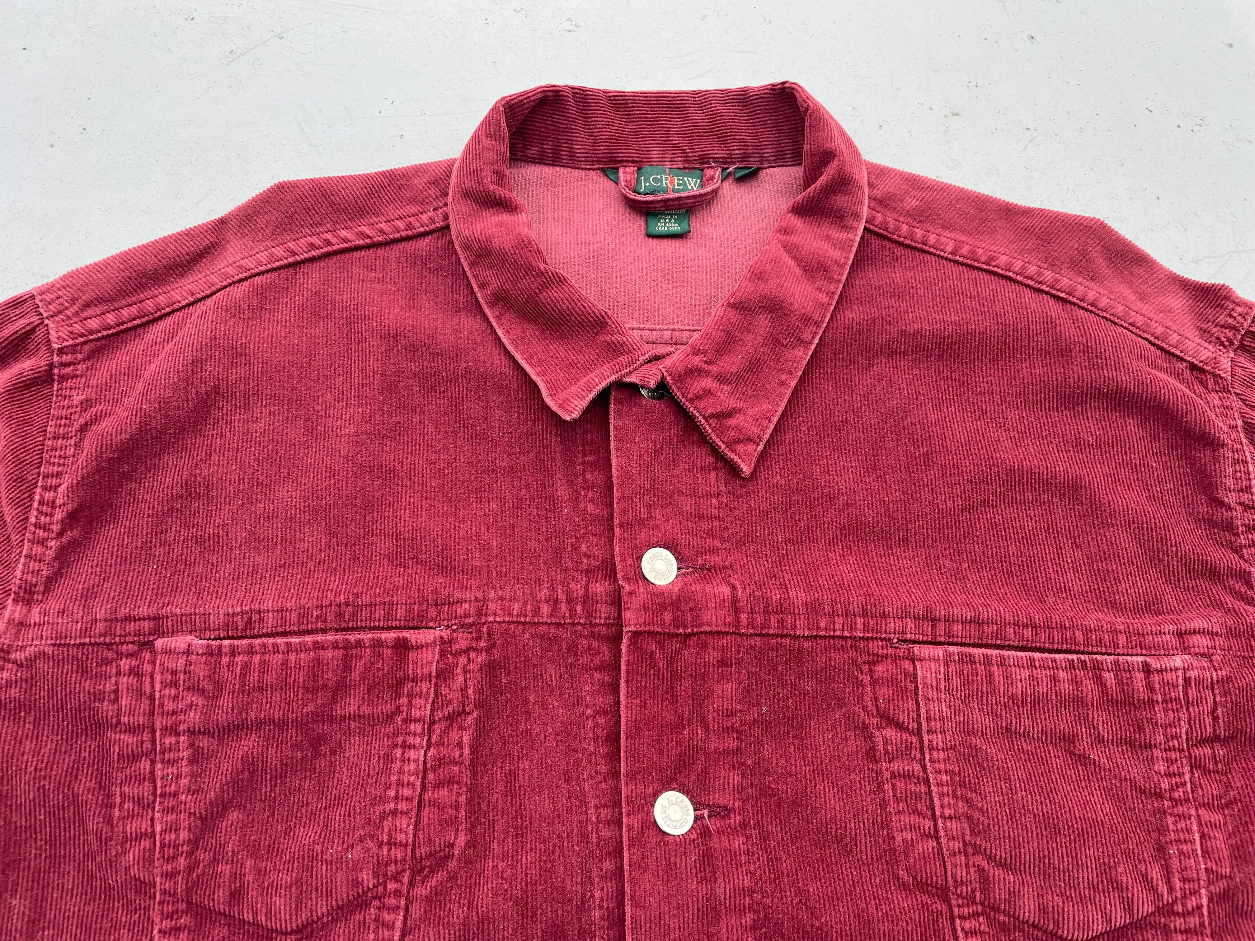 【商品詳細】J.crewのコーデュロイトラッカージャケット。サイズはXL。カラーはバーガンディ。90年代USA製。オールド物の証である巨人タグのつく4th仕様のトラッカージャケット。基本的な作りはリーバイス70505と同じかと。ピッチの狭い細畝地で使い勝手良さそうです。サイズXLで身幅がたっぷりある大きめな作り。白っぽさのあるレトロなバーガンディカラーで古着と相性良さそうです。おすすめ。
