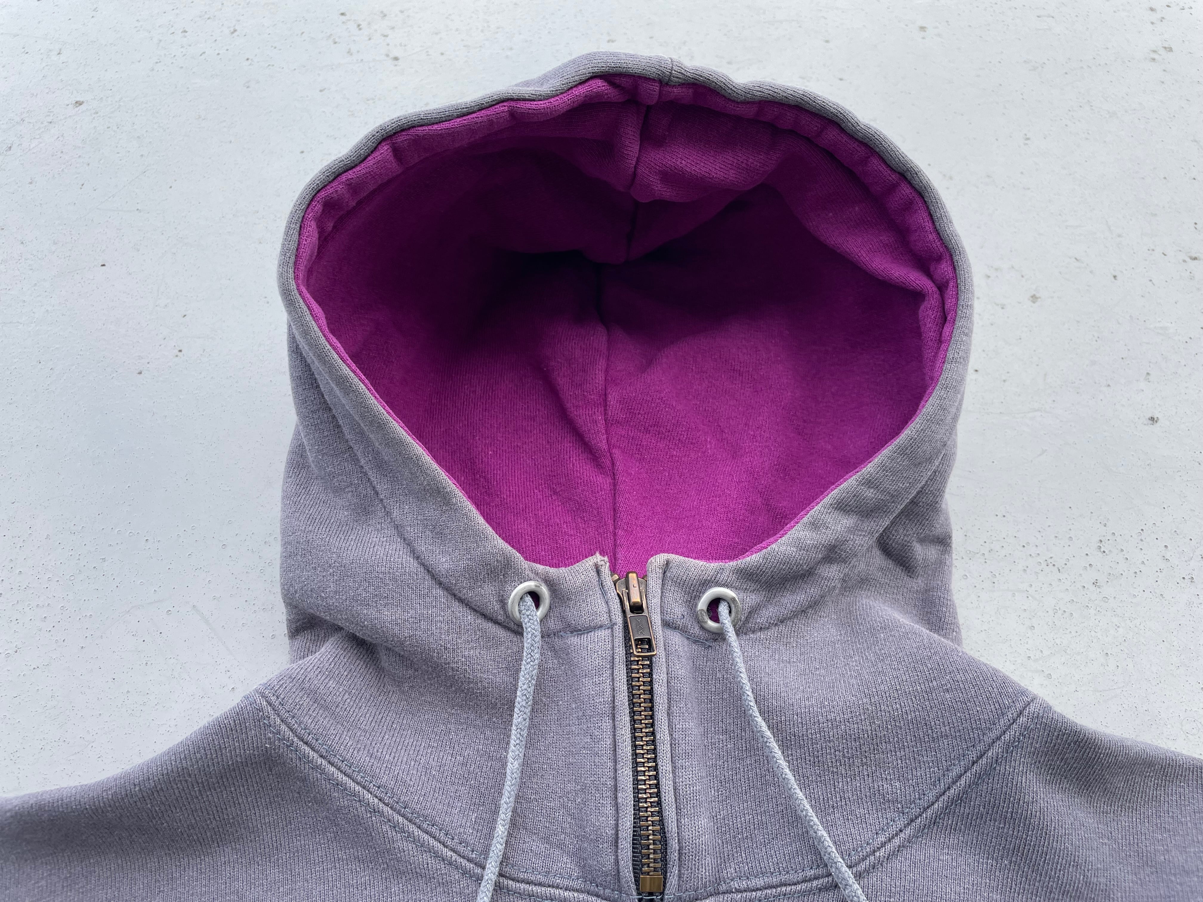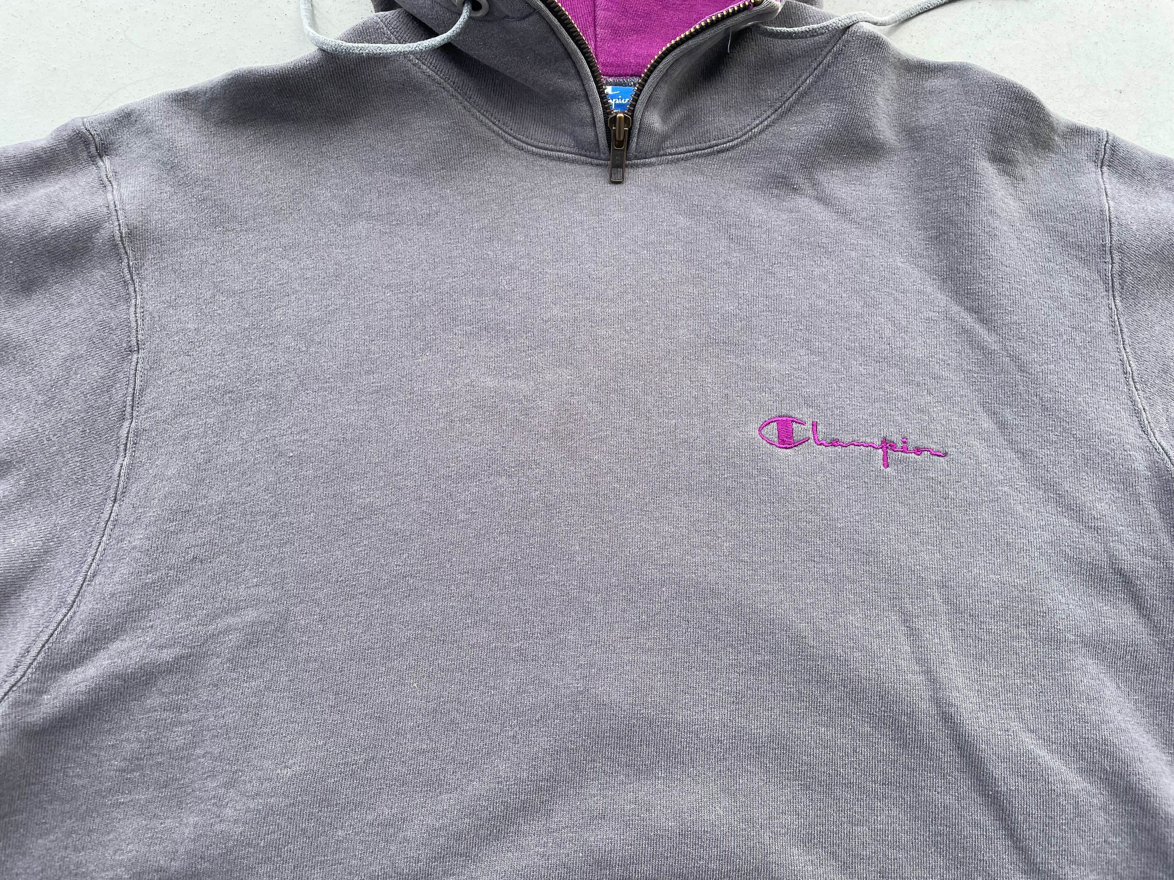 【商品詳細】チャンピオンのプルーオーバーハーフジップパーカー。サイズはXL。カラーはグレー×ピンクのツートーンパターン。90年代USA製。チャンピオンの通好きな隠れた名品。ハーフジップを下ろすとインナーカラーのピンクが見えて一気に洒落た雰囲気になります。リバースウィーブよりも圧倒的に出回り少ない系。おすすめです。