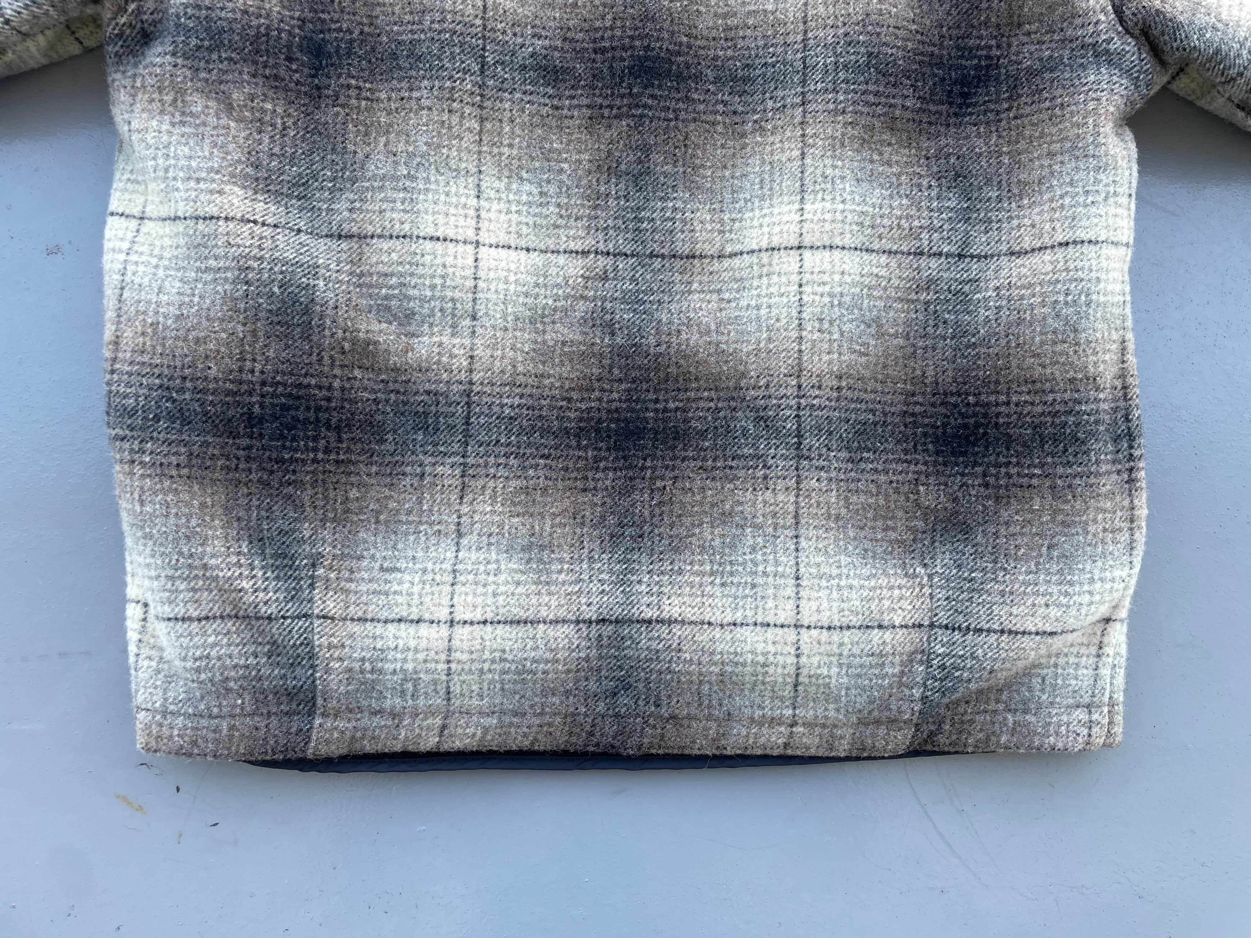 【商品詳細】ウールリッチのウールジップアップジャケット。サイズはM。カラーはブラック×ブラウンベースのオンブレチェック。90年代USA製。雰囲気のある洒落たオンブレチェックパターンのジャケット。シェルのウールに加えてファーライナー付の仕様でしっかり暖かいです。年代物にありがちな重くて硬いウール地ではなく軽く柔らかい仕上がりの為スウィングトップ感覚でリアルに頻度高く着そうな一着。おすすめ。