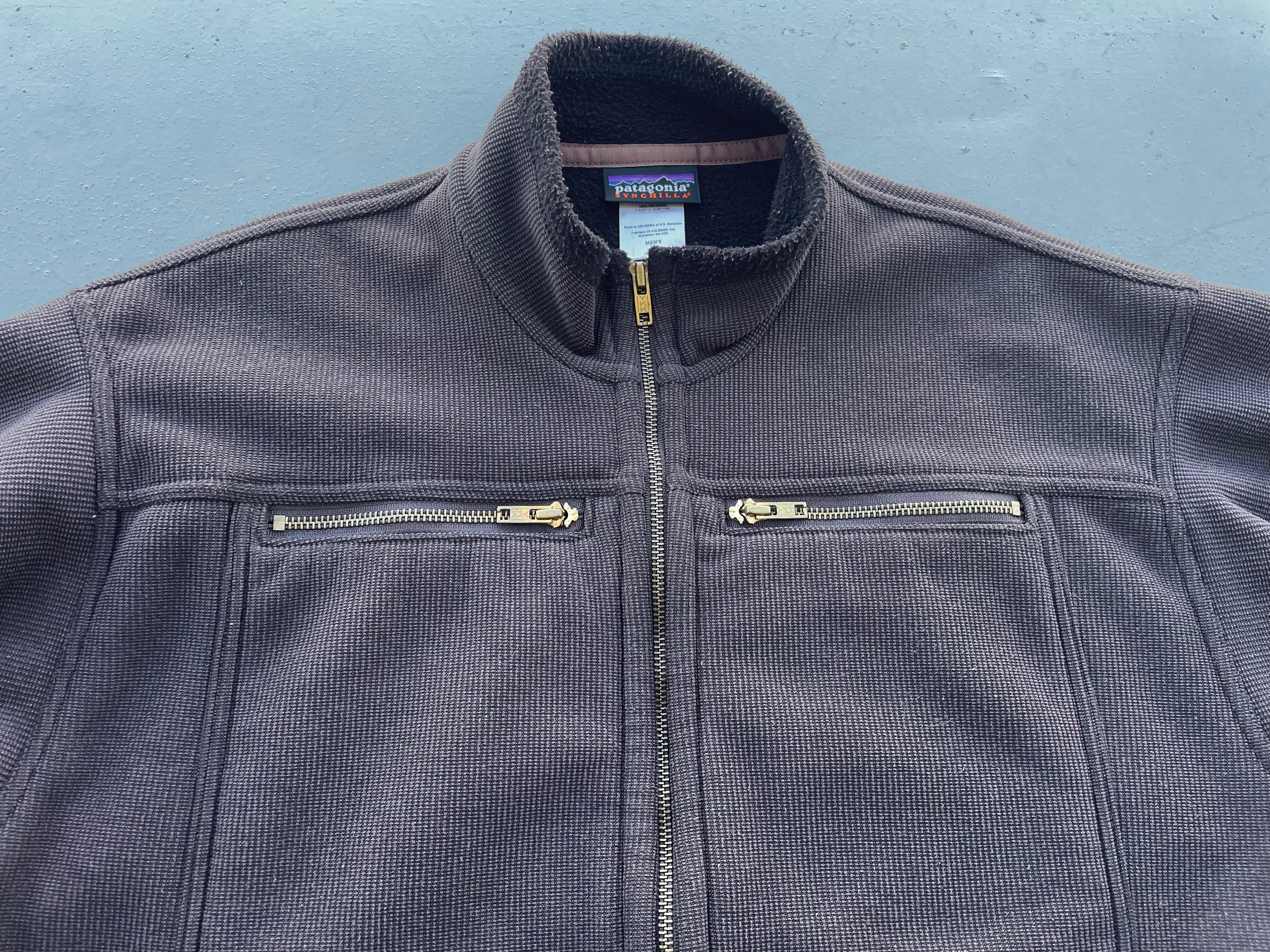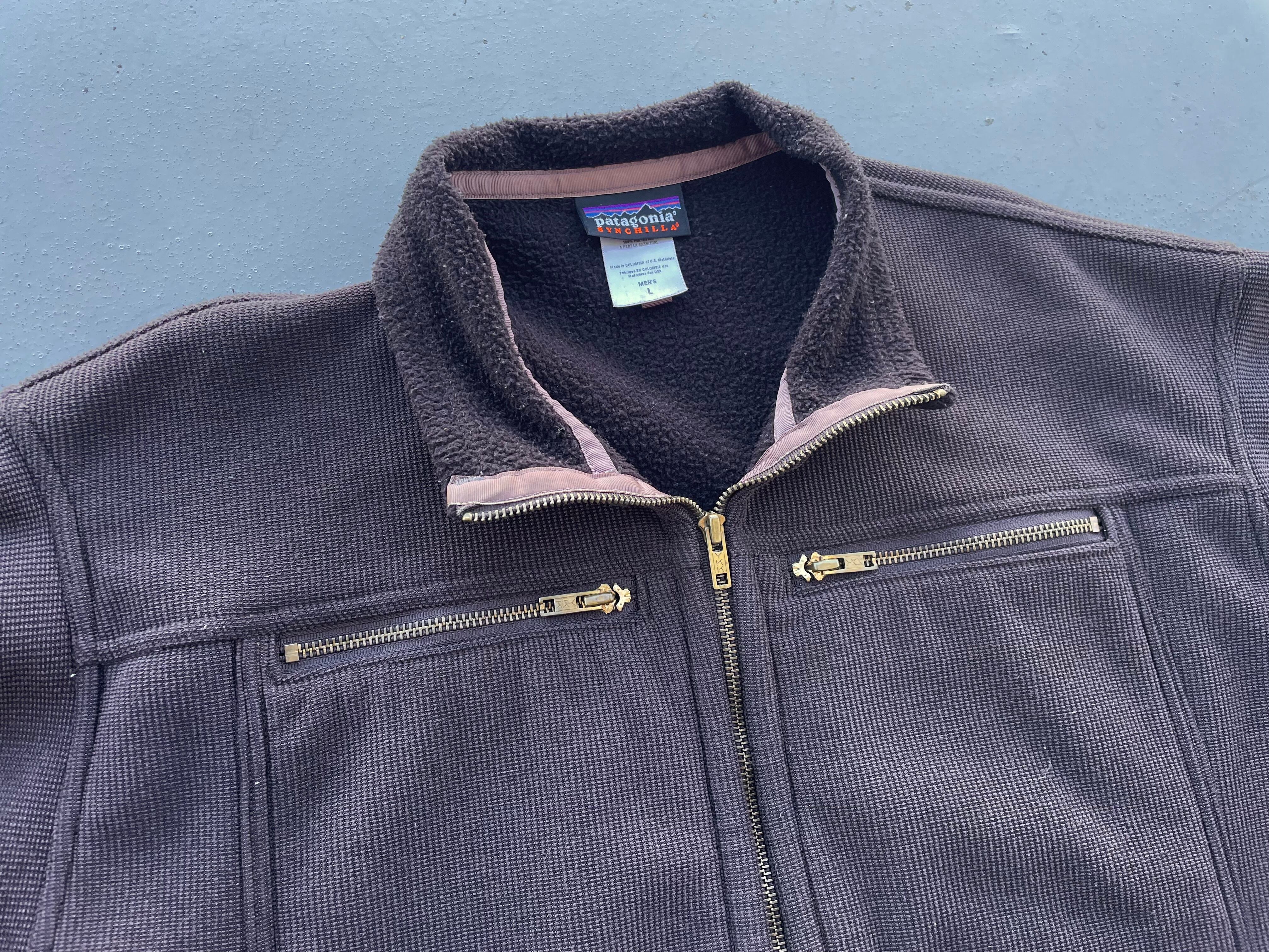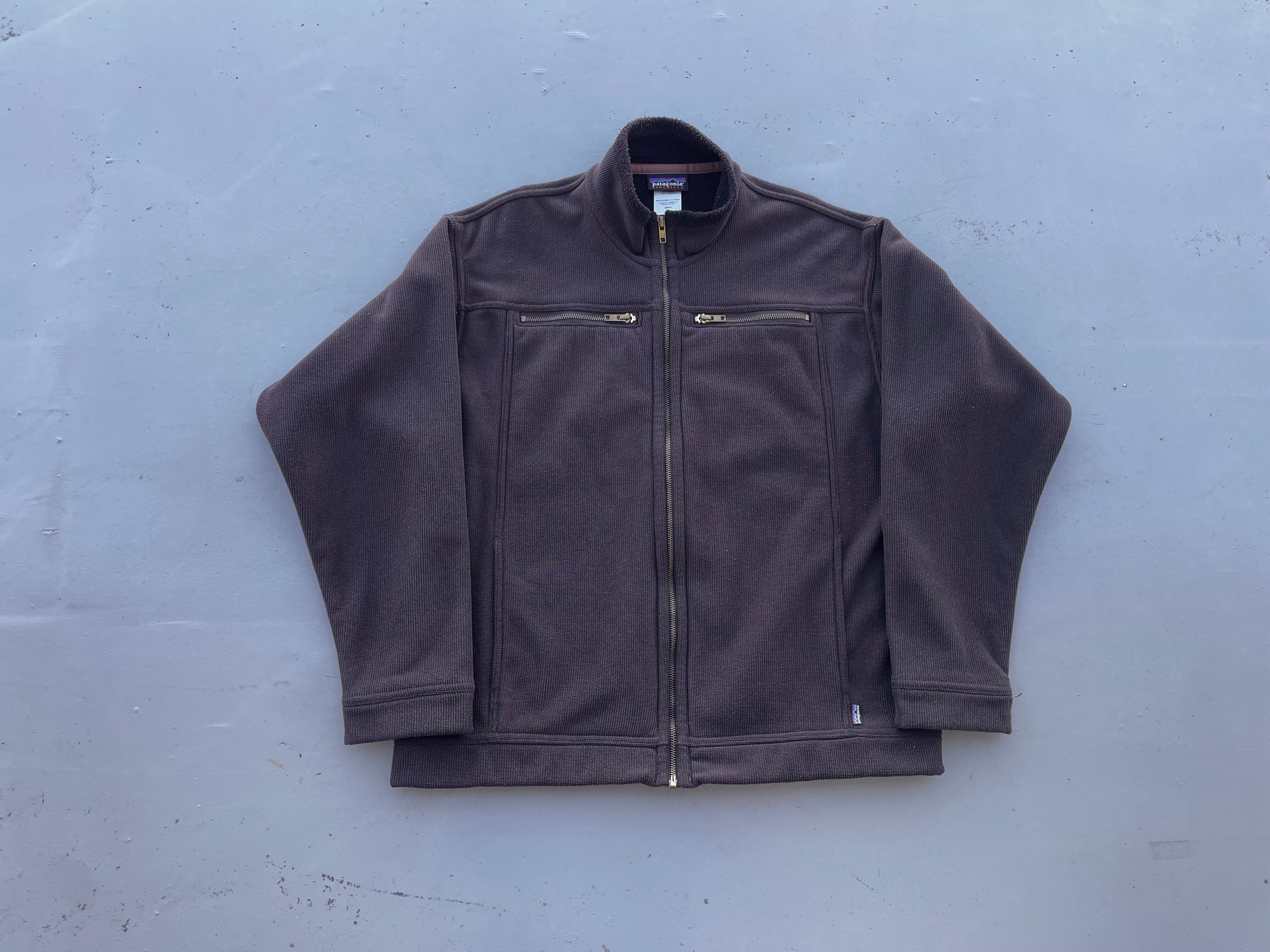 【商品詳細】パタゴニアのシンチラオフザグリッドジャケット。サイズはL。カラーはベルベットブラウン。05年コロンビア製。弊店でも人気の高いリズムシリーズ物。ガシッとした触り心地のざっくり編みなポリエステル地にライニングはフリースが仕込まれた珍品。ライニングの襟元やジッパー付近のパイピングがパタゴニアらしさが残ってます。このモデルは小さめな作りの印象ですがLサイズ縮みなしでしっかり大きめの作りです。金色YKKジッパーが良い雰囲気出してます。