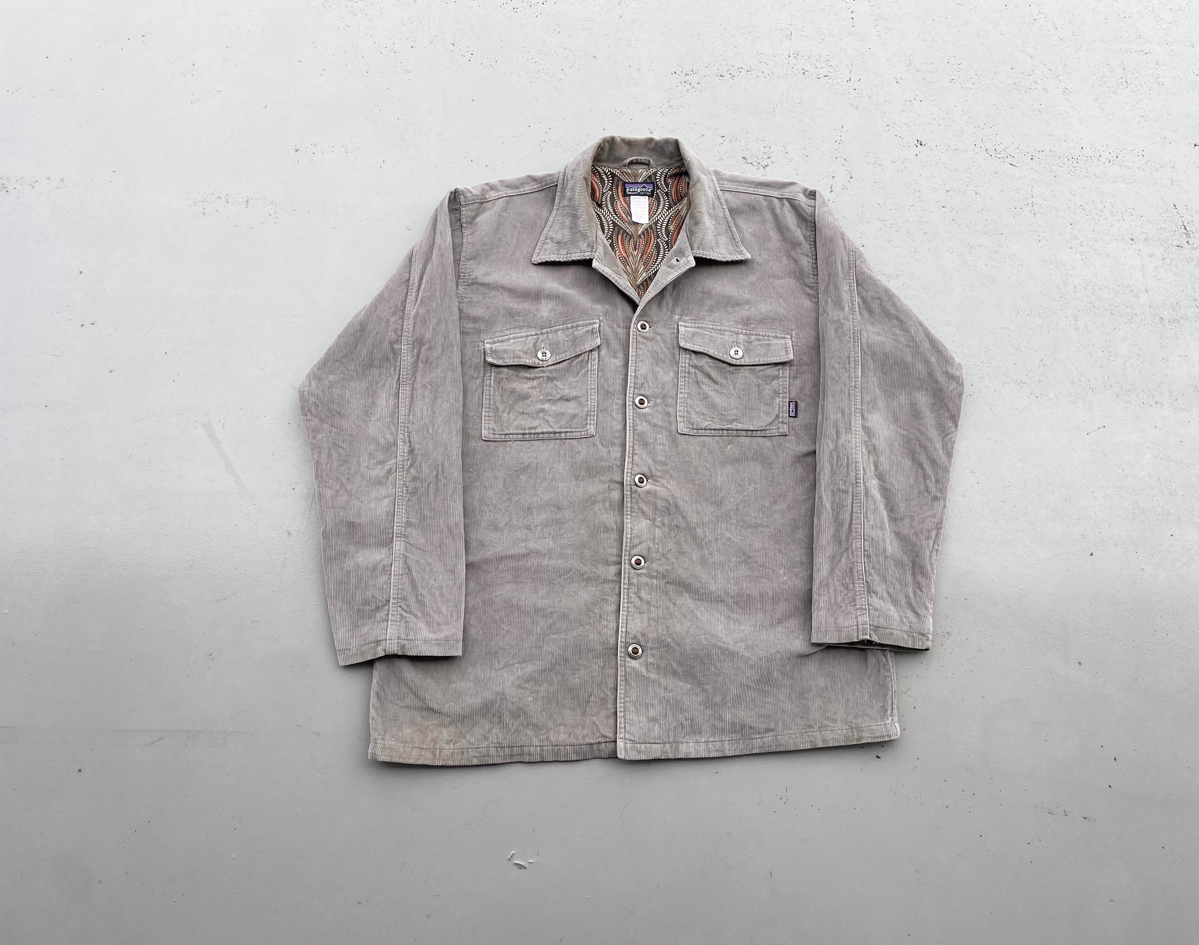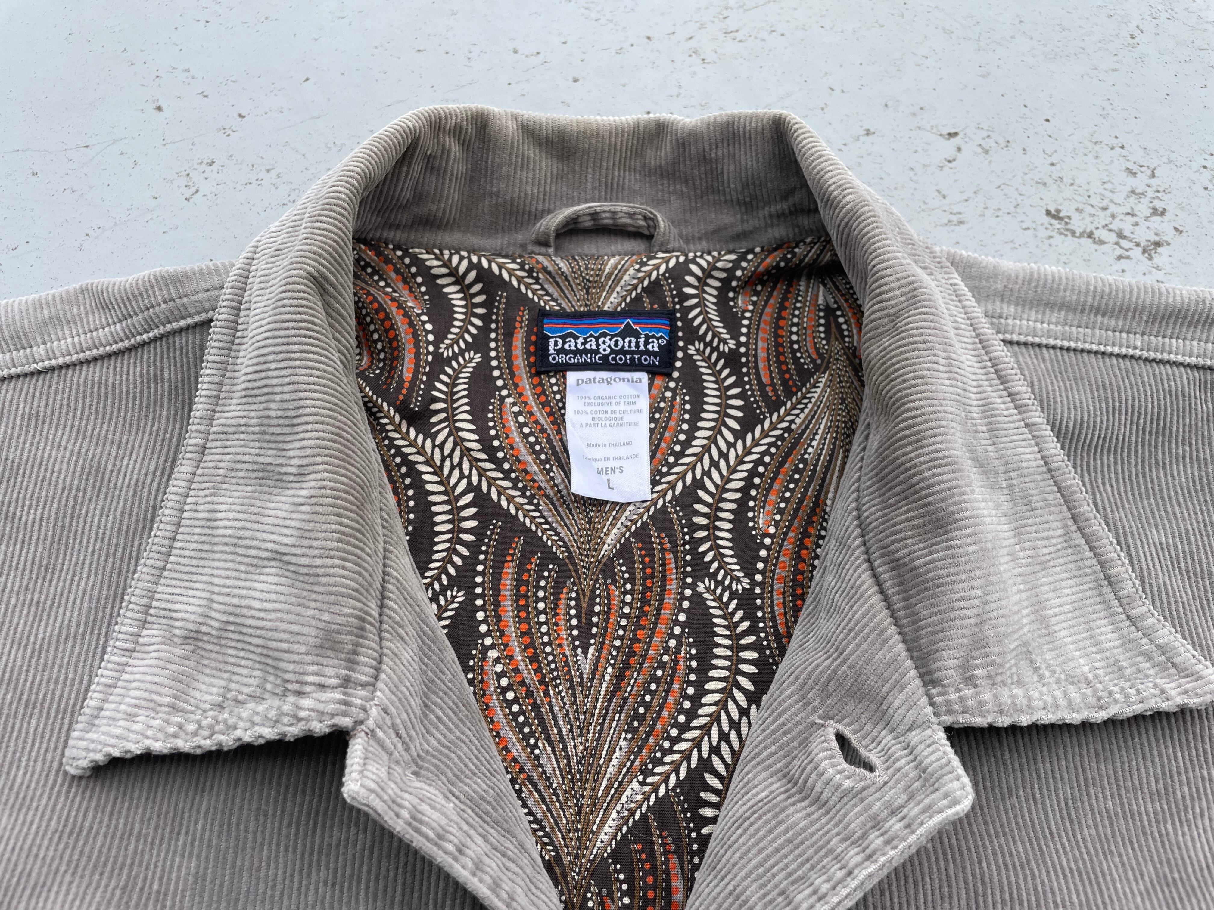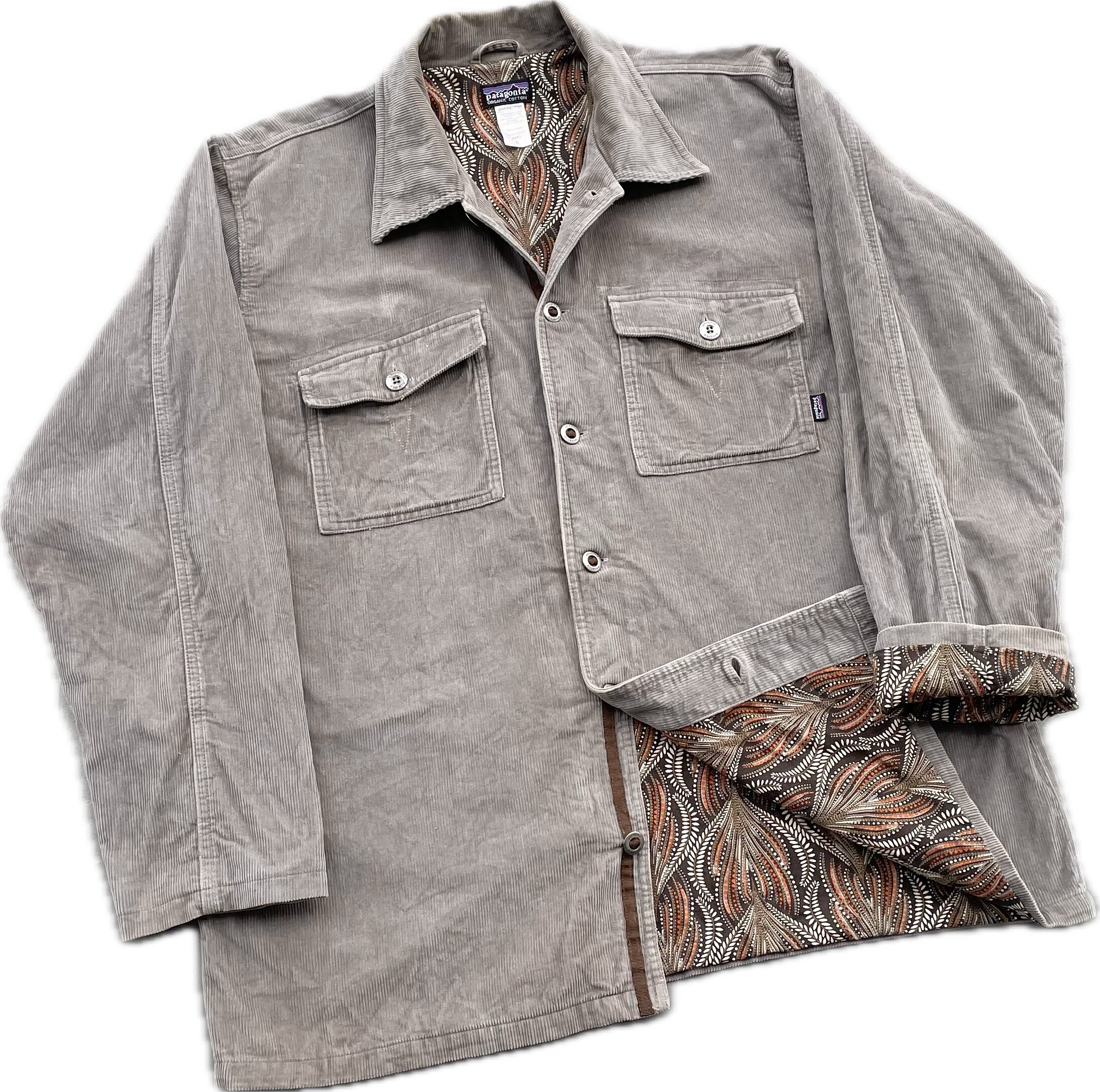 【商品詳細】パタゴニアのレイトンコードジャケット。サイズはL。カラーはブラウンとグレーの中間色のようなカラー。07年タイ製。シェルはオーガニックコットンのコーデュロイ地、ライニングにはエスニック調な裏地がつく珍しいモデル。身幅広めのボックスシルエットで中にもしっかり着込めそうです。良い意味でパタゴニアらしくないが詰まった出回り少ない希少モデル。