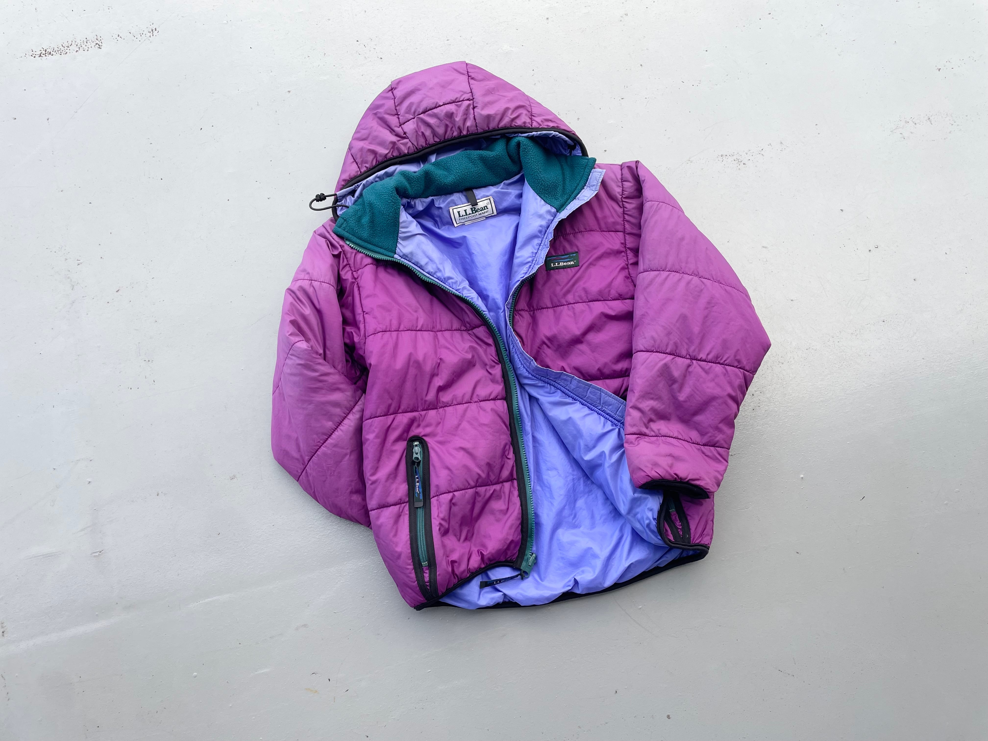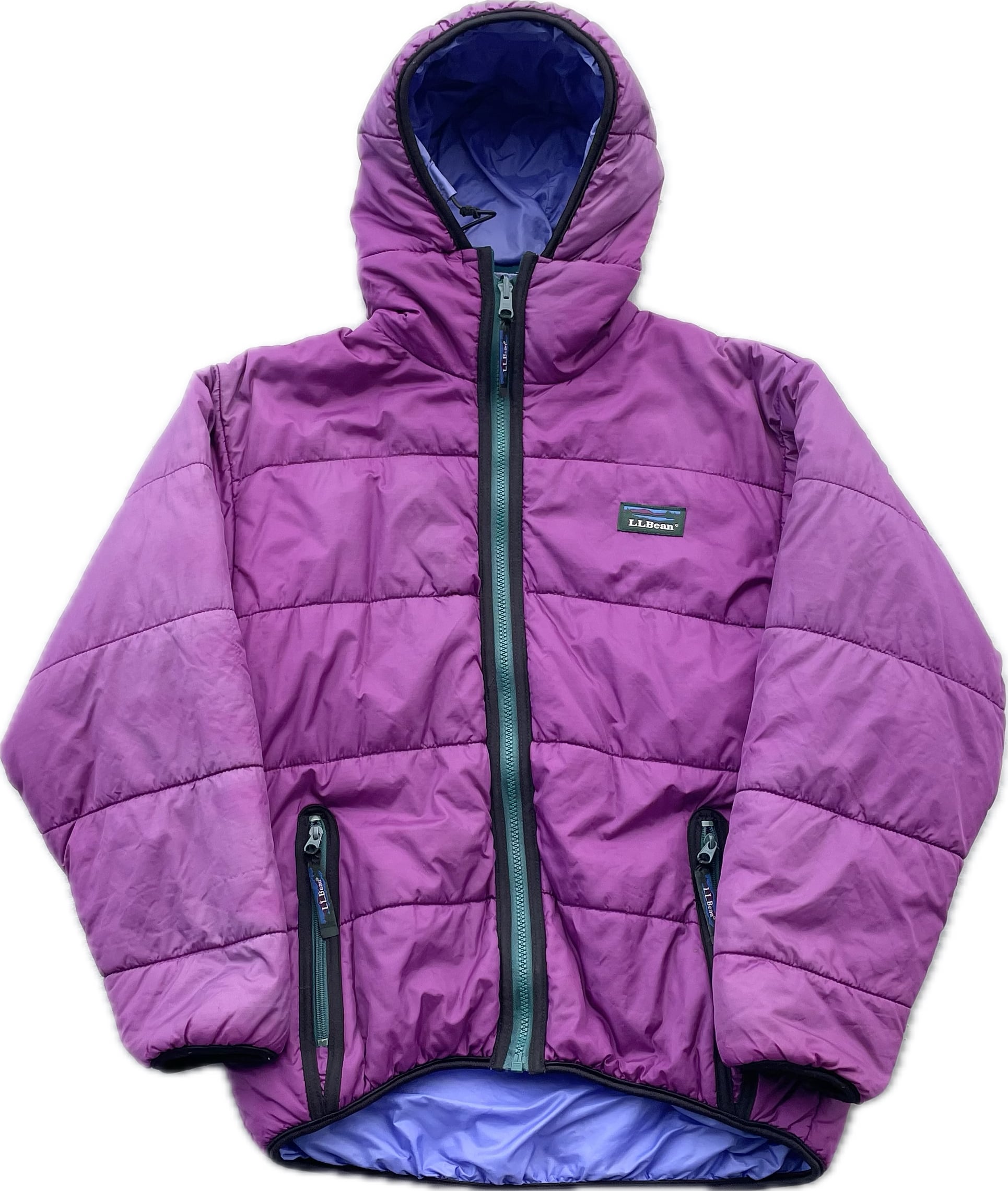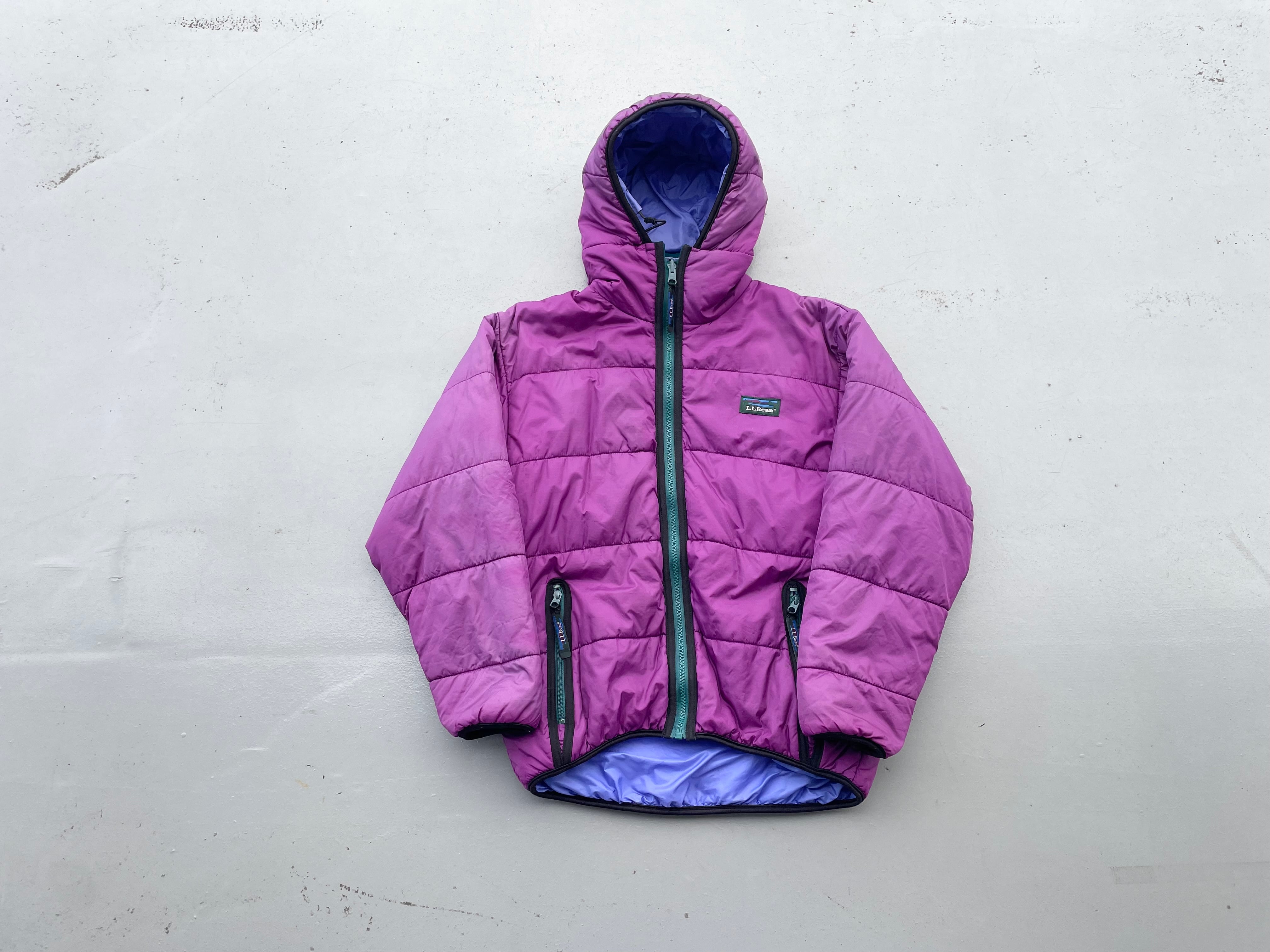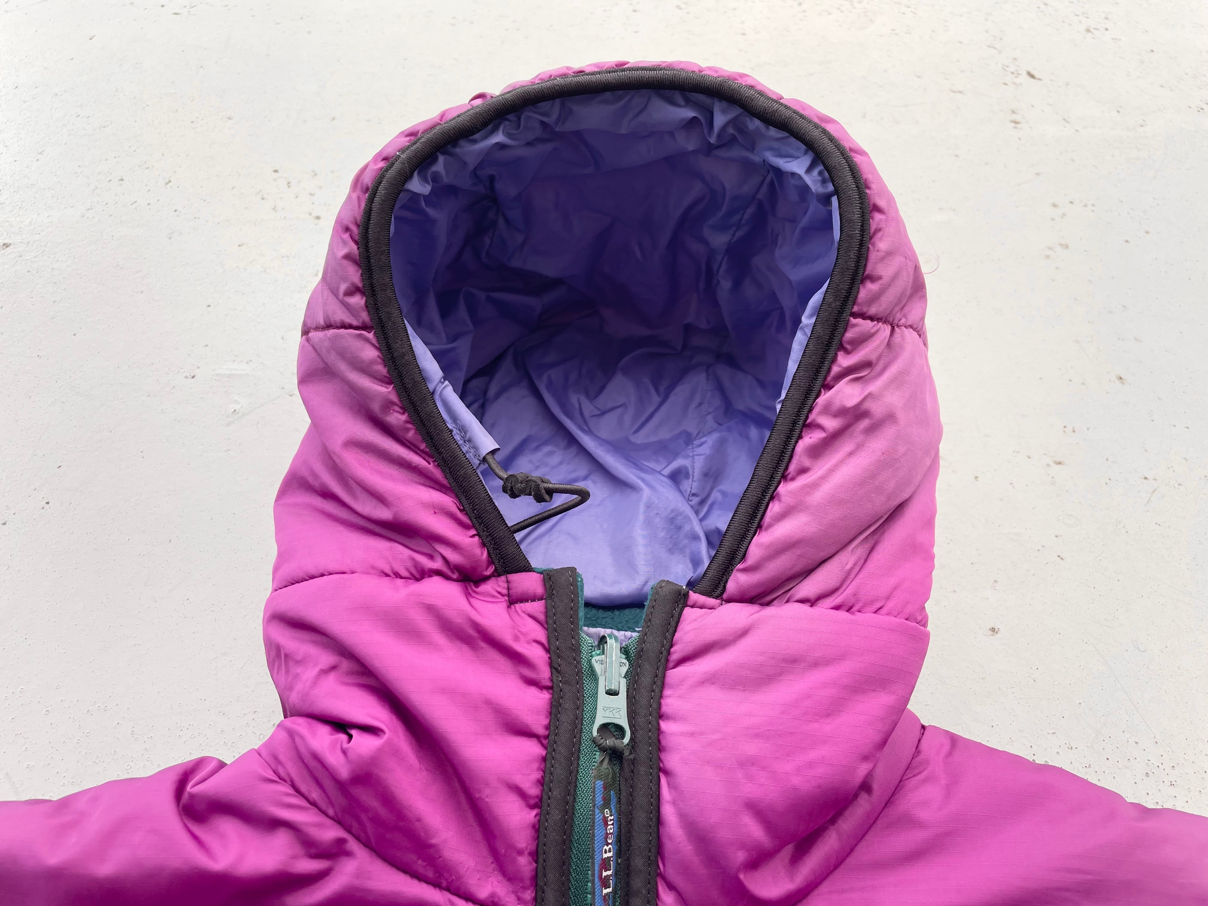 【商品詳細】エルエルビーンのプリマロフトフーディジャケット。サイズは実寸S-M程。カラーはパープル。80年代USA製。最近全く見なくなった本モデル。その中でもパープルカラーは特に見ない気がします。ファスナー右差しでレディース仕様ですが問題無くメンズが着れるディテールです。